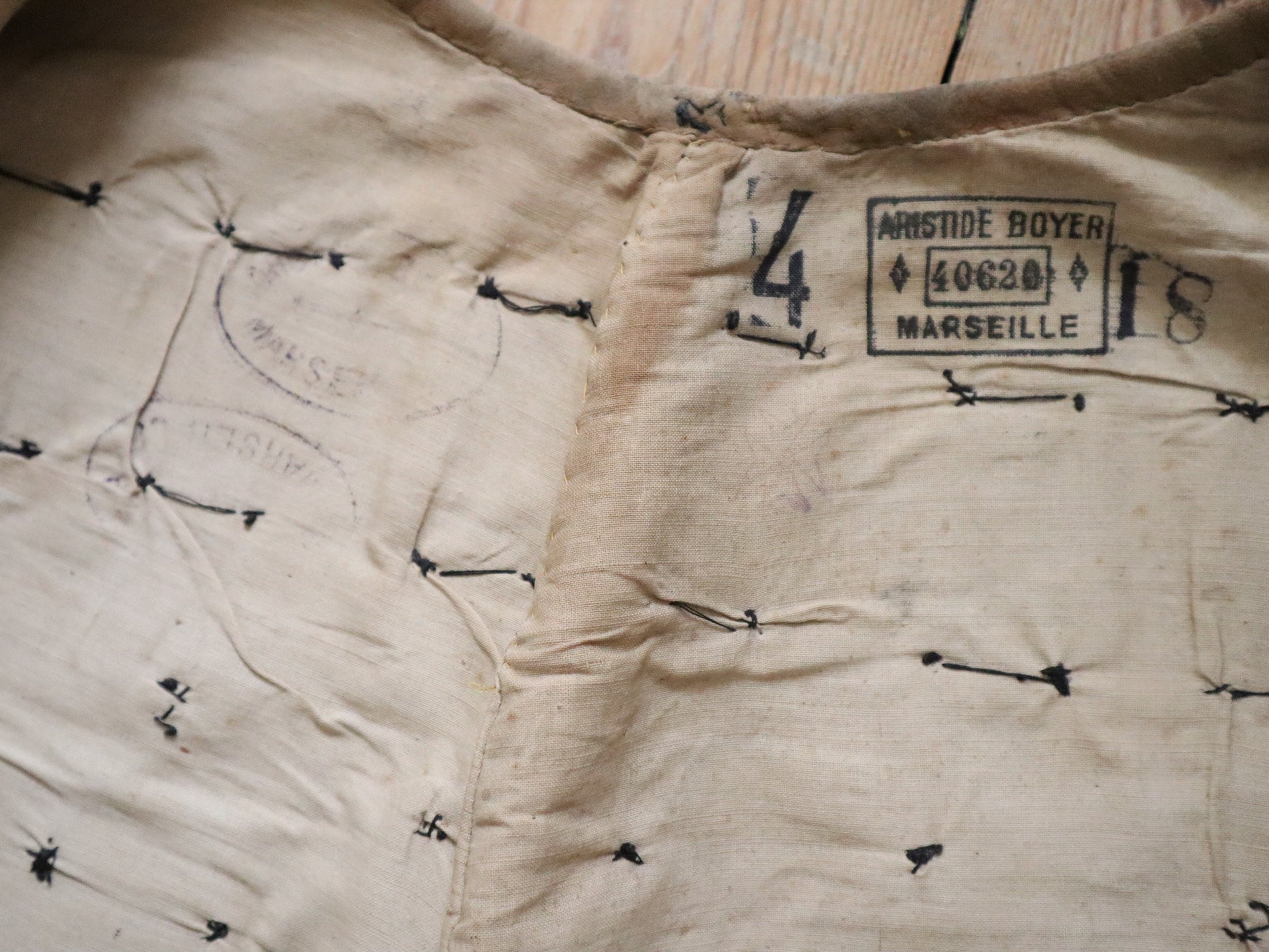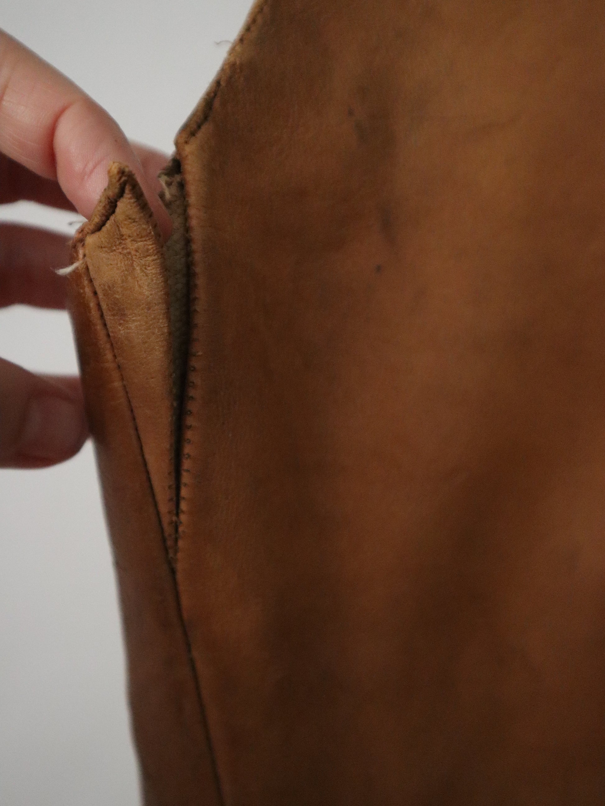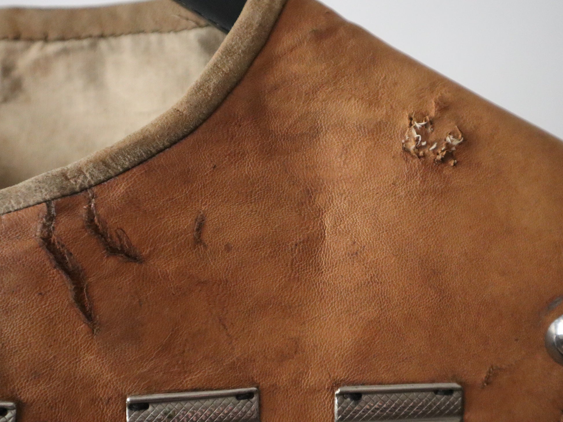 Condition: this has many marks and scuffs to the leather. Some of the stitching has come undone at the scalloped hem. There are also split stitching at the underarm. There are missing studs and some of the metal plates needs stitching back into place. I have four spare round button studs and one small square one which I’ll include in the parcel.
