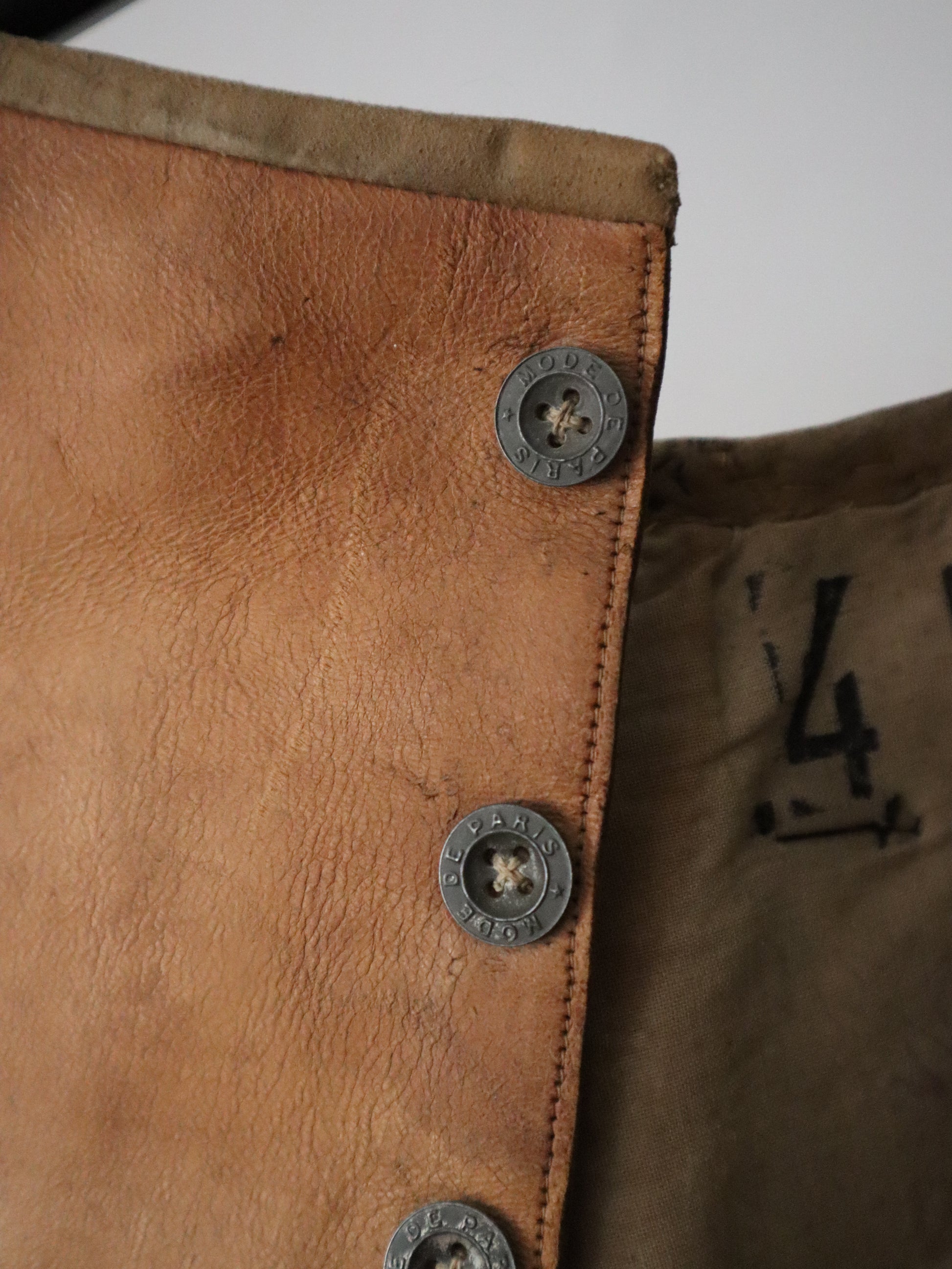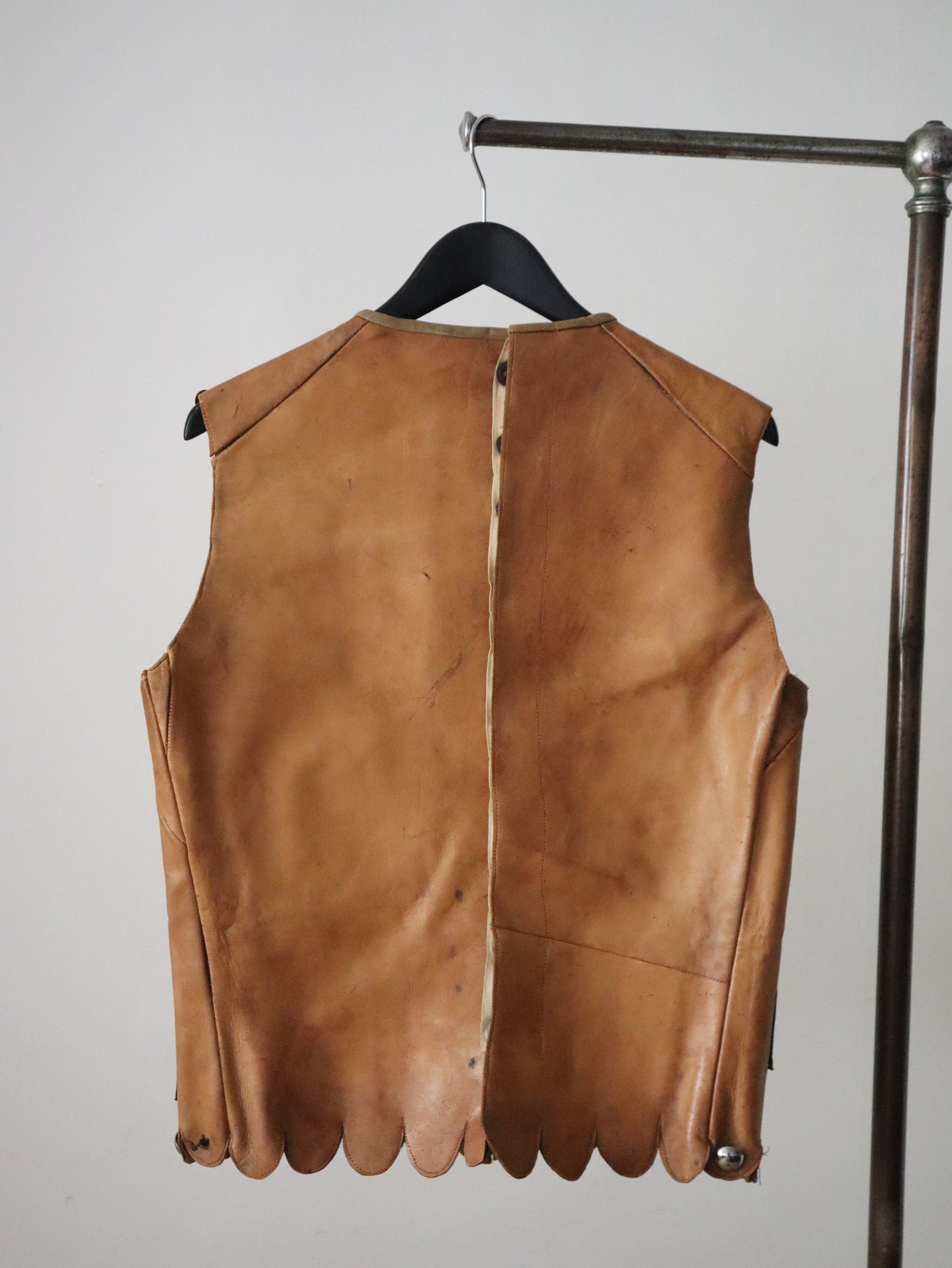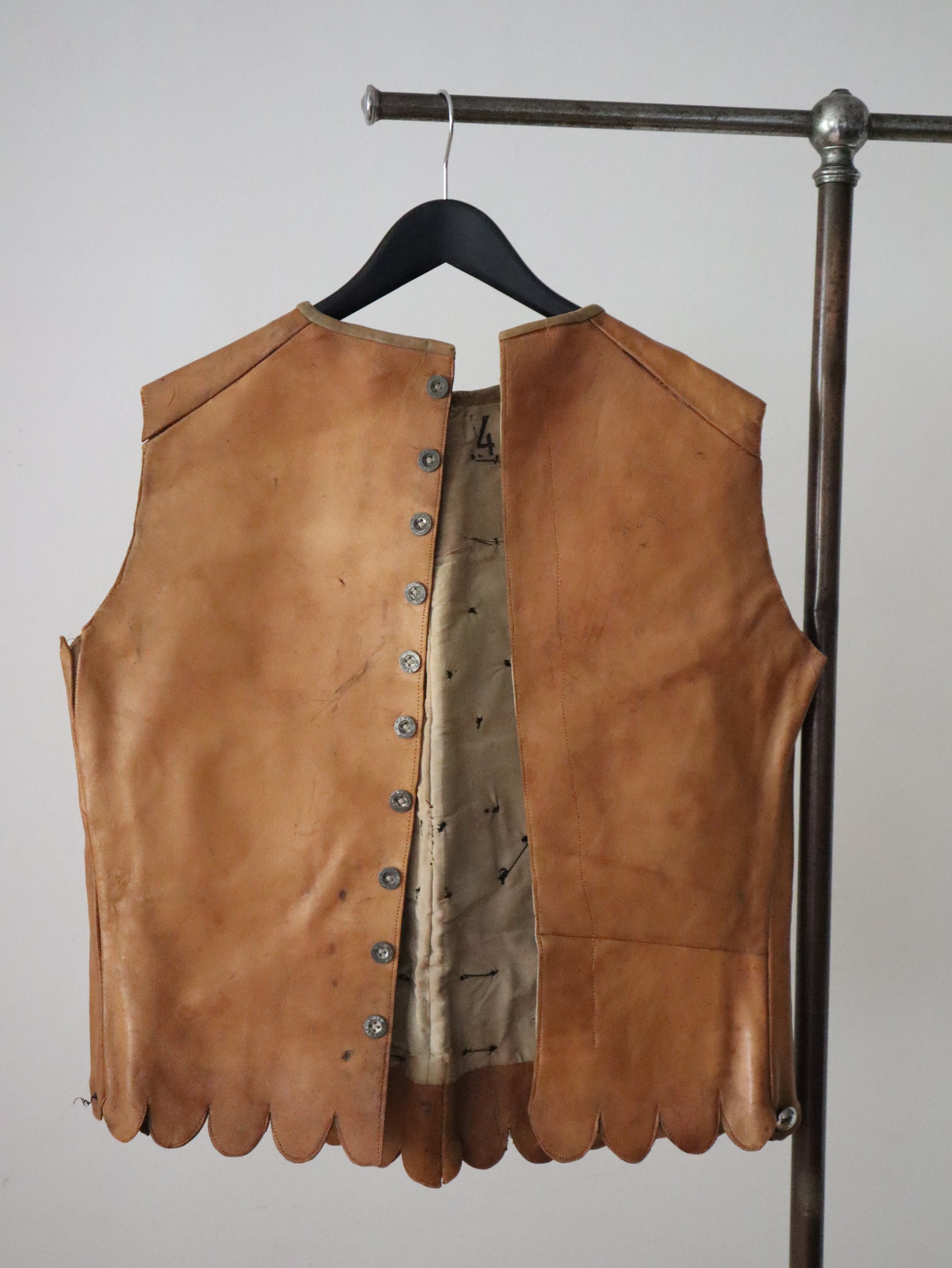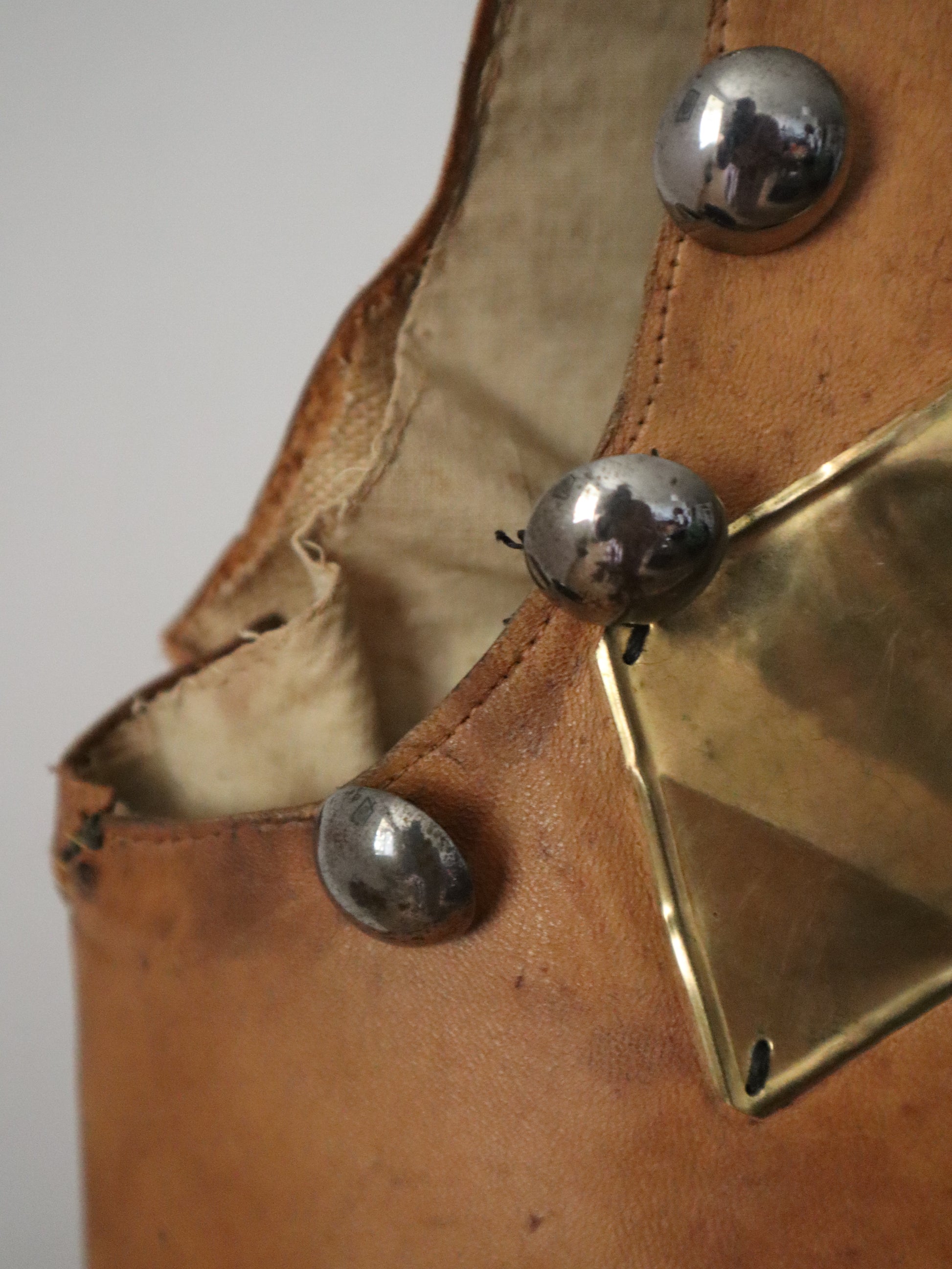 1910s - 20s French opera costume. Tan leather gilet decorated with metal plates and studs, to appear like armour. Fastens up the back with buttons. Linen lined and has costumier stamps.