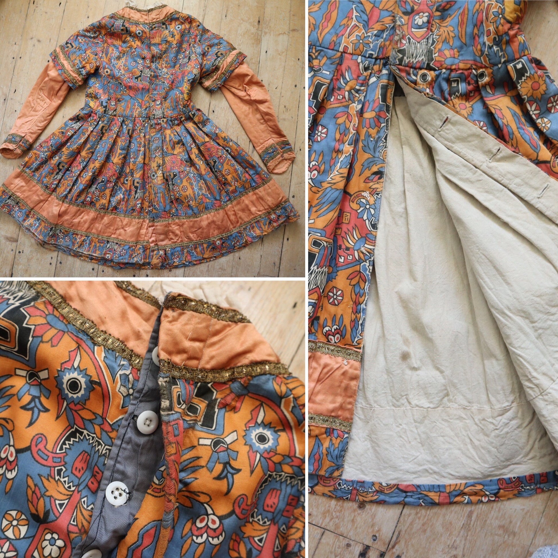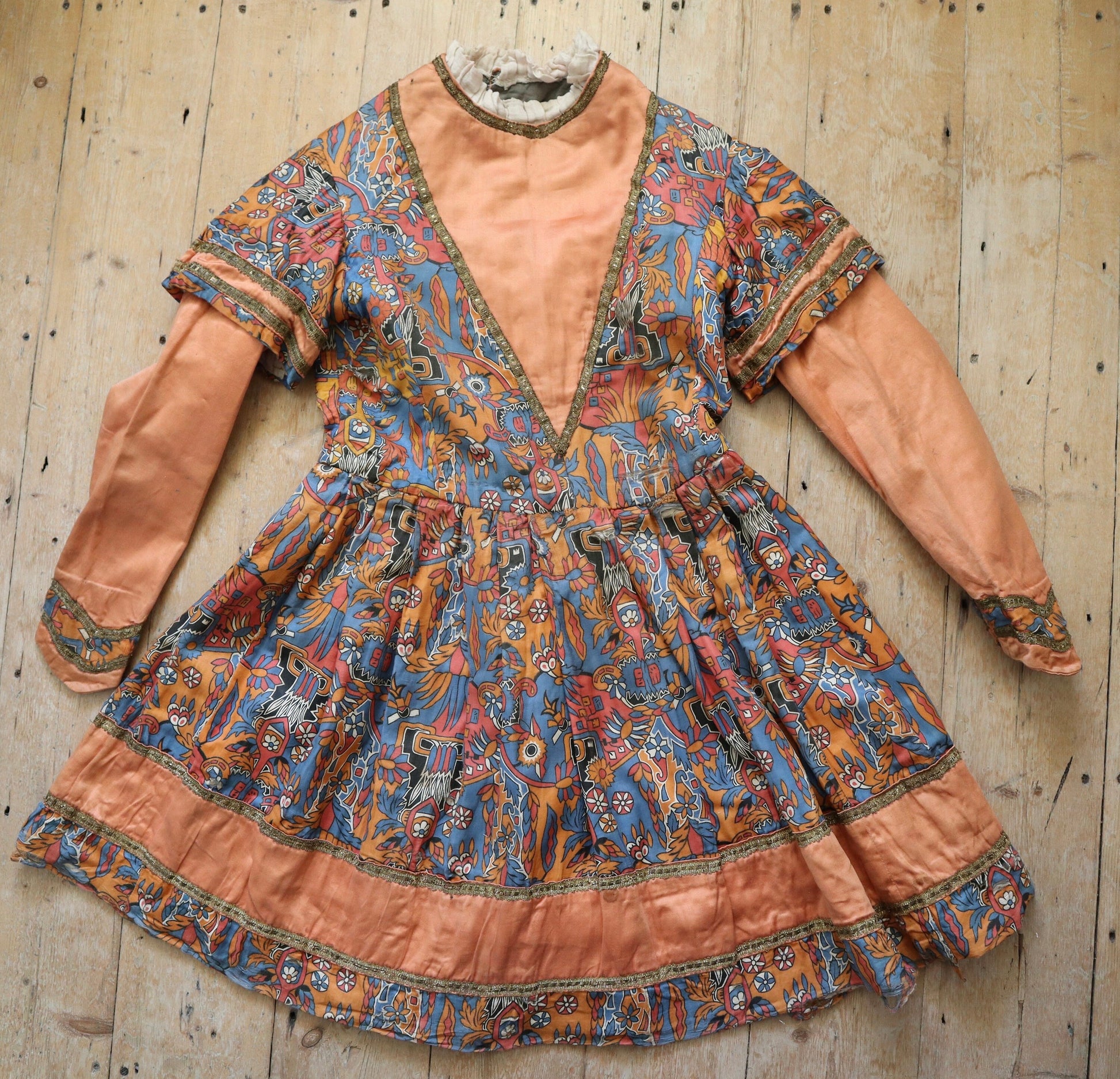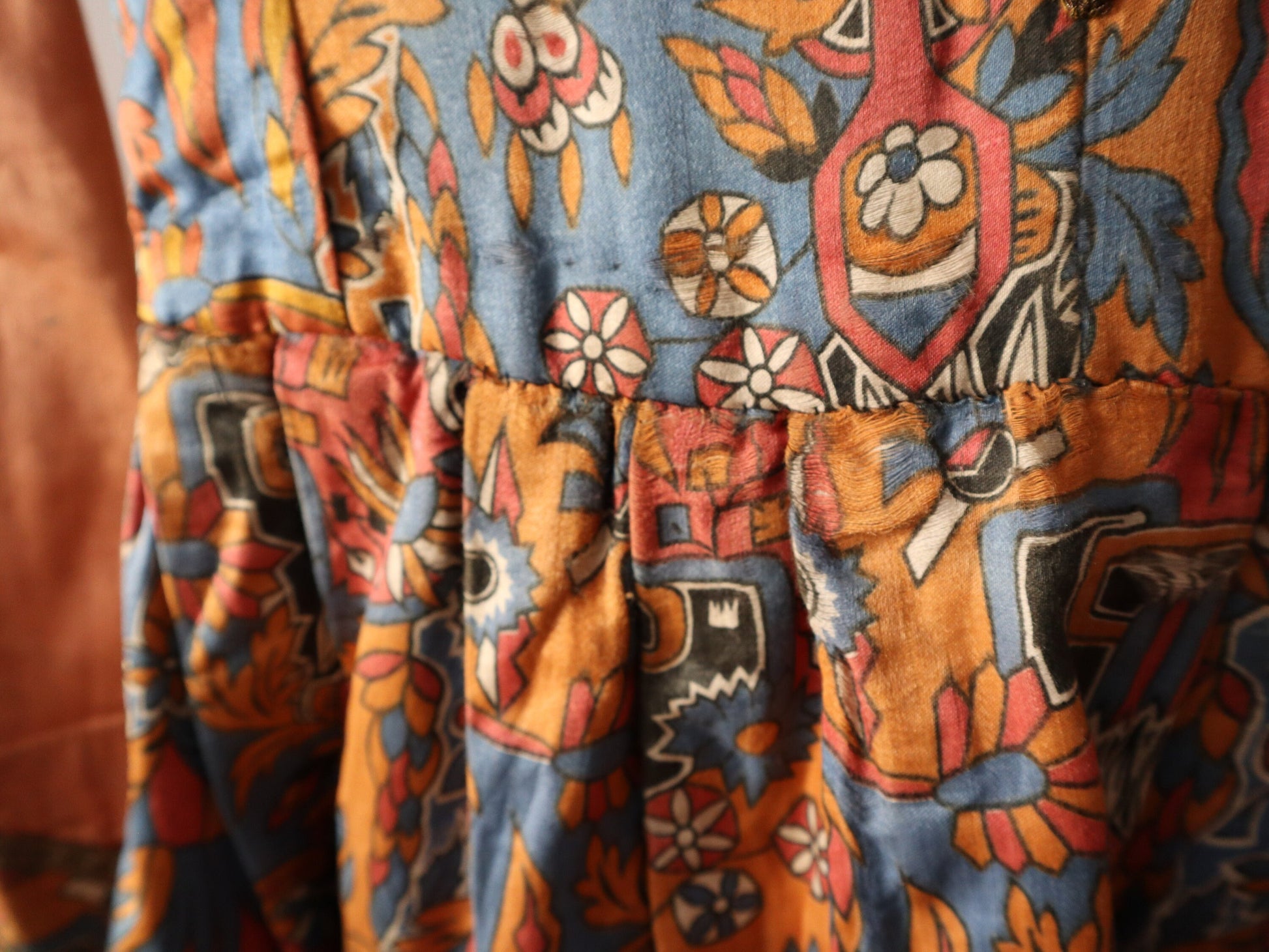 The star of this tunic is its incredible printed textile: a bold, fantastical design that blends Art Nouveau florals with folk and heraldic influences. The pattern is full of surreal, painterly shapes—florals, sunbursts, curling vines, and geometric motifs—in rich, muted tones of orange, blue, pink, and black. It’s the kind of fabric that feels alive with storytelling, likely designed for the stage and possibly printed in a limited run for costume use.