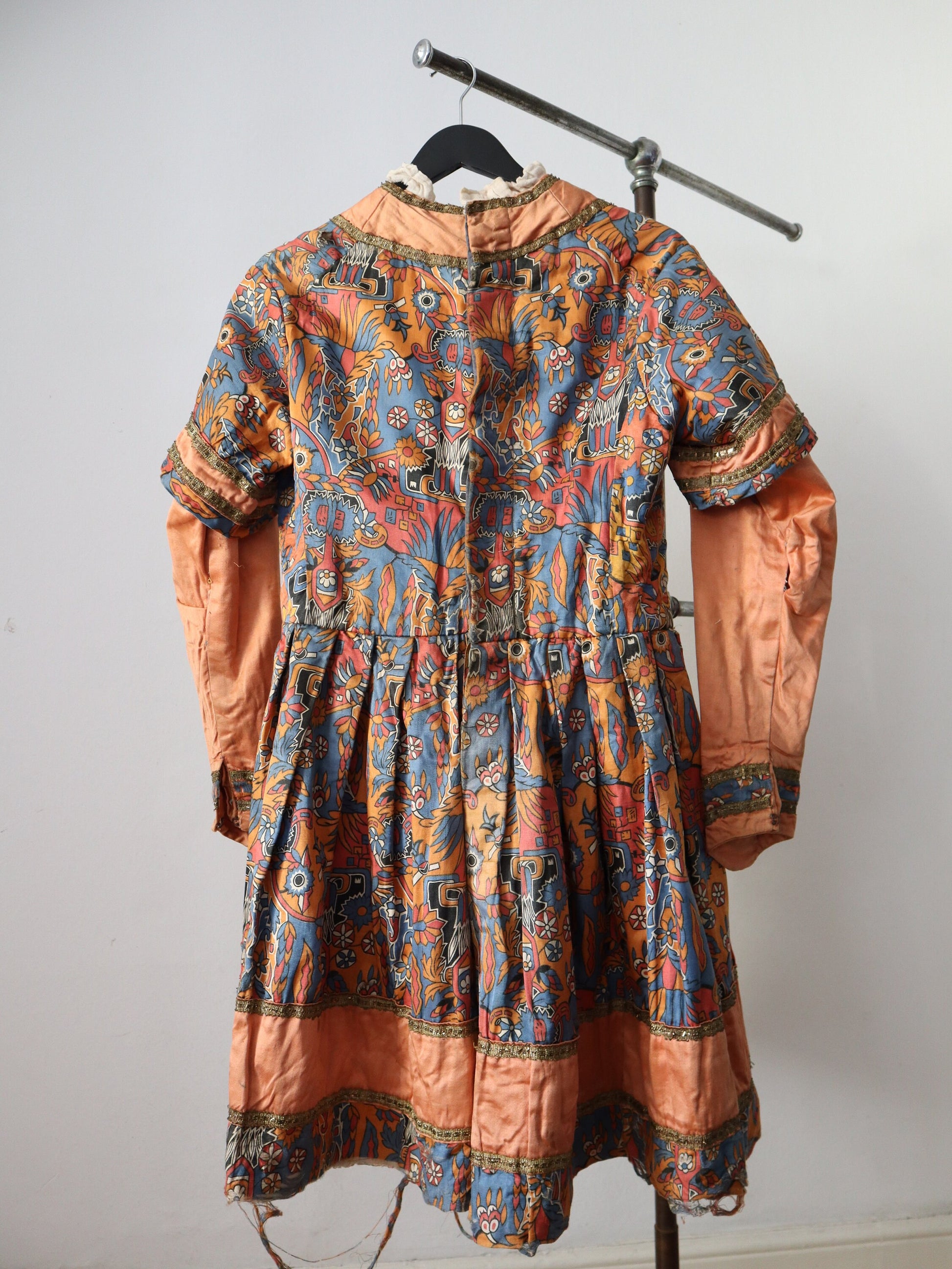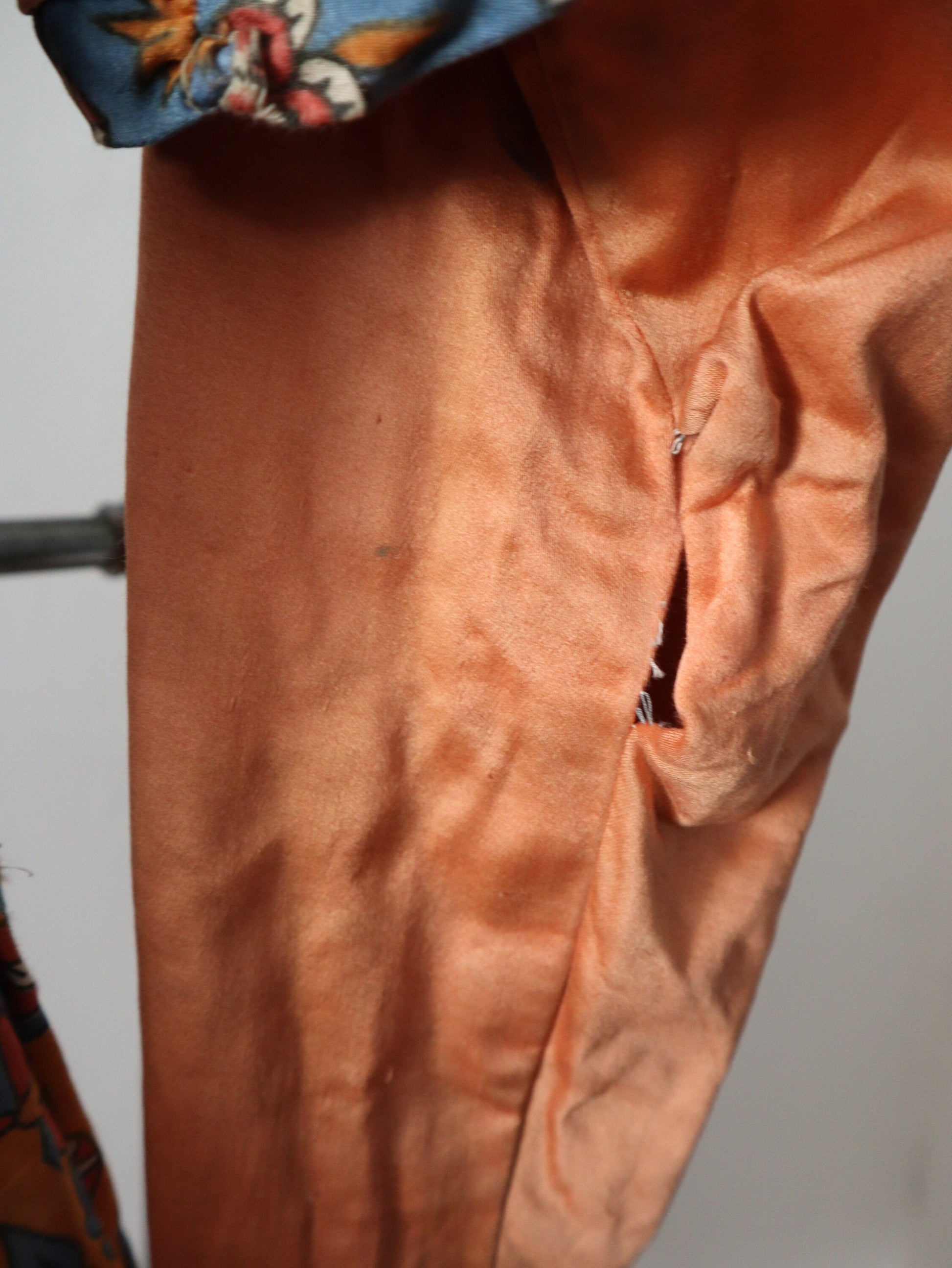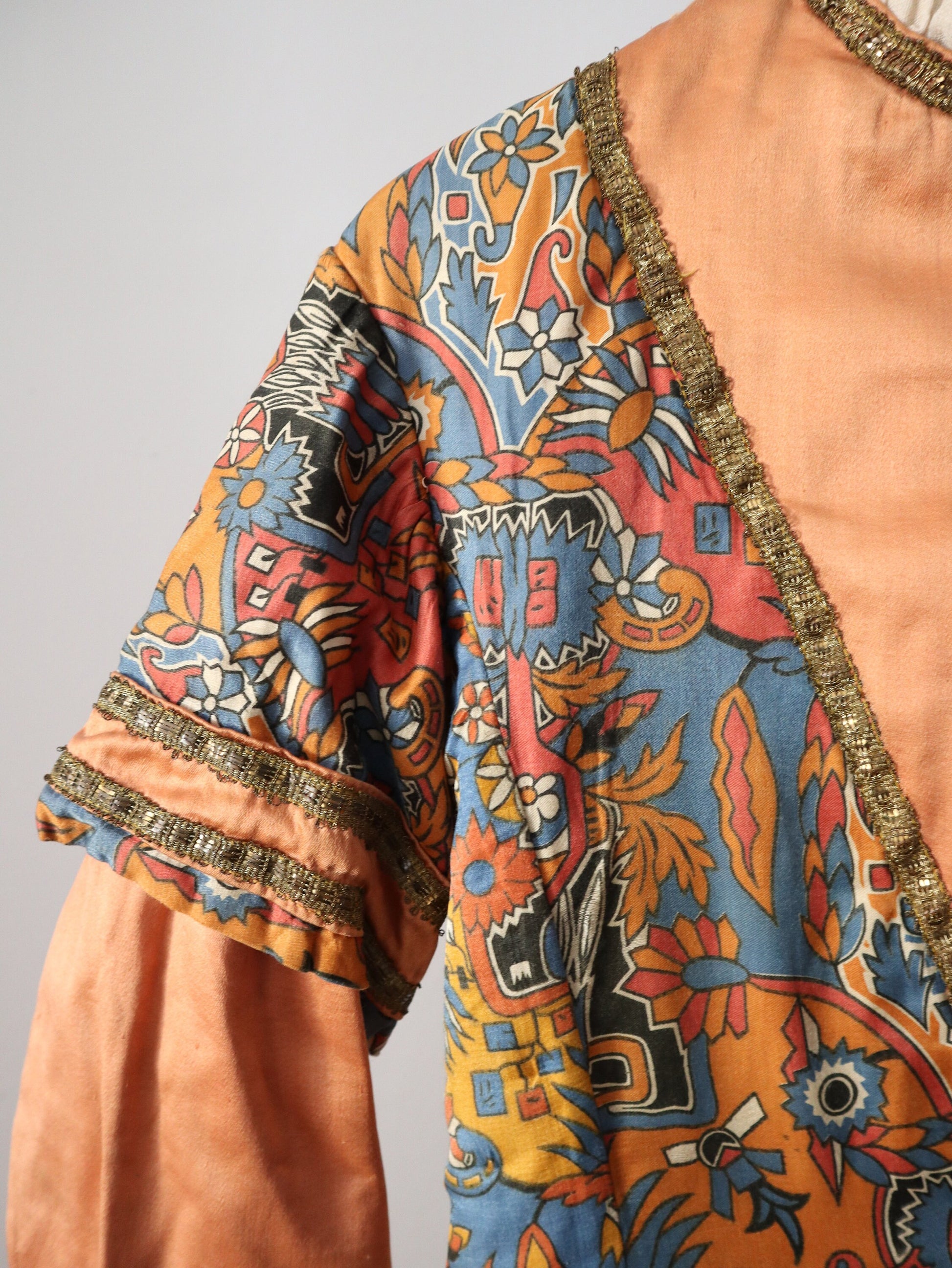 Panels of soft peach silk break up the print on the front, sleeves, and skirt, trimmed with gold metallic ribbon that adds a touch of shimmer under lights. It buttons up the back and fastens at the cuffs with metal hook and eyes. Fully lined.