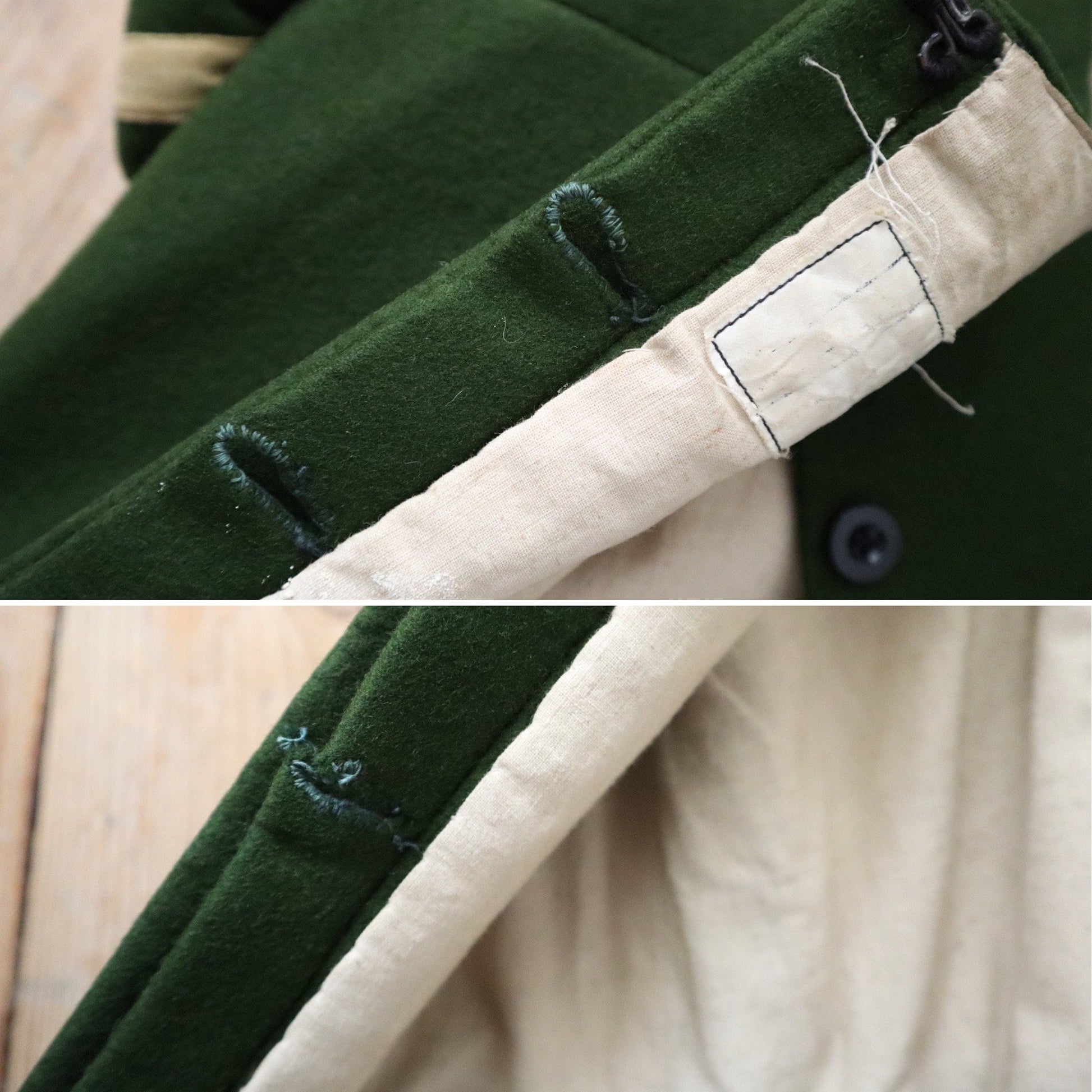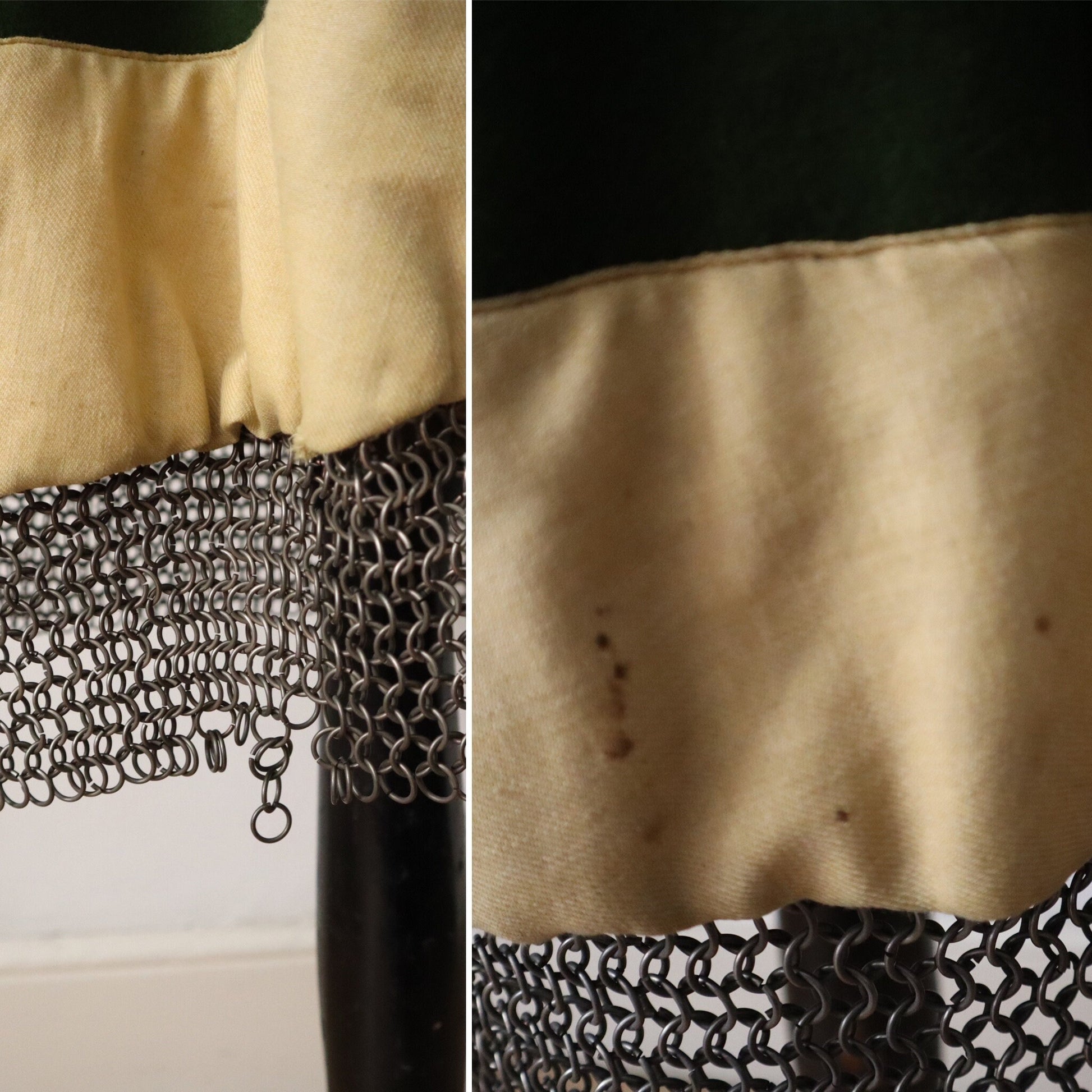 Very good overall for its age and intended use. This piece has been gently steamed but not laundered. There are a few marks on the cream hem, minor moth nibbles and small holes, and some missing metal links in the chainmail. A few buttonholes are split or close to splitting and would benefit from reinforcement stitching.