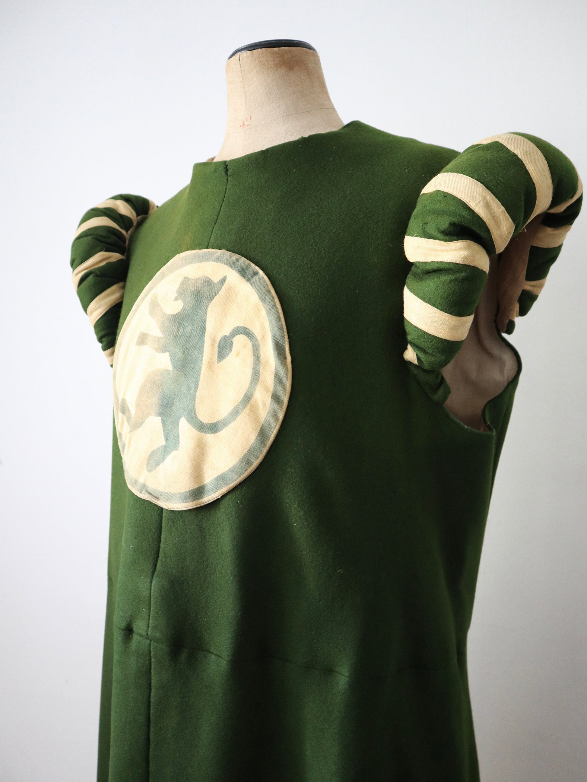 The tunic is made from green wool and lined in linen. It features padded sleeves in a striking cream and green striped cotton, cream wool trim at the hem, and a dramatic lower hem in metal chainmail. Covered buttons run up the back. At the center front is an appliquéd lion crest—bold, graphic, and beautifully executed.