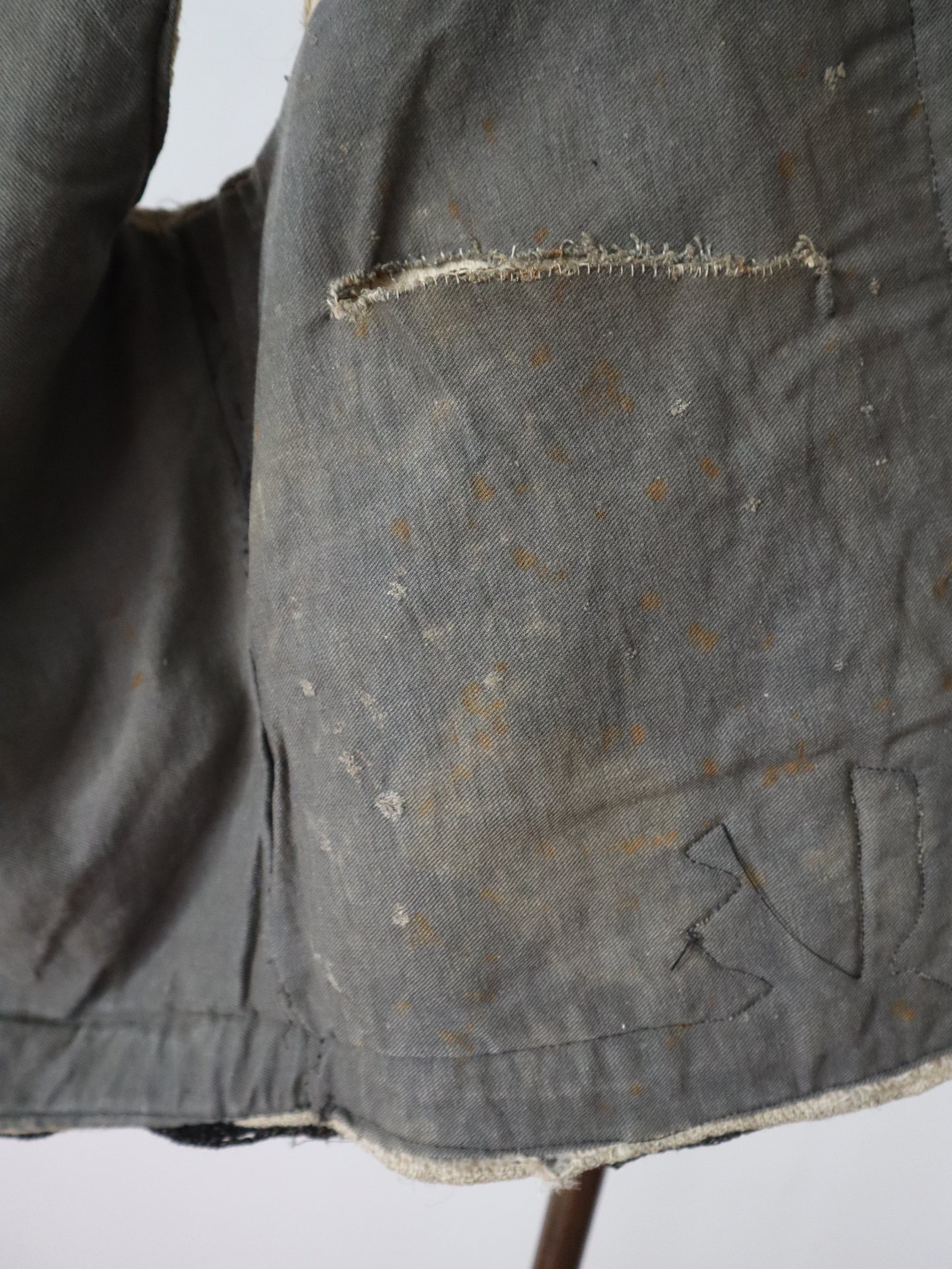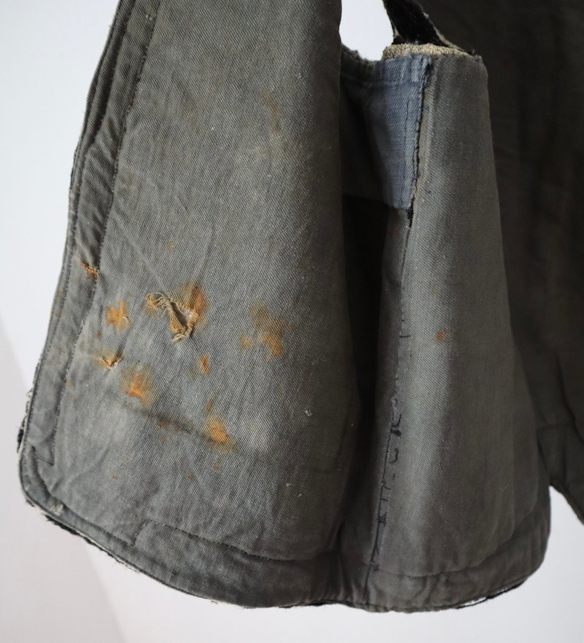 Freshly laundered by hand. Lining shows holes, patches and rust marks, with further rust marks to the left front and a darker mark across the back as shown. Some of the red applied wool is missing. Fraying and minor losses to the edge soutache. General wear consistent with age and use, overall in good condition.