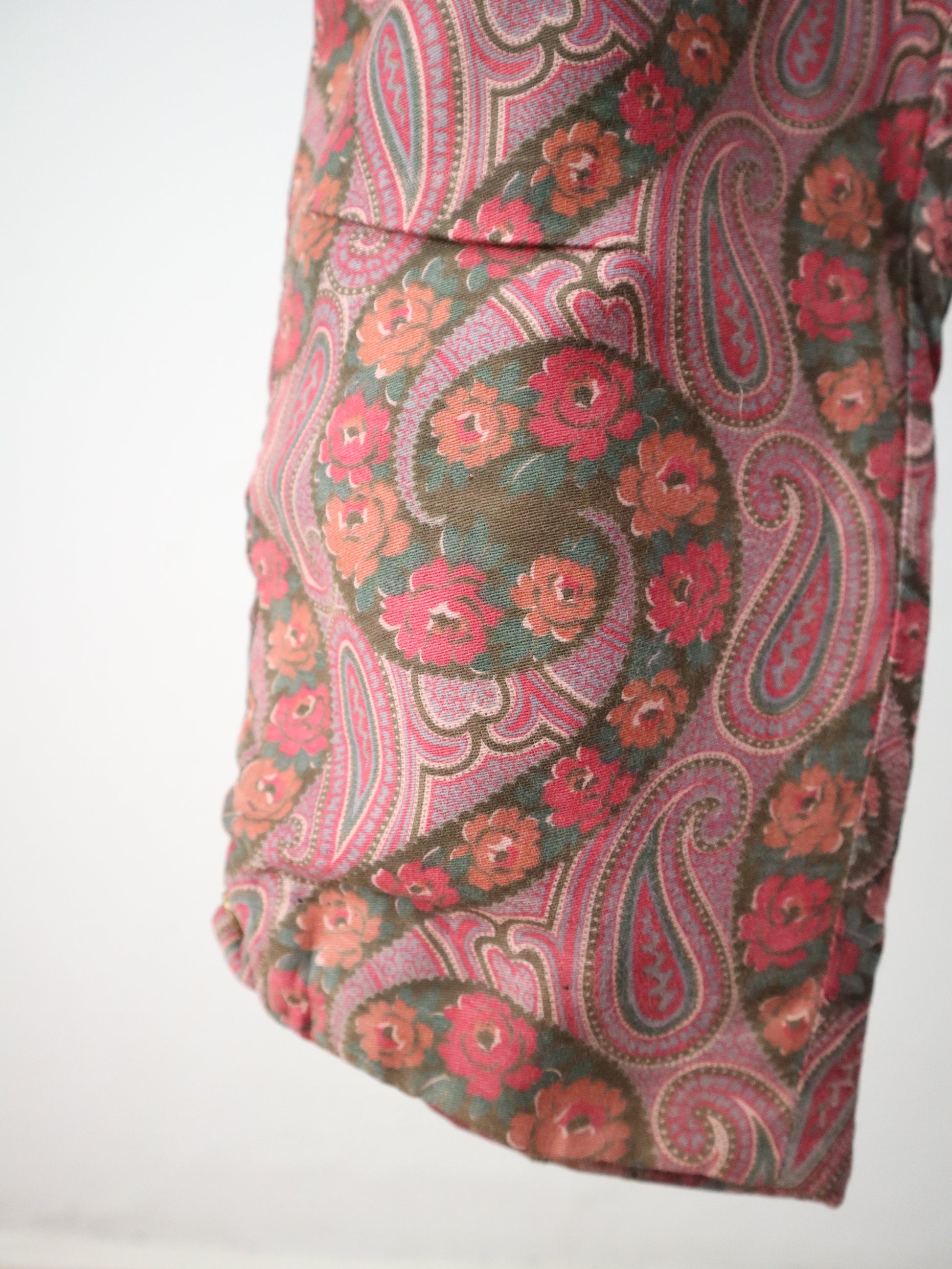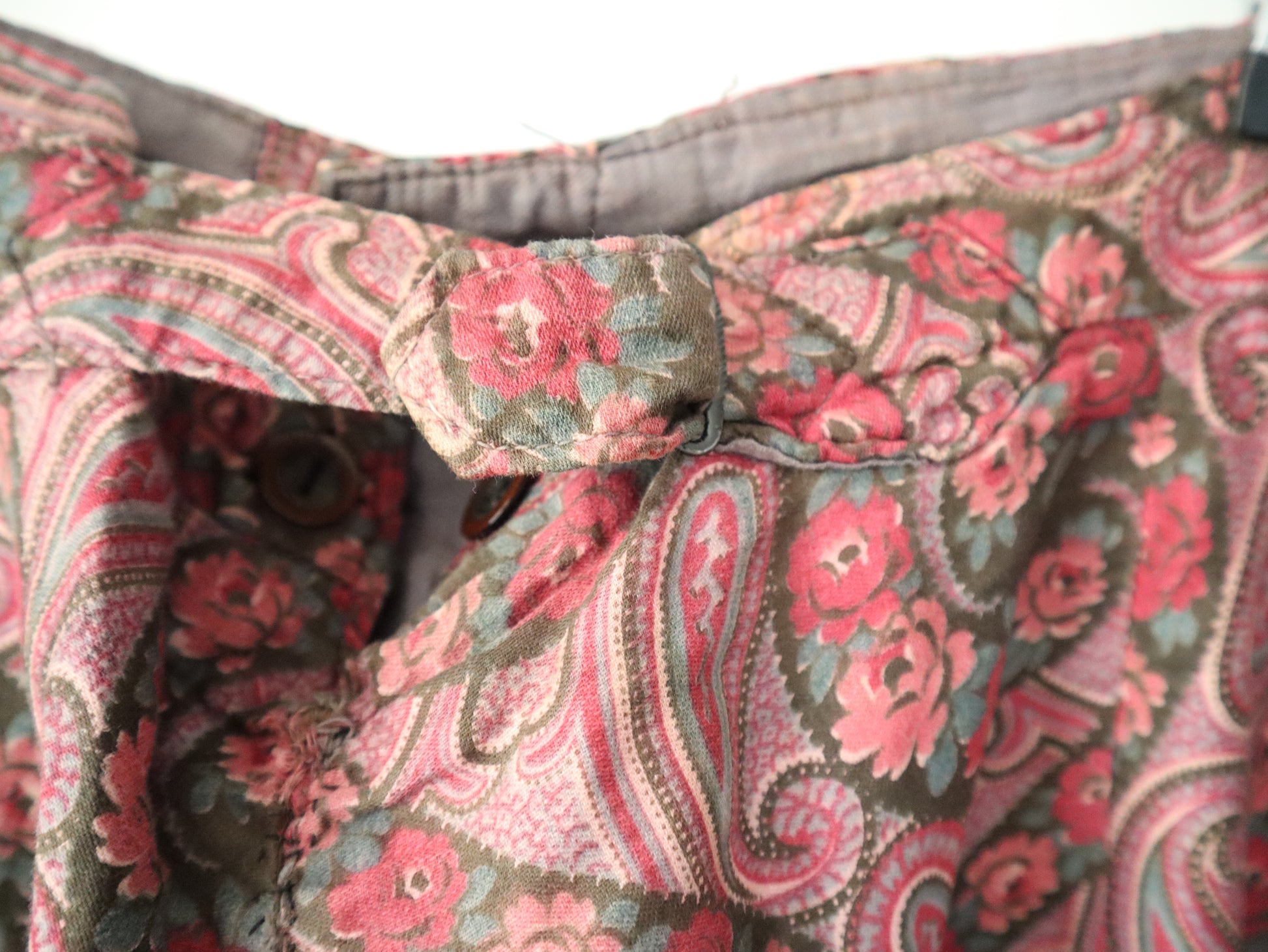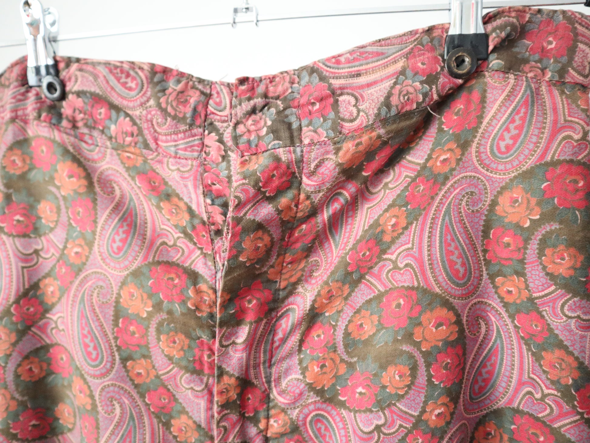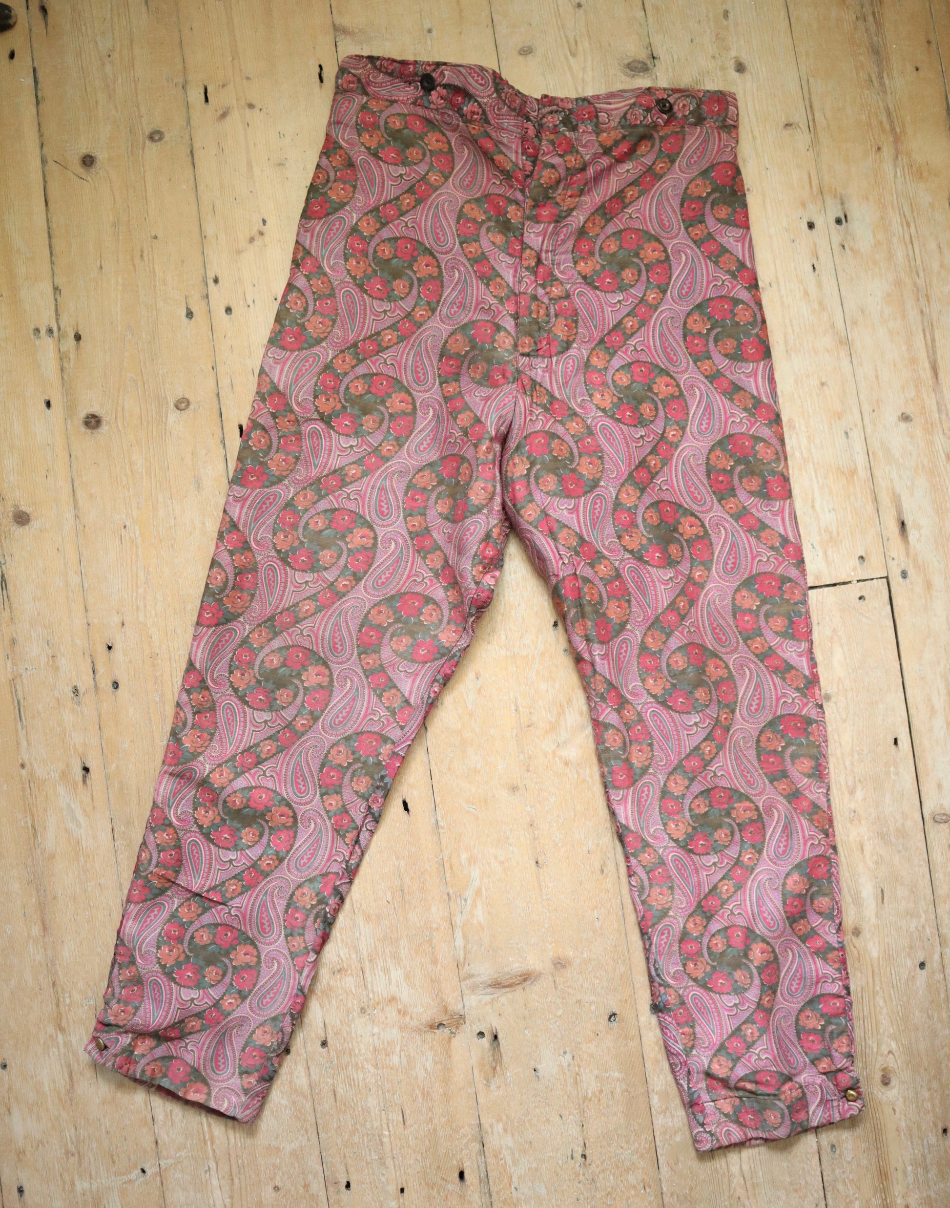 Wonderful c.1920s French theatre costume trousers. These are made in a pattern fabric of which I have more than one item. It’s a really special design which interweaves two patterns: Paisley and then a swirling winding chain of roses. These trousers have a long tapered leg, the button butterfly and a button on each ankle cuff. There are buttons around the waistband for braces/suspenders. Cinch back buckle.