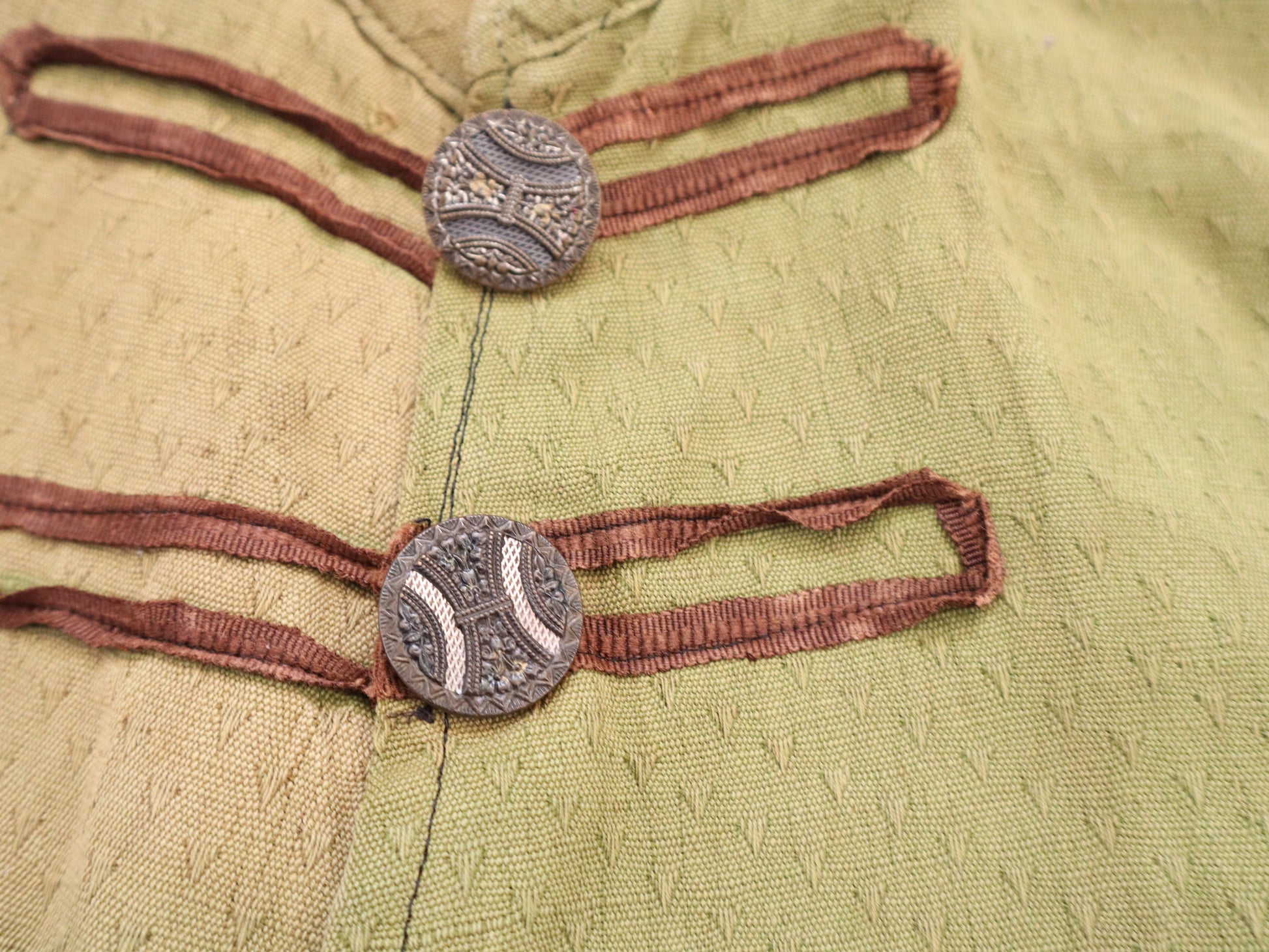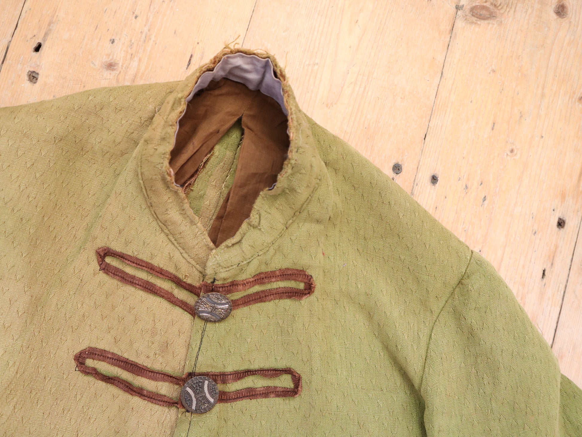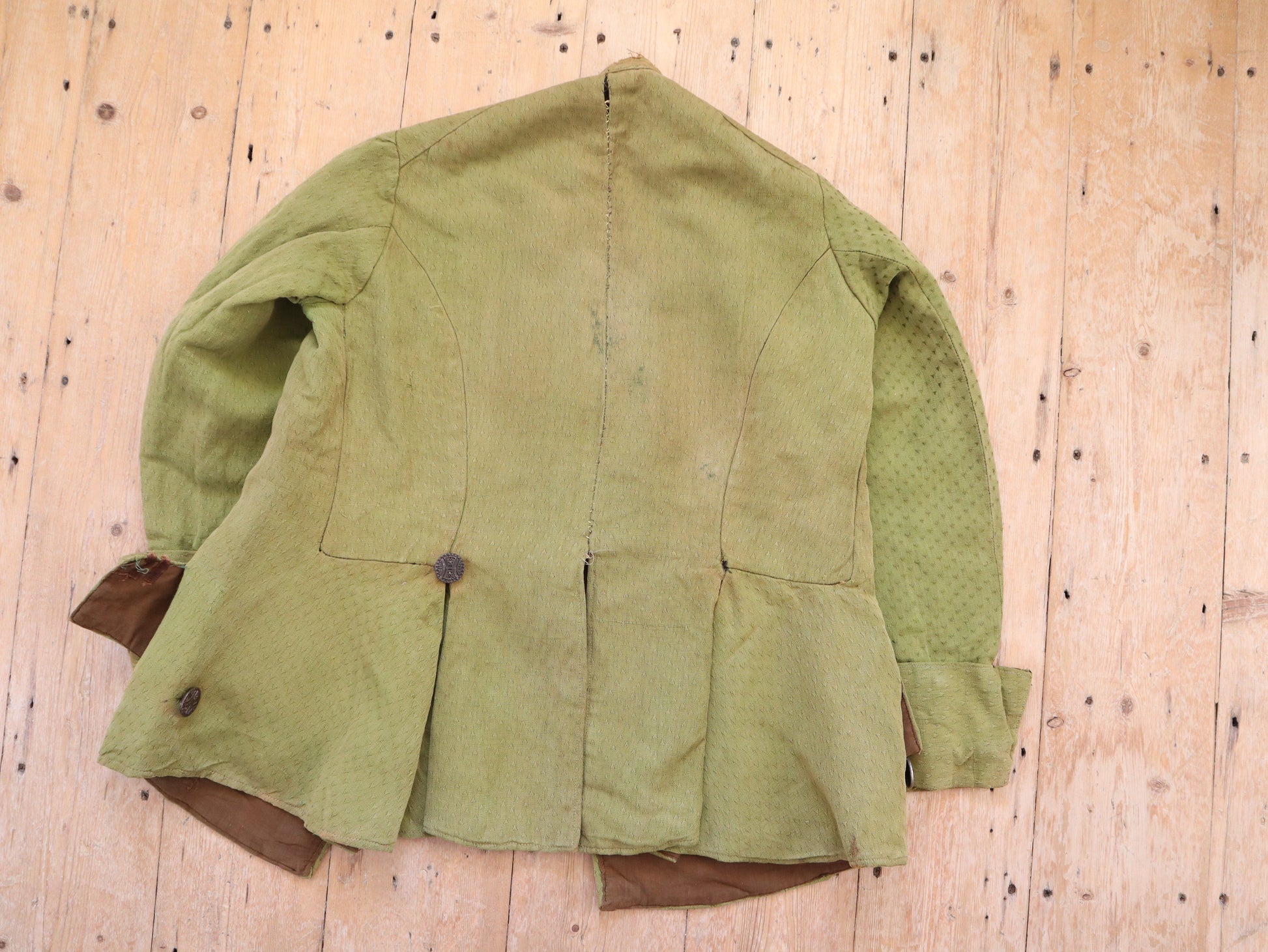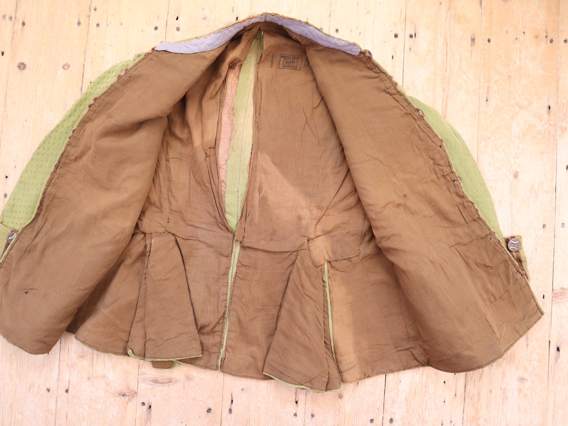 C.1920s frock coat jacket. Green cotton fabric with small woven triangular shapes throughout. Lovely natural sun fade in areas. Embossed metaL buttons. Pockets are faux. Wide turn back sleeves. Cotton lined.