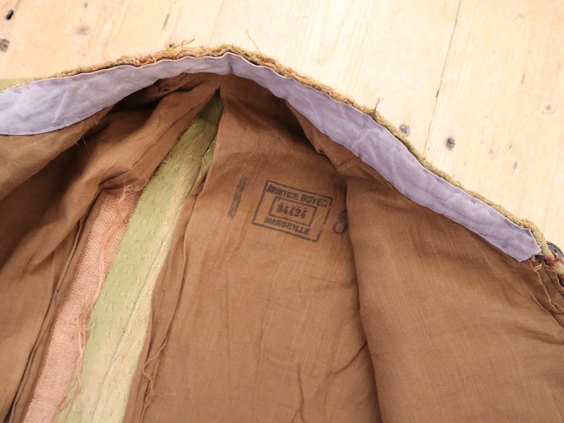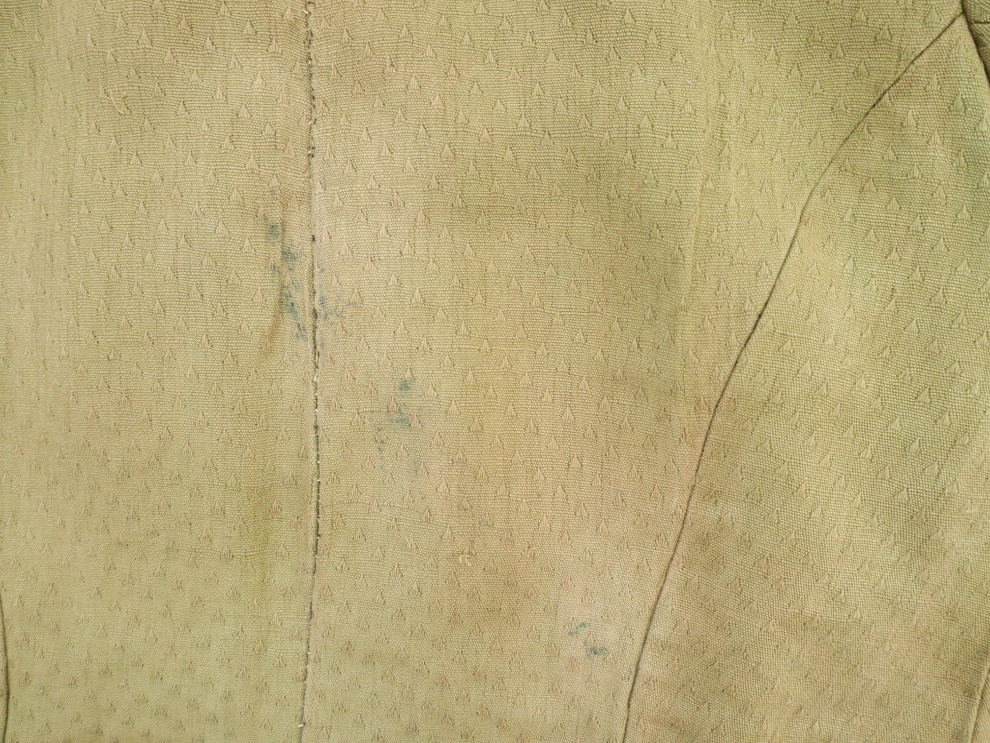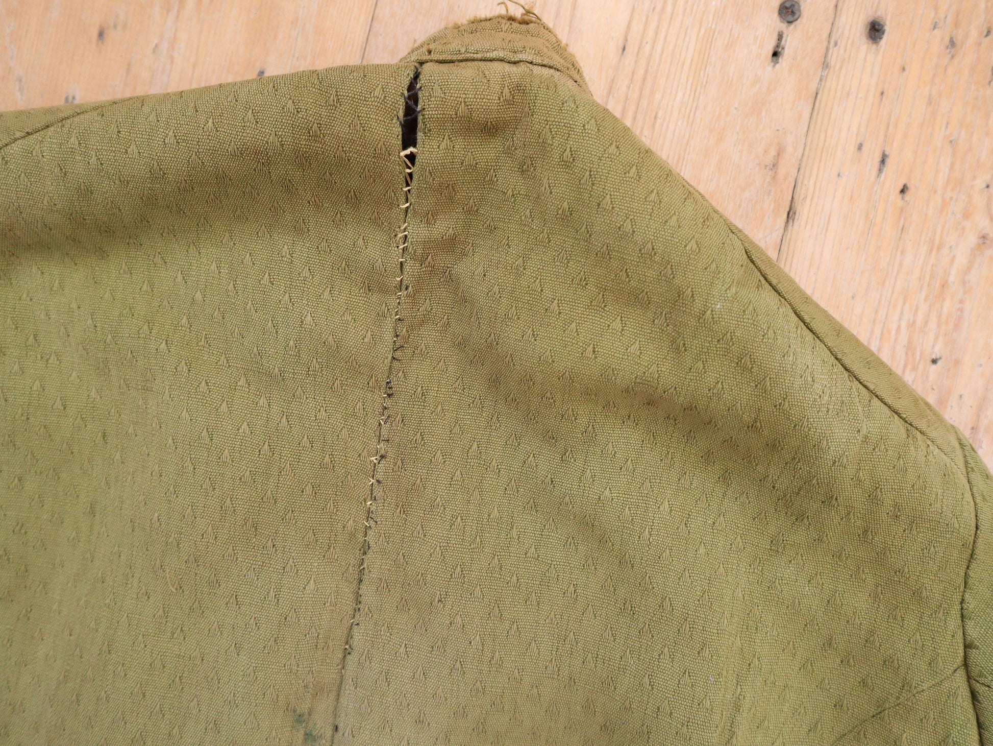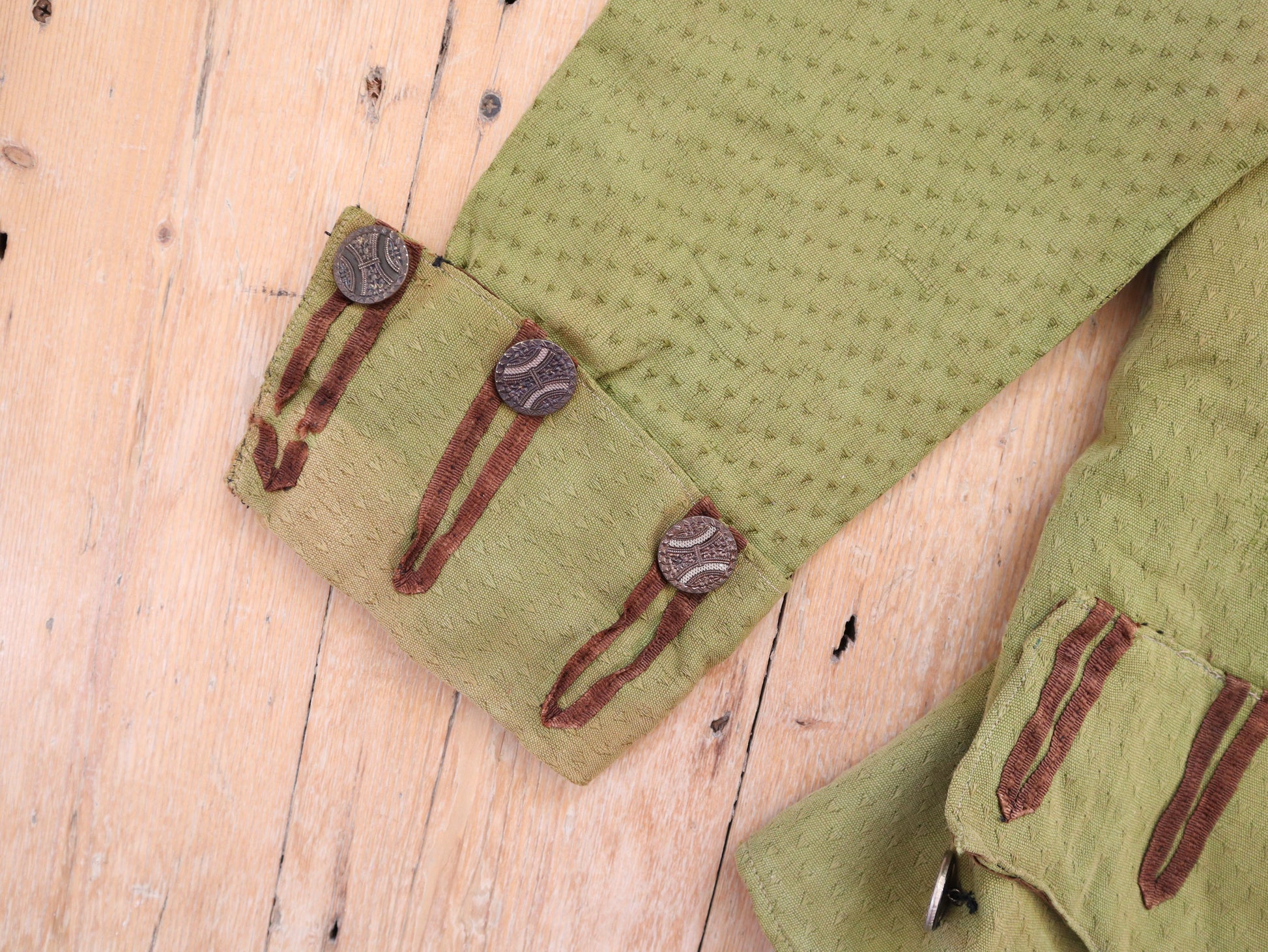 C.1920s frock coat jacket. Green cotton fabric with small woven triangular shapes throughout. Lovely natural sun fade in areas. Embossed metaL buttons. Pockets are faux. Wide turn back sleeves. Cotton lined.