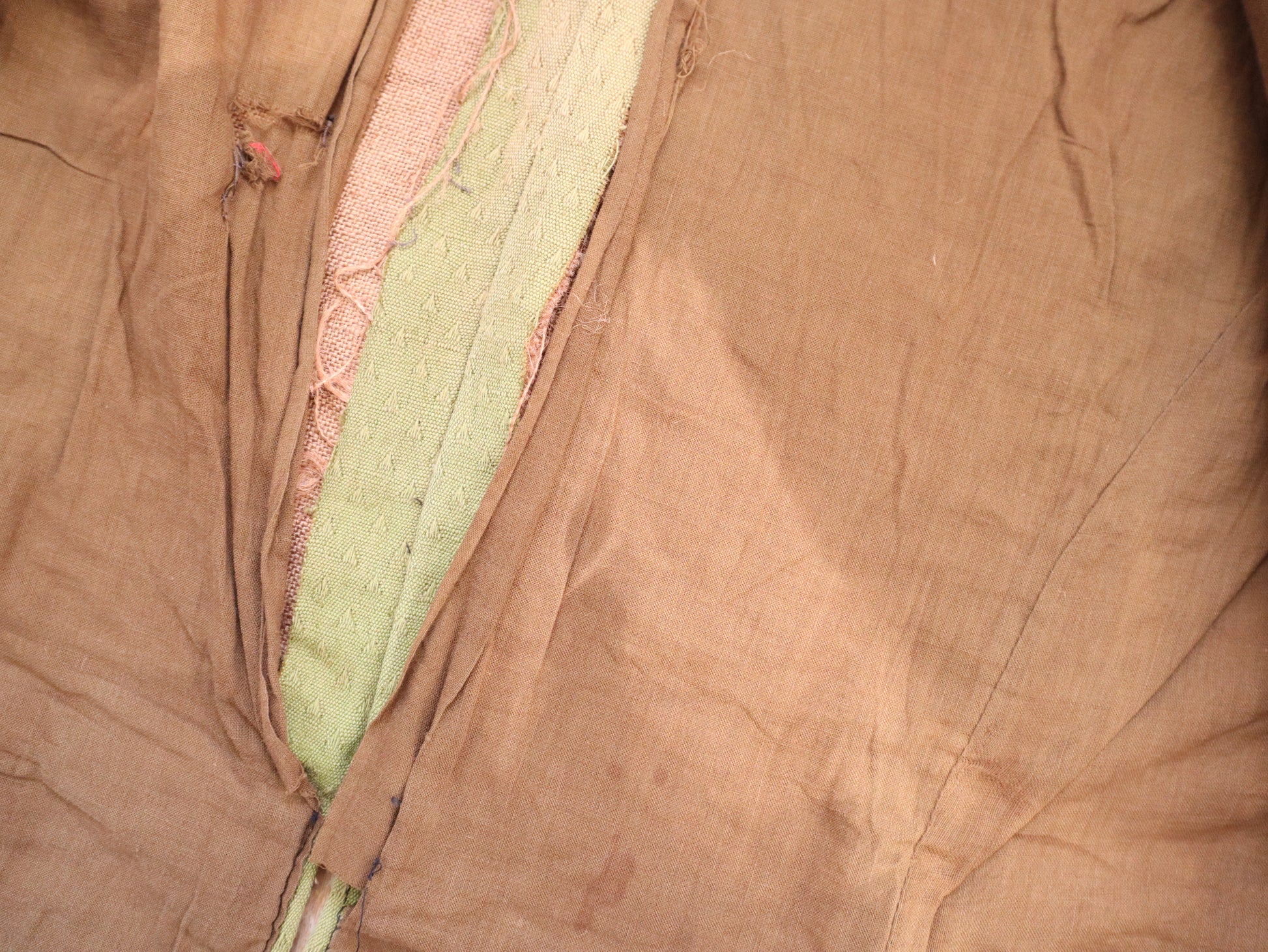 Great condition overall. Freshly laundered. There are two missing buttons: one blow the right pocket flap and one at the back. There is sun fade discolouration. The back seam is split a little on the outside but also the lining. There is wear and fraying around the collar.