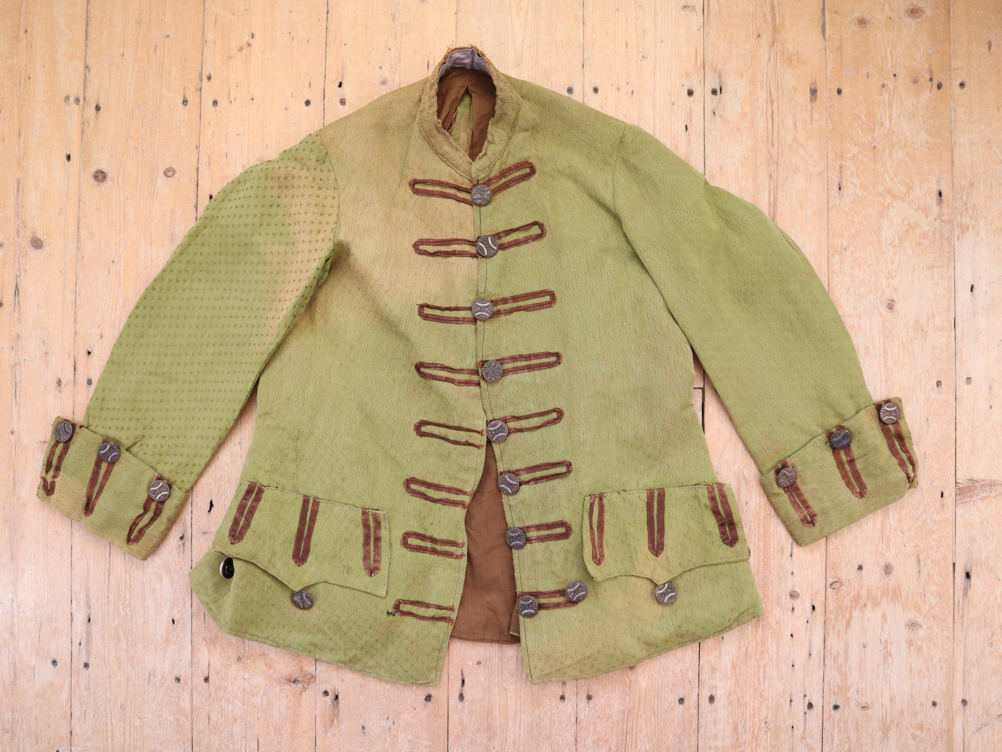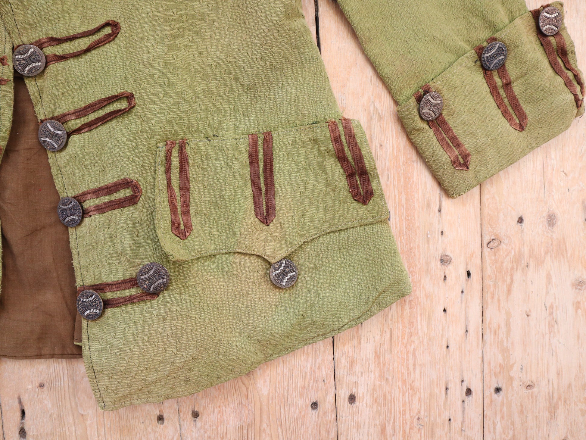 1920s French Opera Theatre Costume Jacket Green Metal Embossed Buttons 18th Century Style Frock Coat