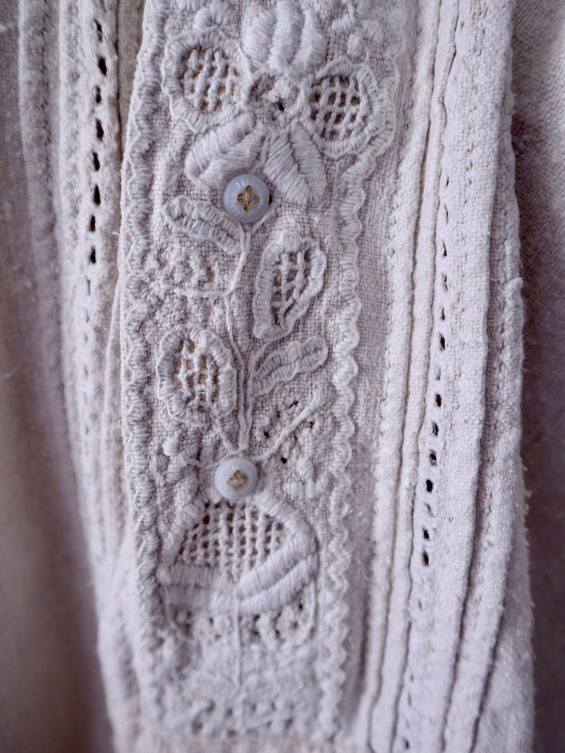 A beautifully made traditional piece from the 1930s–1940s, crafted from creamy, slubby medium-weight linen with lots of visible hand stitching. Features intricate cutwork and embroidery at the front, collar, cuffs, and hem, all finished with a scalloped edge.
