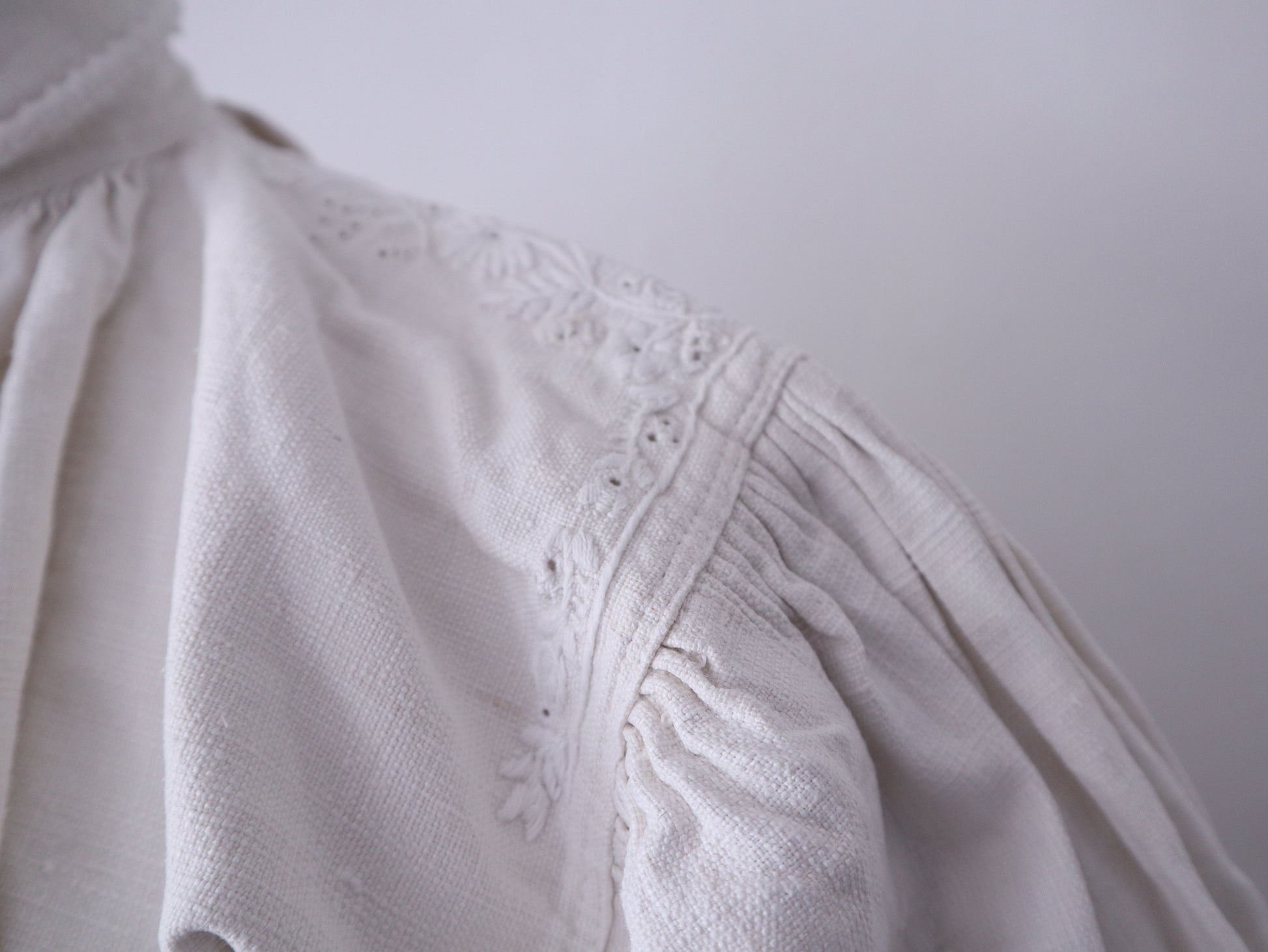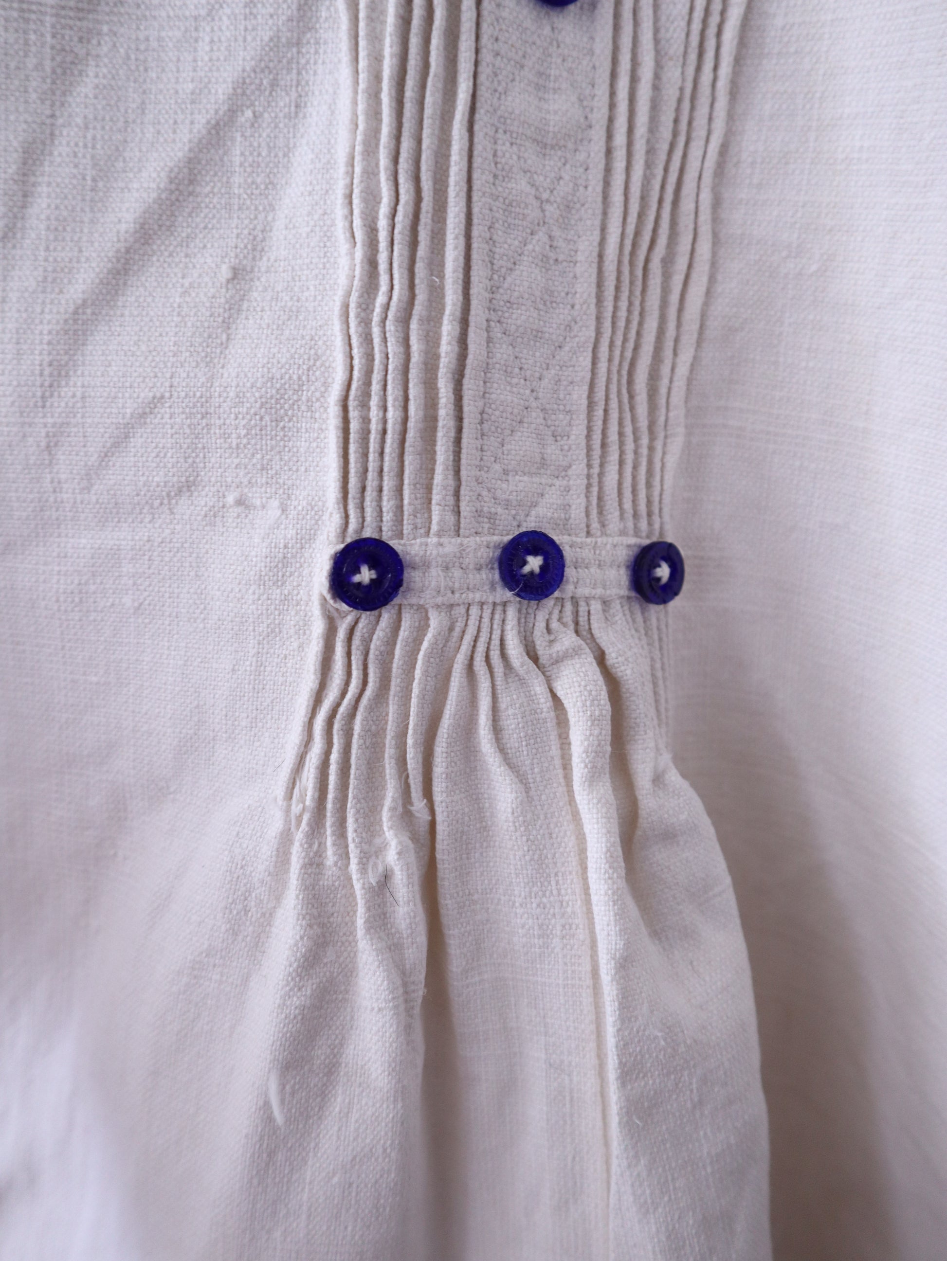 A traditional handsewn linen shirt from Transylvania, dating from the 1930s–1940s. Made from soft, medium-weight handwoven linen with a natural slubbed texture. The front is finished with neat pintuck pleats and fastens with cobalt blue pressed glass buttons. Cuffs and hem are edged with hand-stitched cutwork embroidery and scalloped borders.