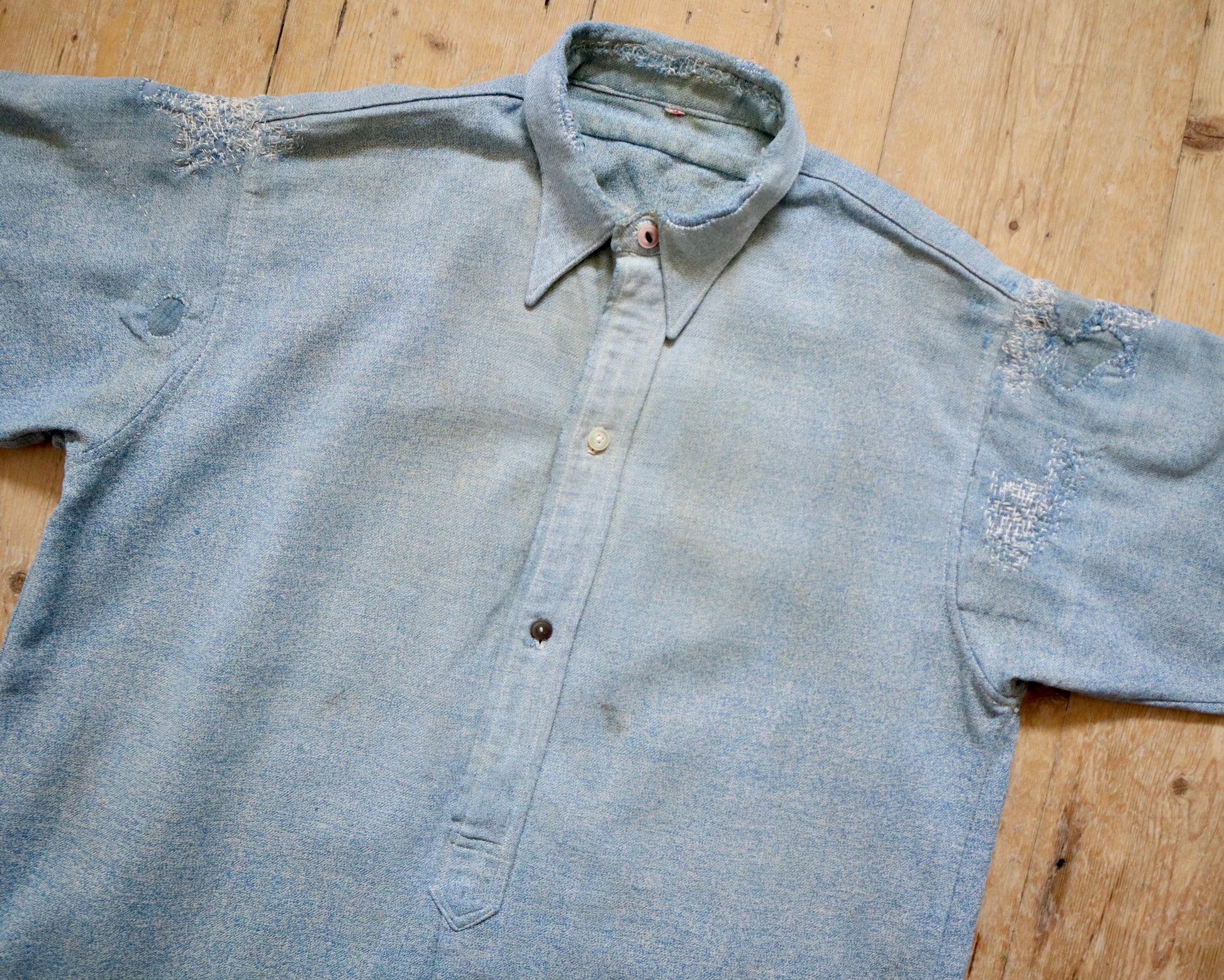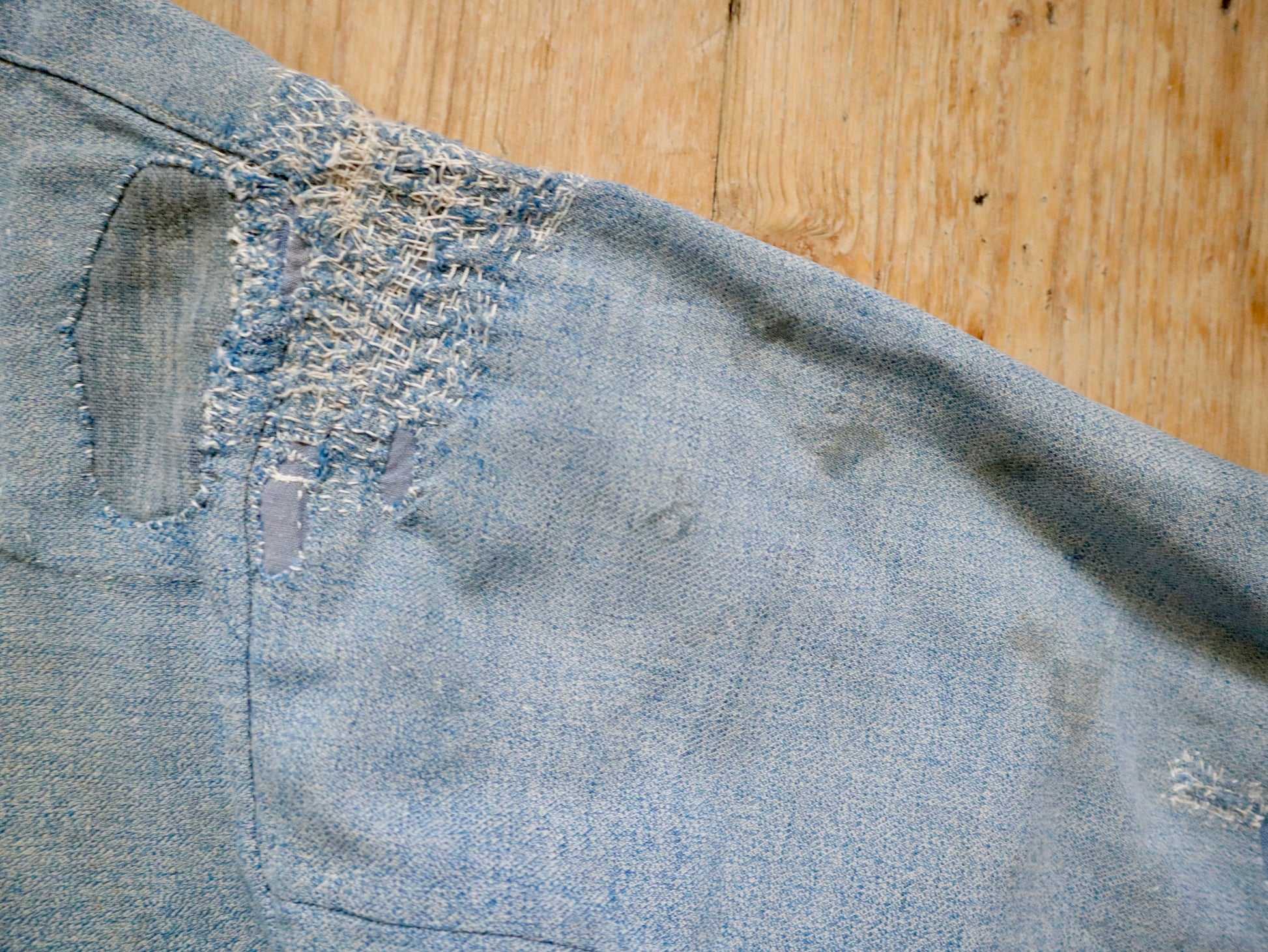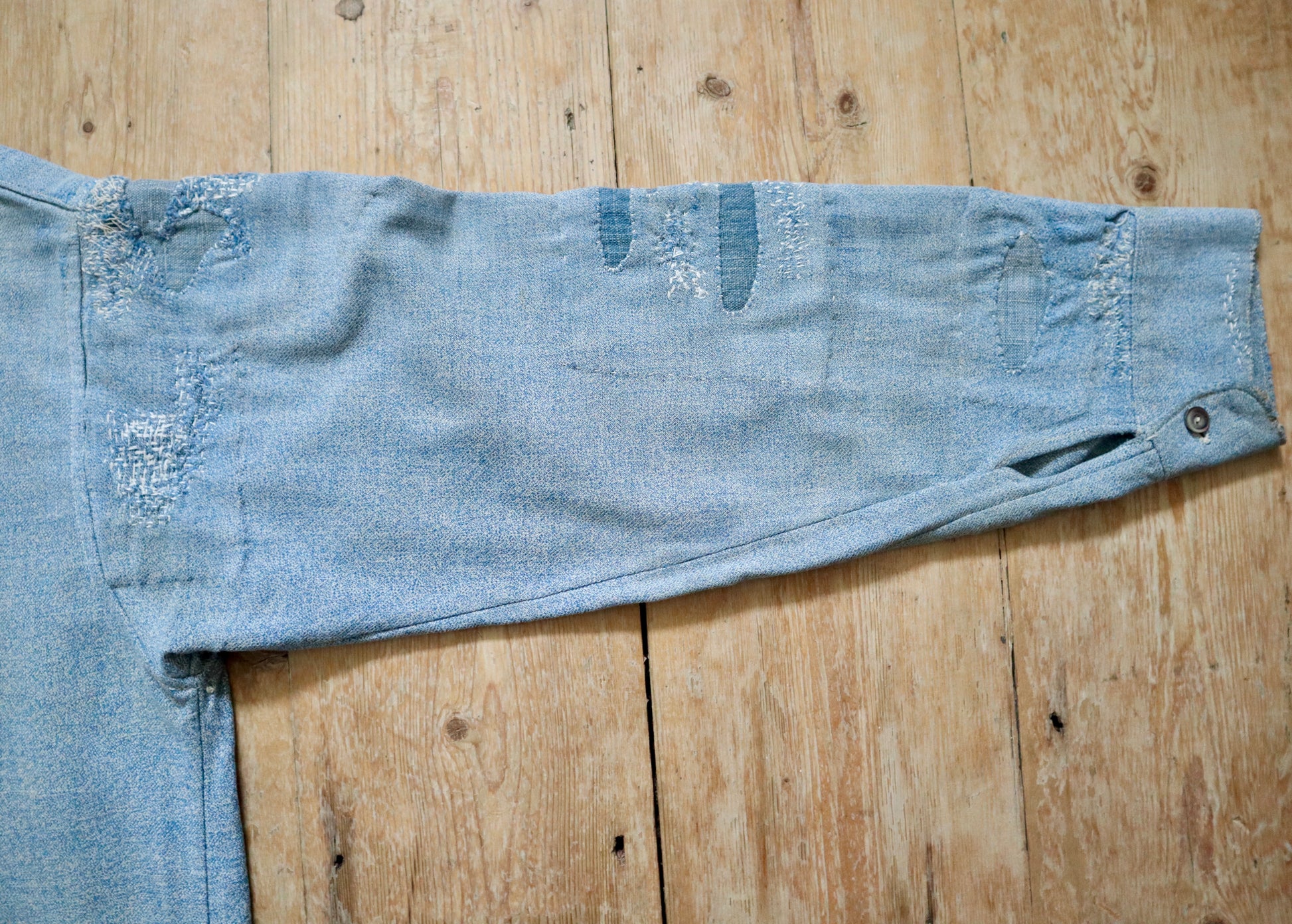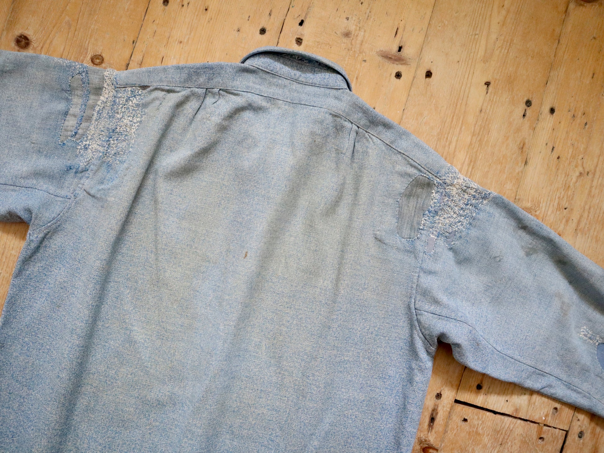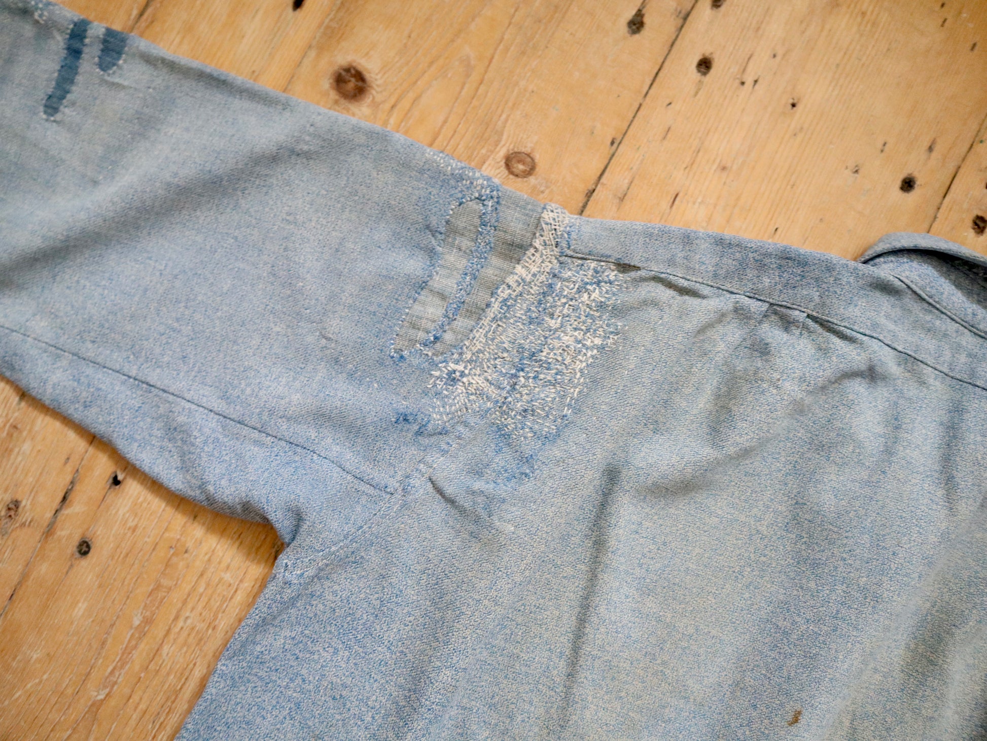 Really great c. 1930s -40s French blue workwear shirt. The cotton is blue and white: speckled in appearance. Pointed collar. Many patches and darned repairs. I love the creativity shown on this piece.