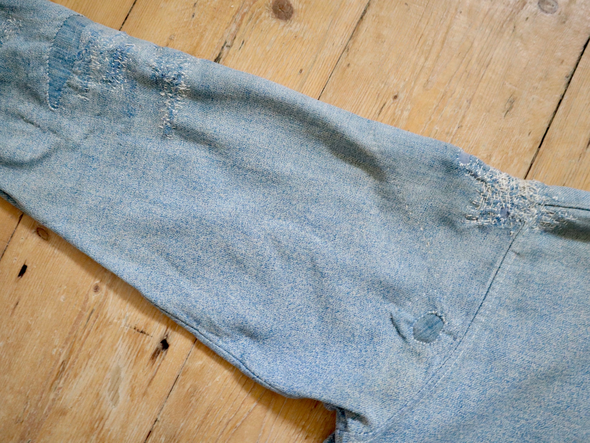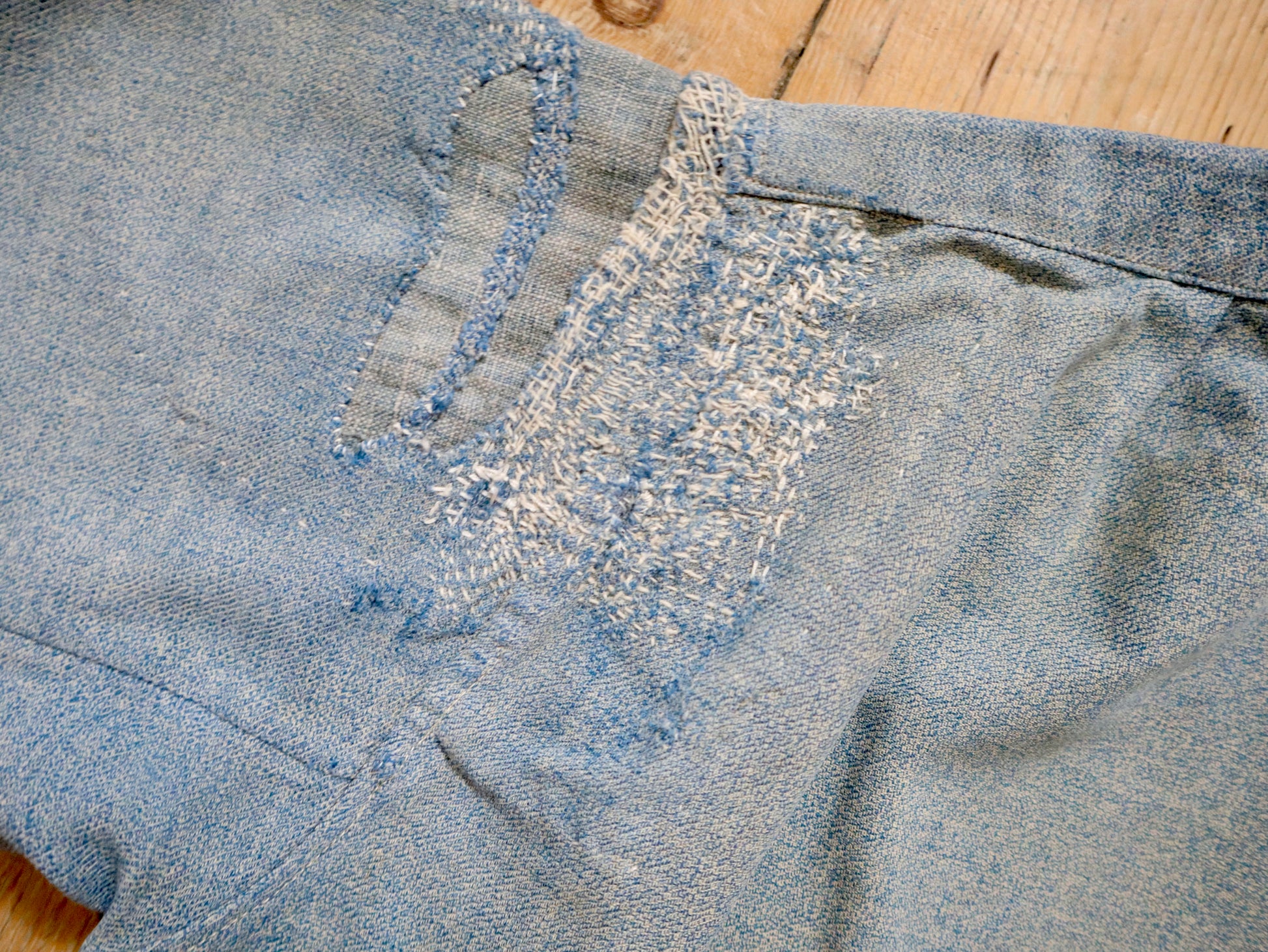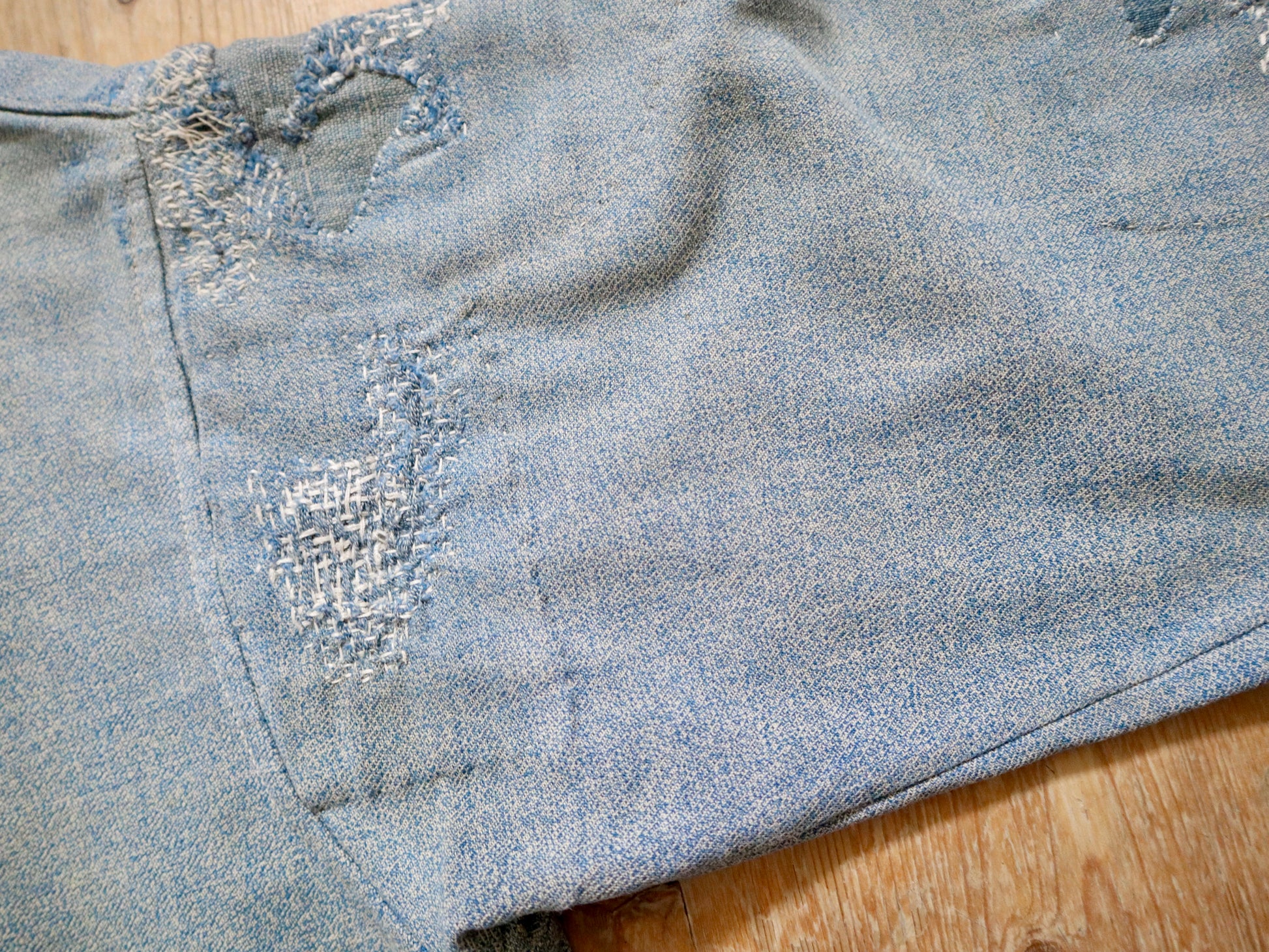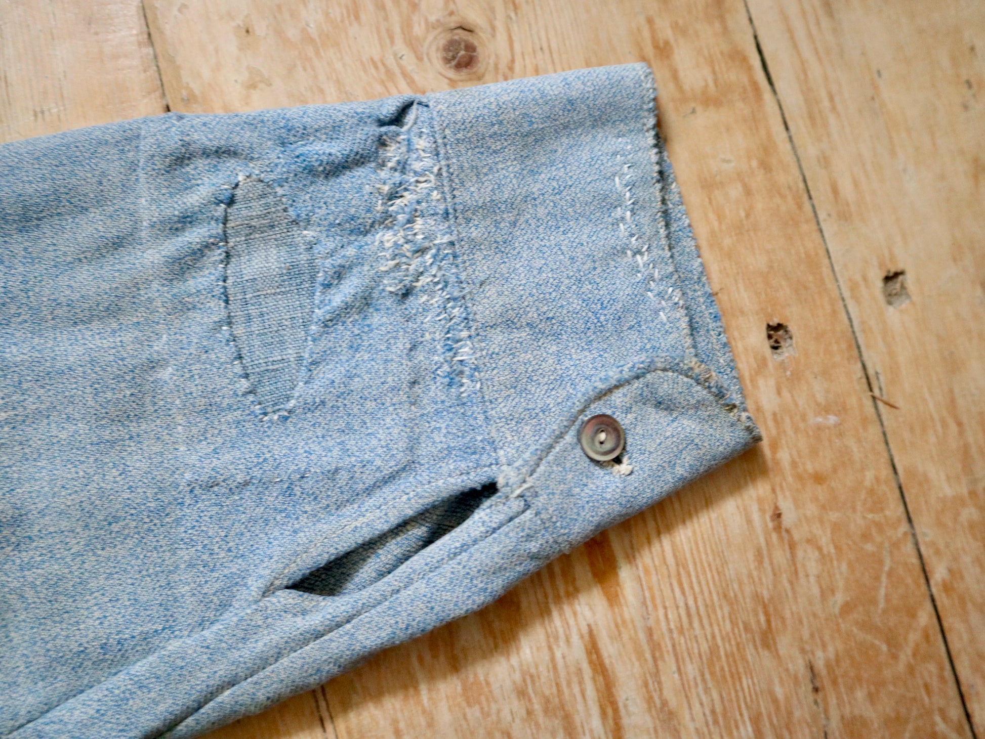 Really great c. 1930s -40s French blue workwear shirt. The cotton is blue and white: speckled in appearance. Pointed collar. Many patches and darned repairs. I love the creativity shown on this piece.