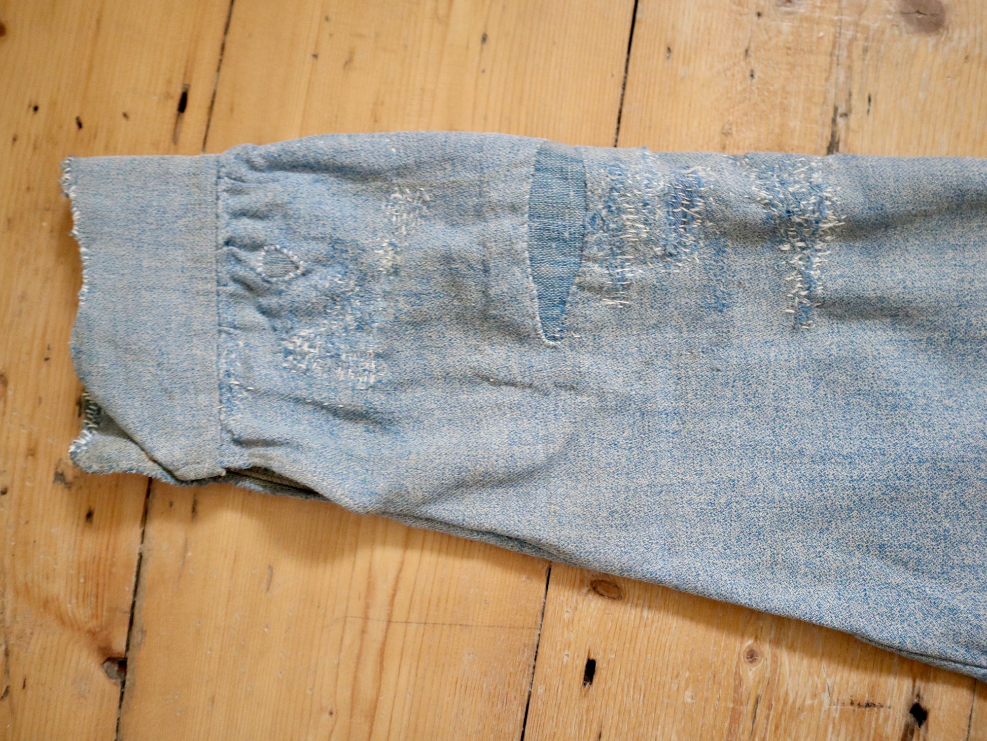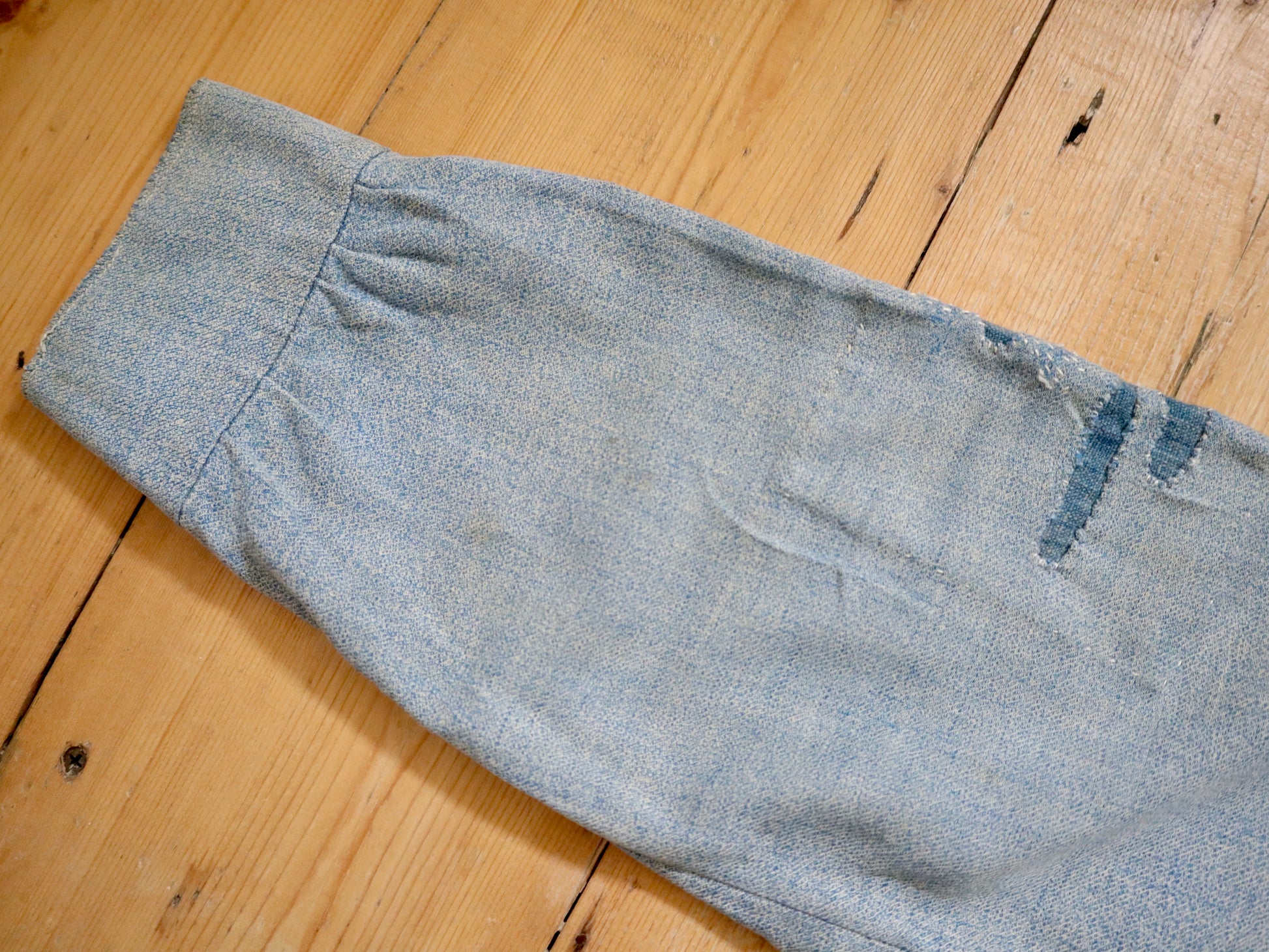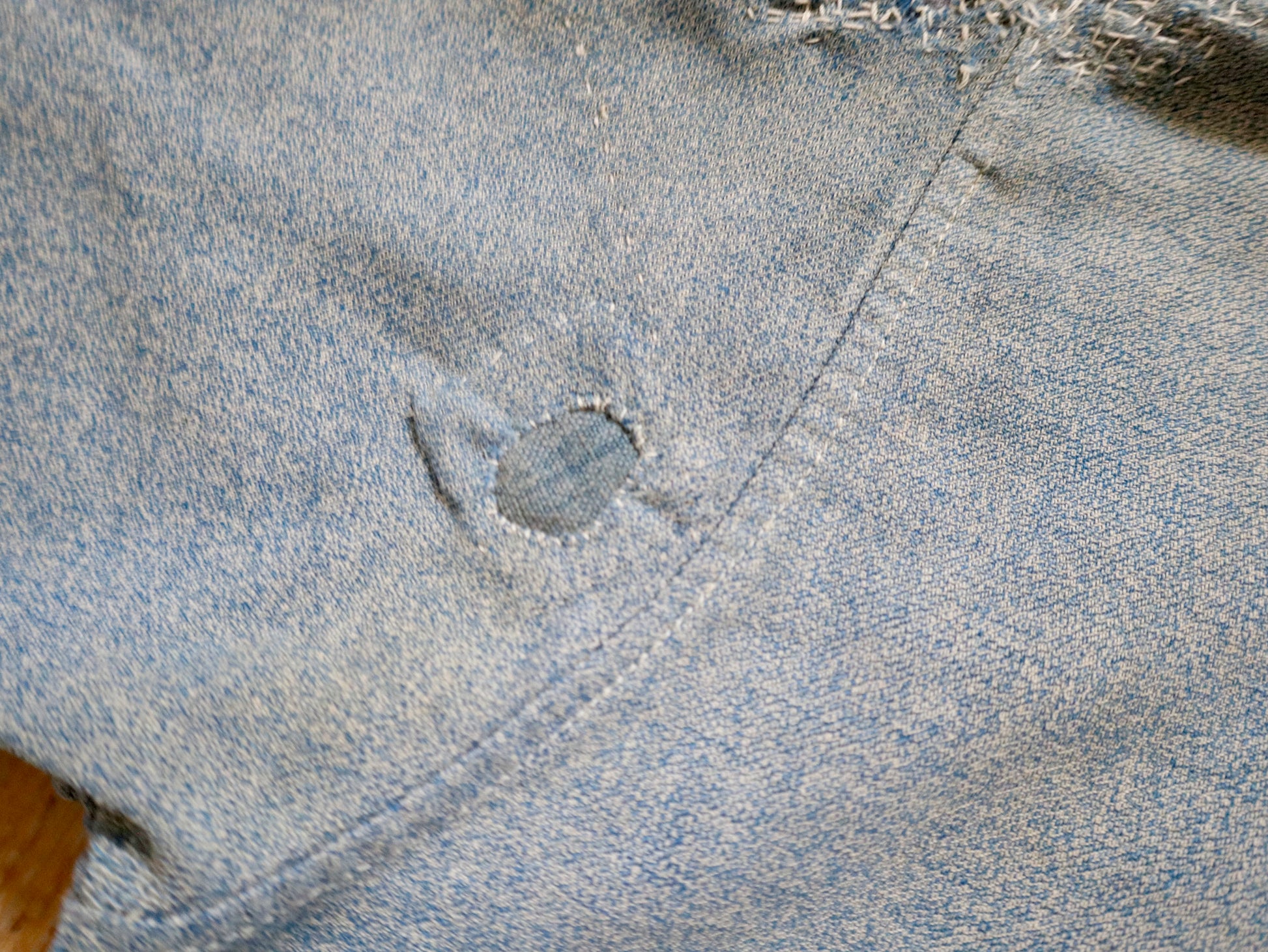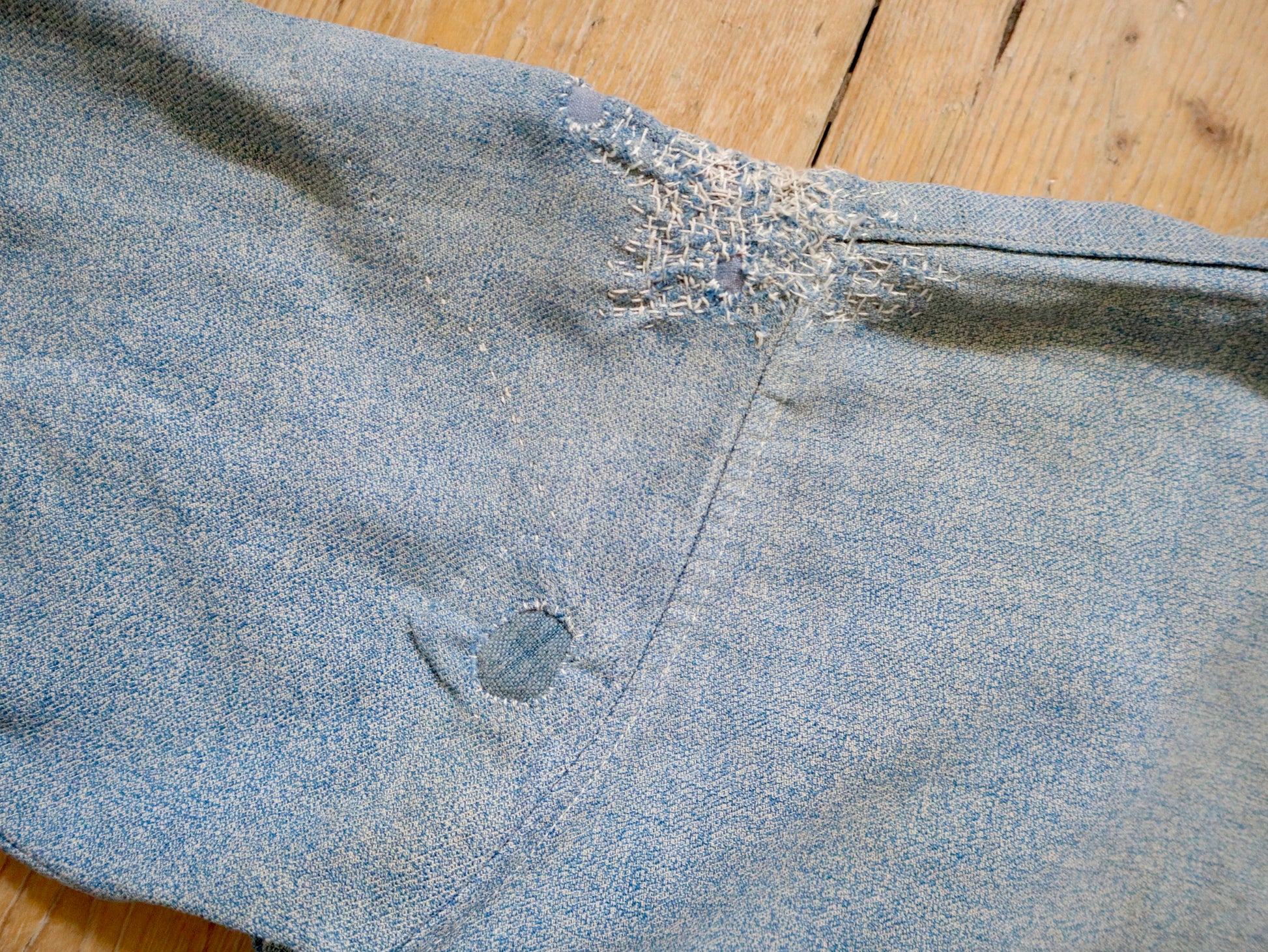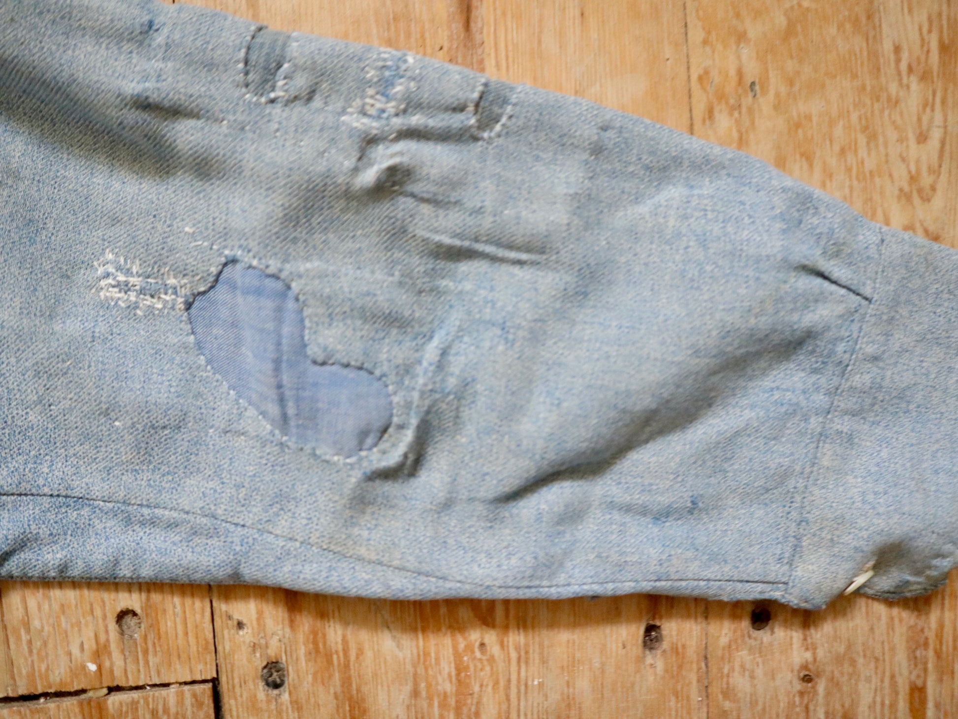 Really great c. 1930s -40s French blue workwear shirt. The cotton is blue and white: speckled in appearance. Pointed collar. Many patches and darned repairs. I love the creativity shown on this piece.