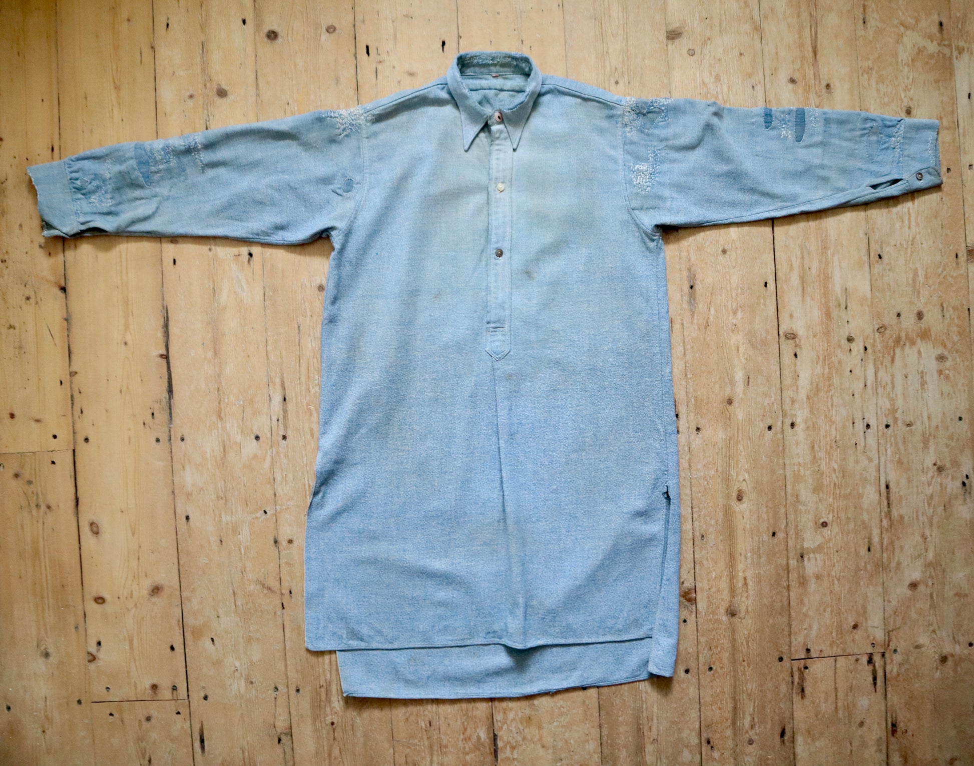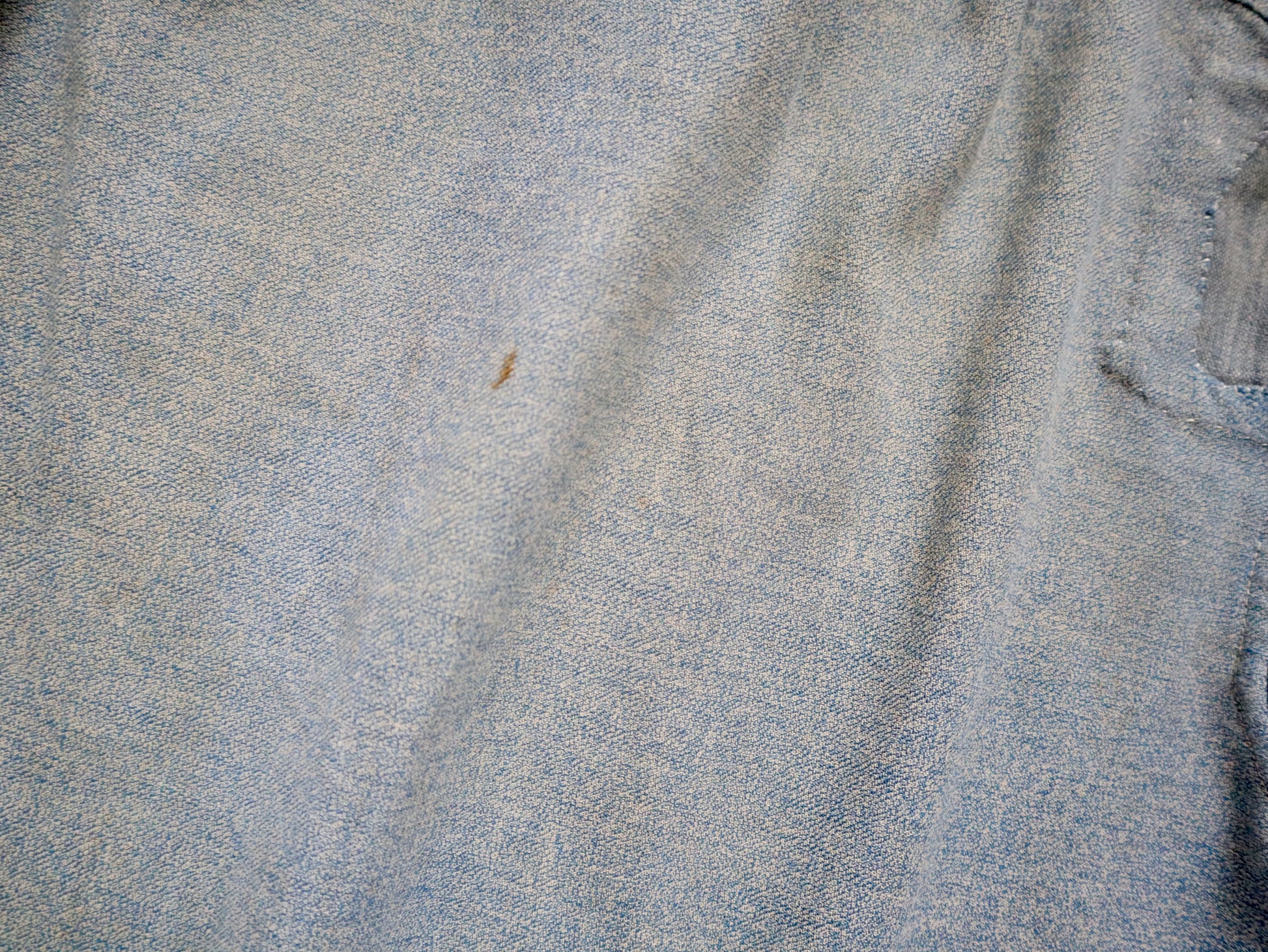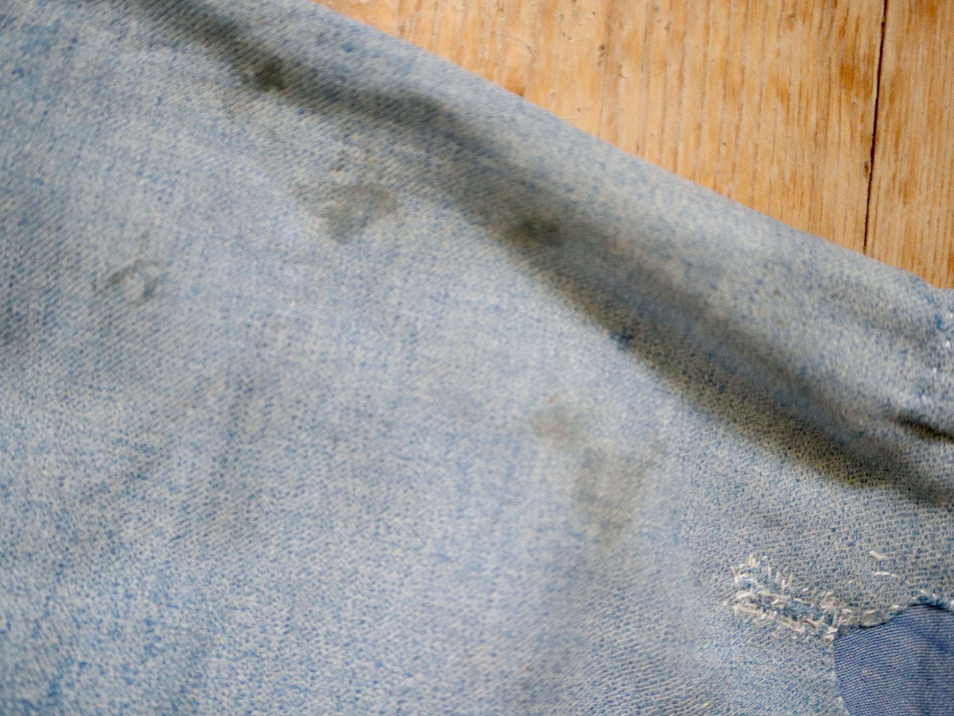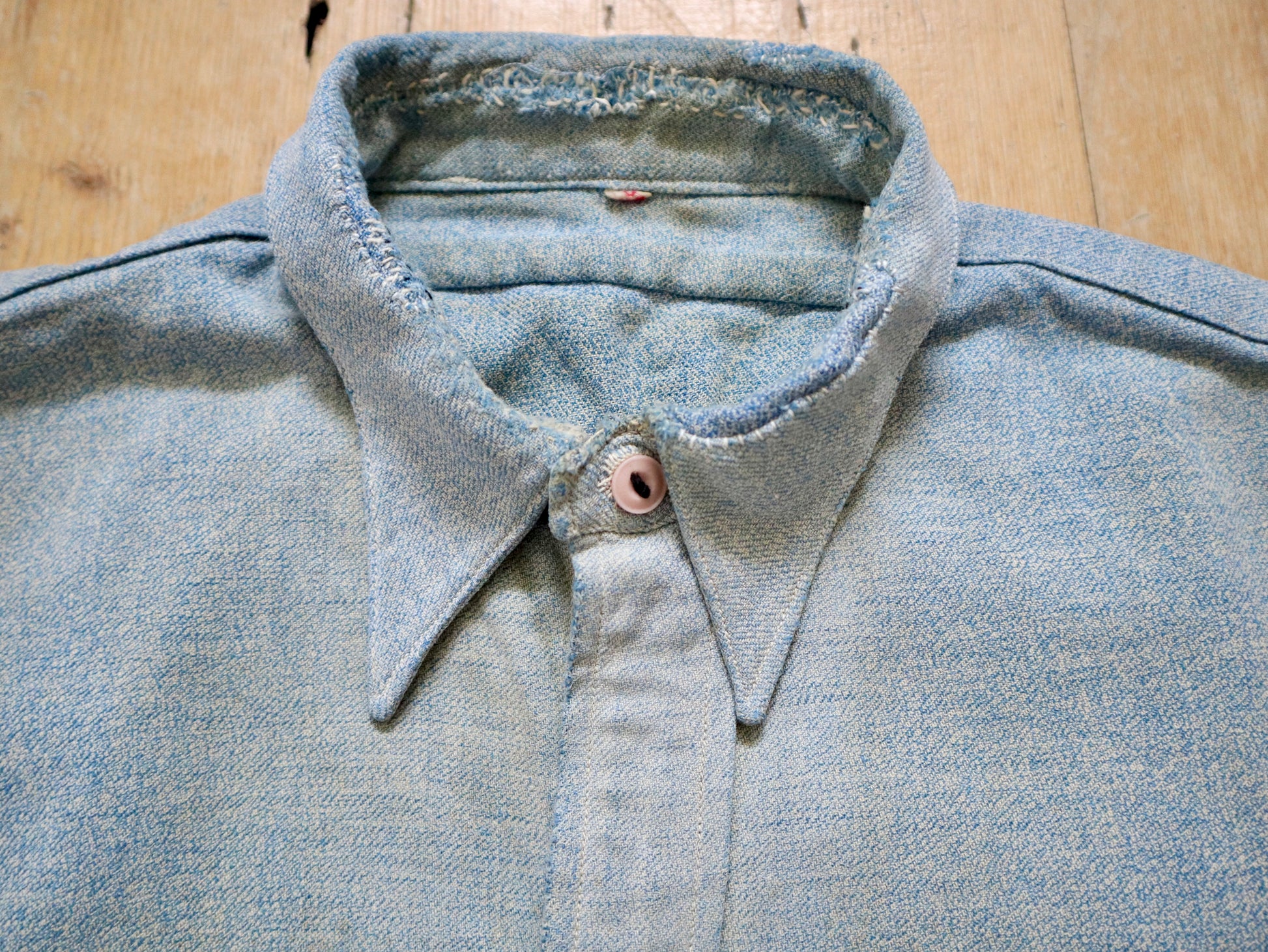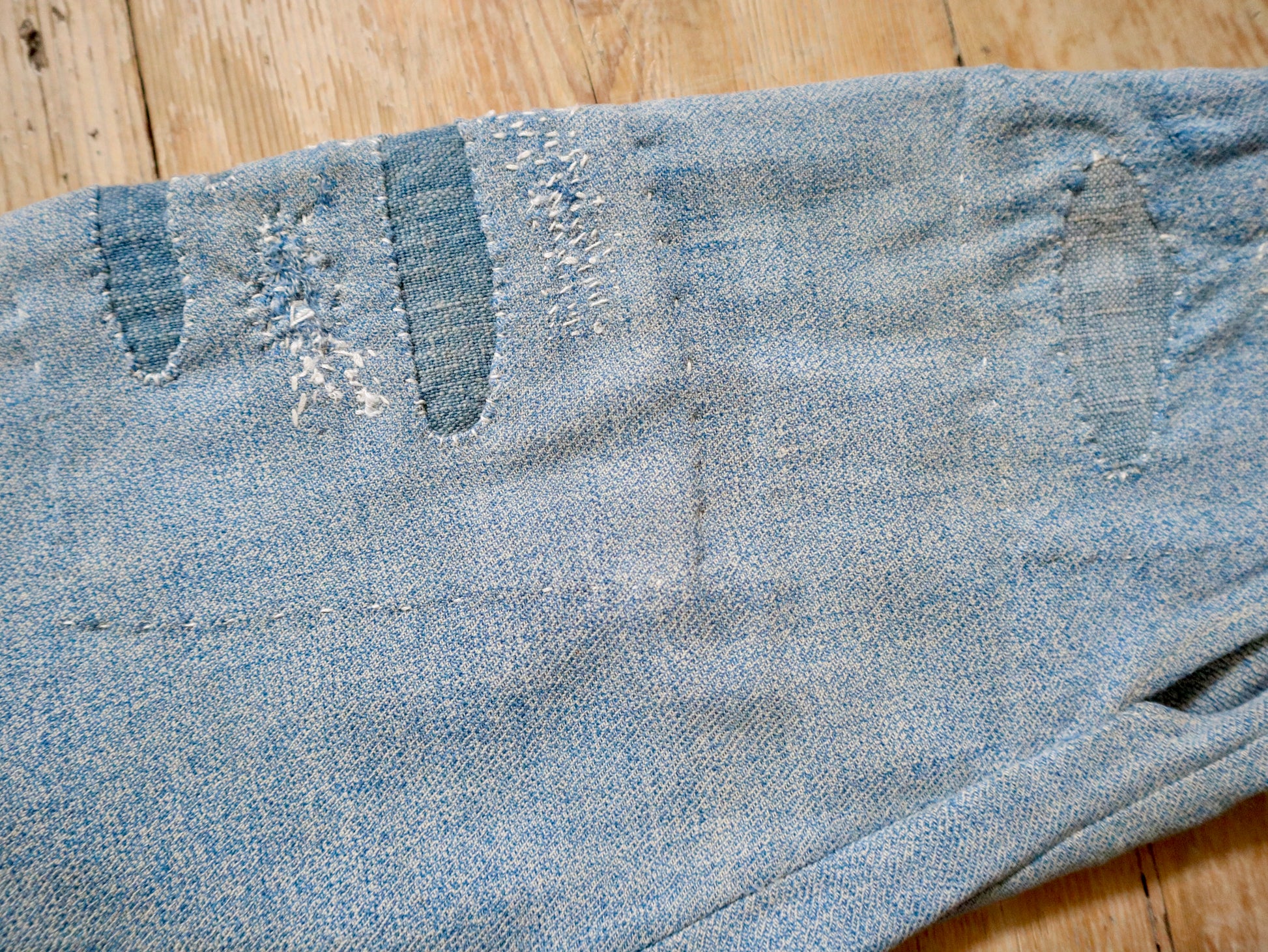 Really great c. 1930s -40s French blue workwear shirt. The cotton is blue and white: speckled in appearance. Pointed collar. Many patches and darned repairs. I love the creativity shown on this piece.