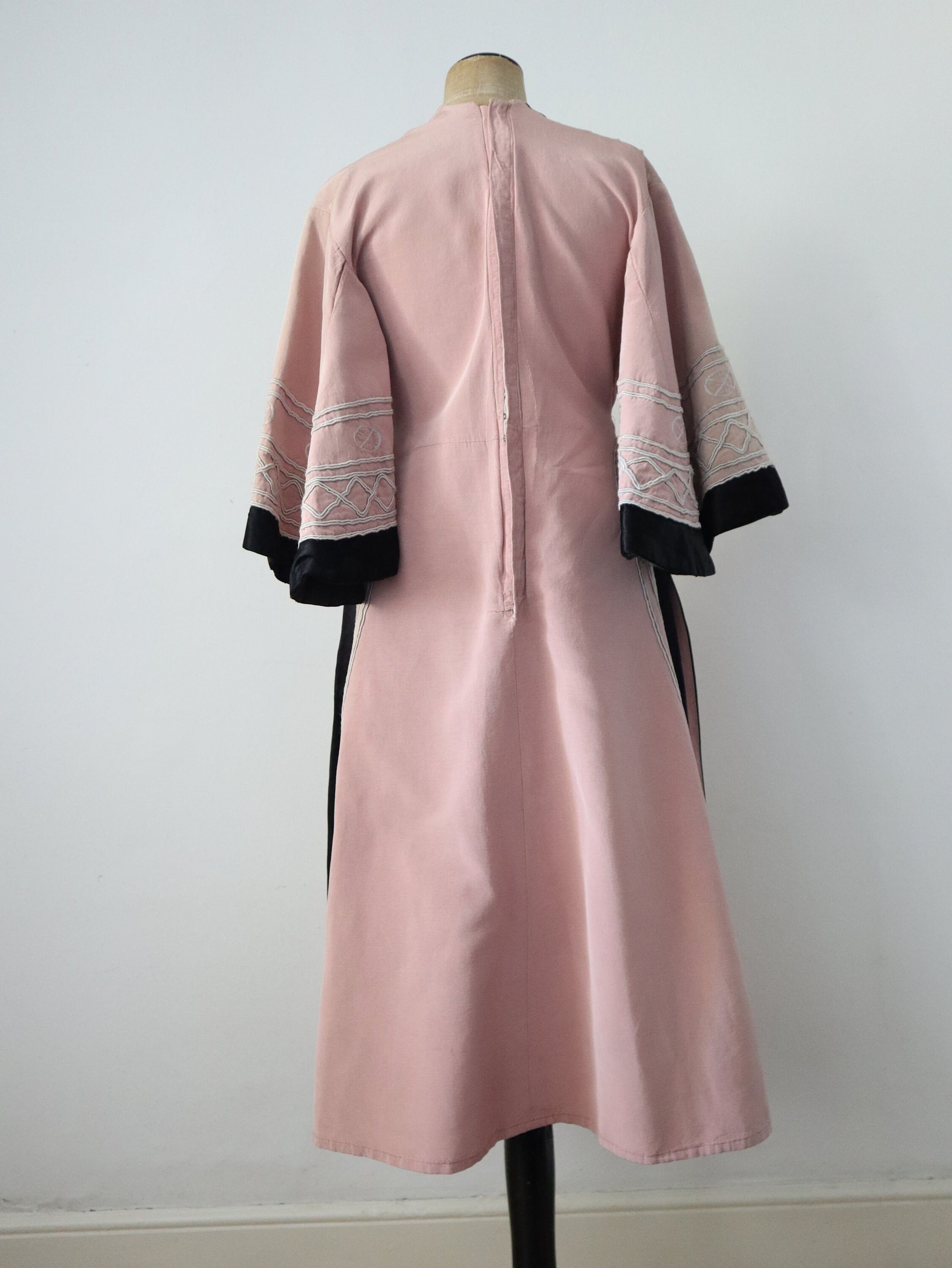 Grosgrain pink fabric lined with white embroidery and soutache design and black silk trim. Fastens up the back with metal hook and eyes. Deep side slits. Lovely wide sleeves.