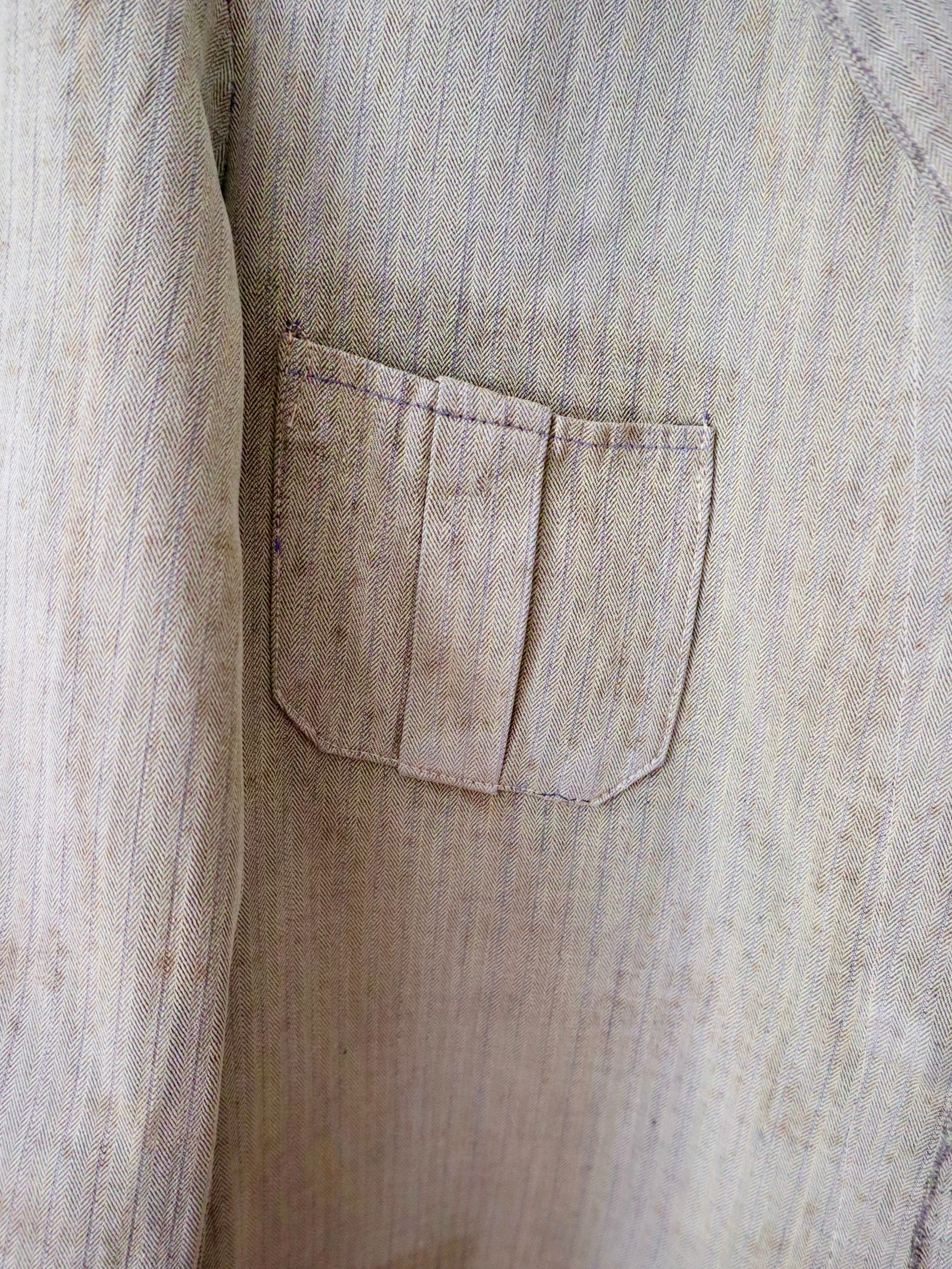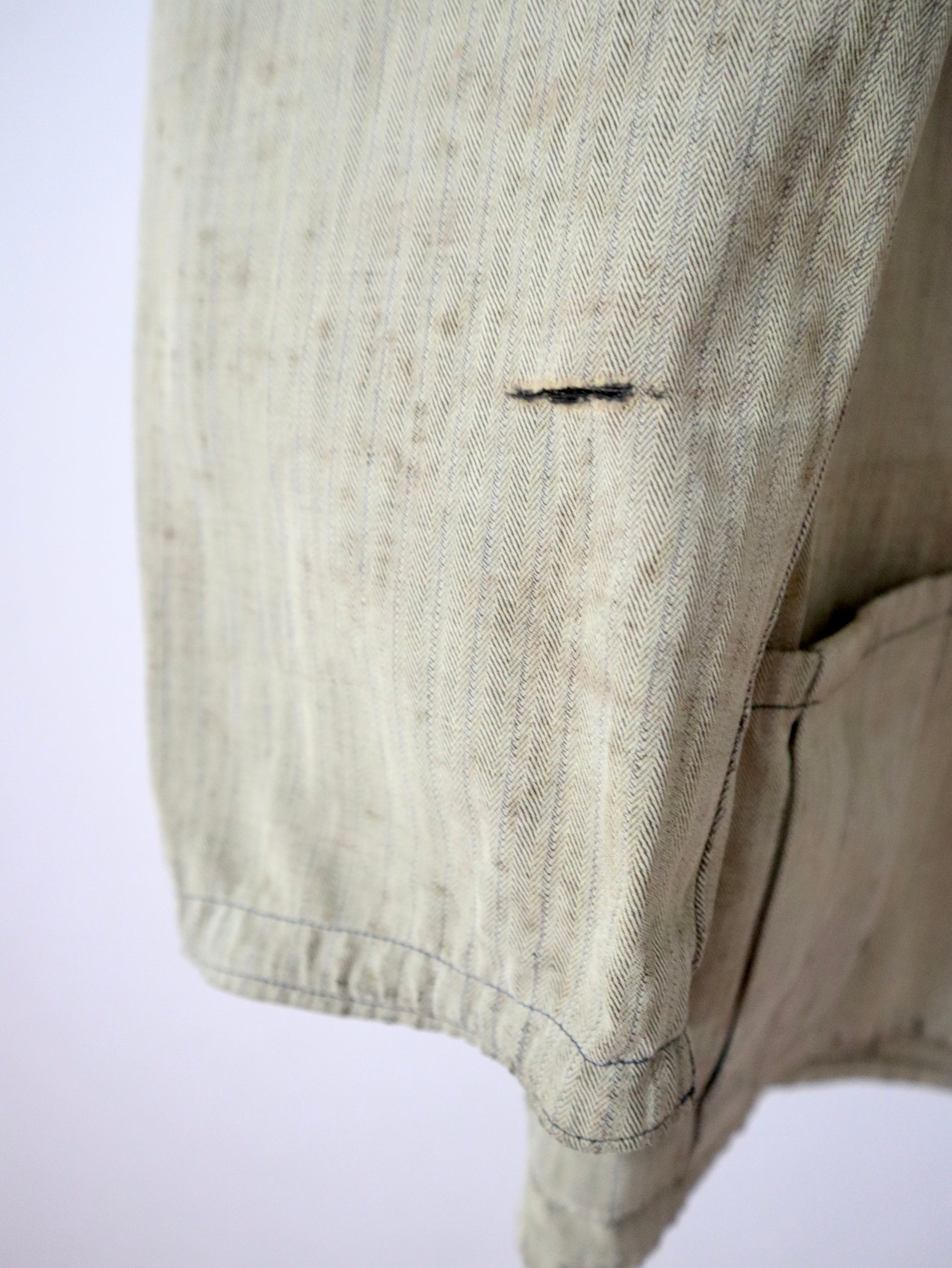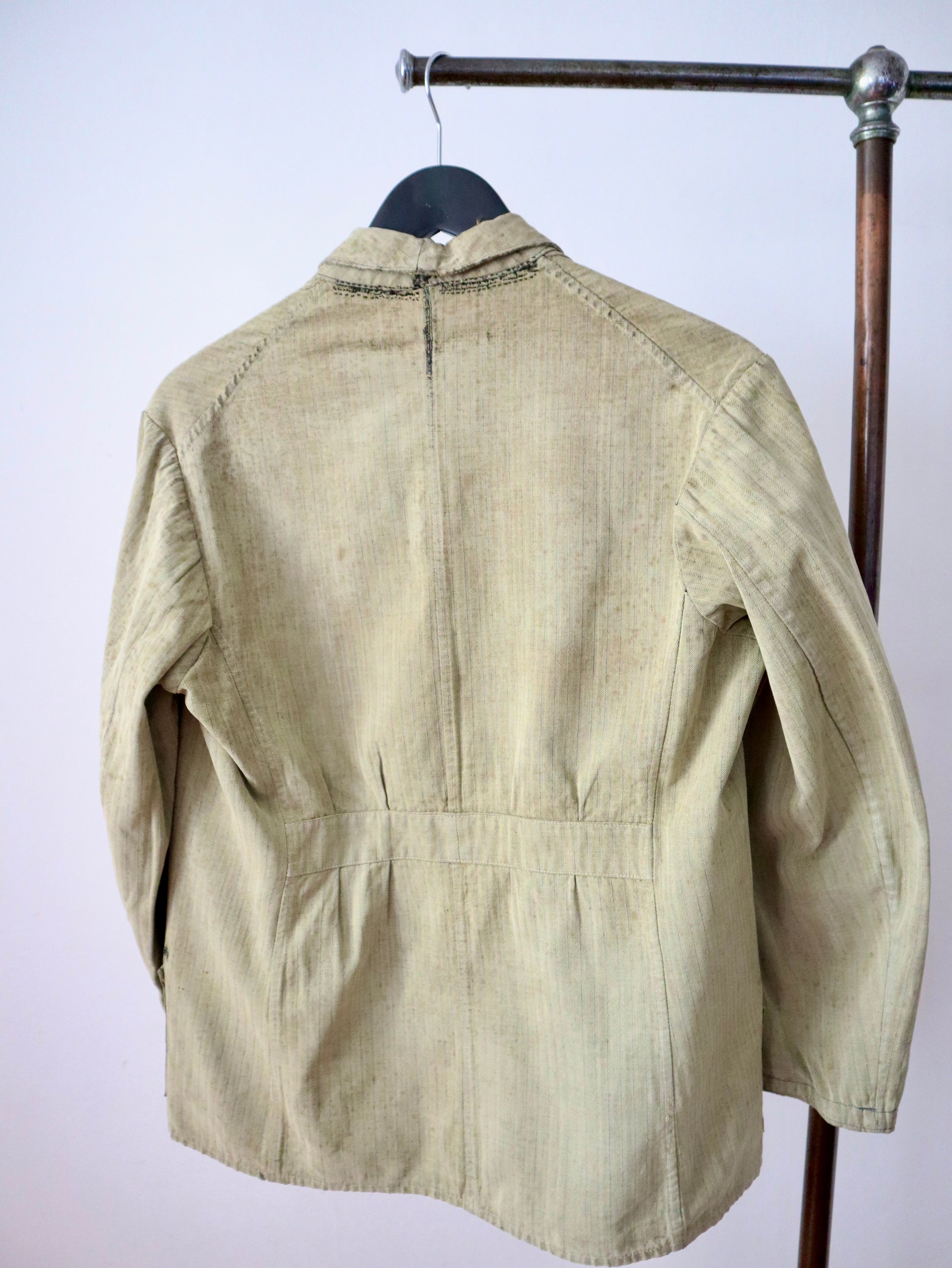 Early 1930s French cotton workwear jacket in a fine herringbone weave. A lightweight cotton with extensive patina and rust speckling throughout. The top left pocket is missing, leaving the shadow of its original placement, and the top right pocket appears to have been moved. All pockets show darker areas suggesting they were once larger or had flaps.