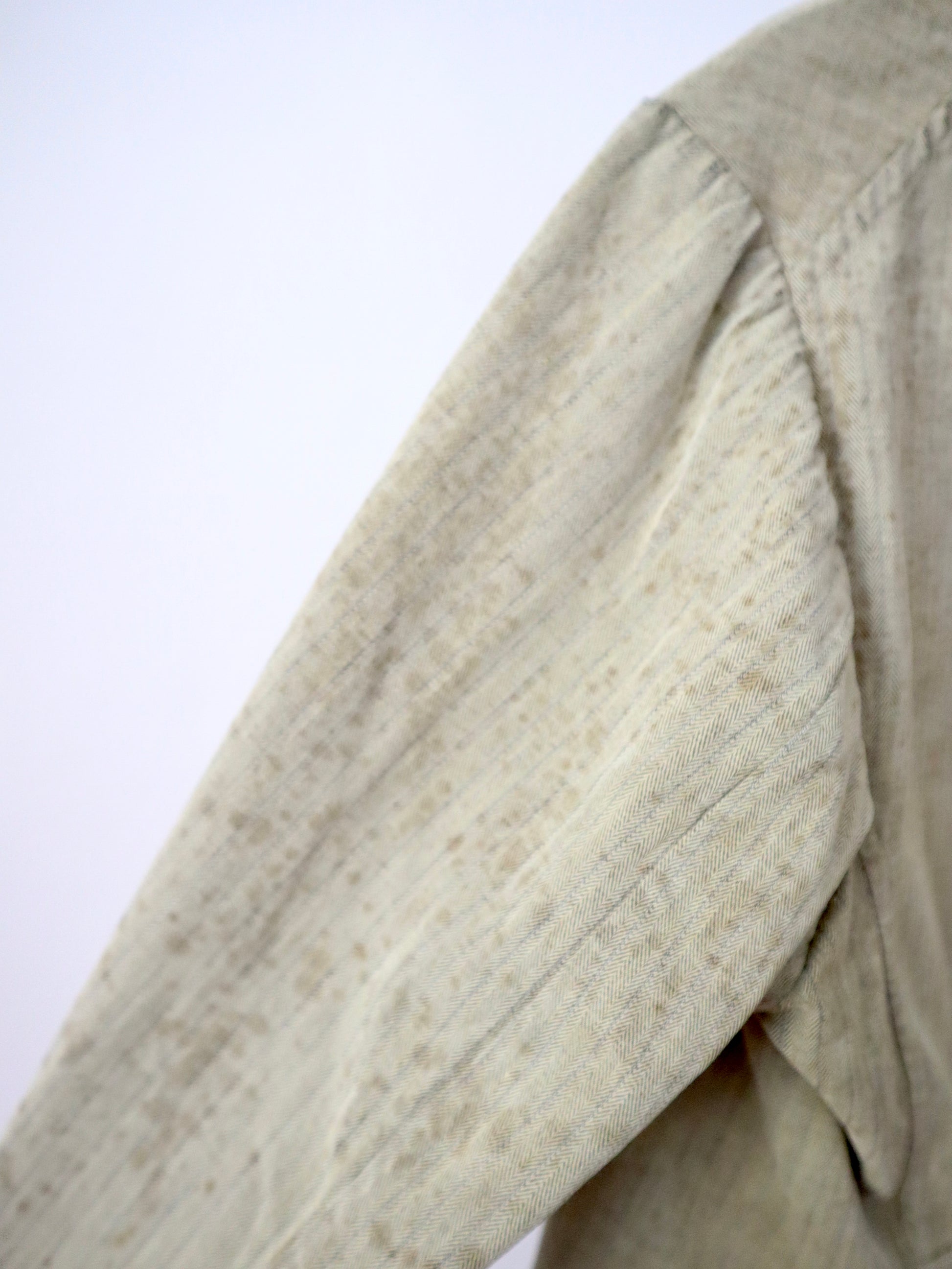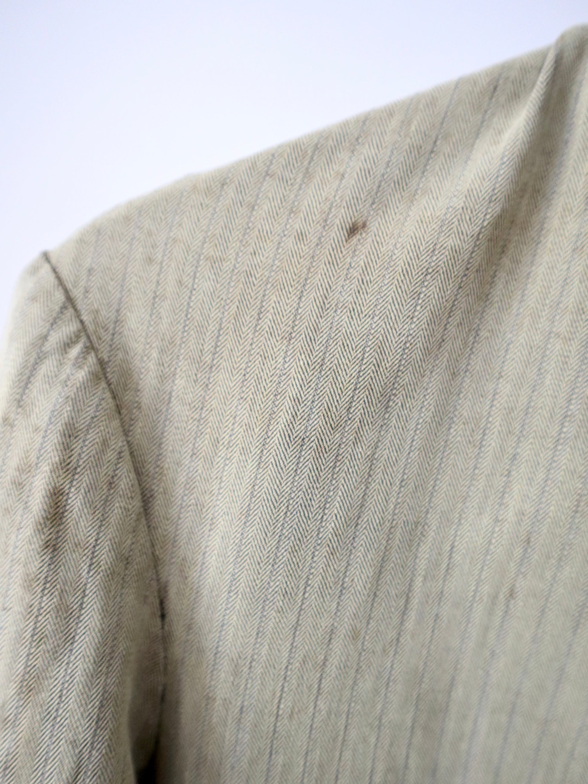The right sleeve has a slit that requires mending. The inside of the cuffs has been reinforced by hand with a band of cotton tape. There are many hand-sewn repairs around the collar, and the jacket fastens with three buttons at the front. A shaped band at the back adds subtle structure to the fit. A rare example with remarkable texture and age.