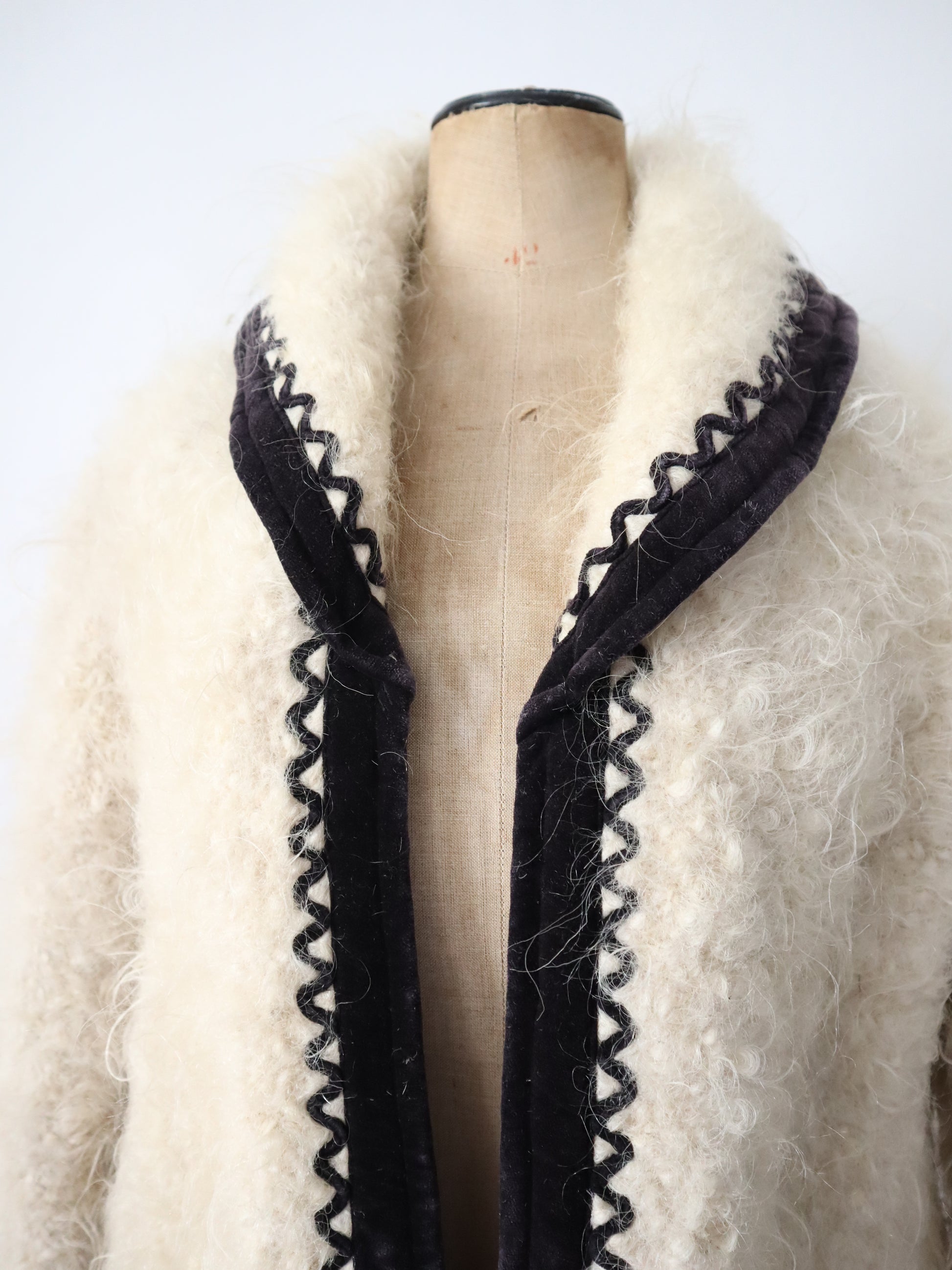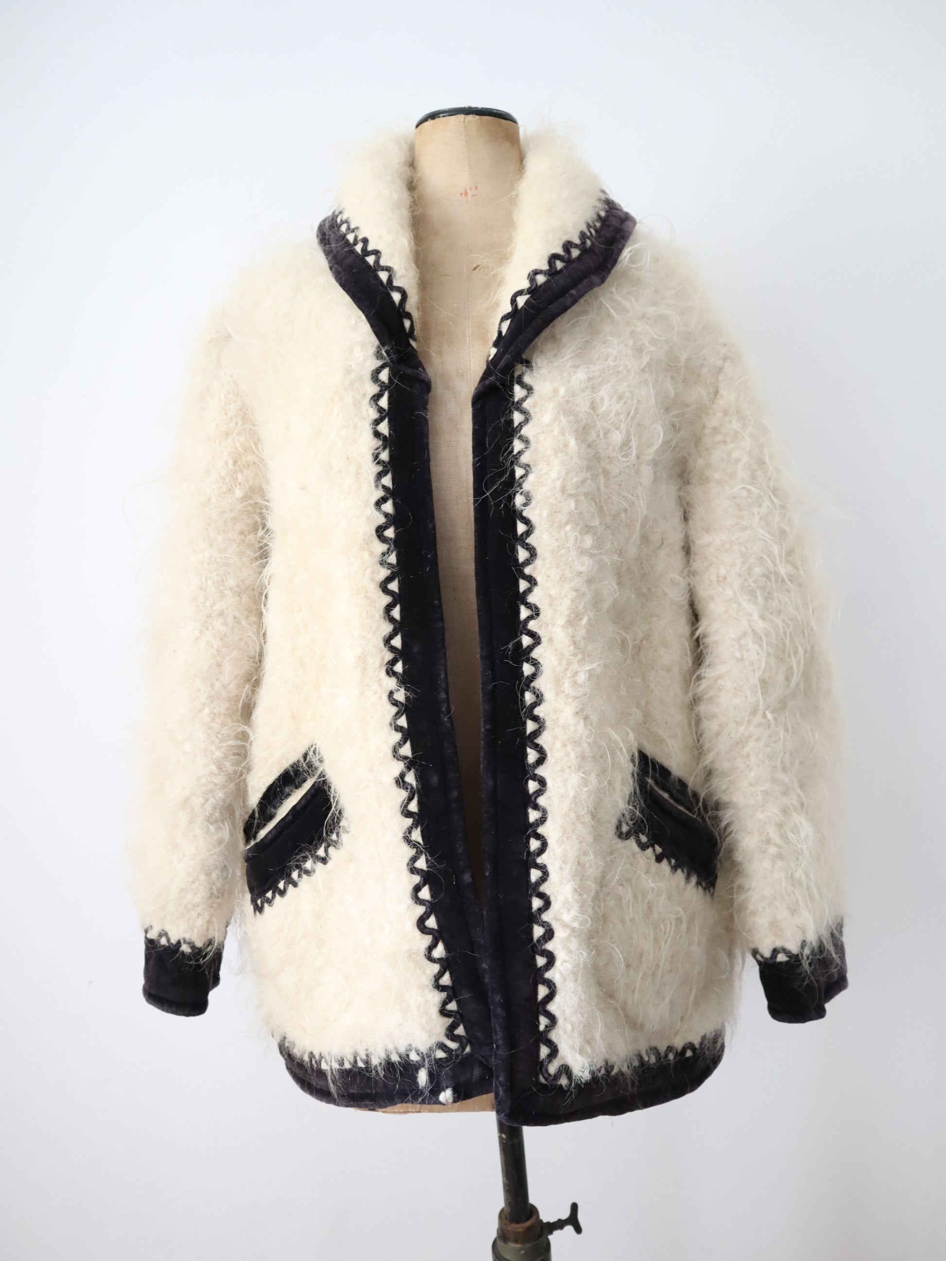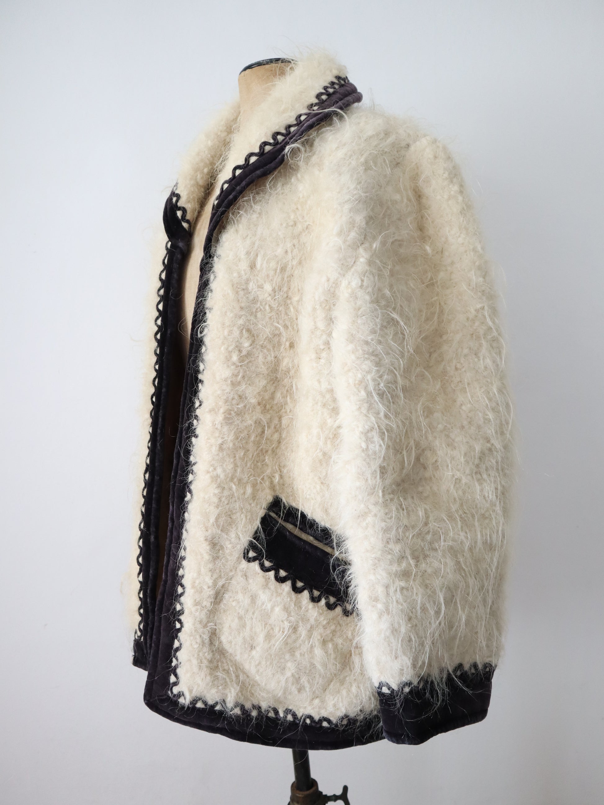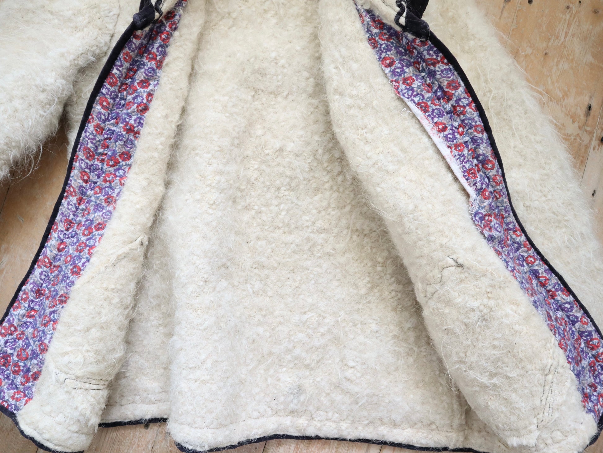 1940s Transylvanian Cream Curly Sheep’s Wool Folk Coat Jacket Velvet Trim Traditional Clothing