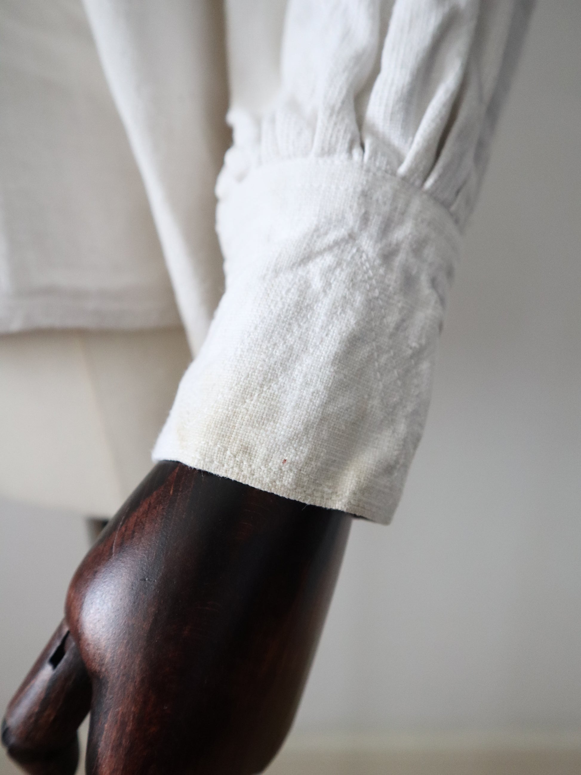 Freshly laundered. Natural irregularities present in the linen weave. A yellowish mark on one cuff as shown, which may lift with further cleaning.