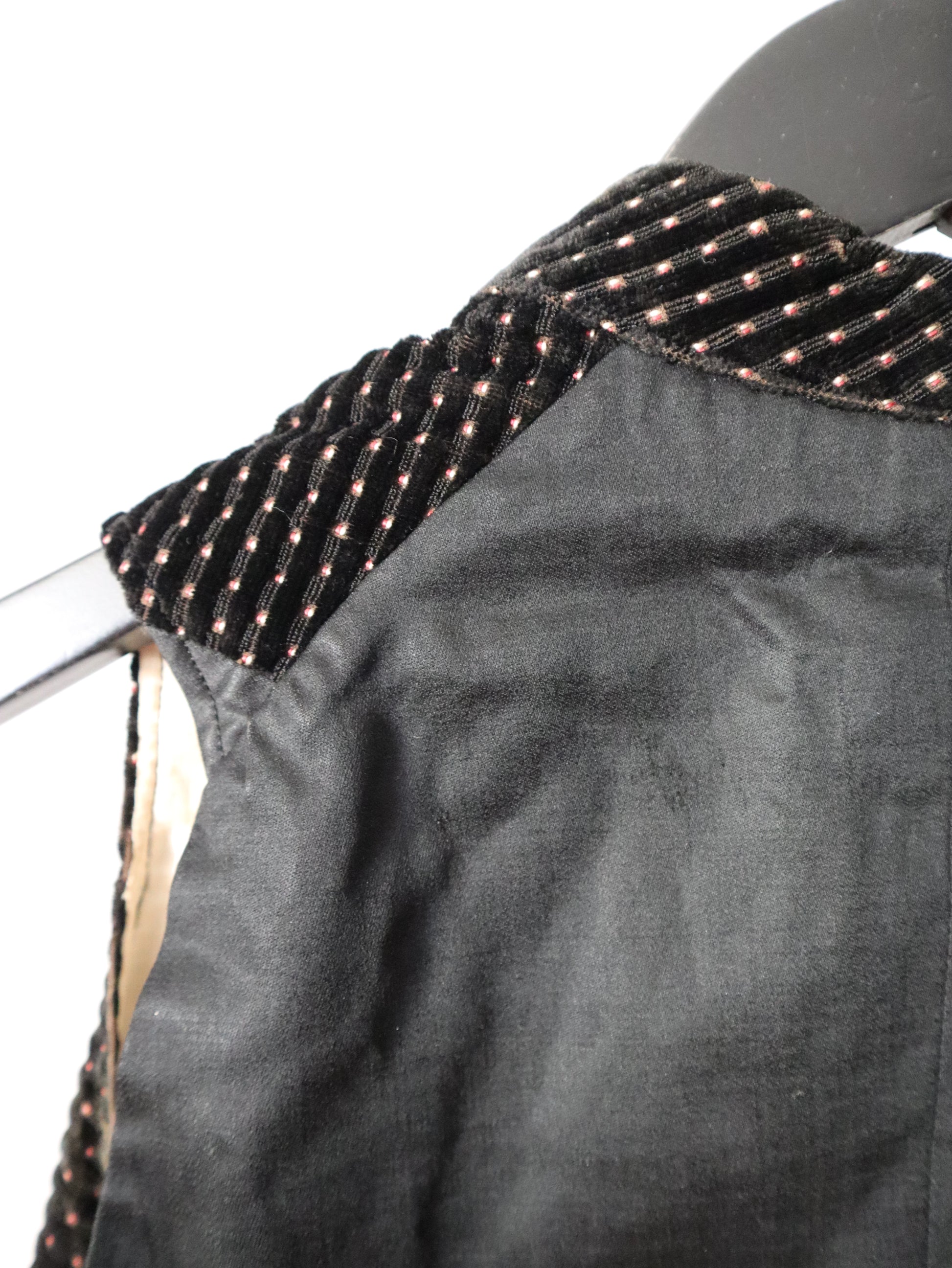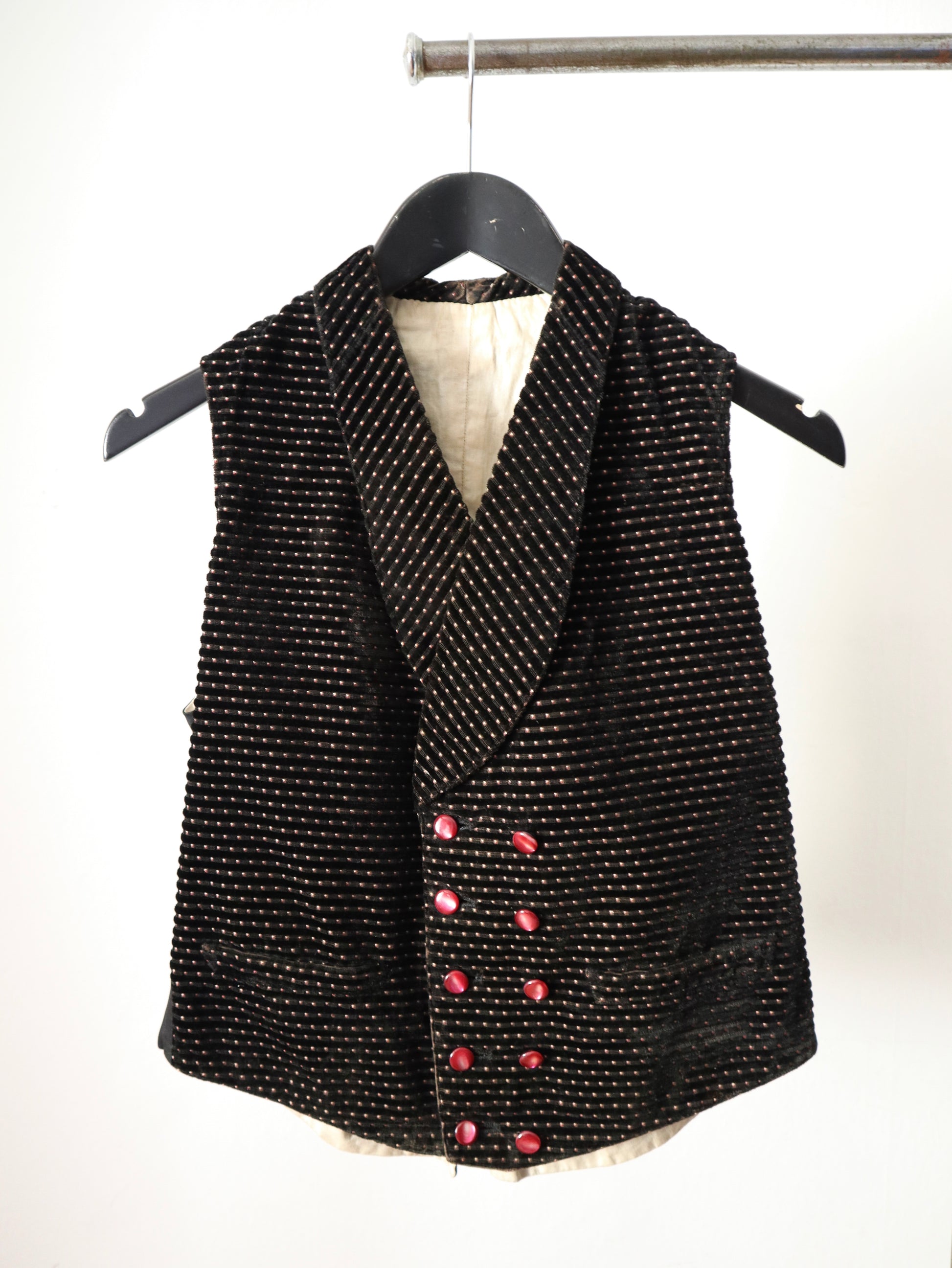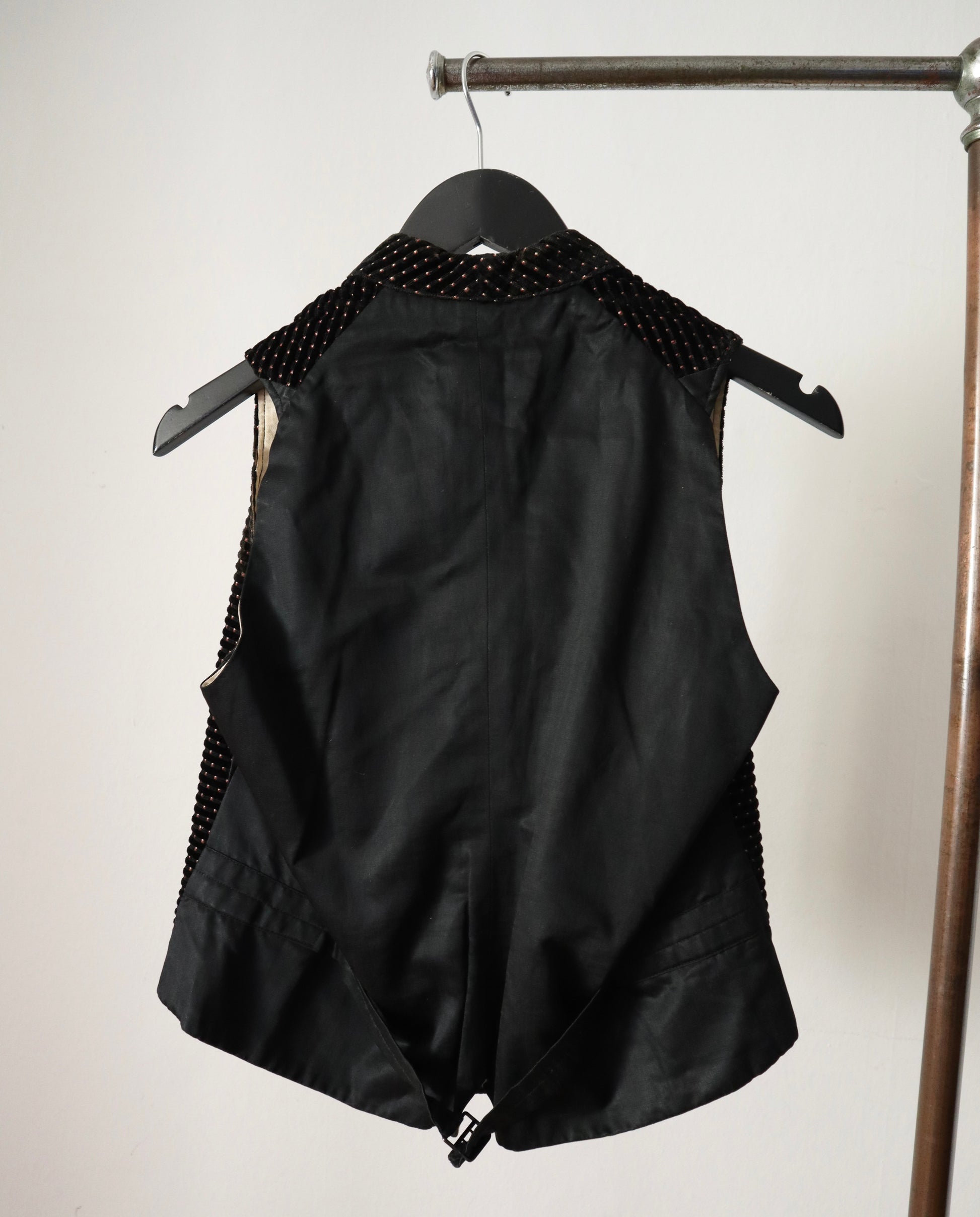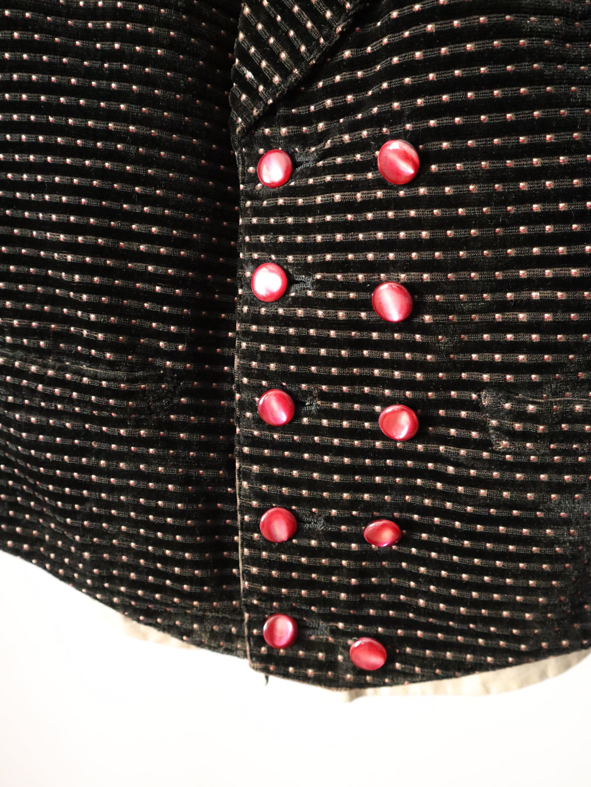 Antique 19th century French silk velvet waistcoat. Double breasted with two pockets. Black with tiny deep red and taupe. Glass buttons. Cinch back metal buckle. A delightful waistcoat.