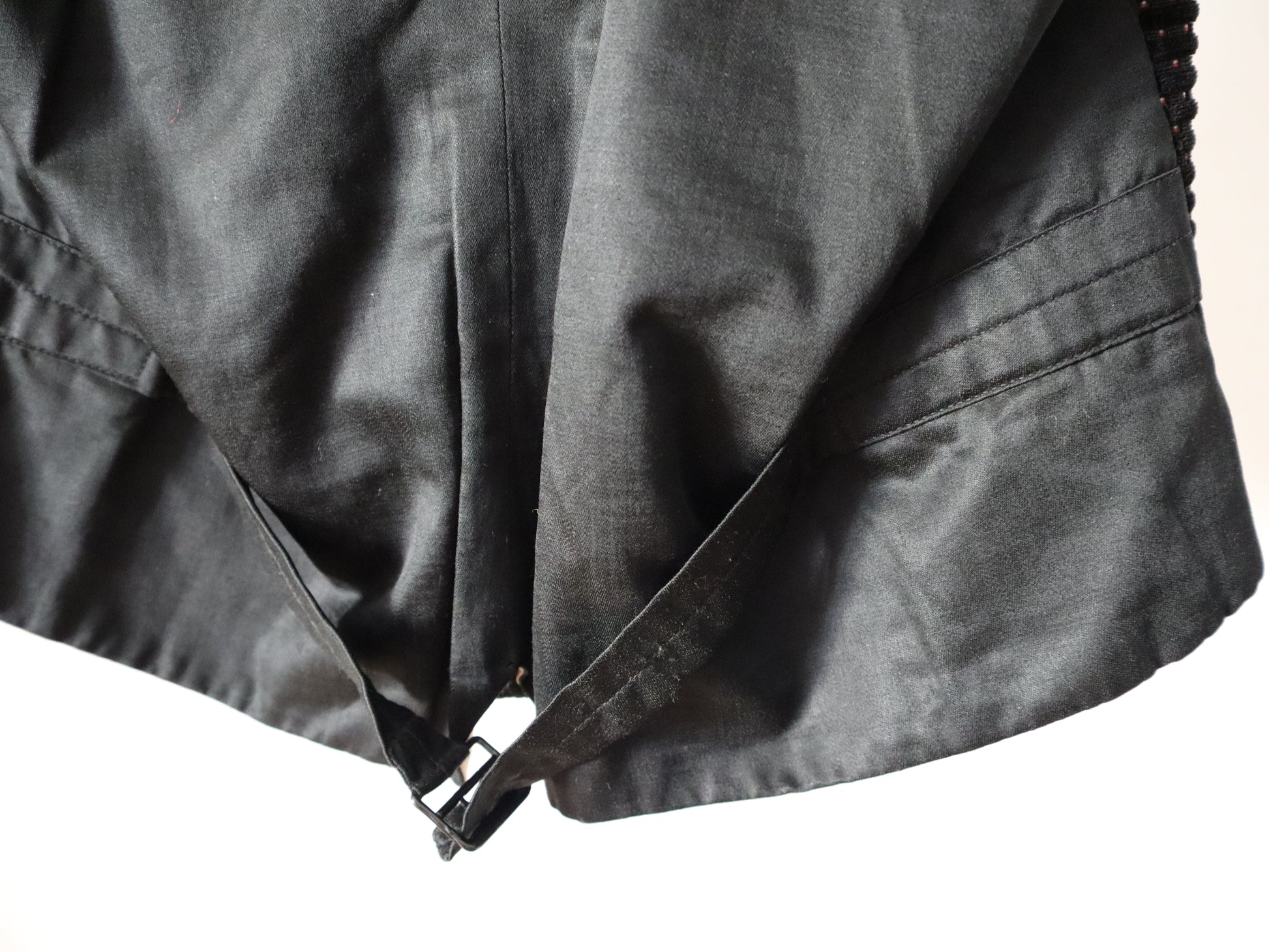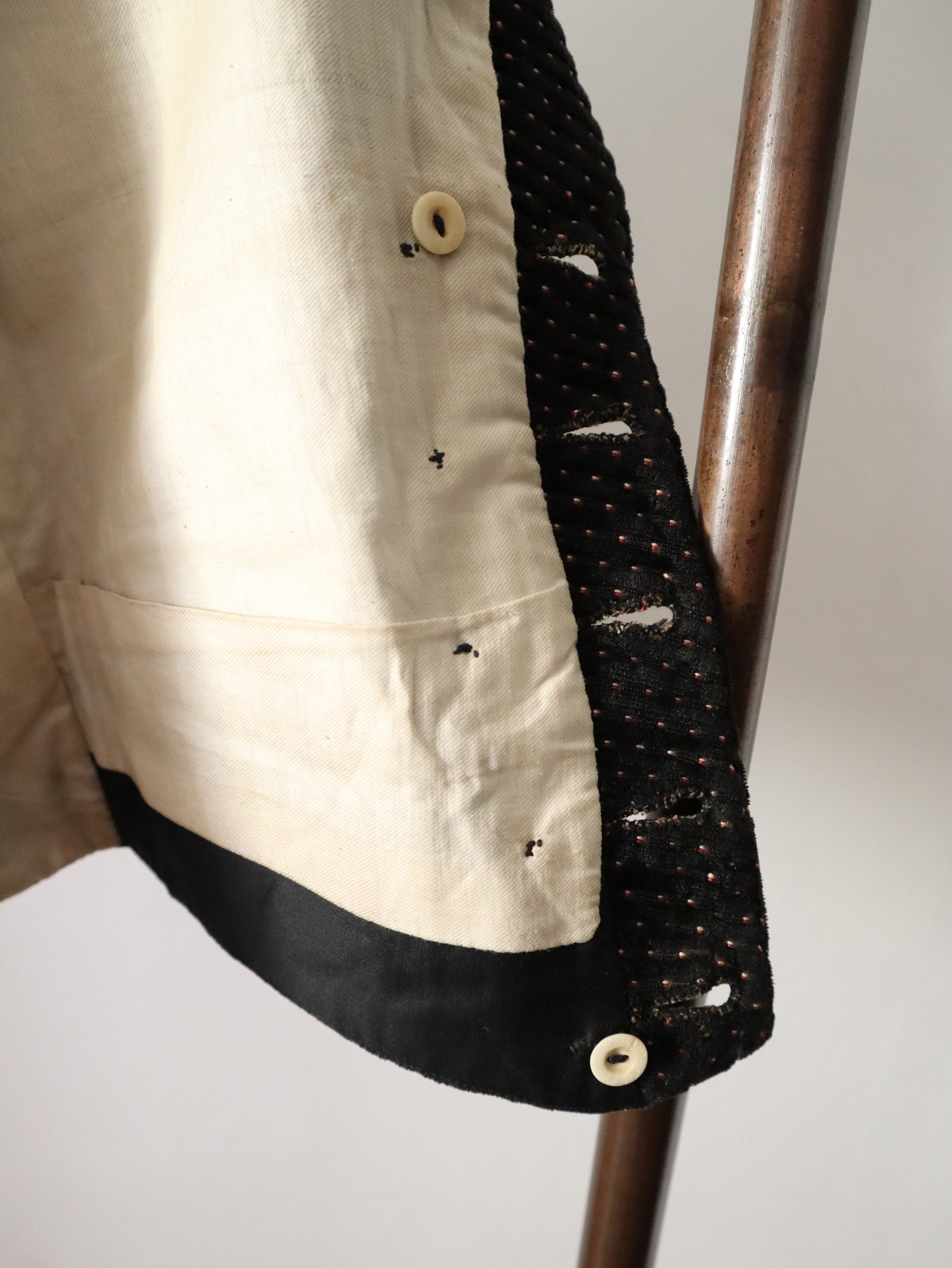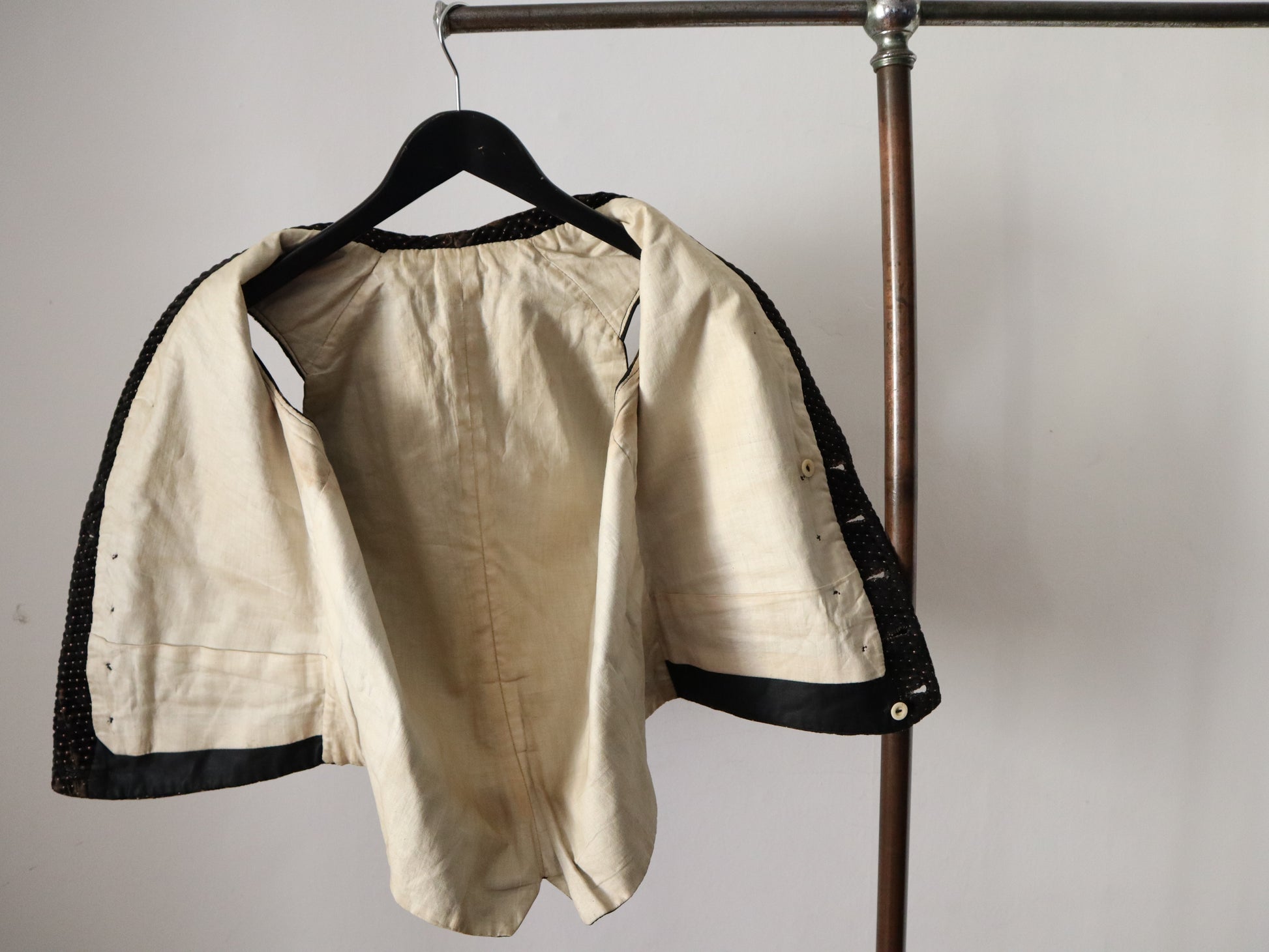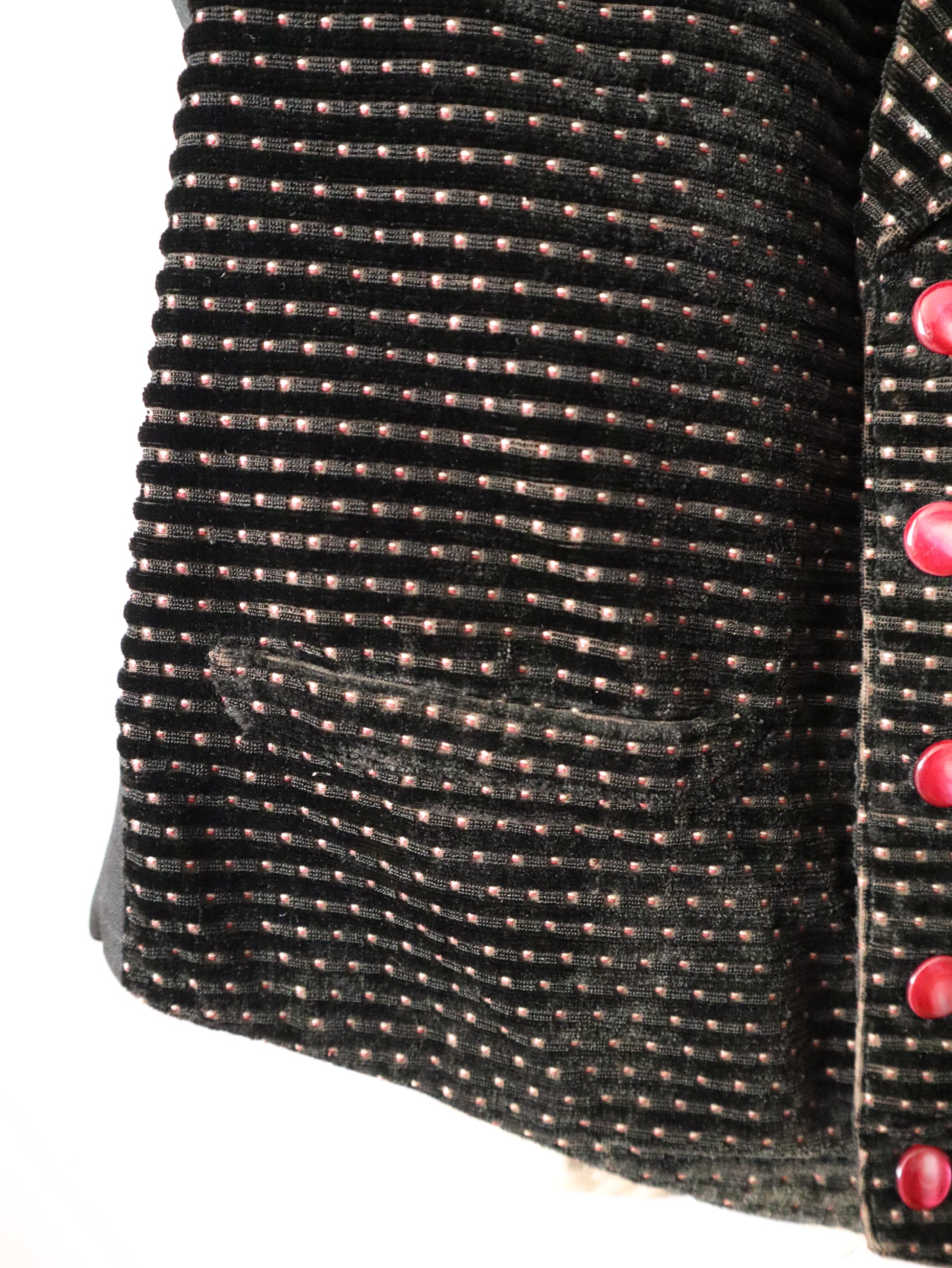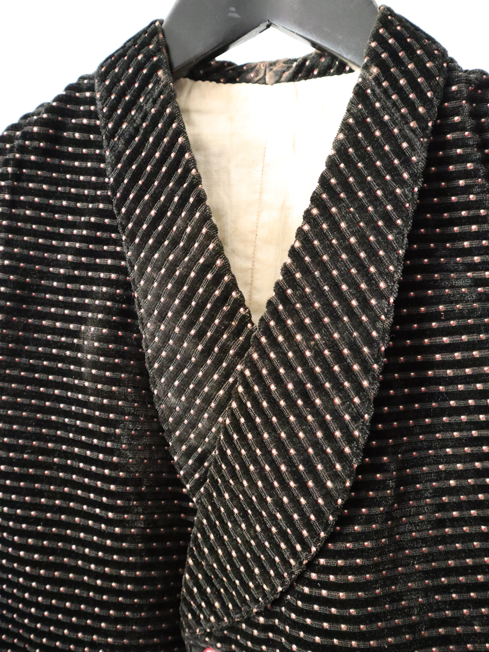 Antique 19th century French silk velvet waistcoat. Double breasted with two pockets. Black with tiny deep red and taupe. Glass buttons. Cinch back metal buckle. A delightful waistcoat.