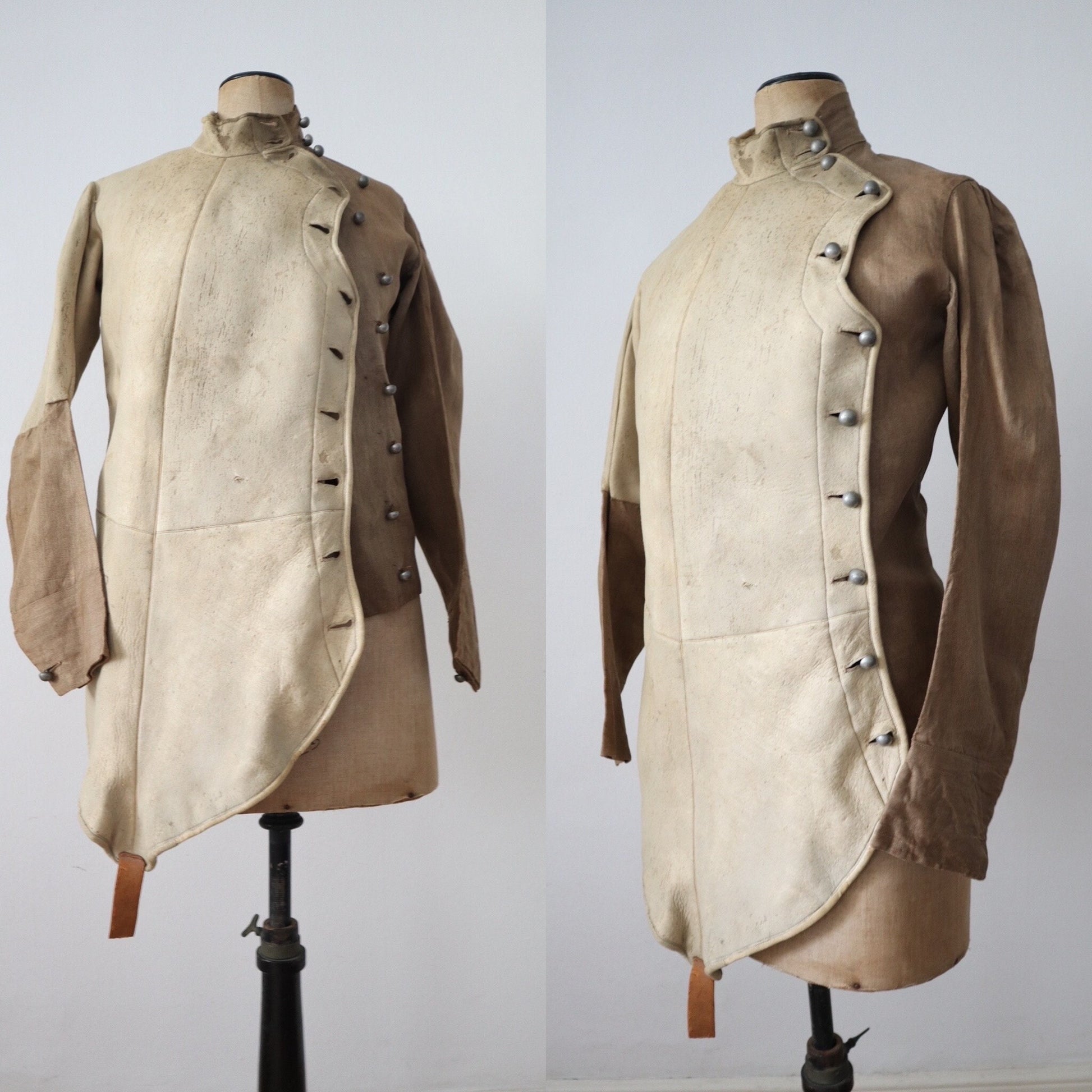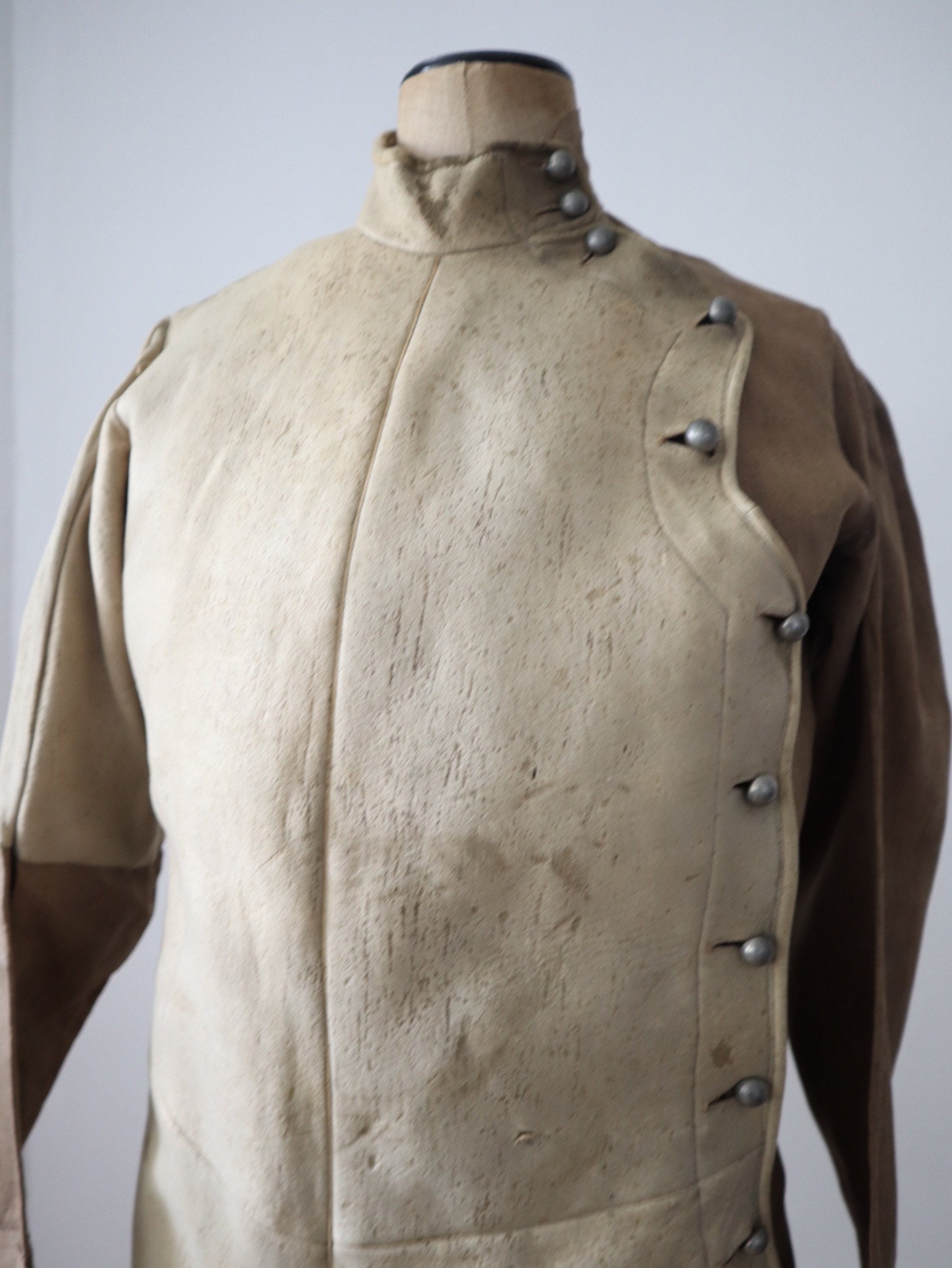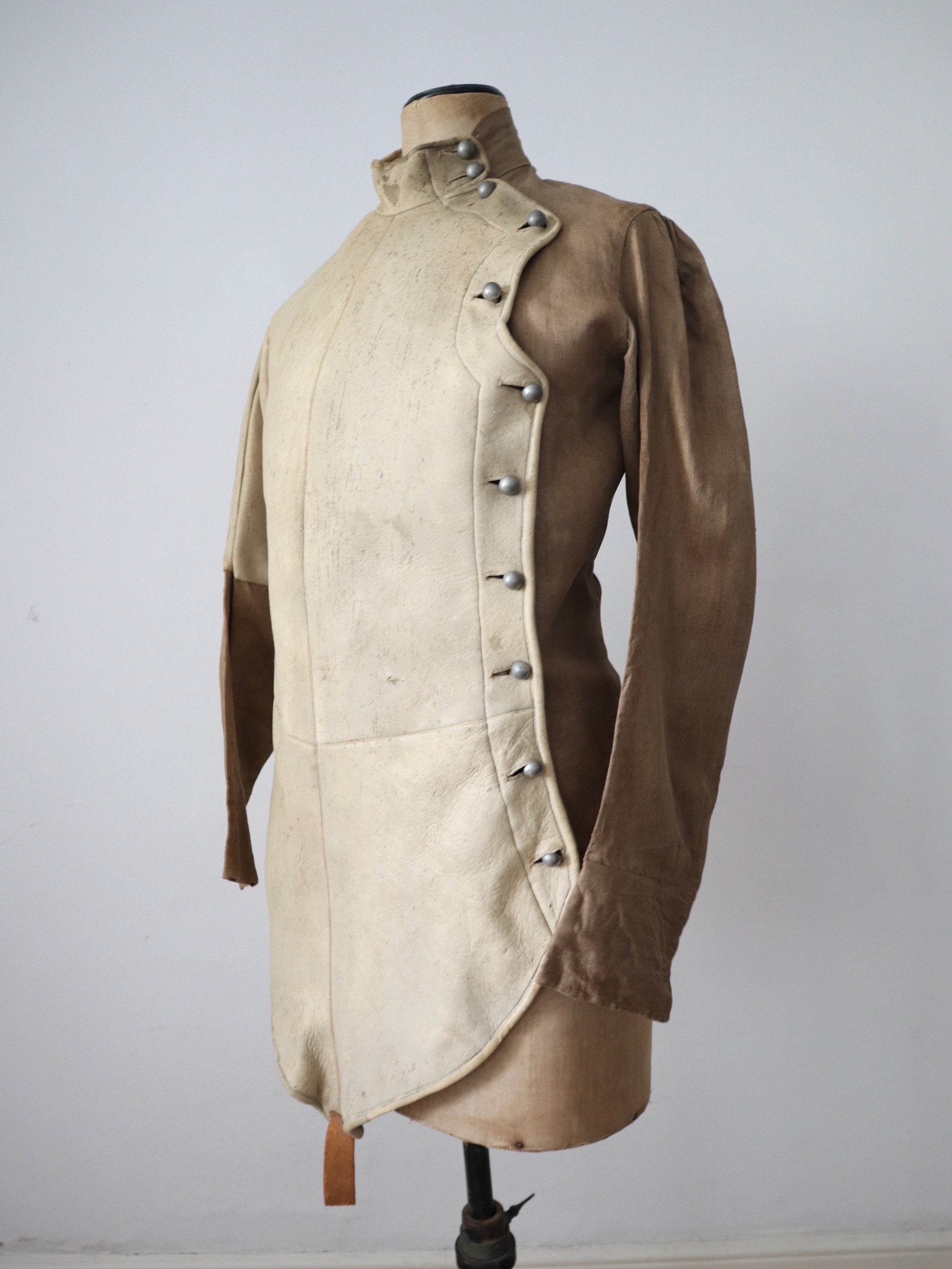 A truly rare and historic piece—this 19th-century French fencing jacket was found in France and reportedly came from a fencing museum. Constructed from supple nubuck leather paired with brown linen, it features domed silver metal buttons at the front, neck, and cuffs.