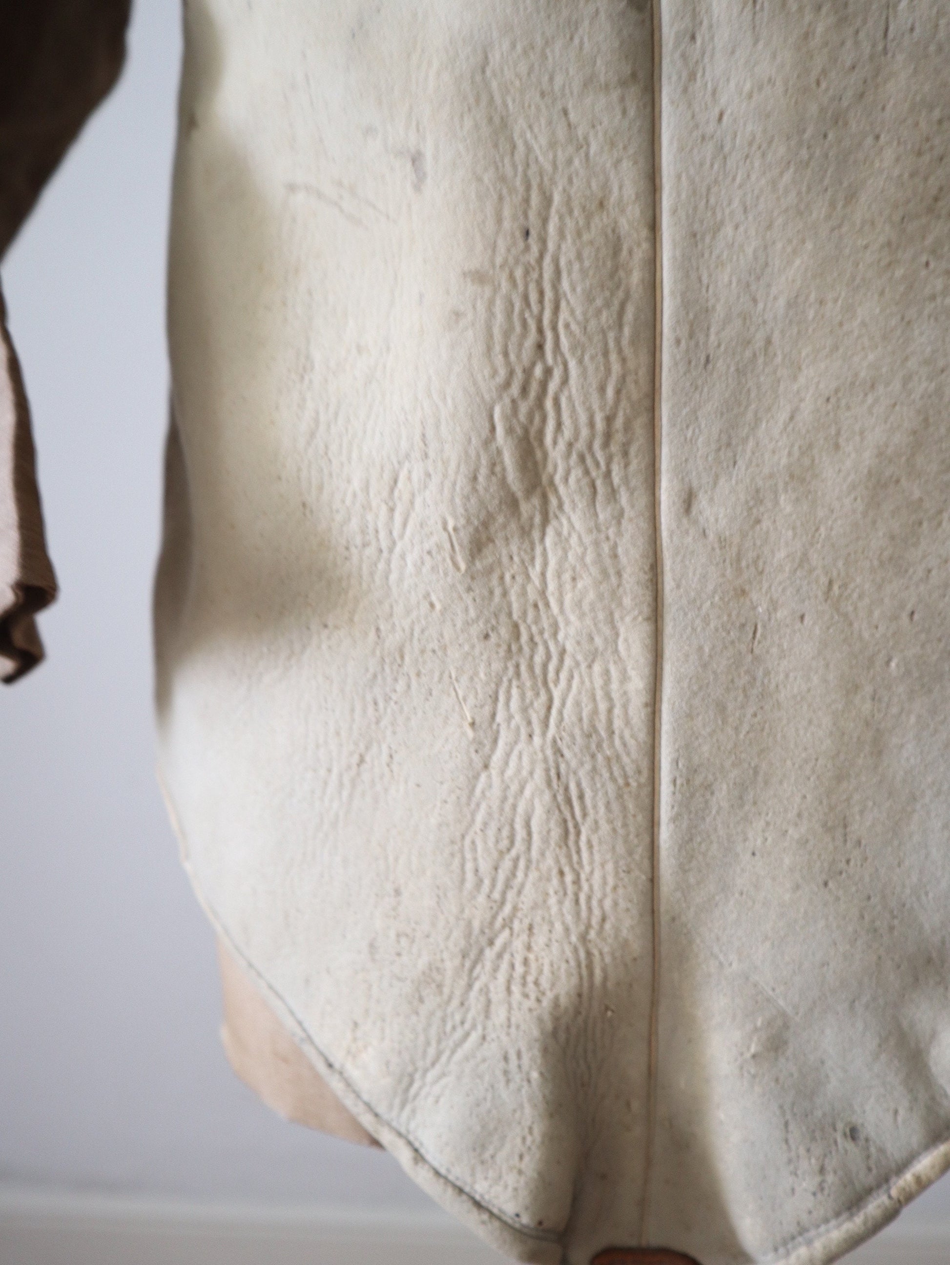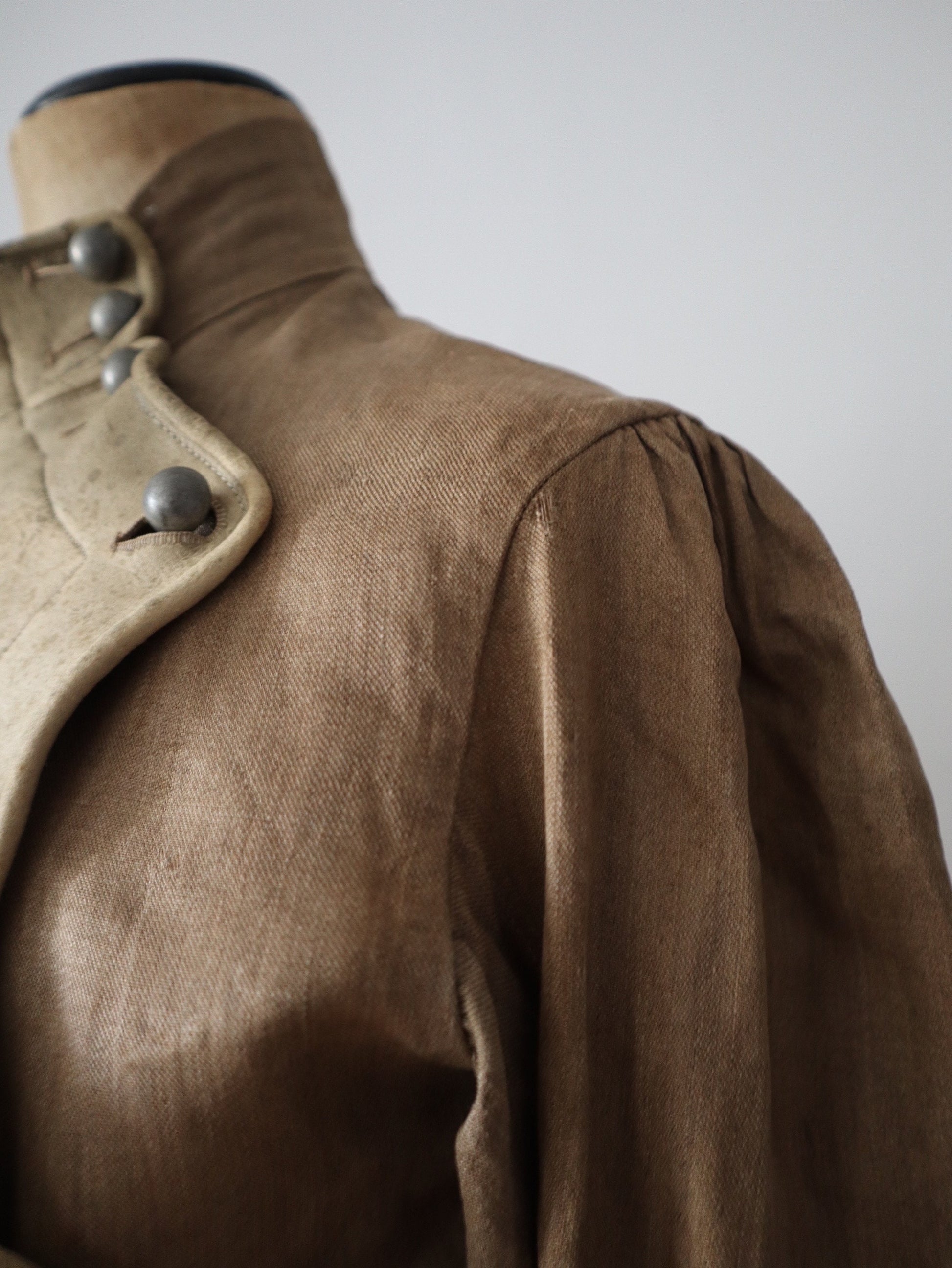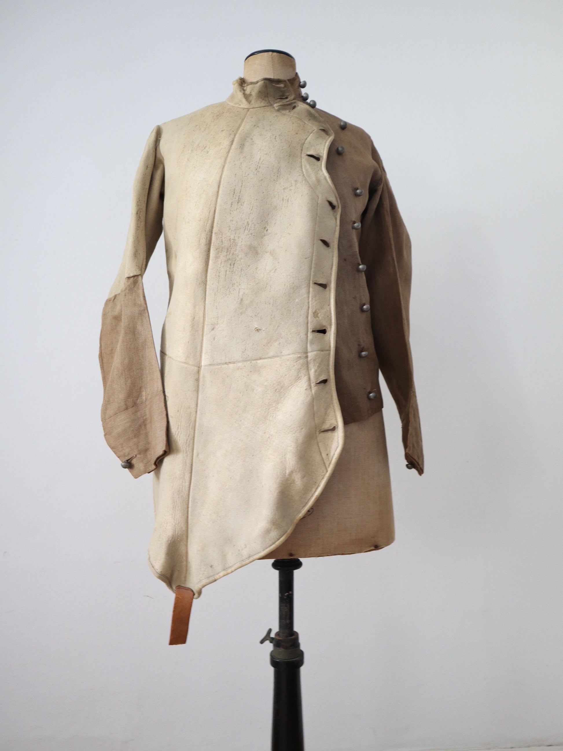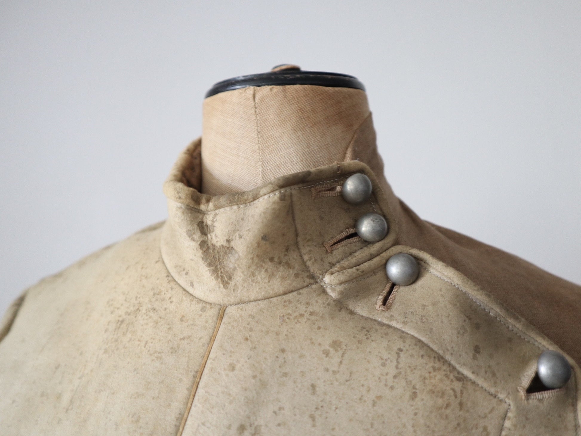 A truly rare and historic piece—this 19th-century French fencing jacket was found in France and reportedly came from a fencing museum. Constructed from supple nubuck leather paired with brown linen, it features domed silver metal buttons at the front, neck, and cuffs.