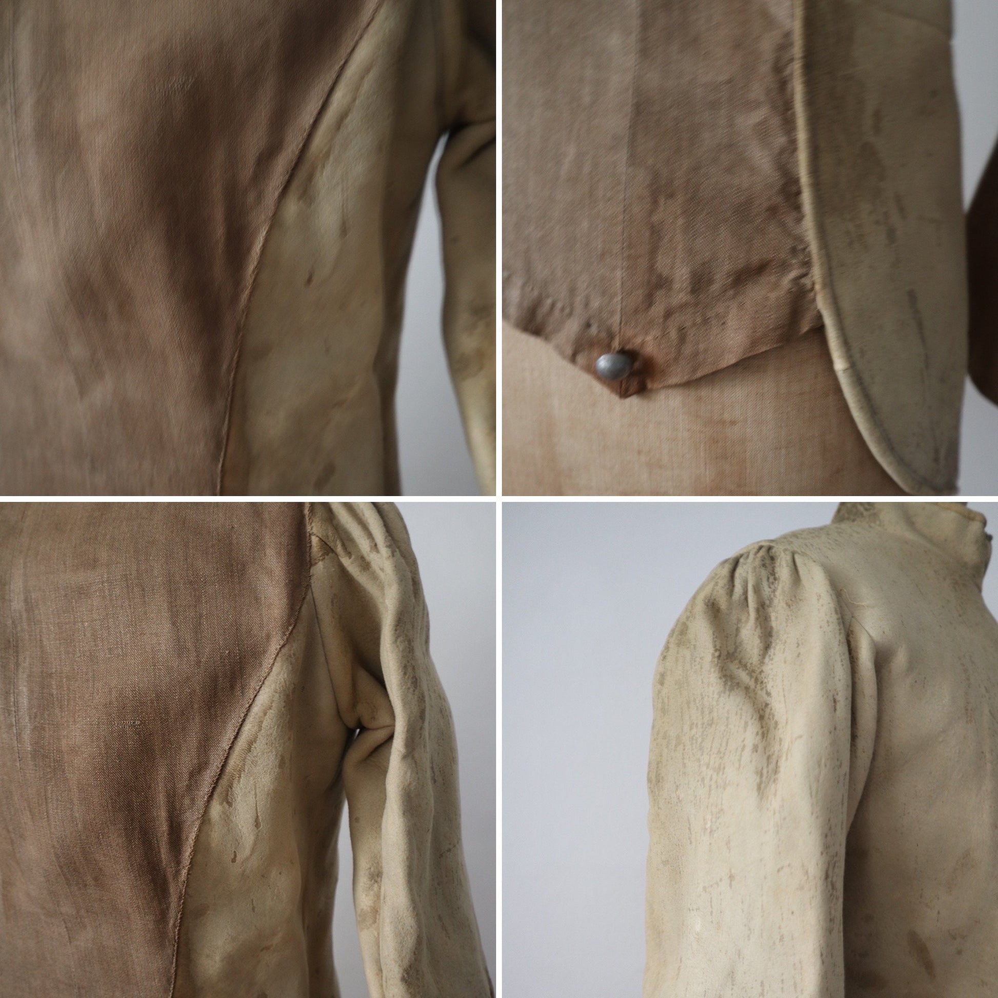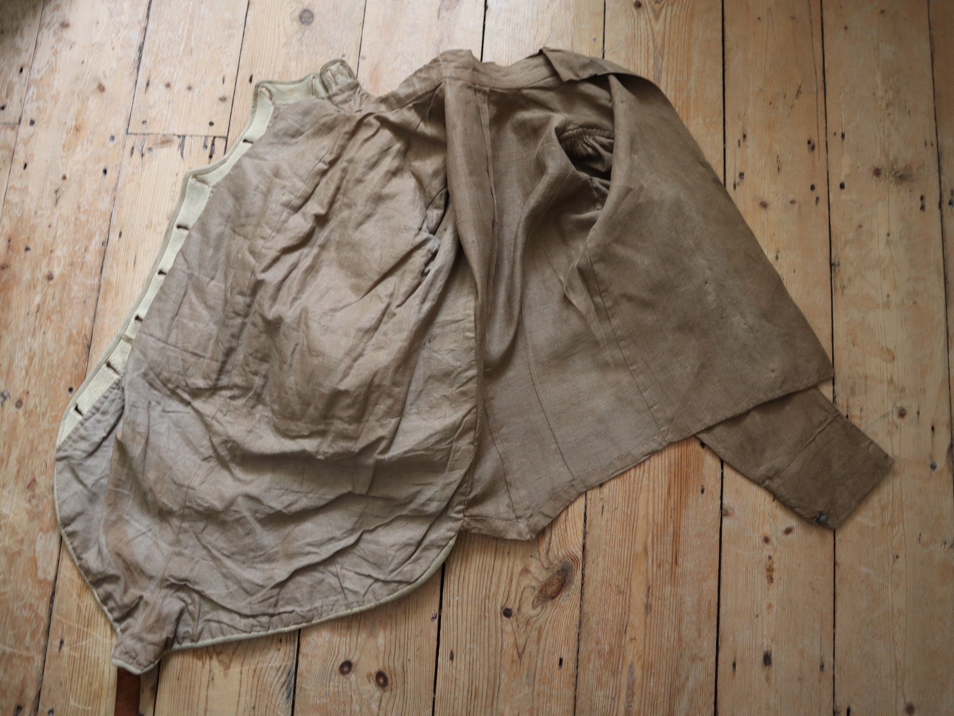 The jacket is fitted through the body, stopping at a high linen waist with a strap that once fastened between the legs (the strap is now mostly missing). Though it shows its age, it remains structurally sound and wearable with care—or ideal for display or collection.