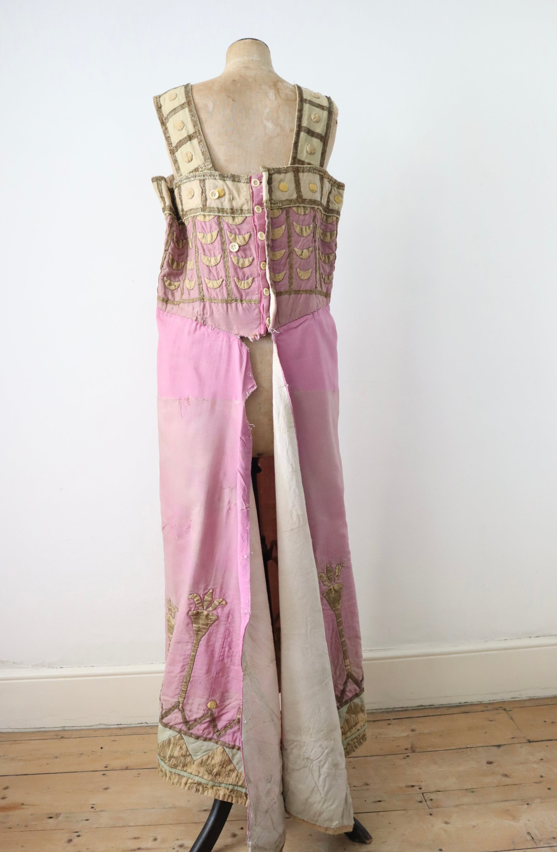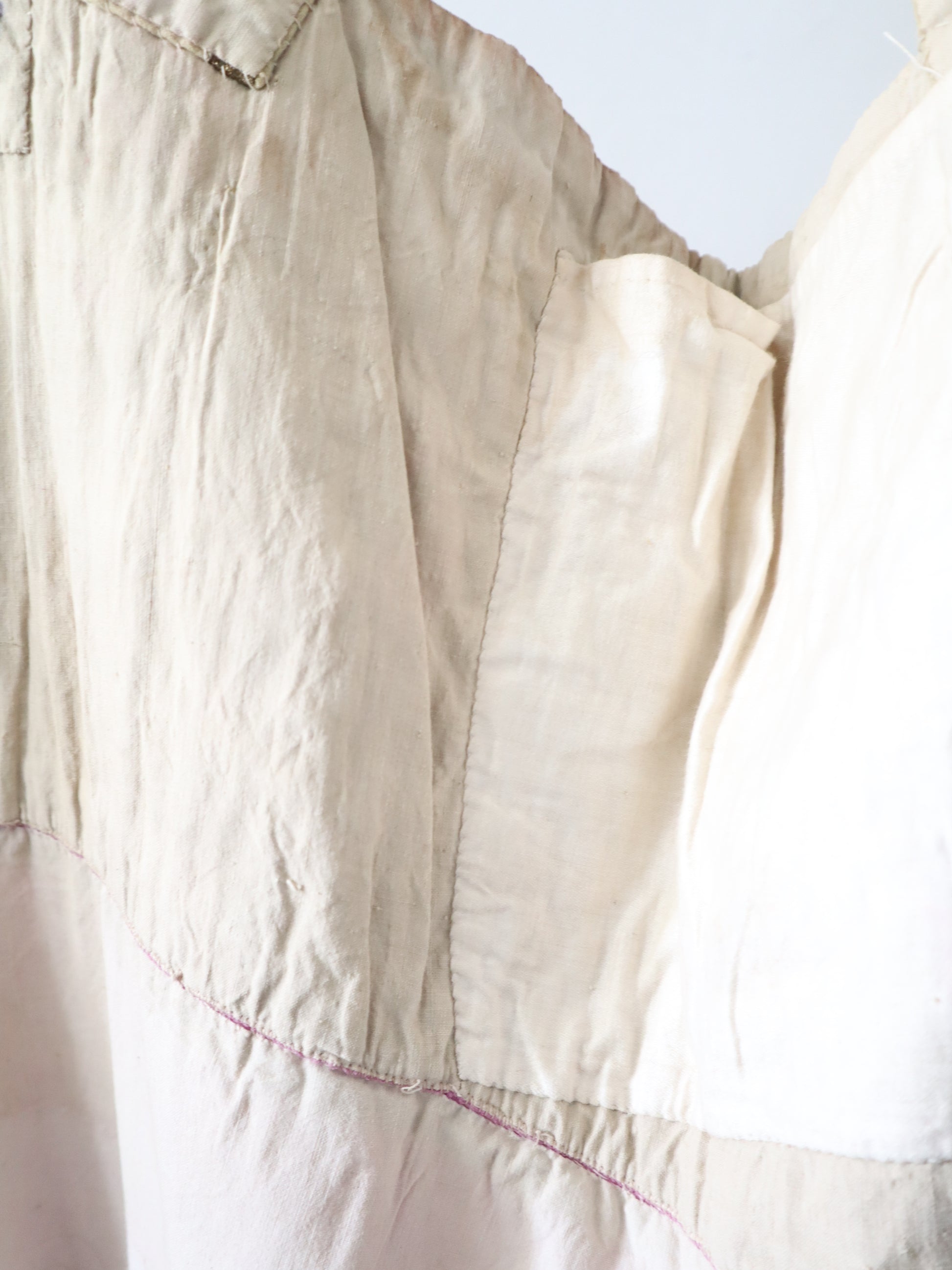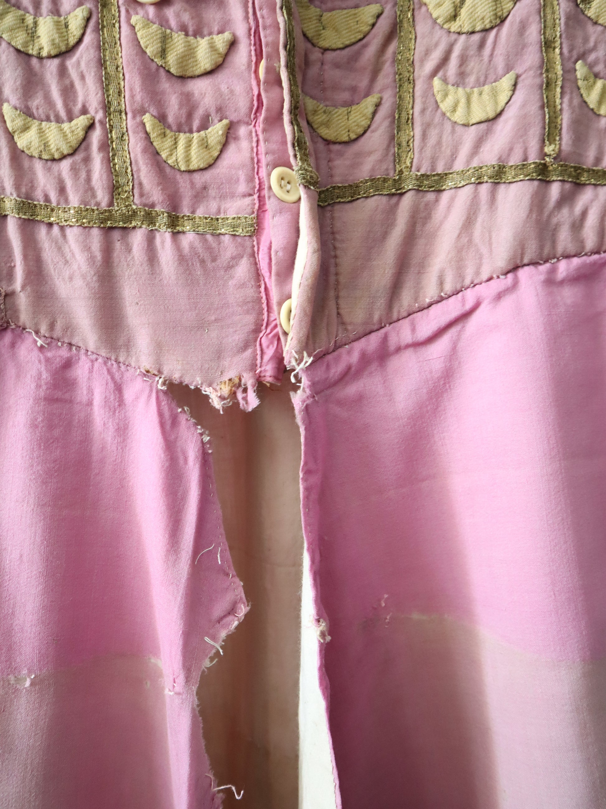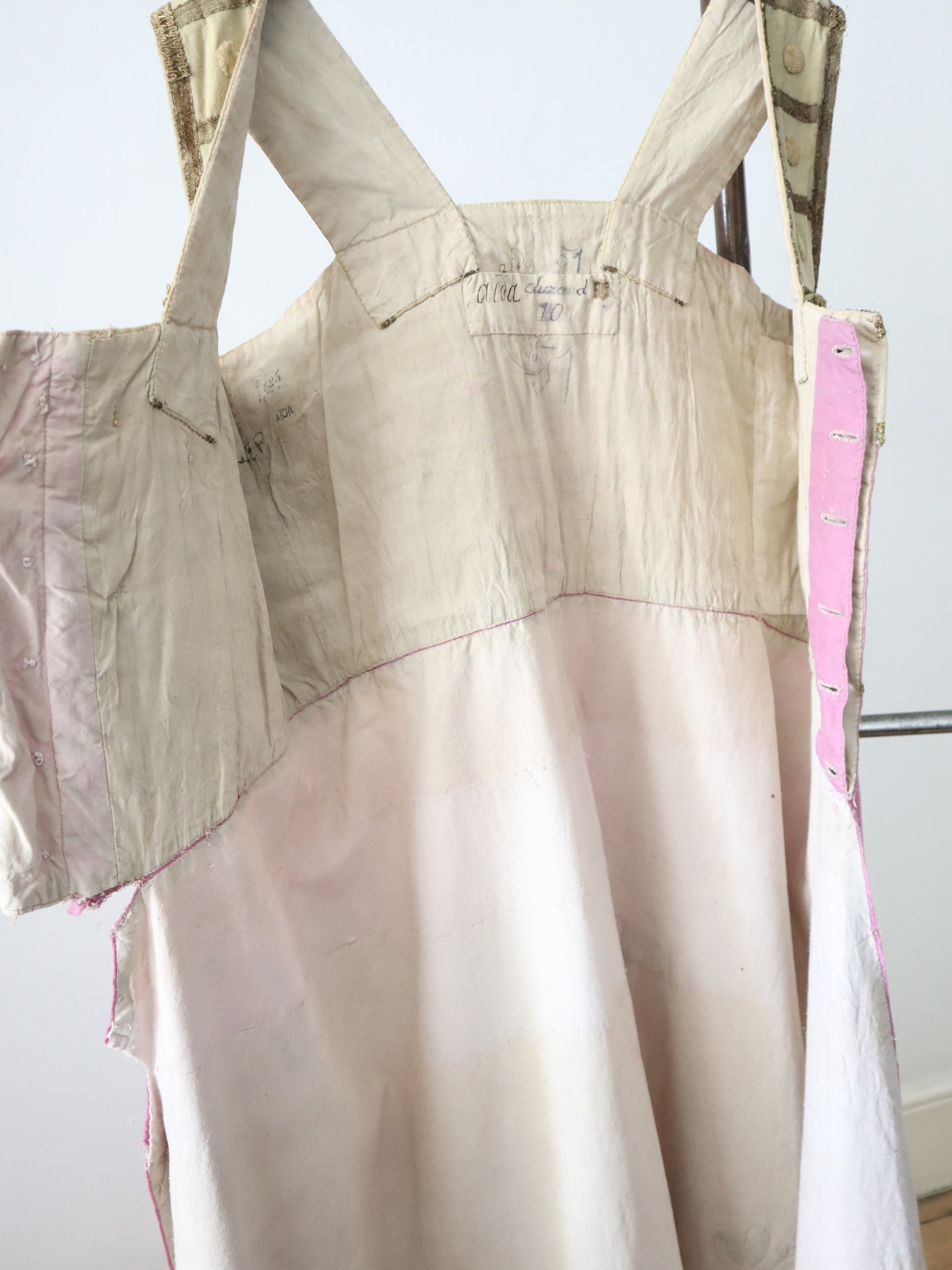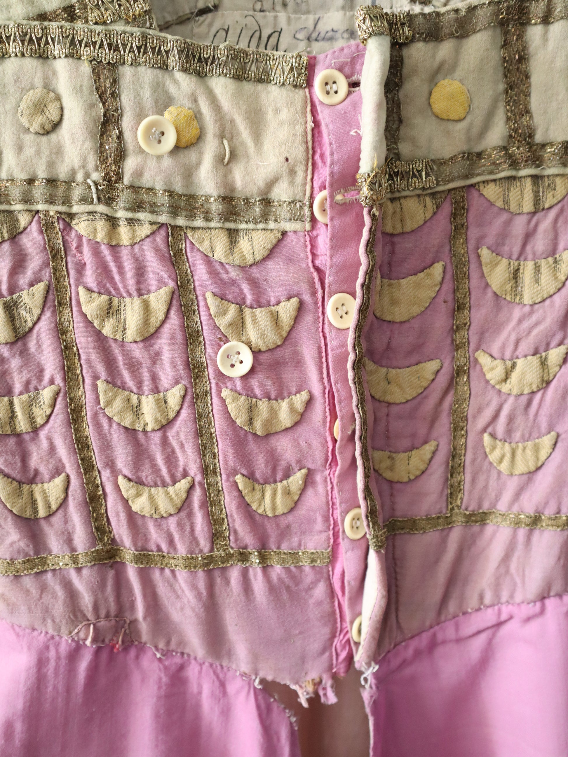 This is a pinafore-style tunic with an open back, fastening with bone buttons. The back falls into a dramatic point, creating a sculptural silhouette that would have moved beautifully on stage. An interior pocket remains intact—a rare and practical feature. The garment was later shortened and shows signs of this adjustment, including remaining stitching, sun fading, and structural changes. Every element is hand-stitched, reflecting the precision of 19th-century Parisian costume ateliers.