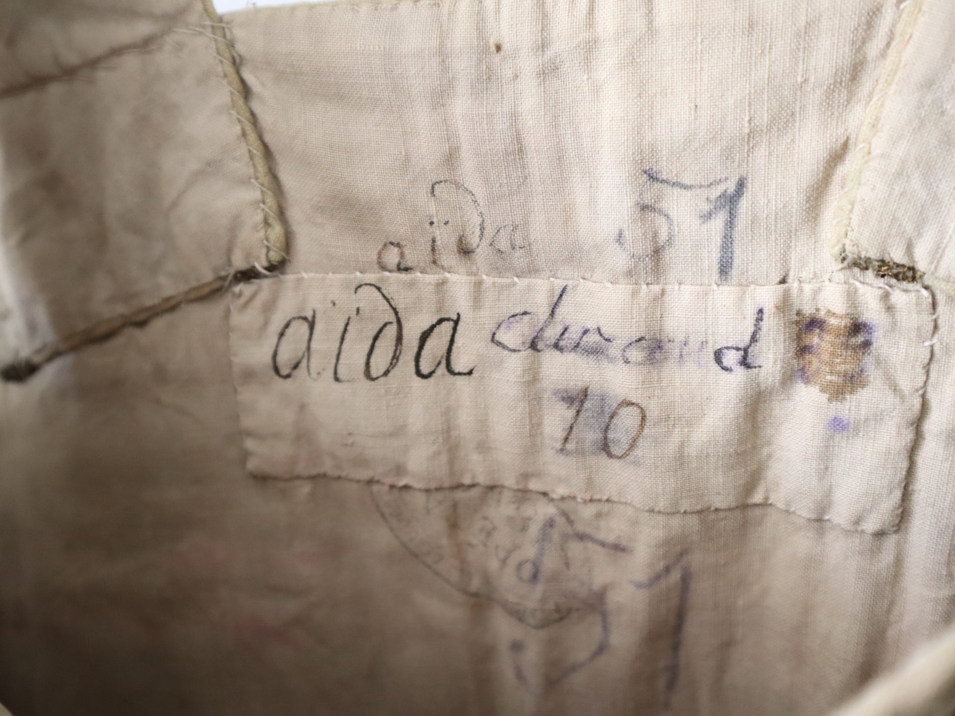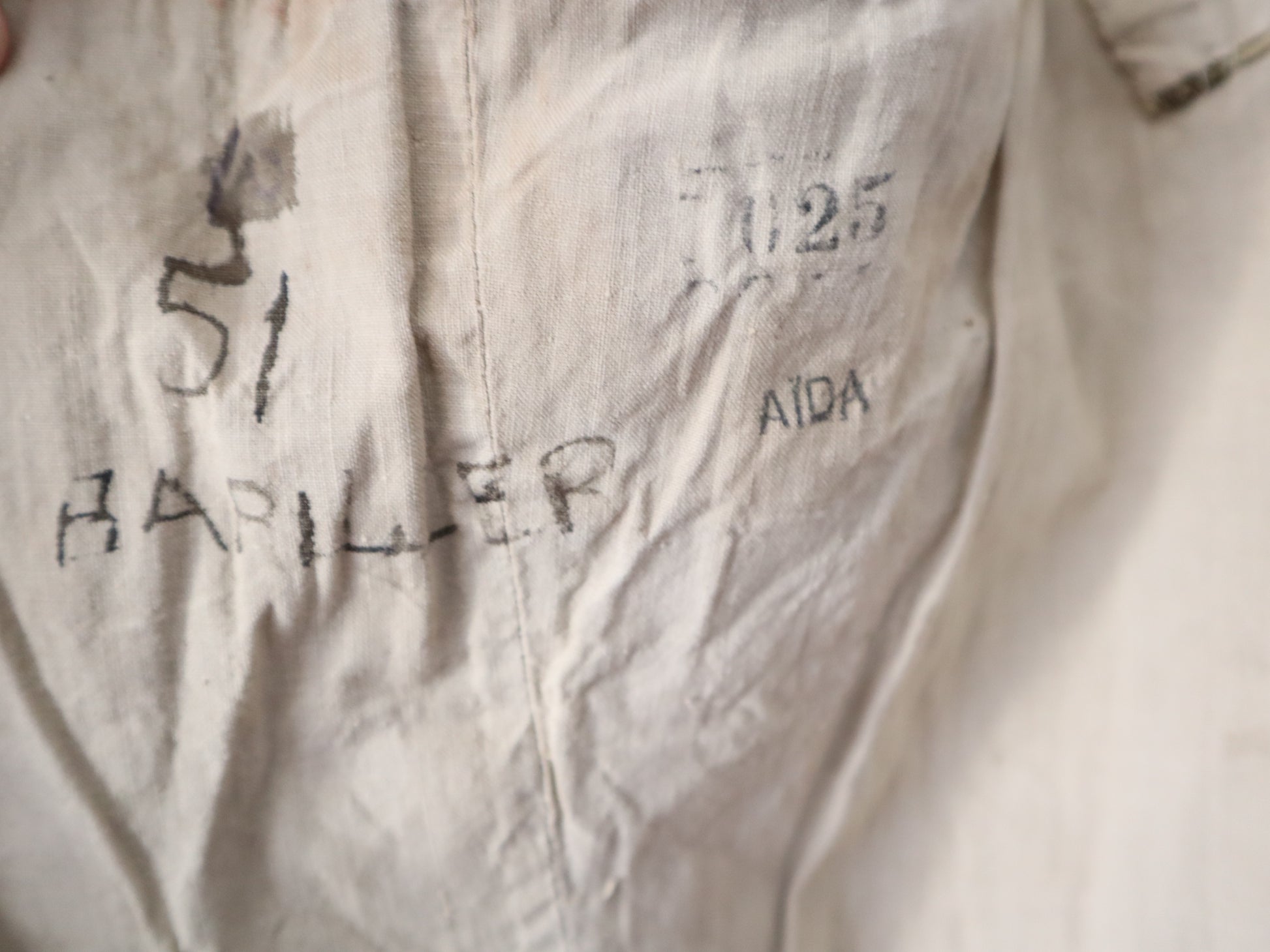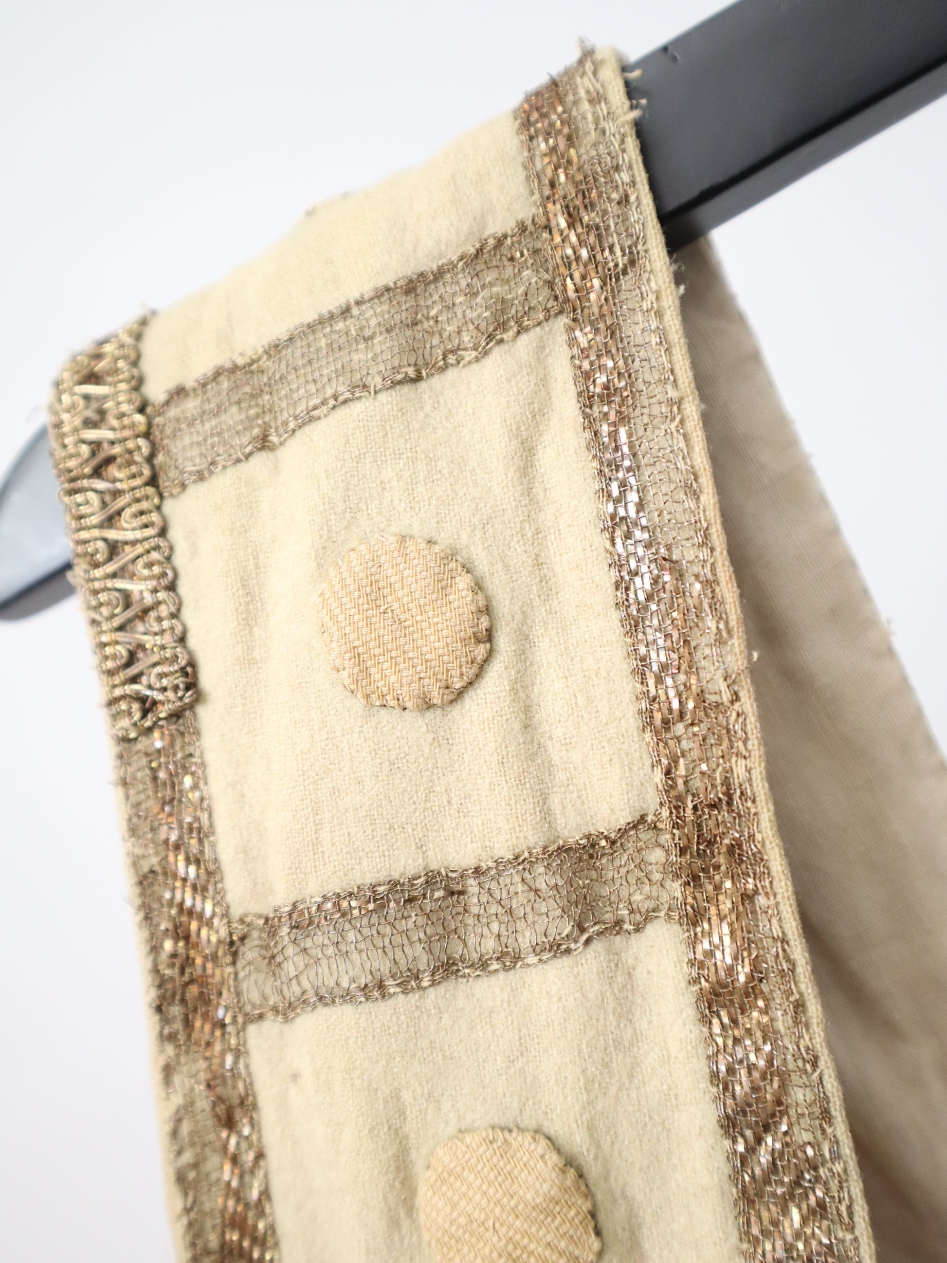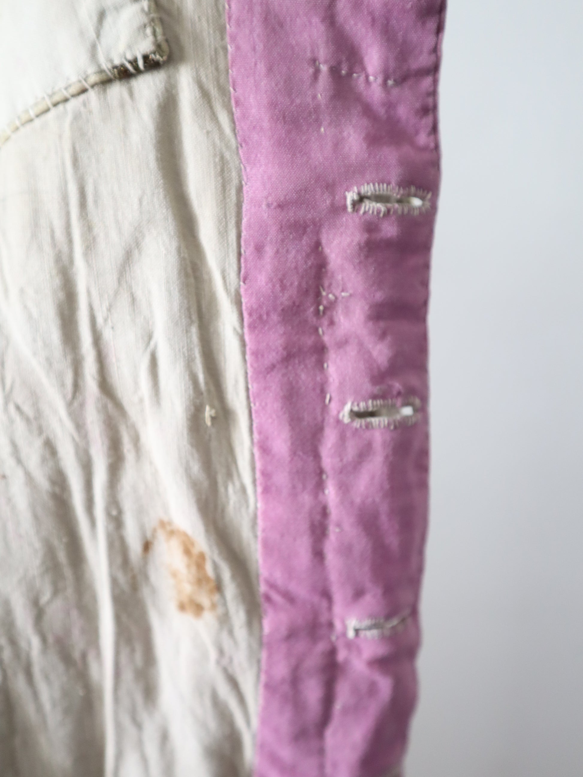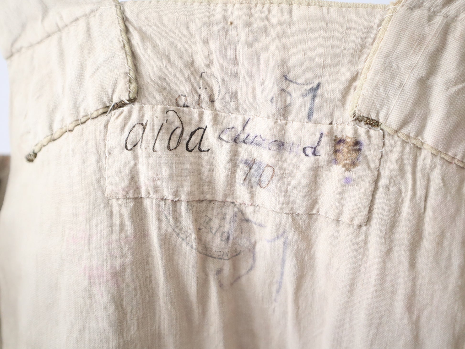 This is a pinafore-style tunic with an open back, fastening with bone buttons. The back falls into a dramatic point, creating a sculptural silhouette that would have moved beautifully on stage. An interior pocket remains intact—a rare and practical feature. The garment was later shortened and shows signs of this adjustment, including remaining stitching, sun fading, and structural changes. Every element is hand-stitched, reflecting the precision of 19th-century Parisian costume ateliers.