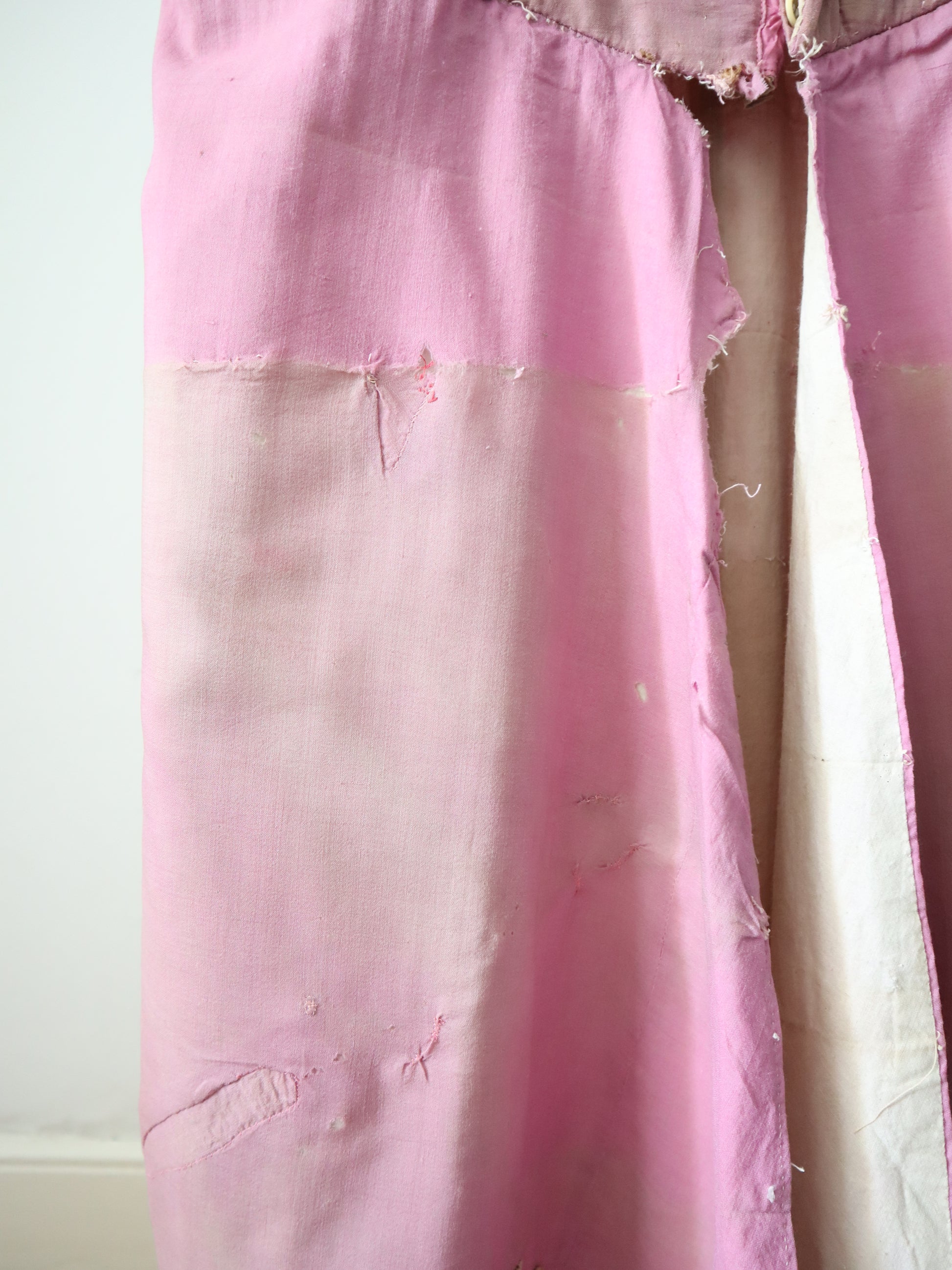 Freshly hand-laundered with gentle detergent and steamed. Condition is consistent with age and stage use: visible sun fading, multiple patch repairs, scattered small holes, and a large hole at the back as shown. Lining has staining, and stitches from previous alterations remain. The back is somewhat unfinished and may require adjustment for wear, though it presents beautifully for display or study.