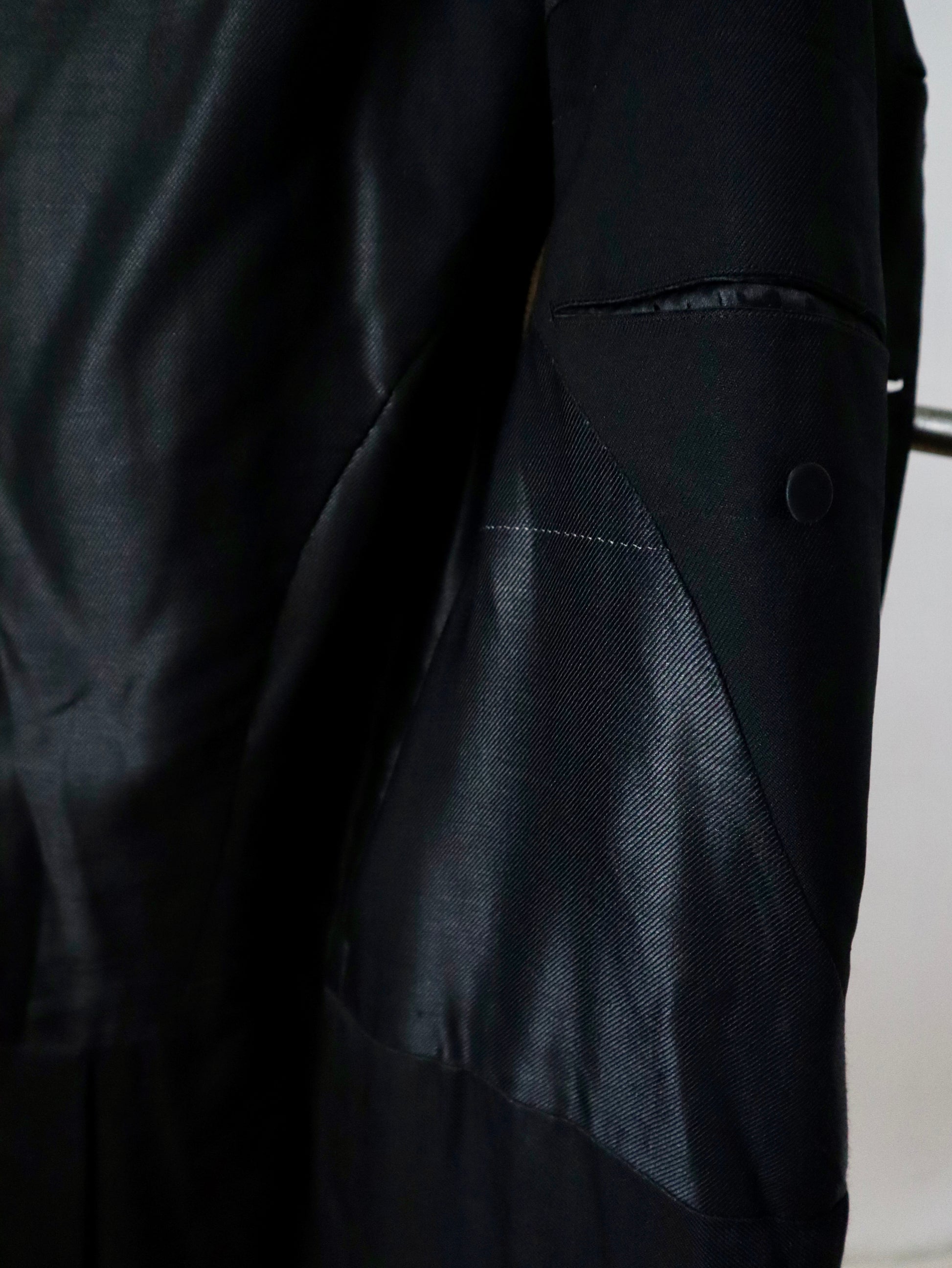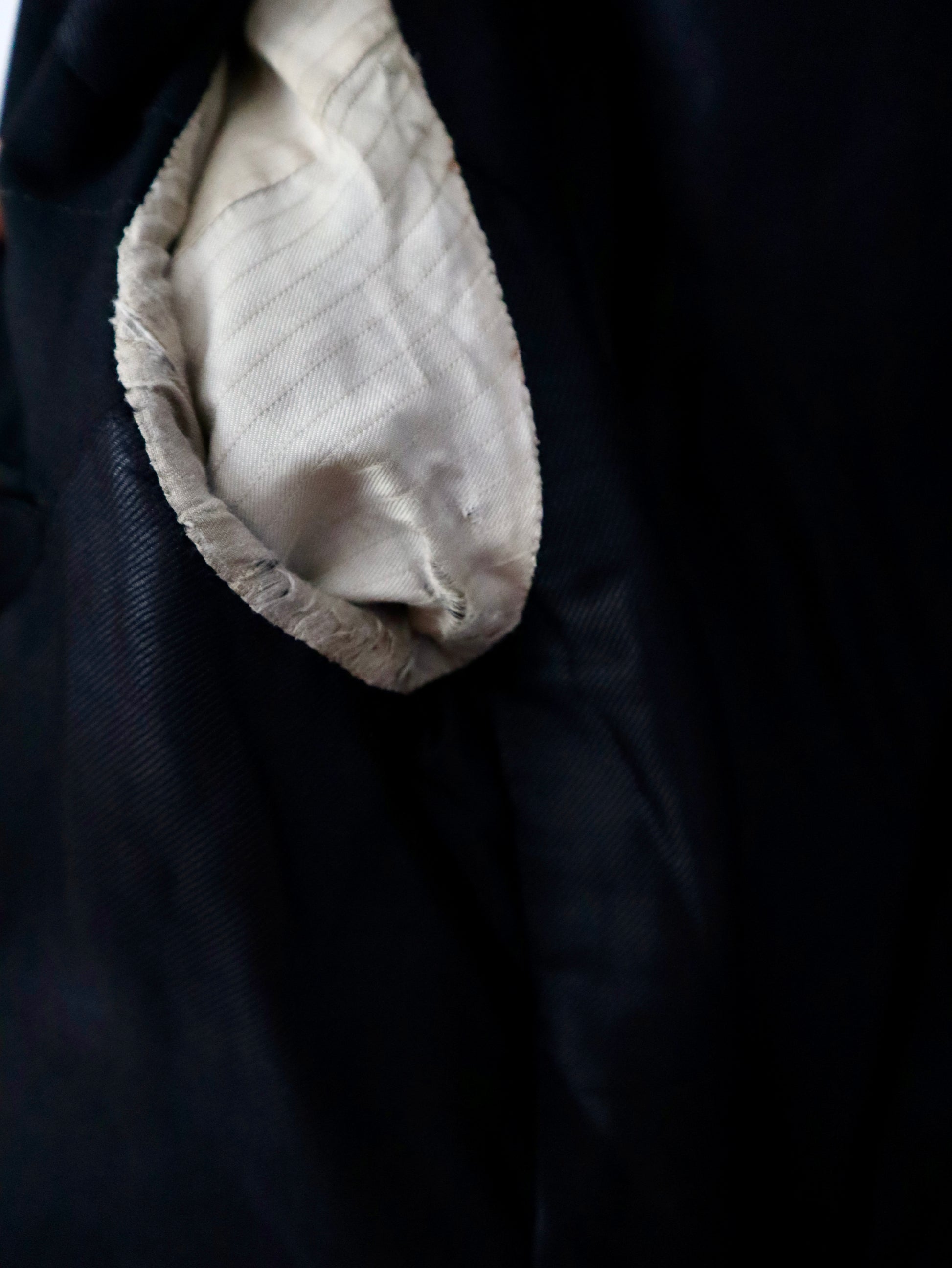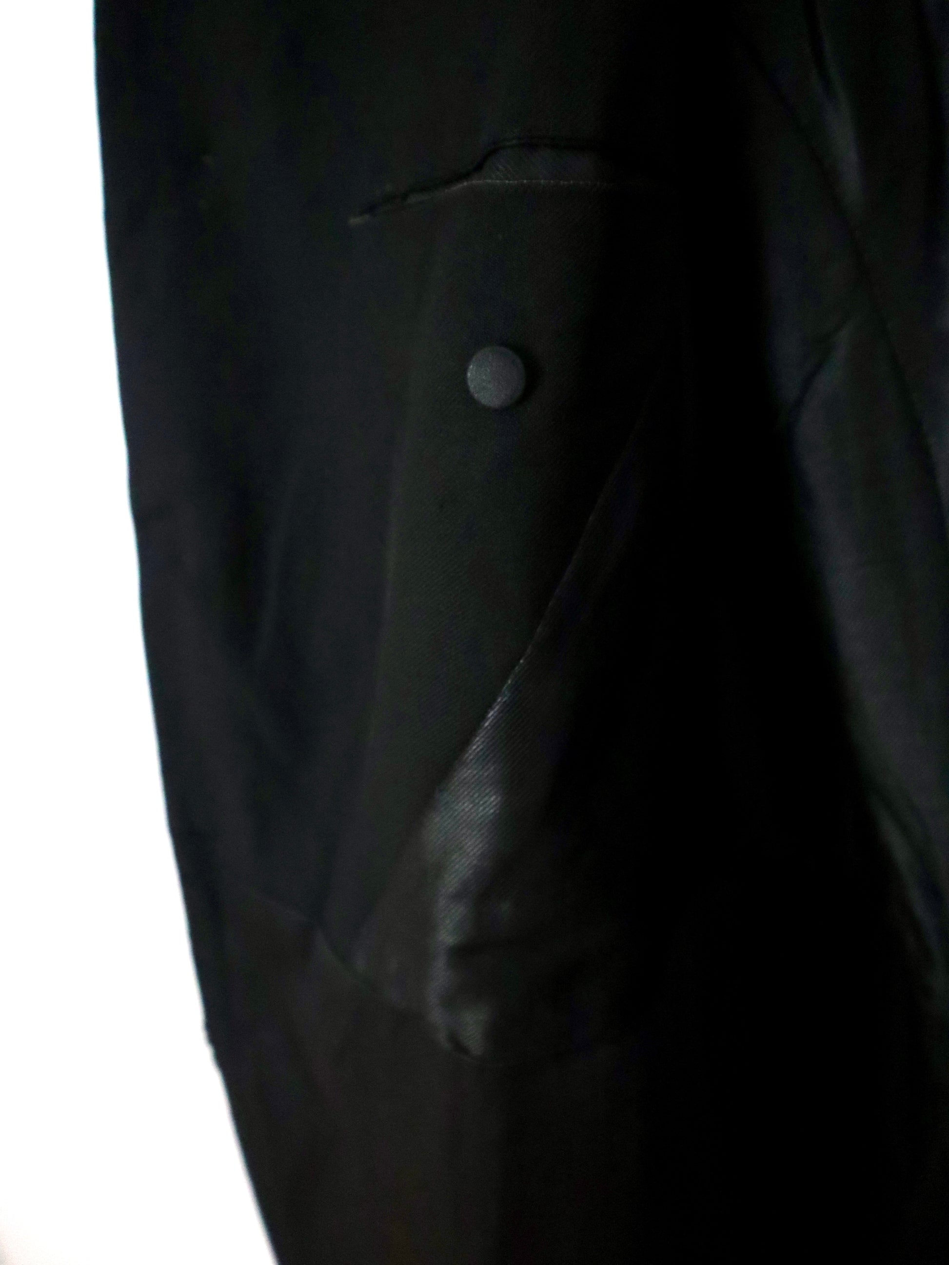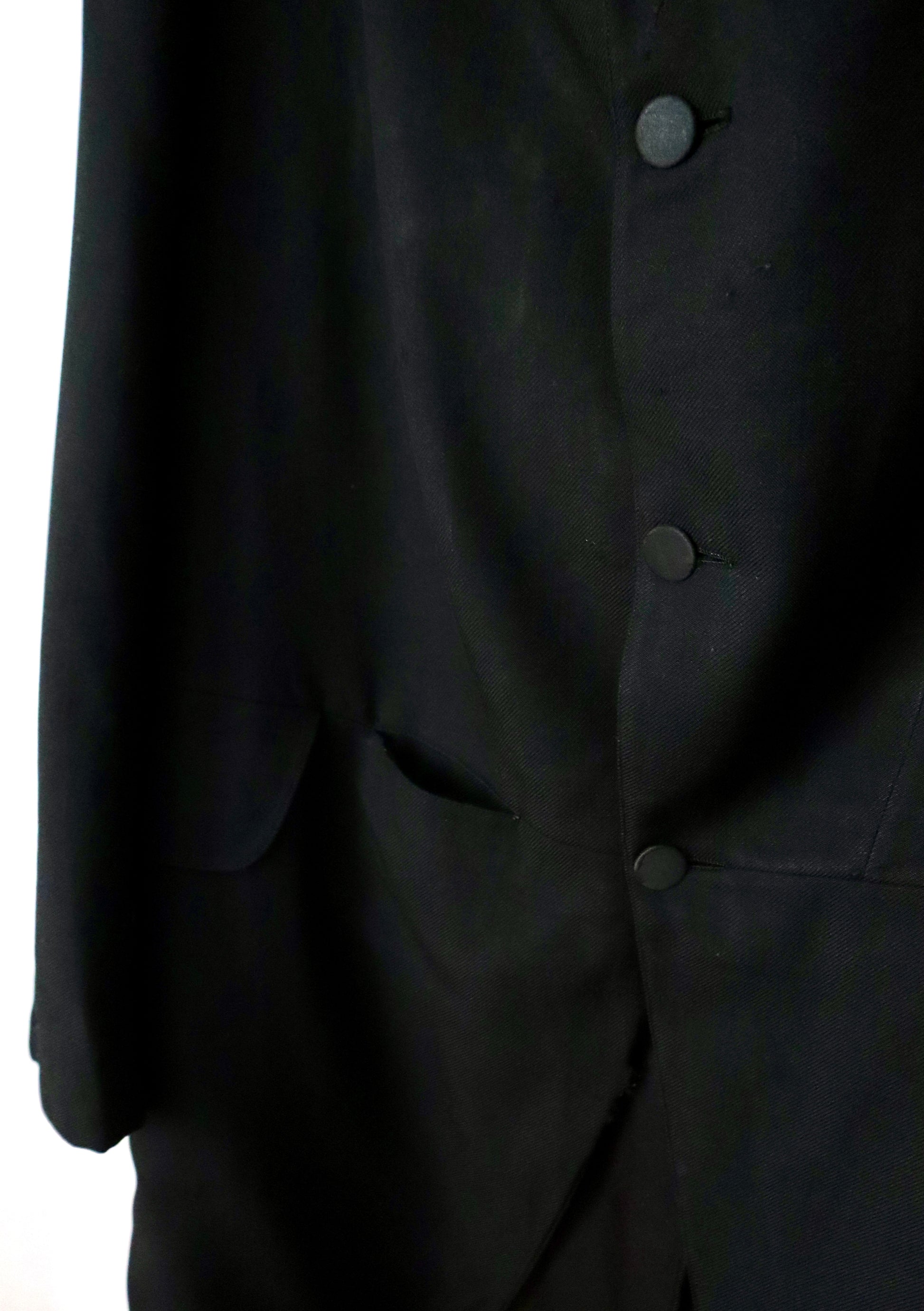 Dry cleaned and in very good overall condition. Small areas of damage including a tear and small hole at the edge of the right cuff, thinning and tears to the sleeve linings, a small hole at the top right shoulder, and another hole near the back button on the left.