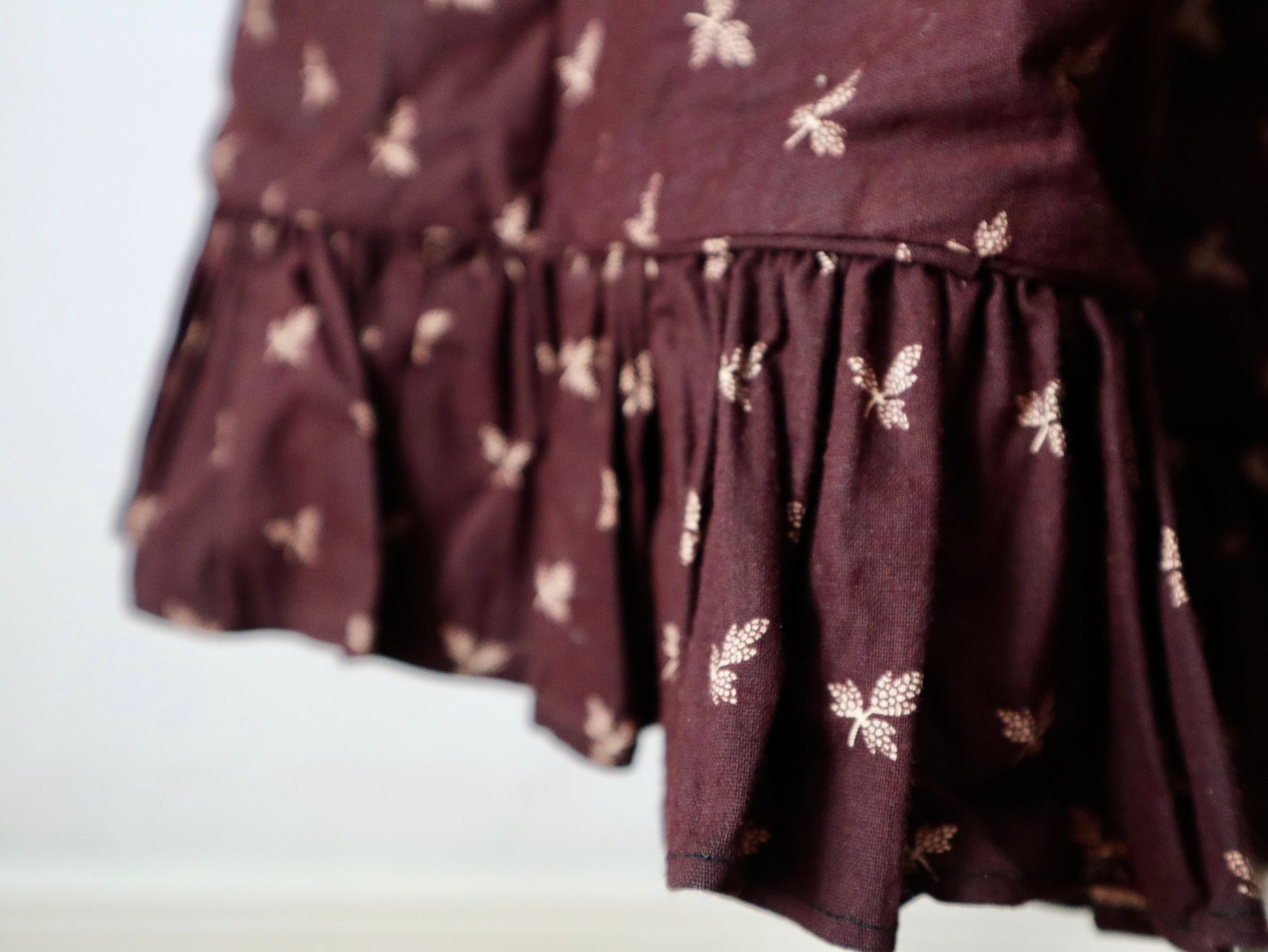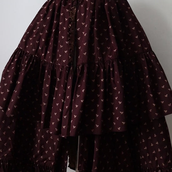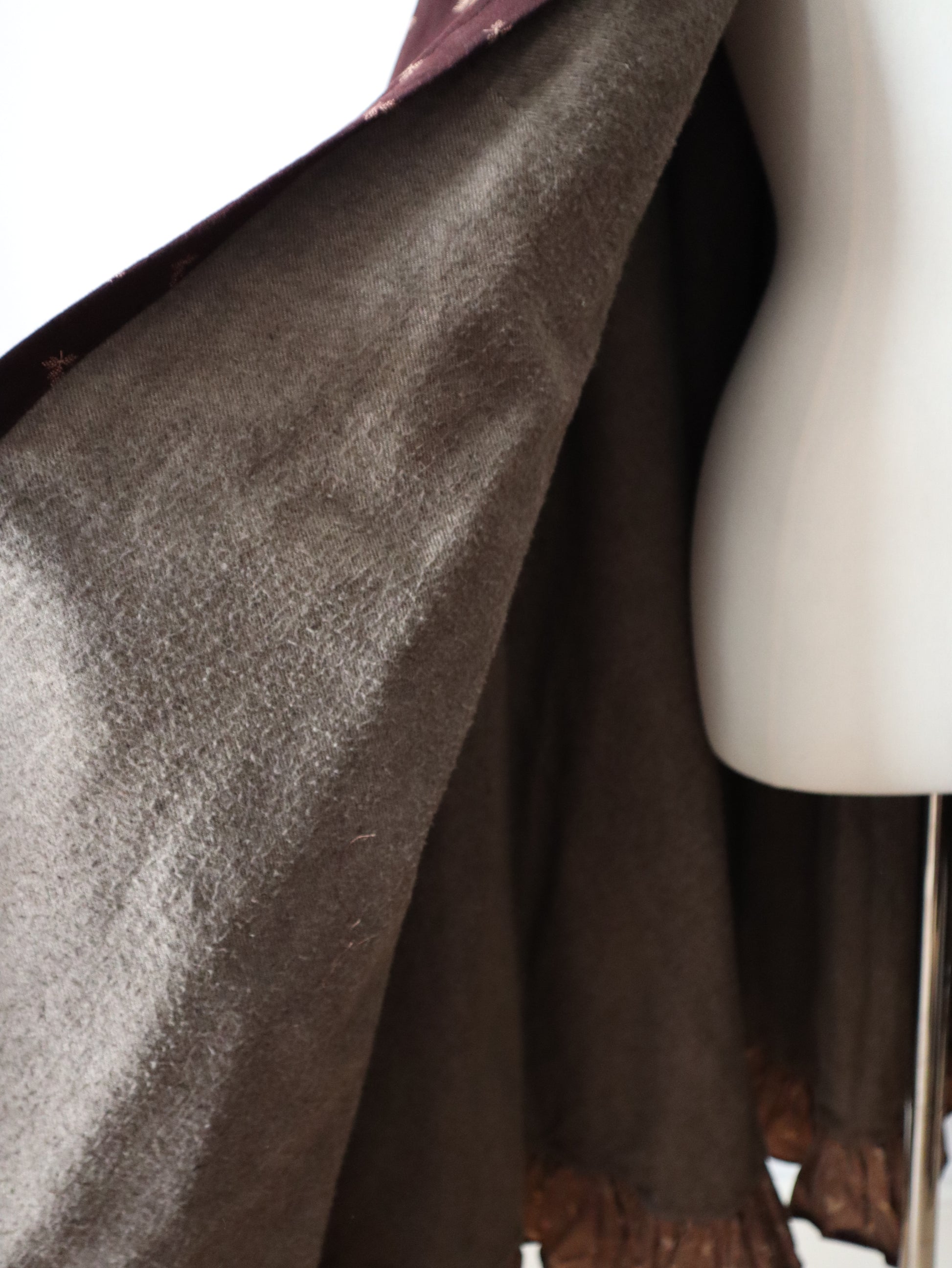 Made in two full layers. The outer printed cotton layer is unlined. Beneath this sits a complete inner layer lined in softly woven wool flannel. Entirely hand stitched throughout. Generous cut through the body with tiered construction, giving the cloak its distinctive volume and fall.