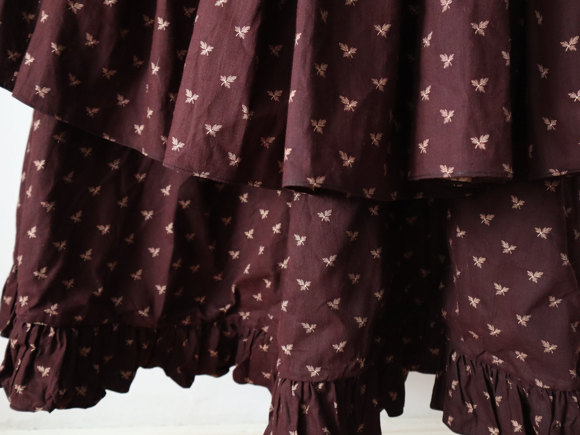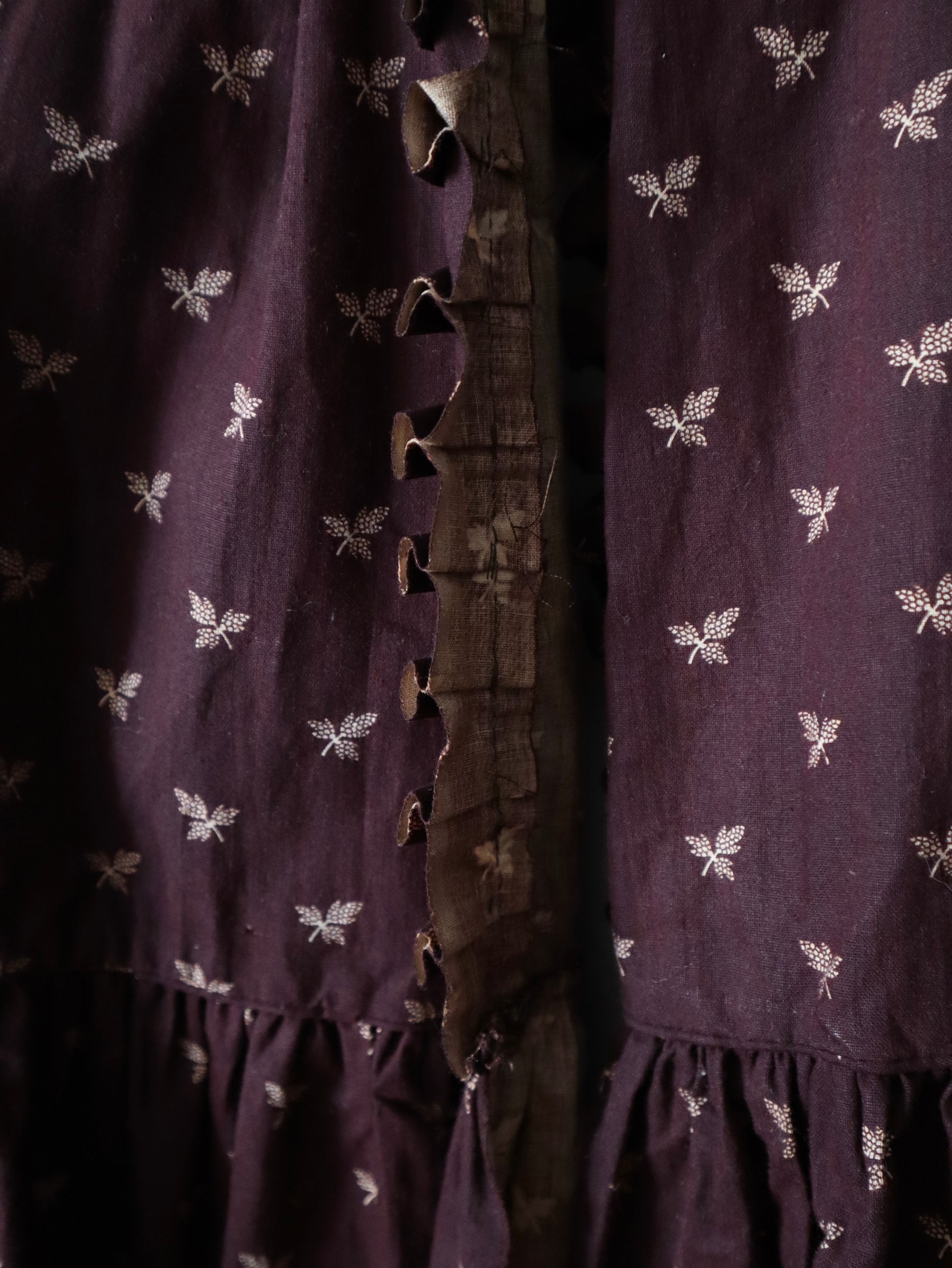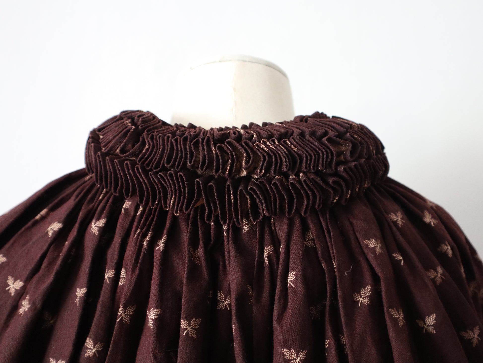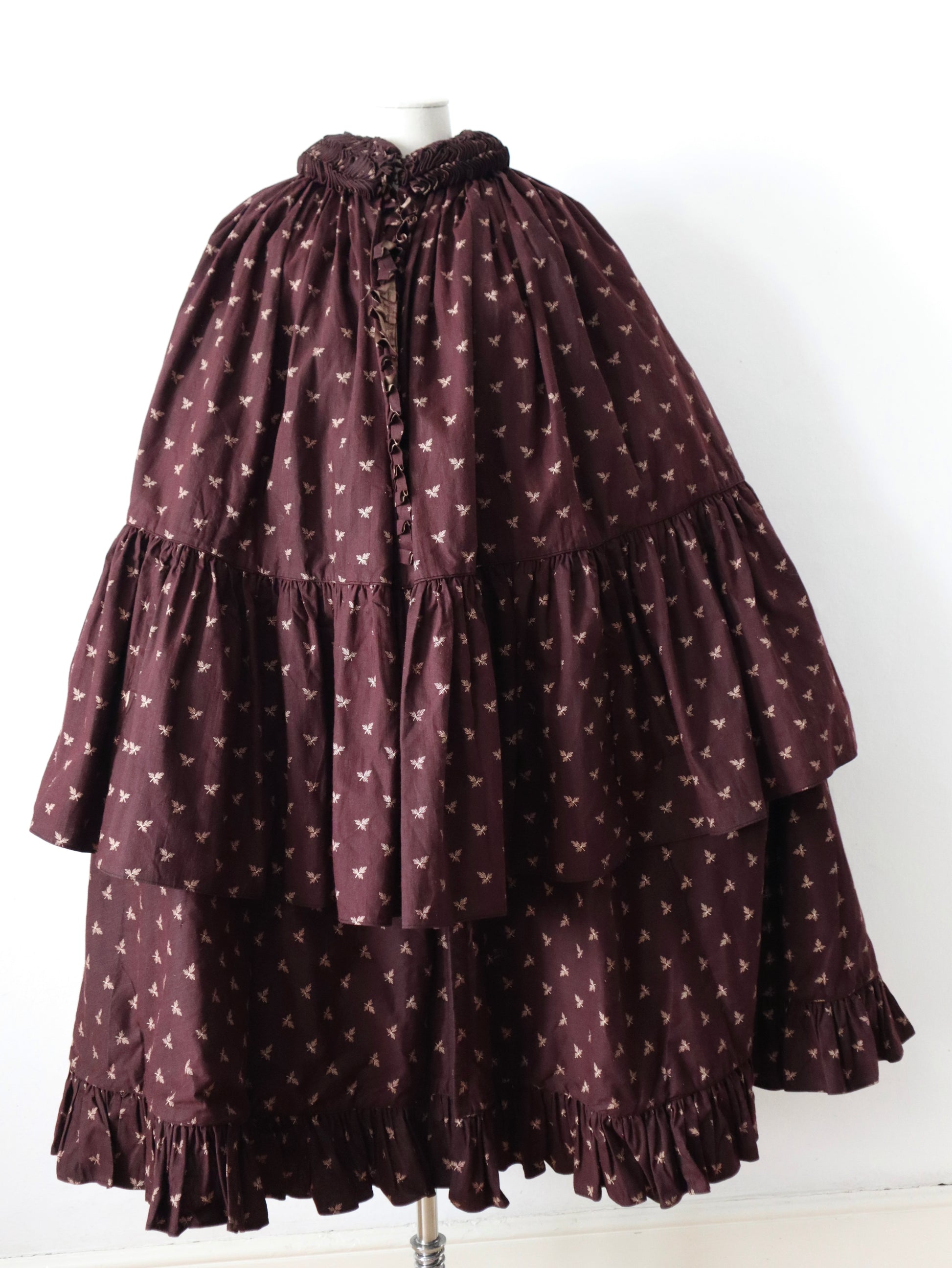 19th century German full-length sleeveless cloak, known as a Hockmantel. Constructed from exceptional quality warm brown printed cotton with a small repeating floral motif. The cotton has notable weight and body, creating a strong, sculptural silhouette.