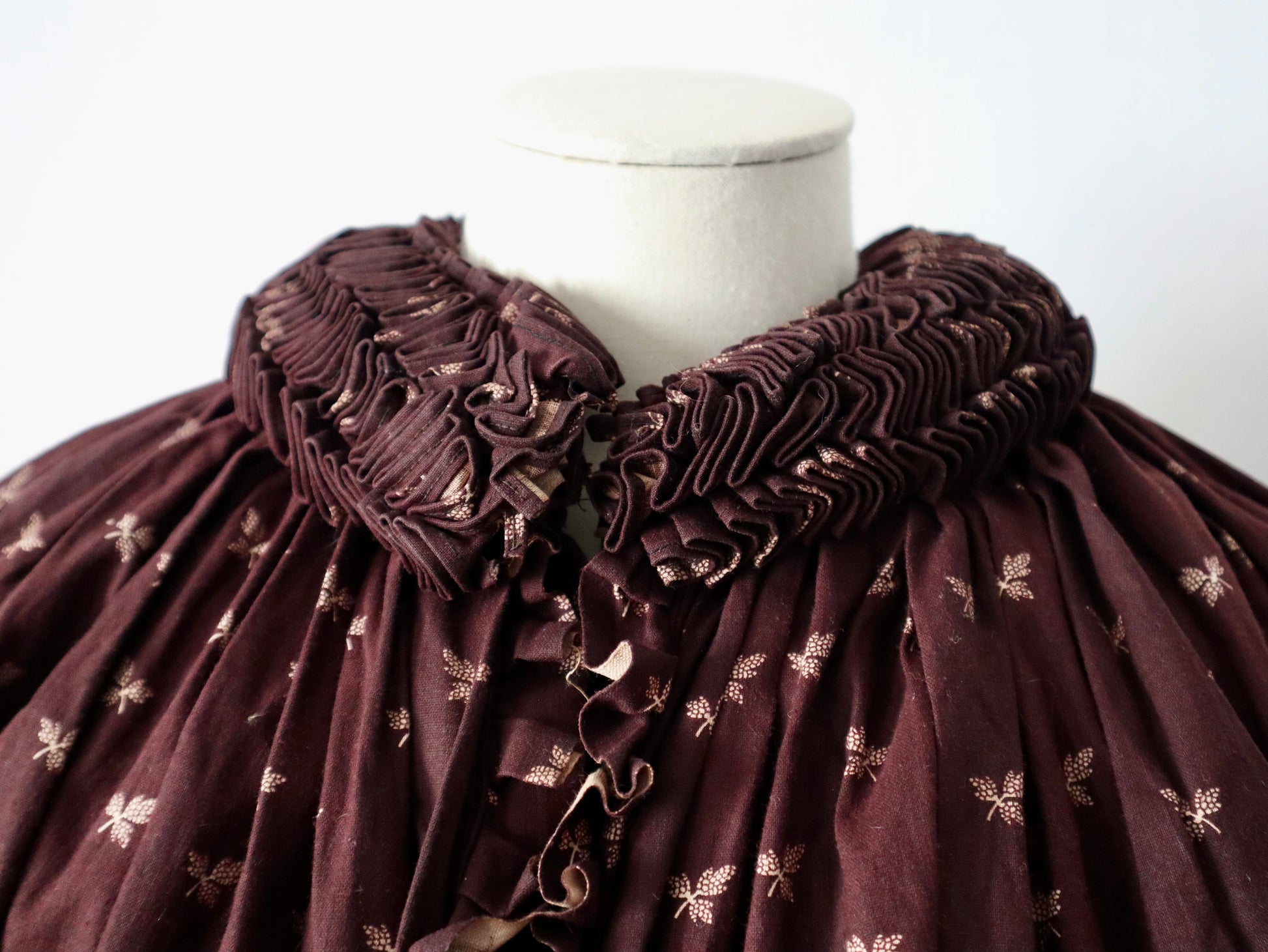Dramatic standing collar with dense, tightly worked ruching. Fastens at the neck with a metal hook and eye.
