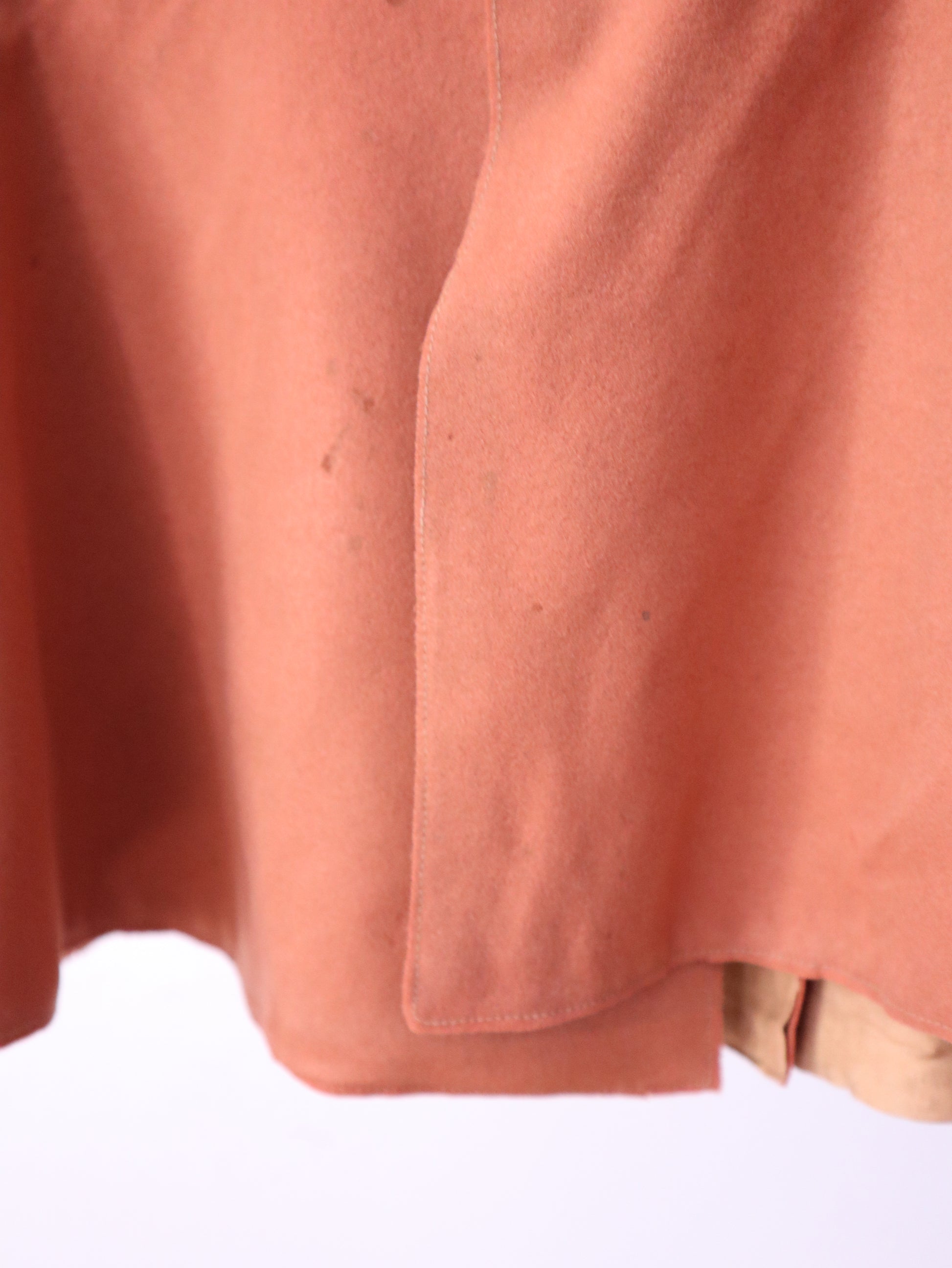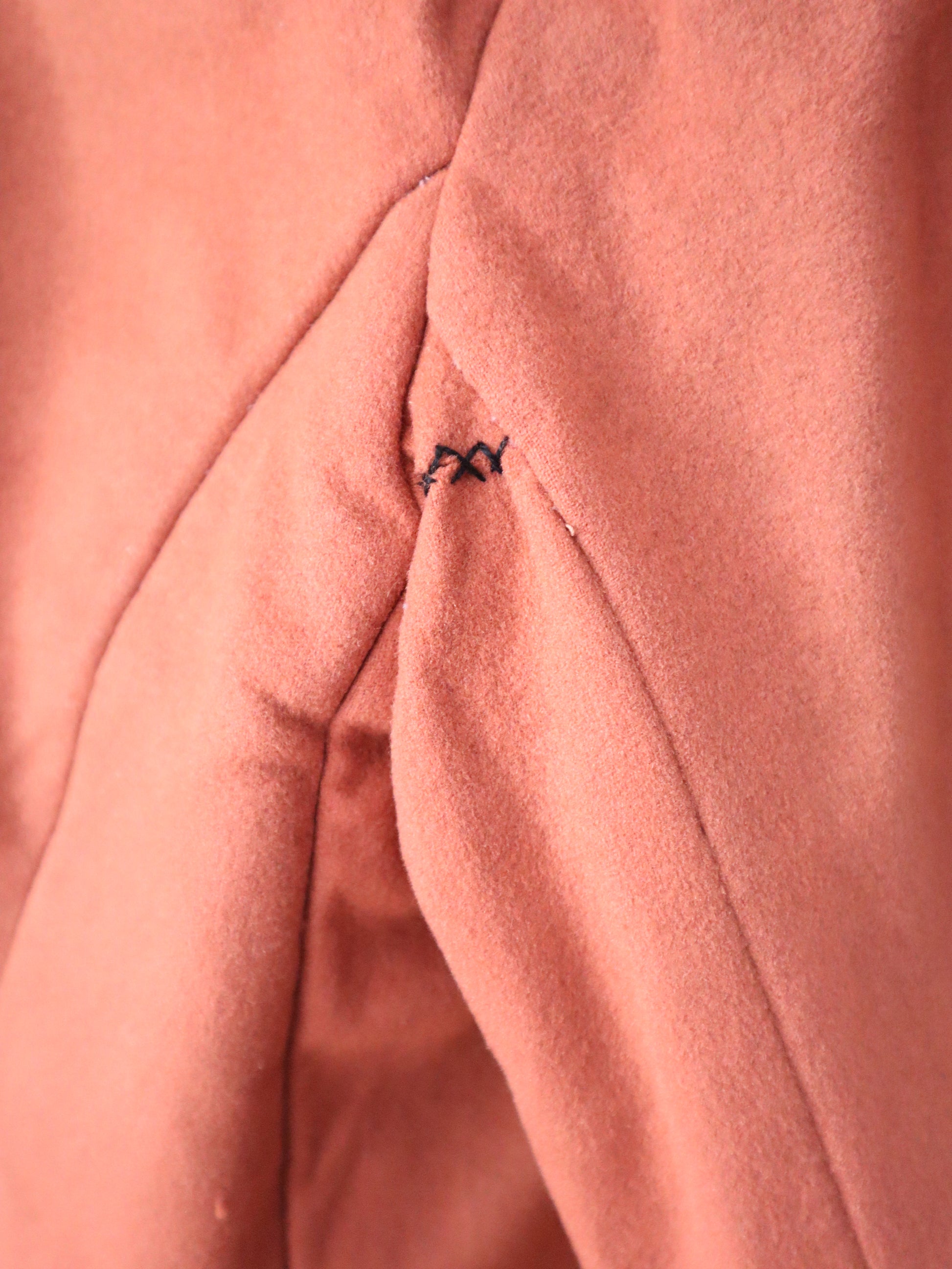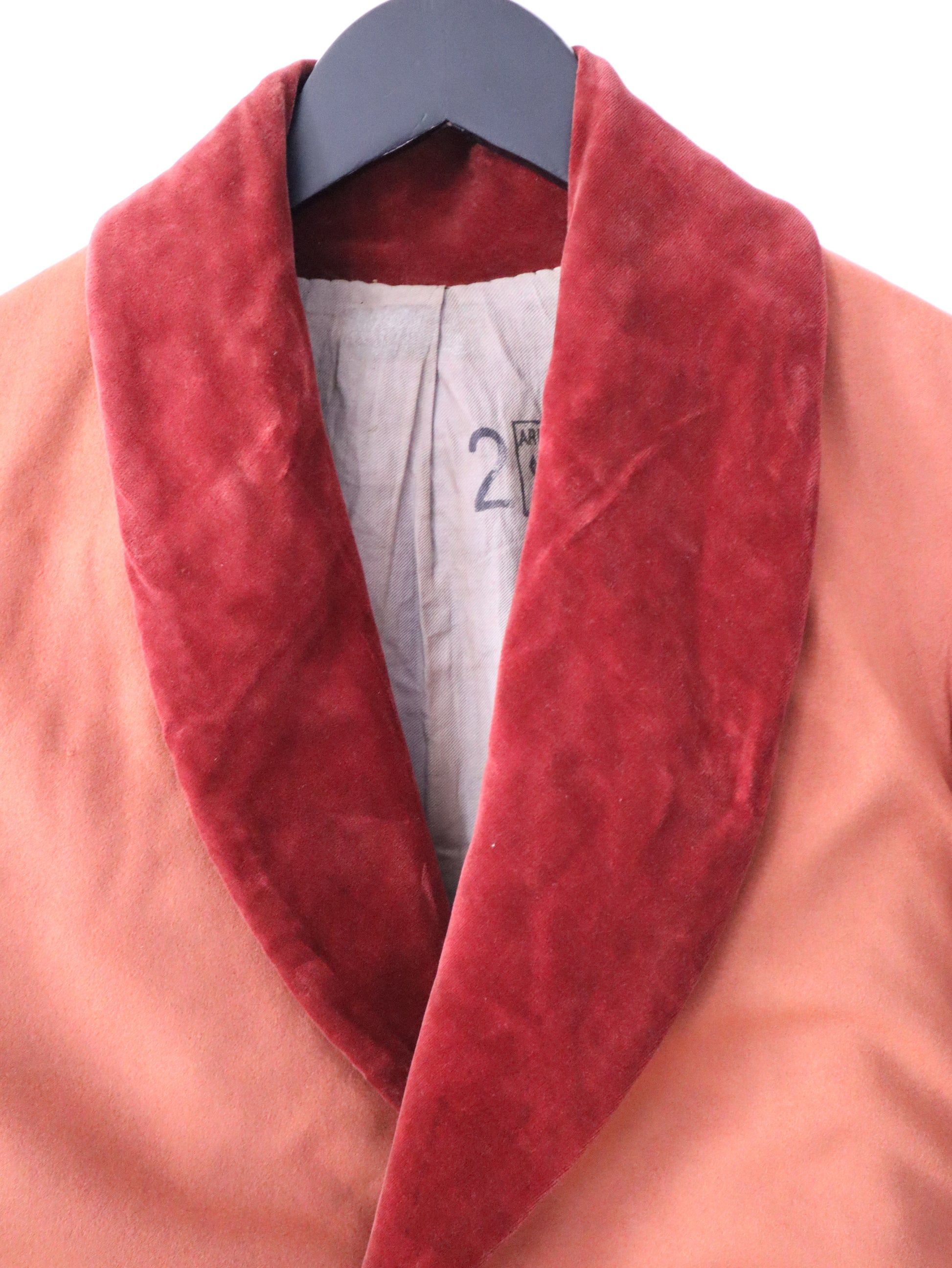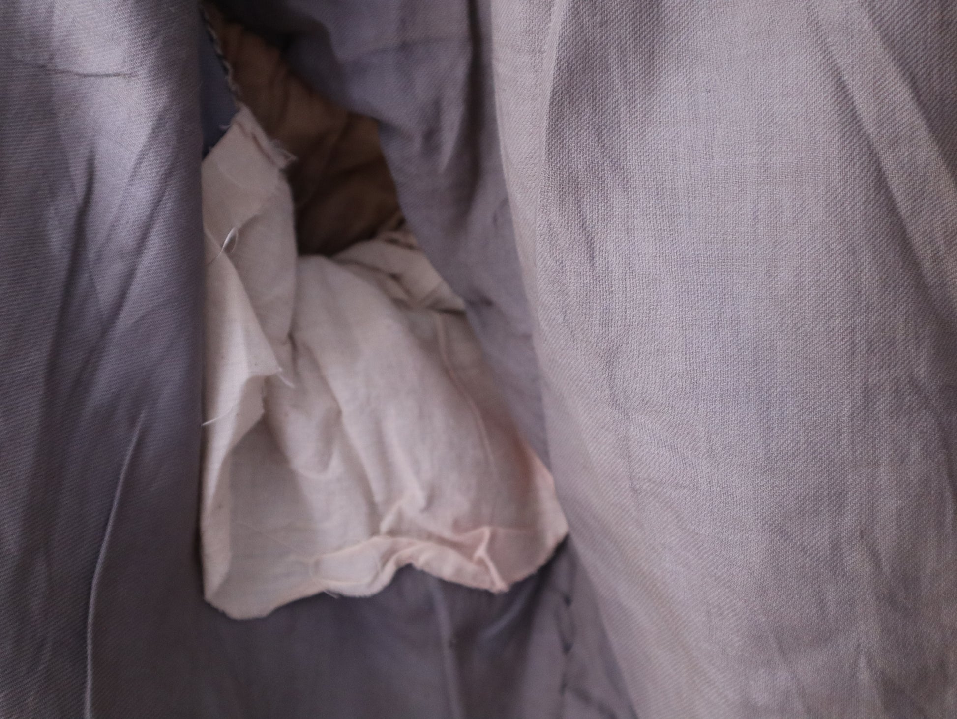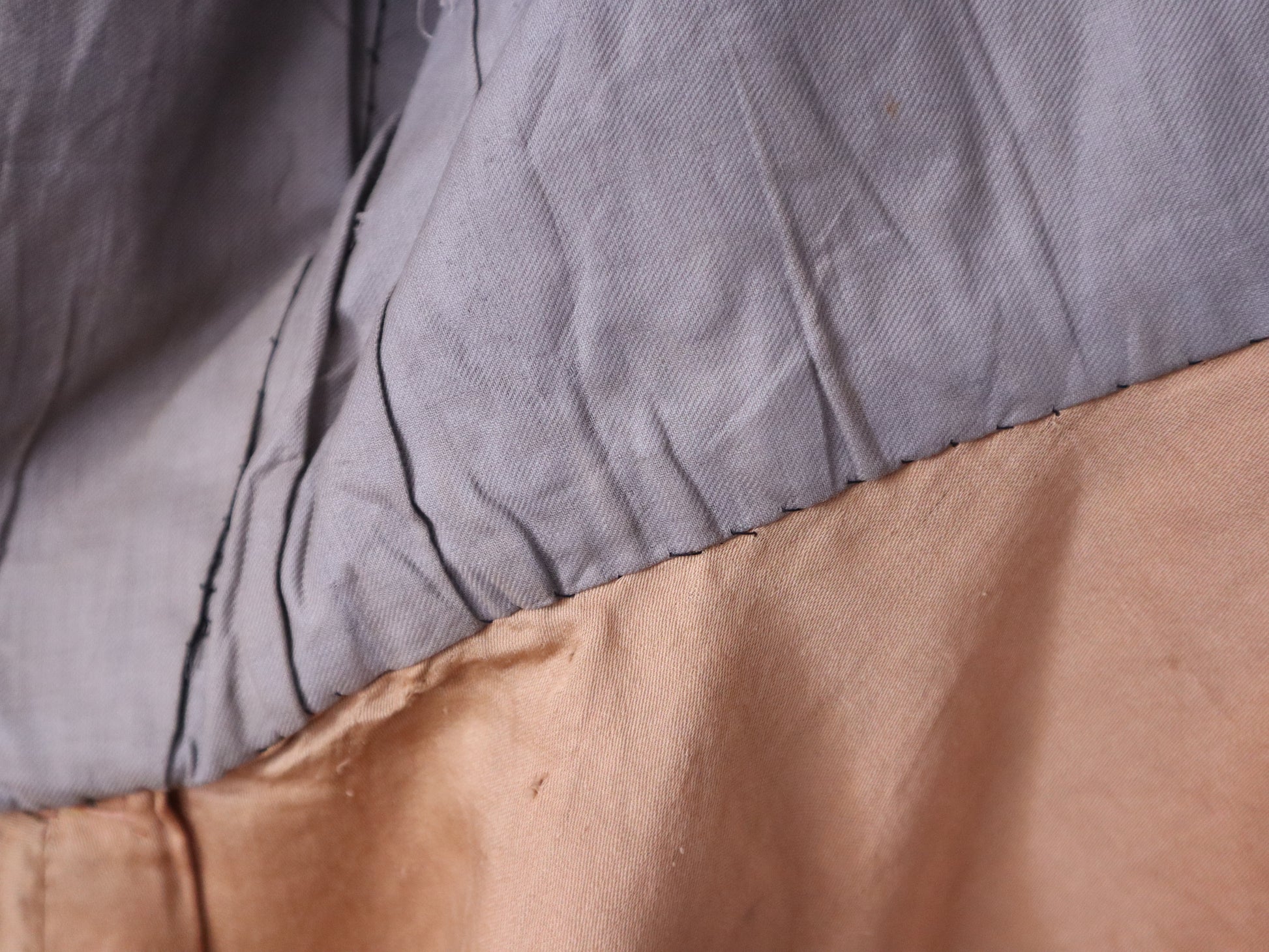 Excellent overall for its age and purpose. There are small holes under the left arm, a stitched repair under the right arm, and a few repair stitches on the back and sleeves. Two areas on the front show some light fabric splitting. All flaws are shown in photos. Still fully wearable and a one-off piece.