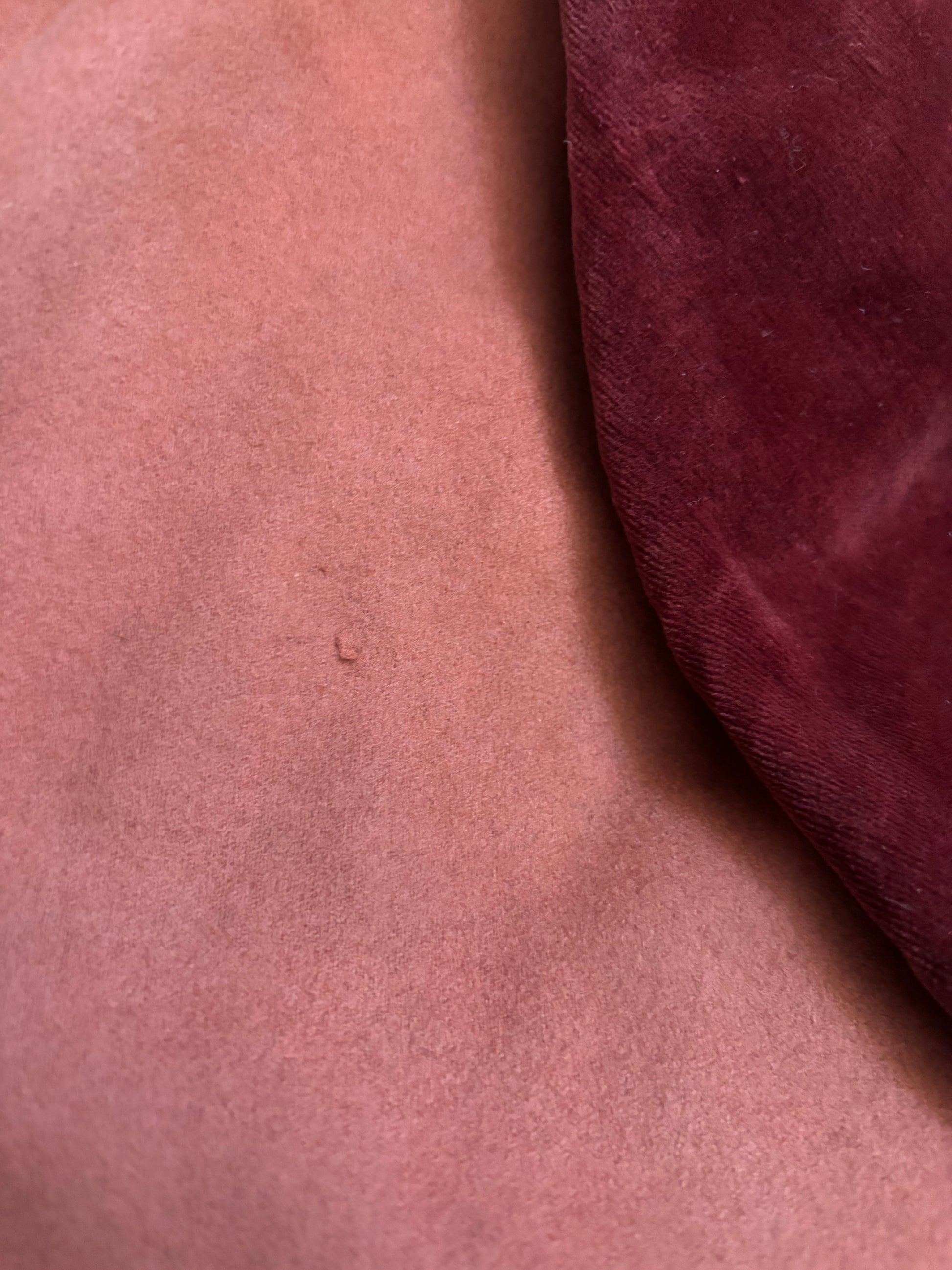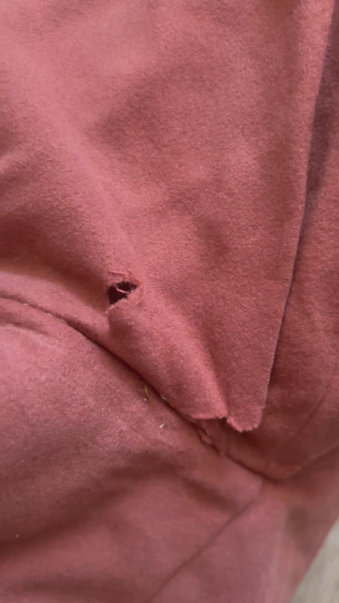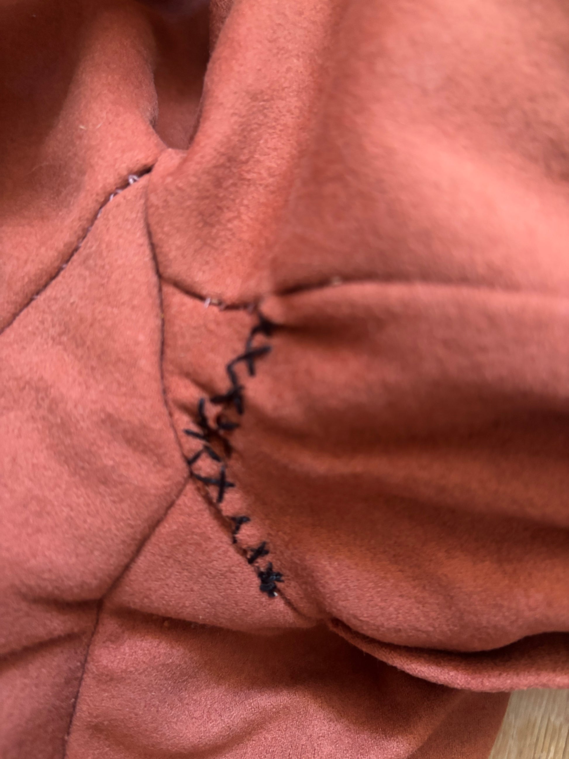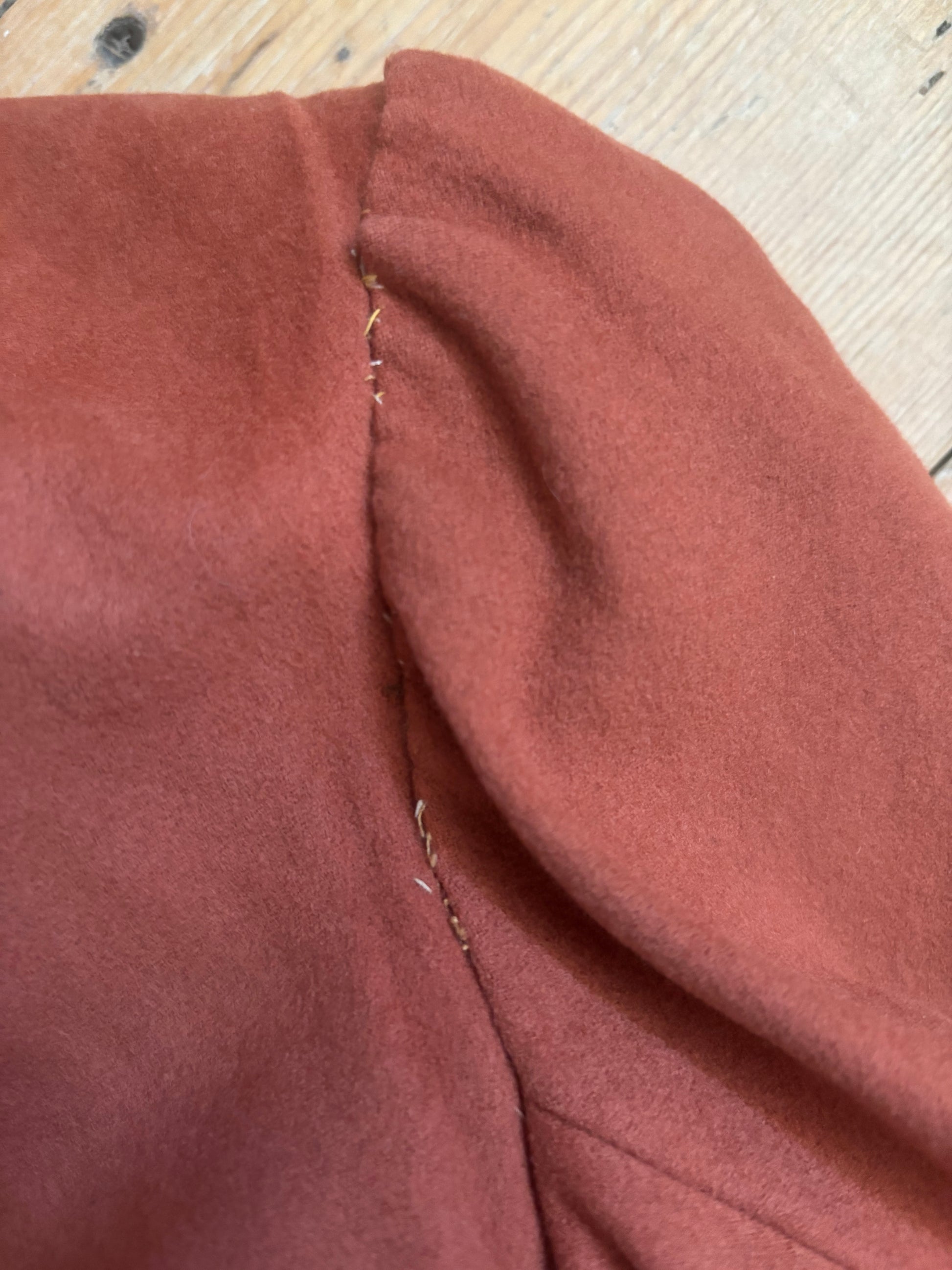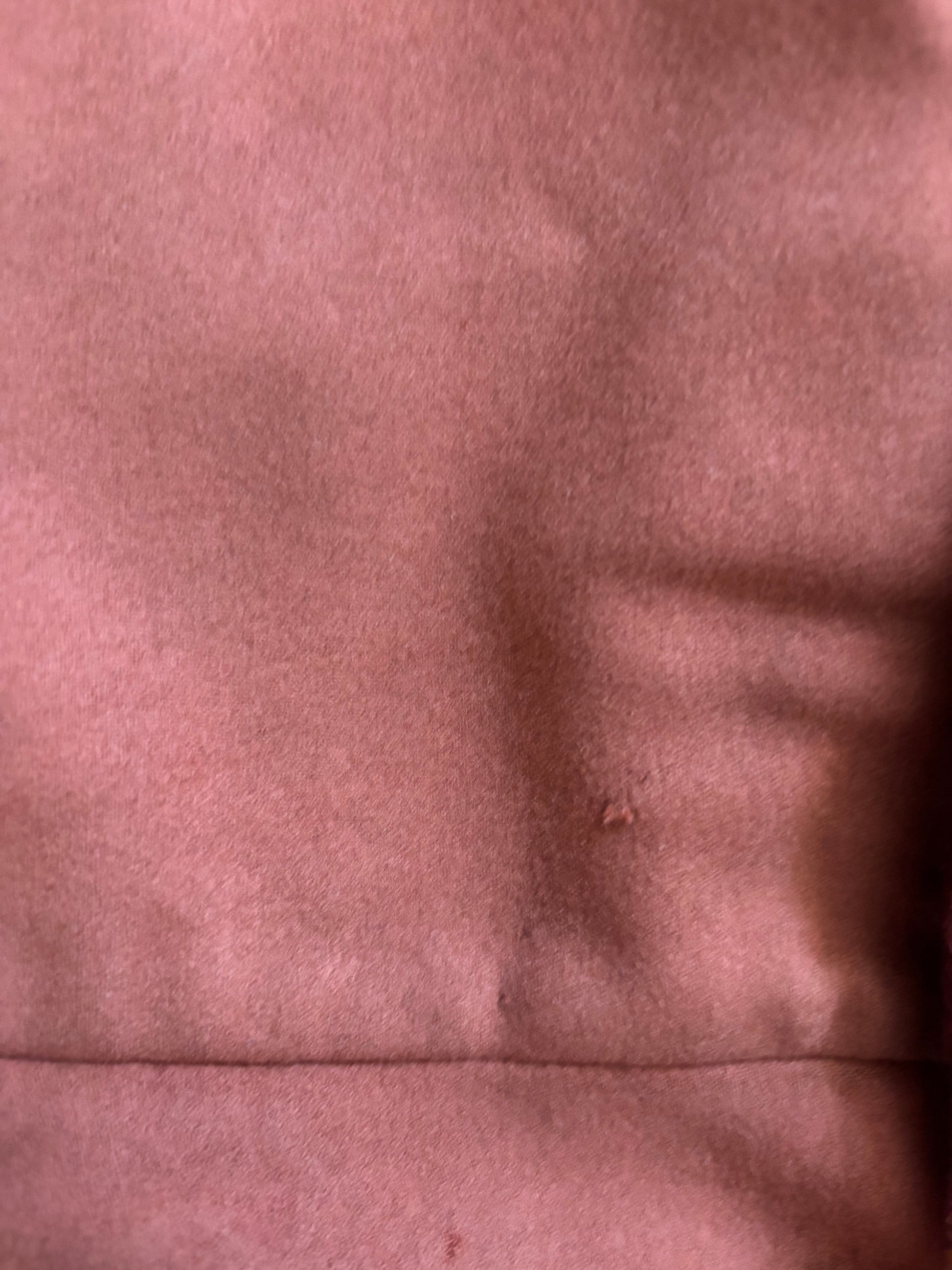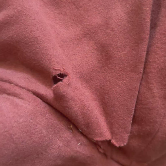 Excellent overall for its age and purpose. There are small holes under the left arm, a stitched repair under the right arm, and a few repair stitches on the back and sleeves. Two areas on the front show some light fabric splitting. All flaws are shown in photos. Still fully wearable and a one-off piece.