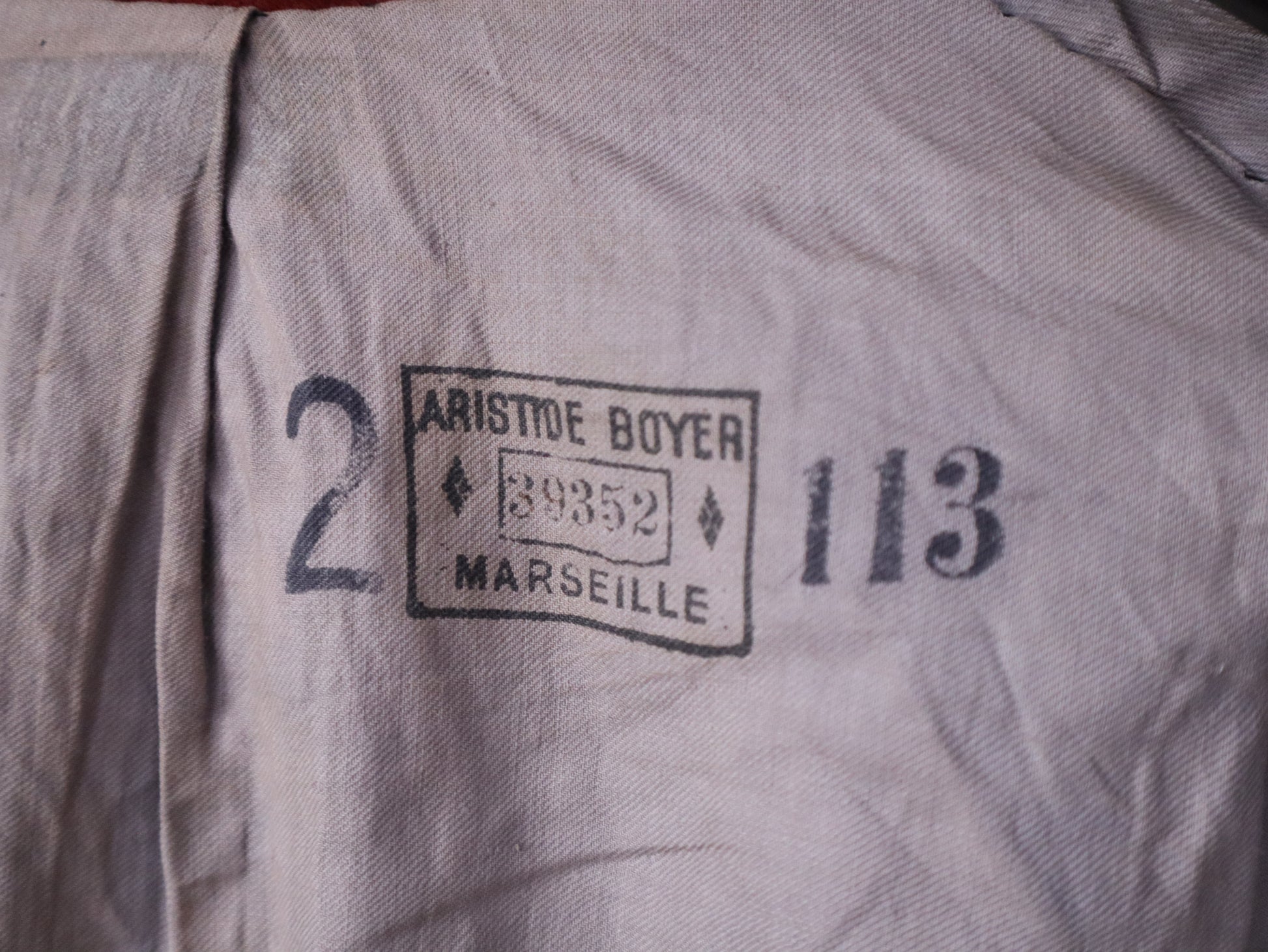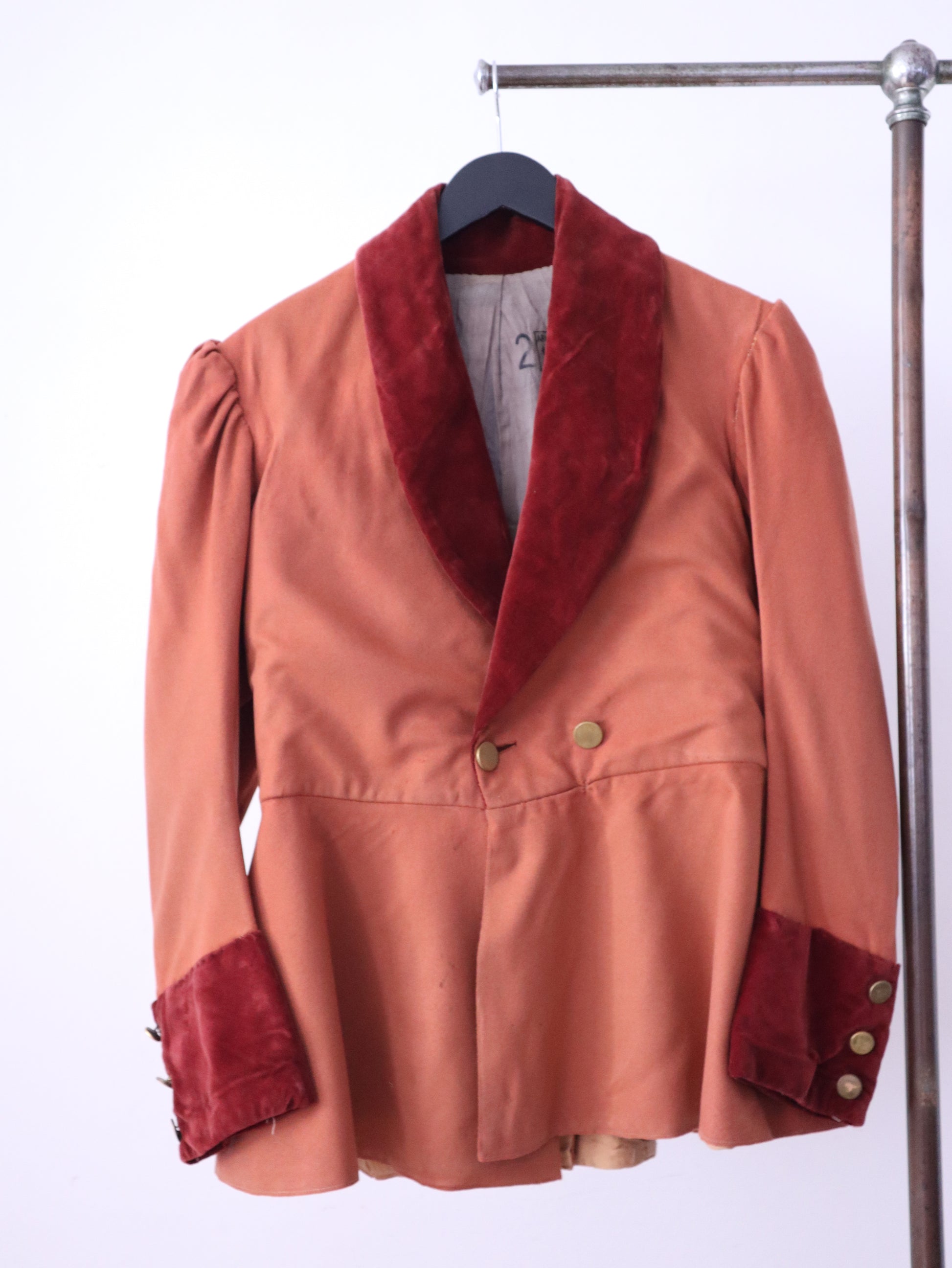 A rare and wearable piece of theatrical history. This antique French opera costume jacket dates to the early 1900s, crafted in the style of the early 1800s. Made of wool with rich velvet trim and detailed with original brass buttons, this jacket was created by the renowned costumier Aristide Boyer in Marseille. Fully lined in cotton and entirely hand-stitched, it reflects exquisite craftsmanship from a bygone era.