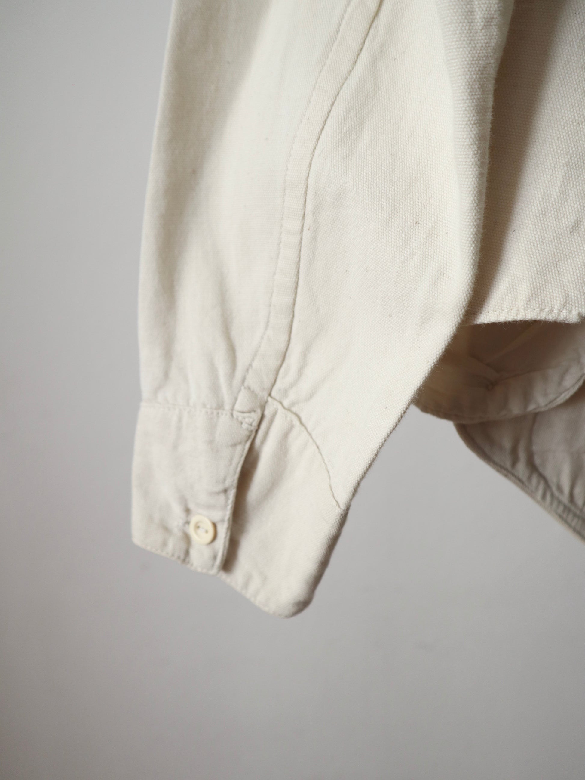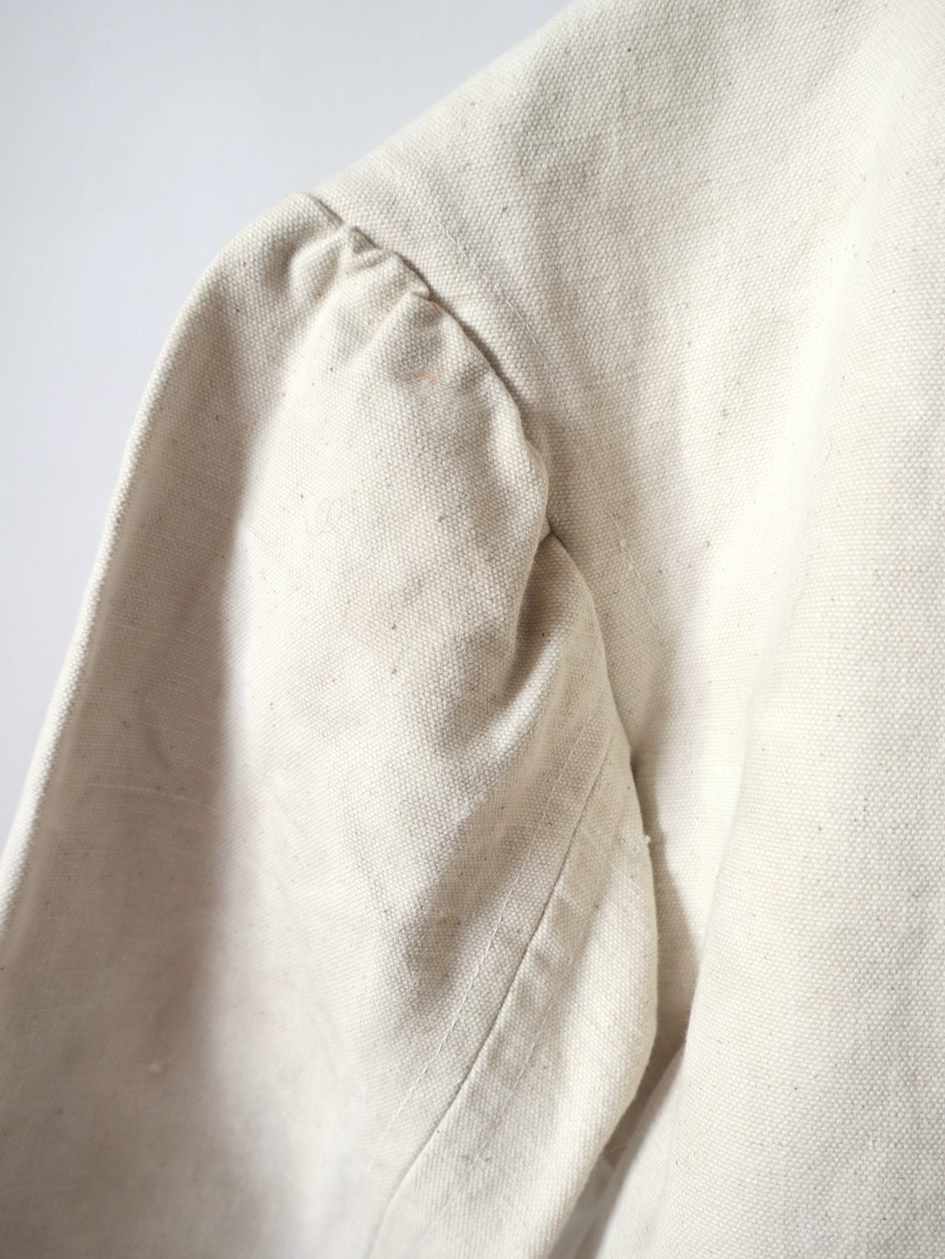 Antique French fencing jacket dating to the early 20th century, constructed from heavy linen canvas in a soft natural tone.