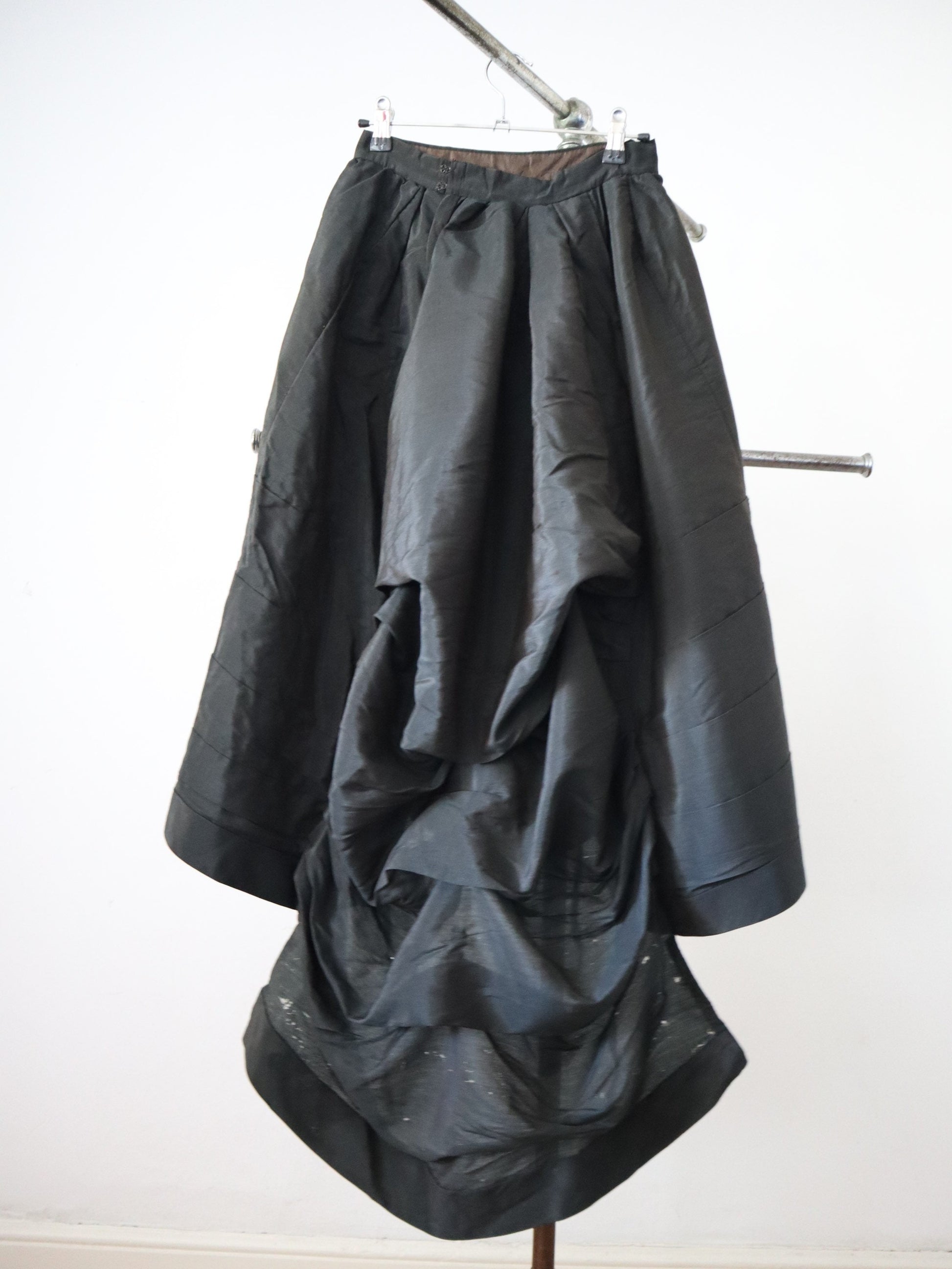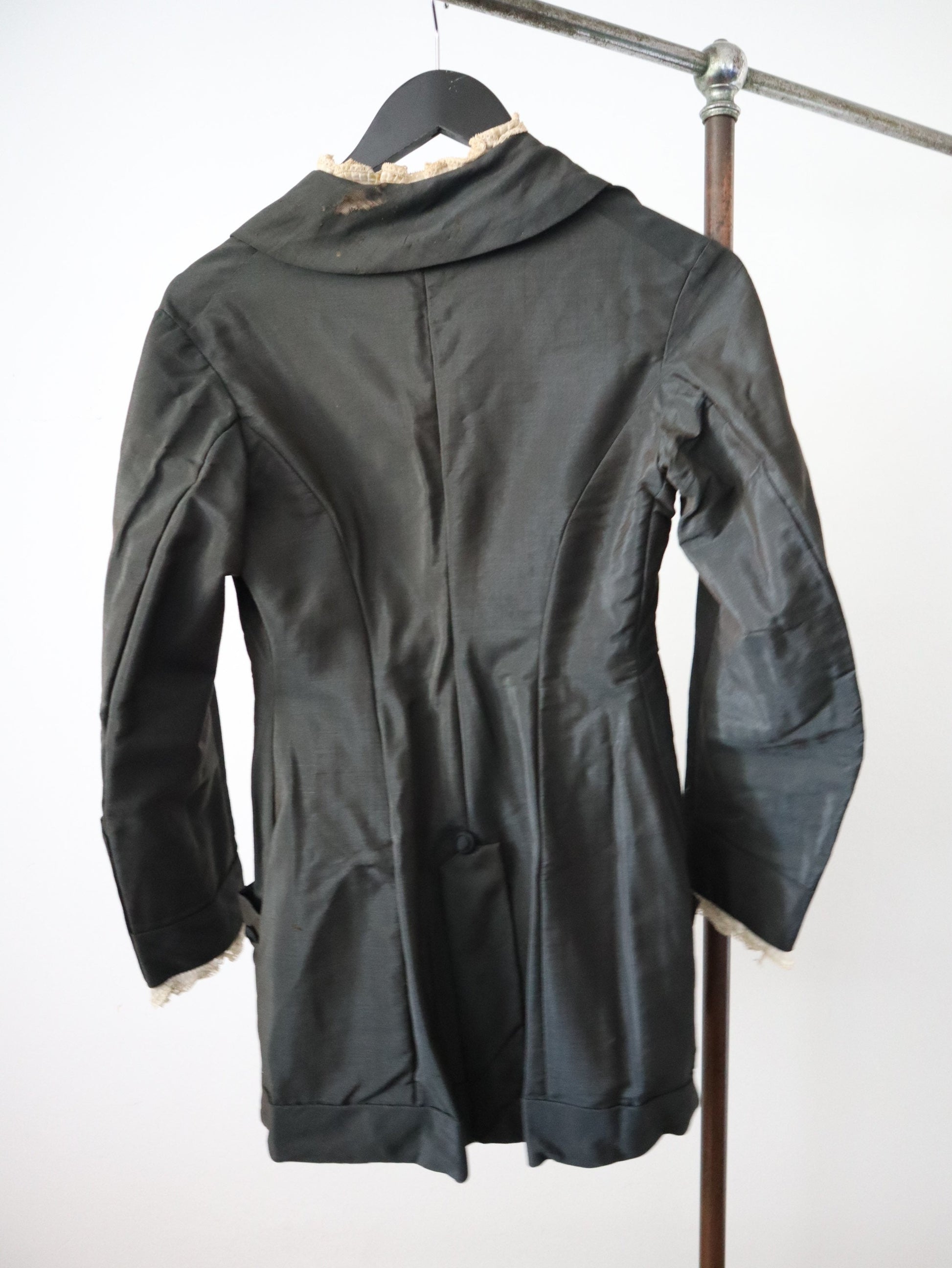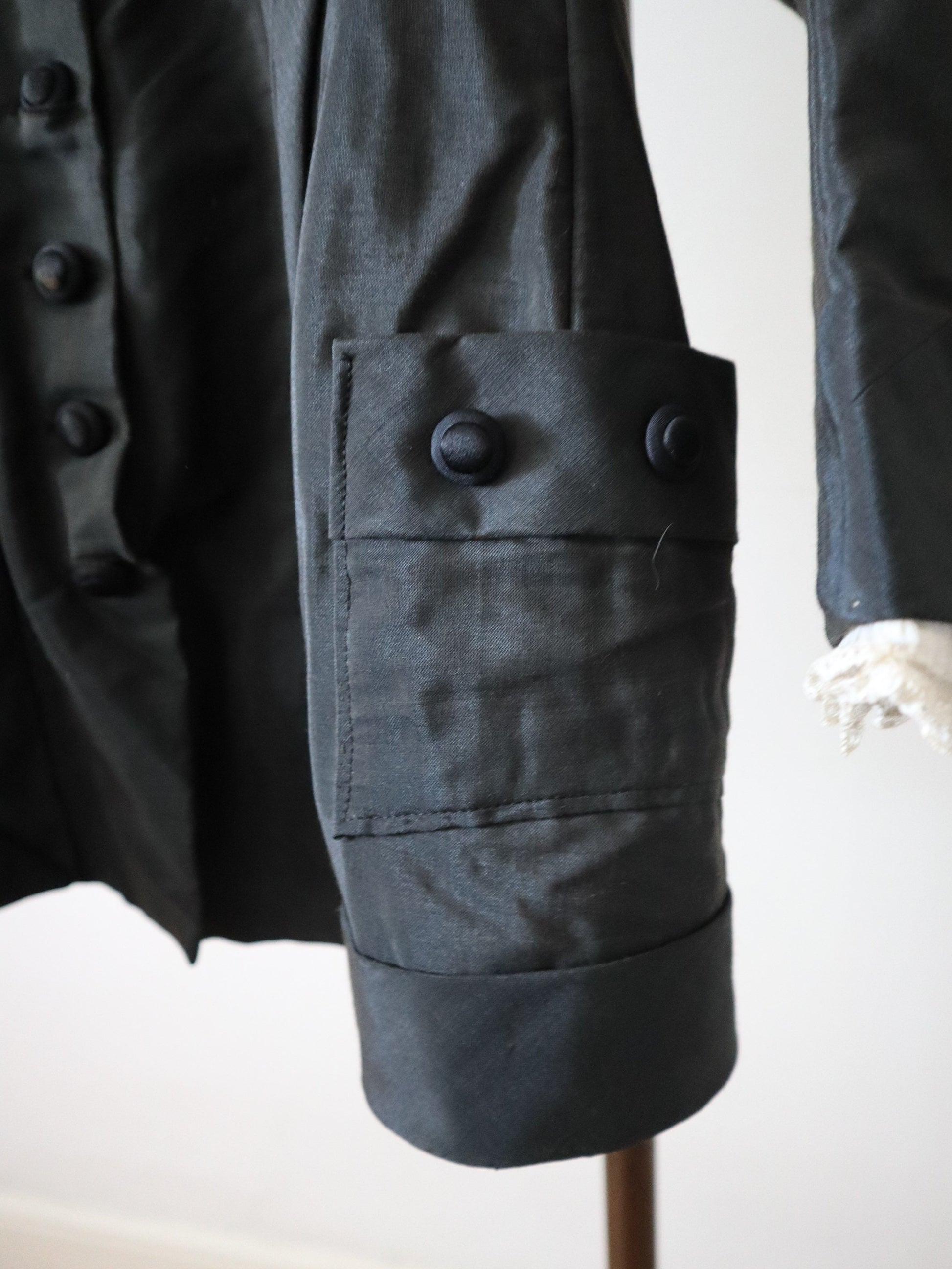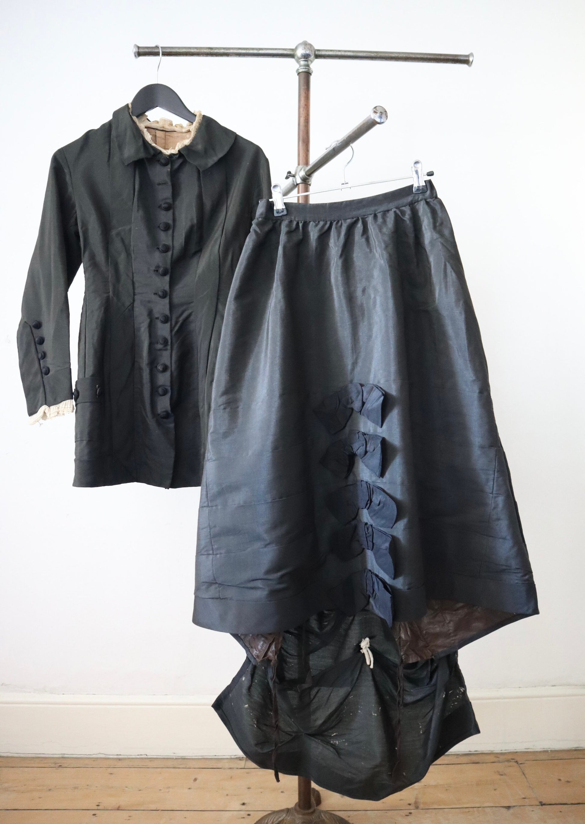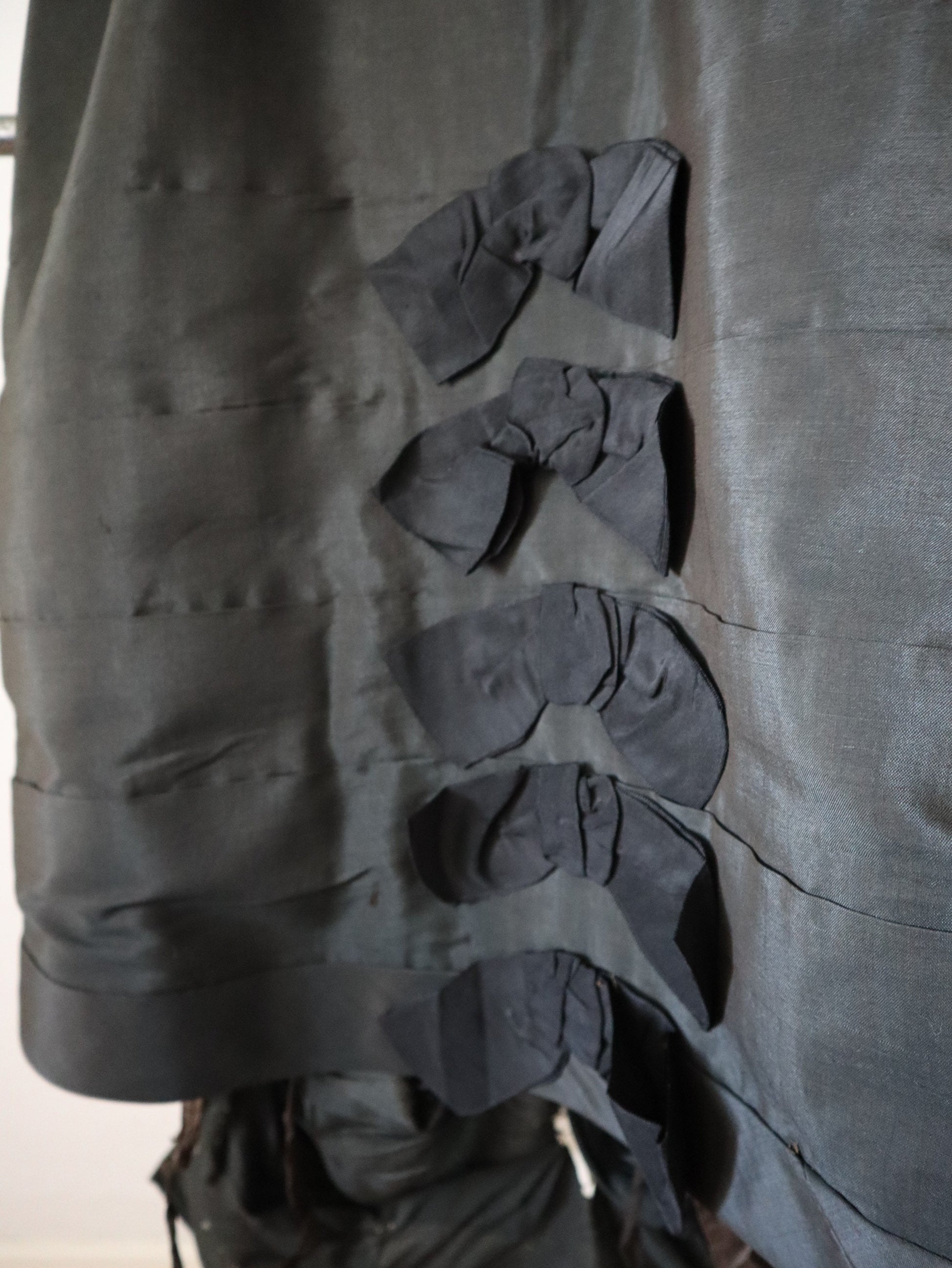 Late 19th century French black silk two piece outfit. Long line fitted bodice jacket and bustle back shaped skirt with decorative bows. Lovely details. The jacket has two front pockets with decorative covered buttons. The sleeves also have decorative buttons up the sides. There is boning (three) down the back of the jacket). Lace trim on the collar and cuffs. The skirt is ruched at the back ready for a bustle petticoat. Lower section of the skirt is lined with brown glazed cotton.