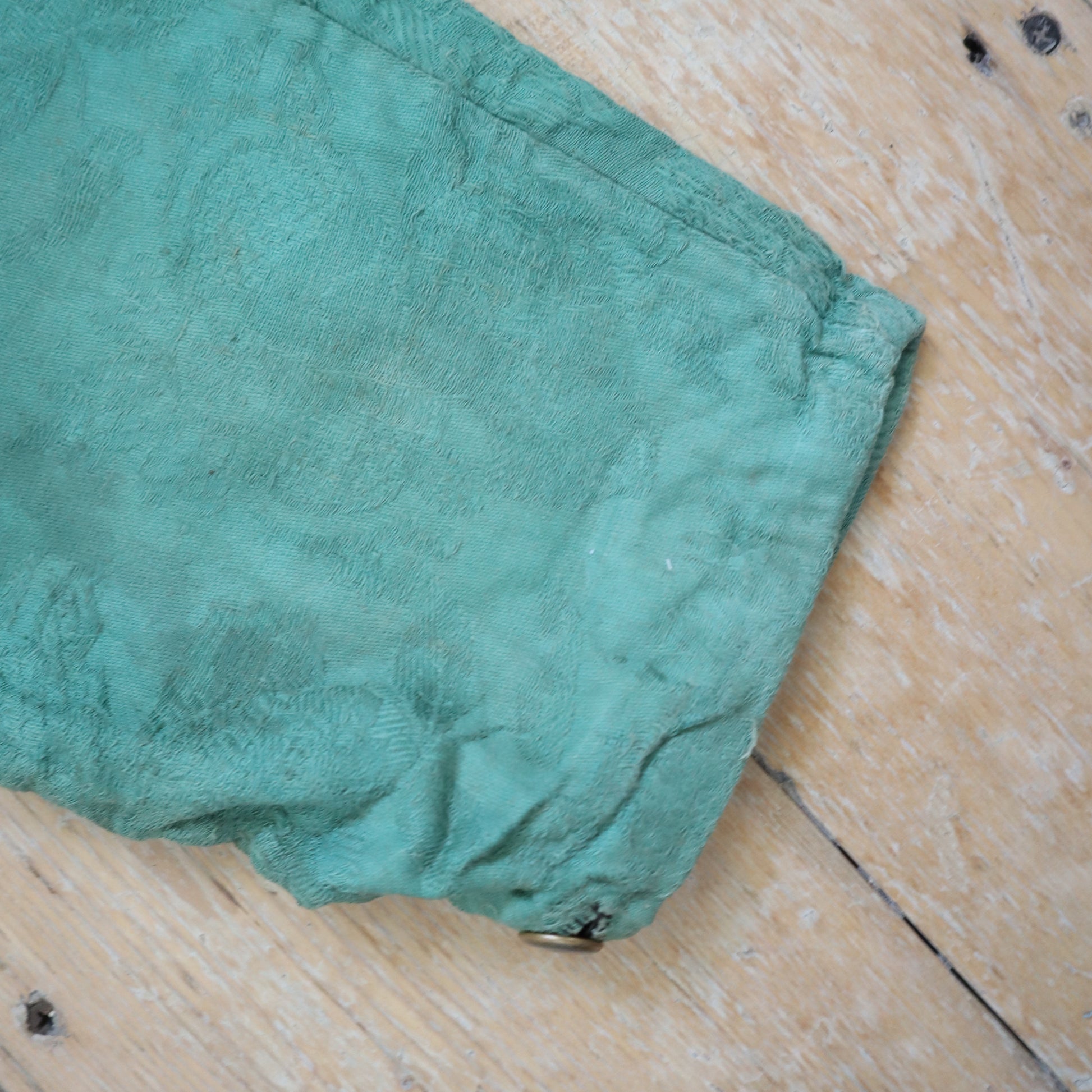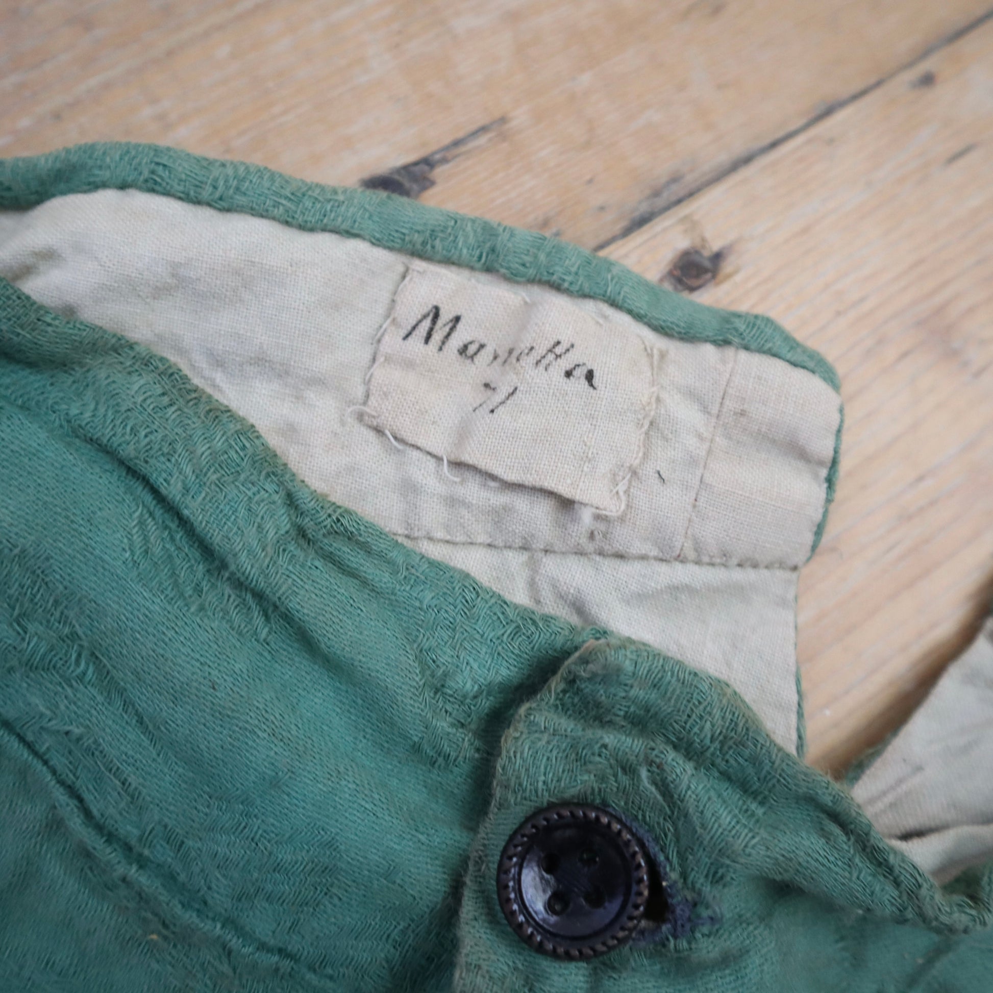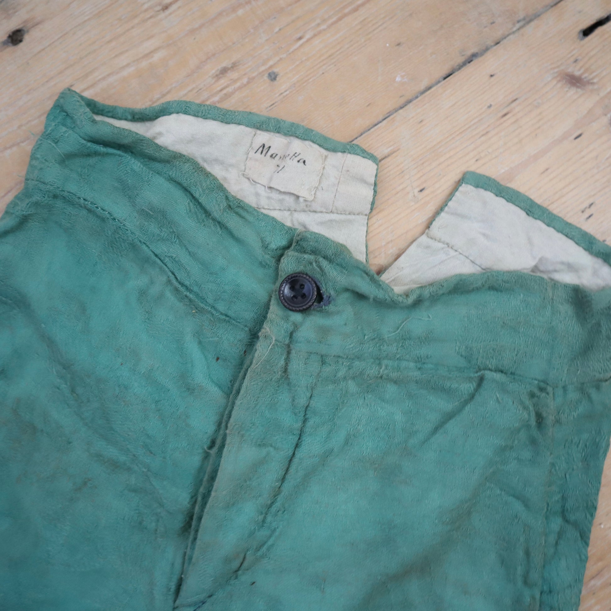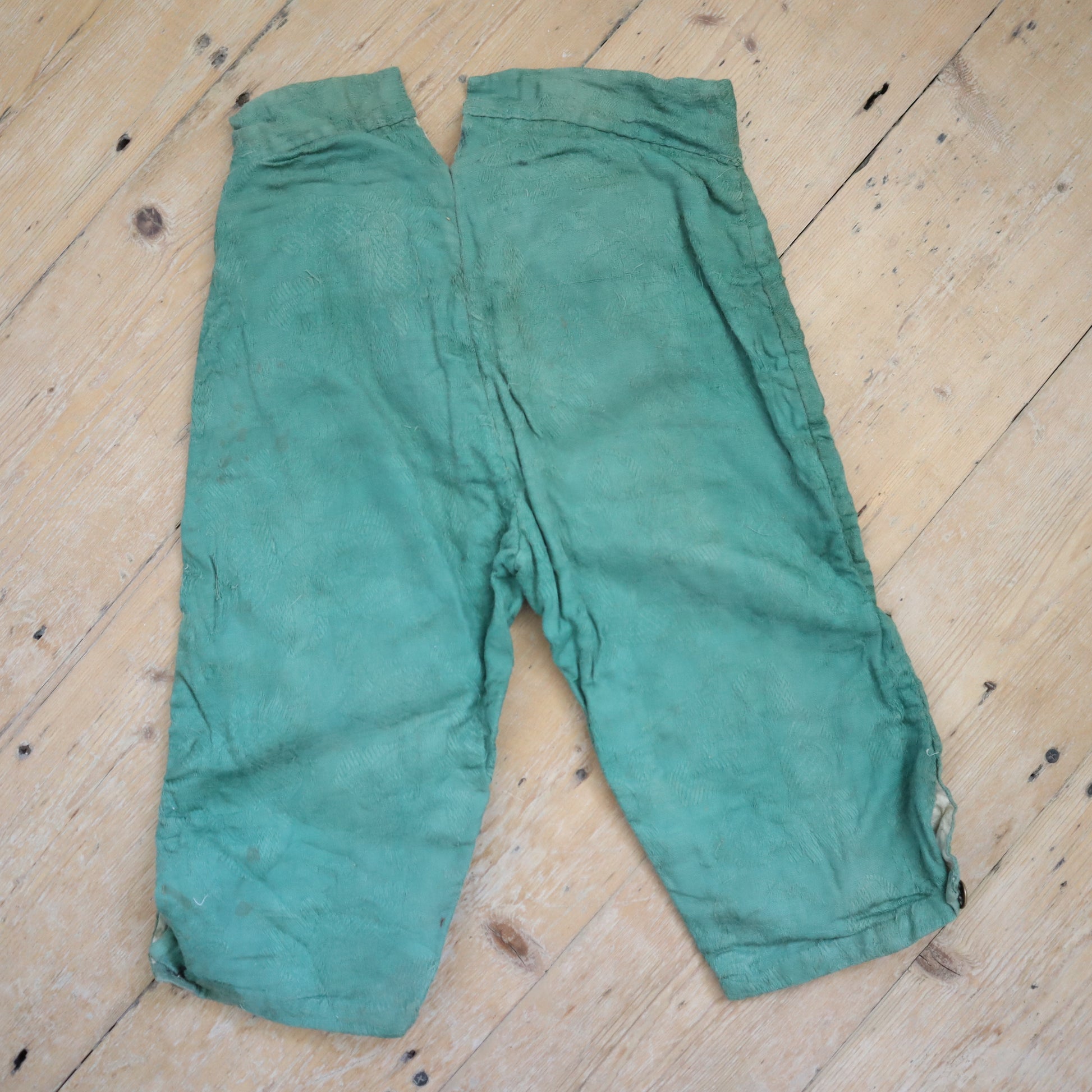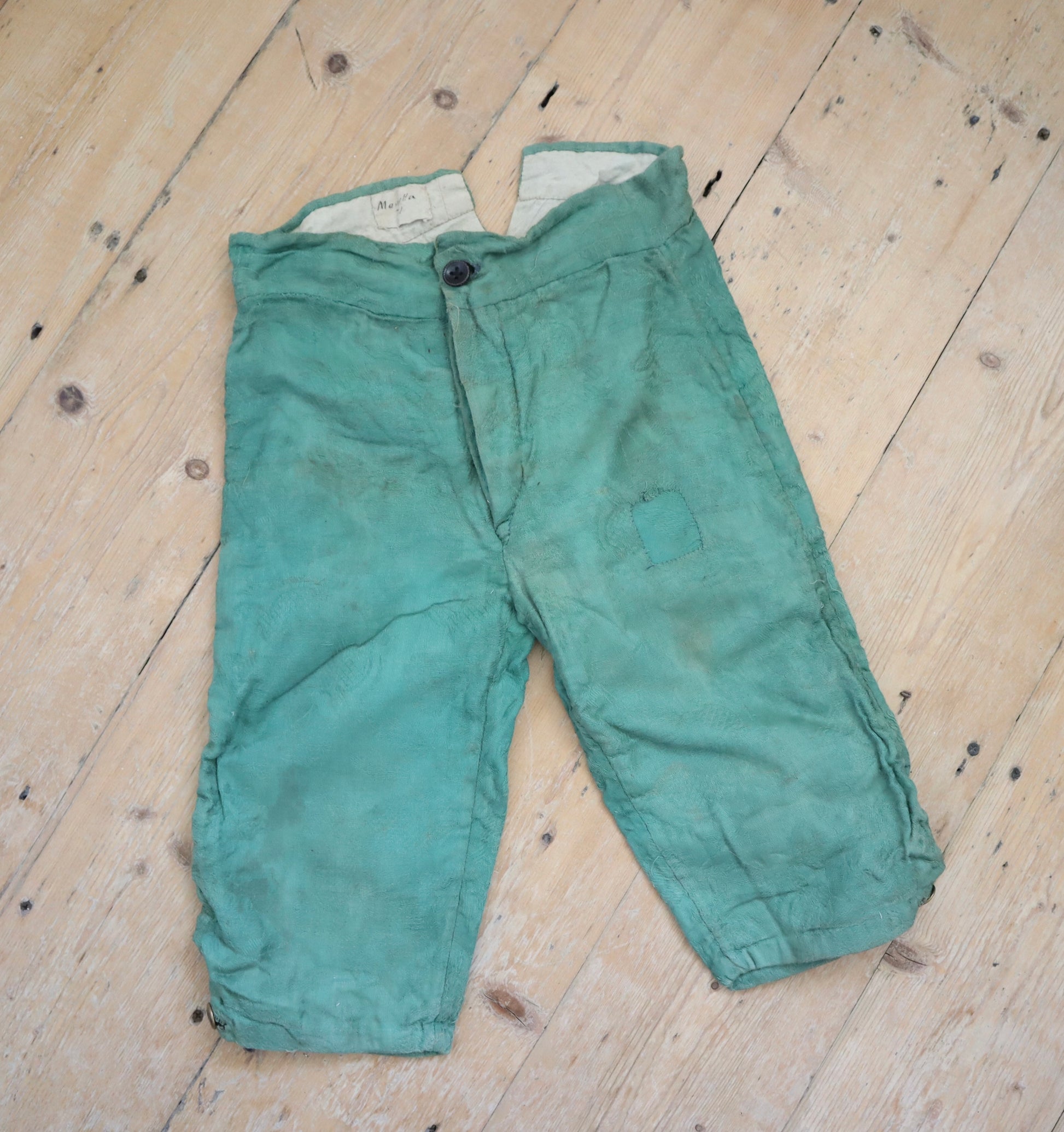 19th century made French costume breeches. Beautiful Jacquard woven green coloured cotton fabric. Lined in neutral linen. Button fly. Buttons at the knees. Lovely hand written name inside. Hand stitched. Little patch repair on the left leg.
