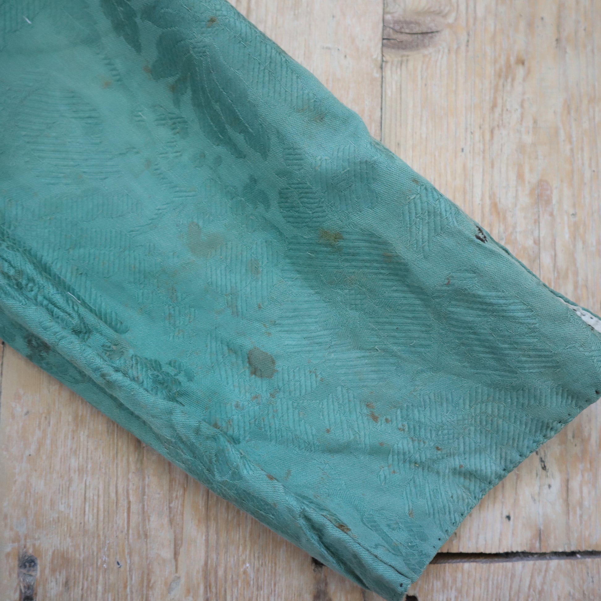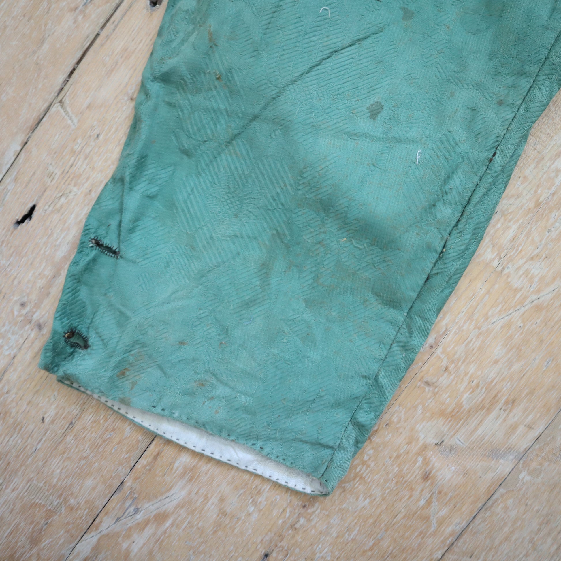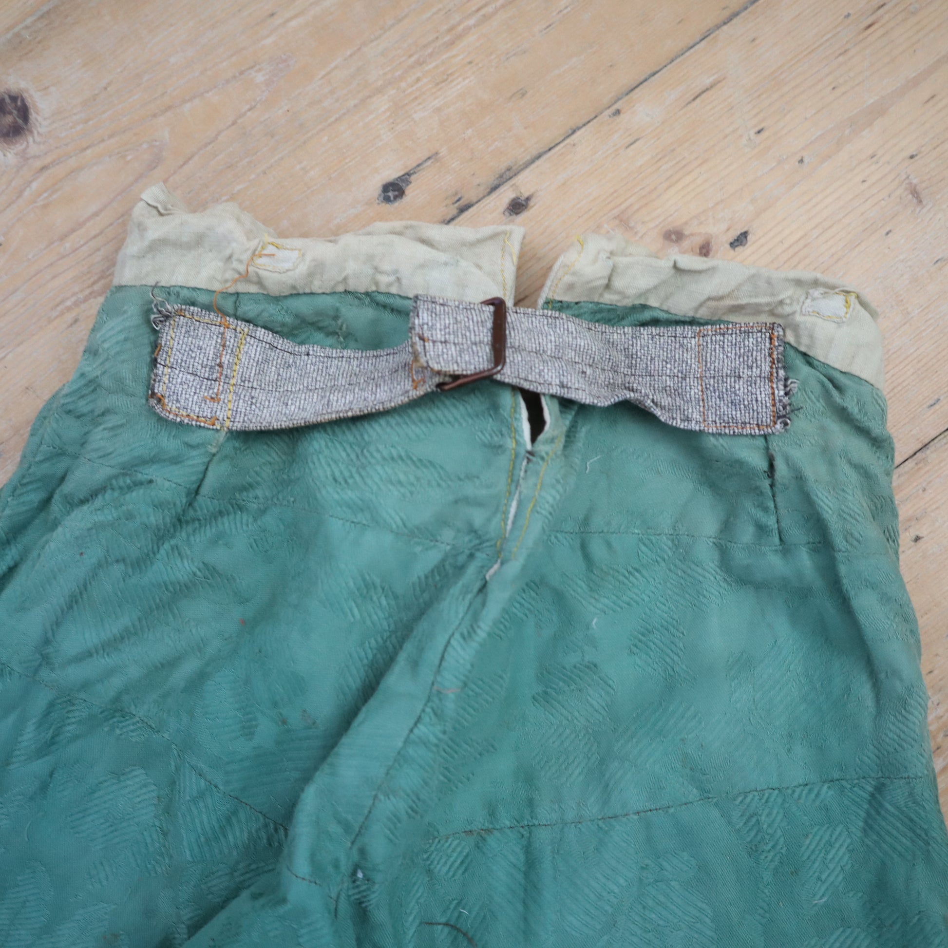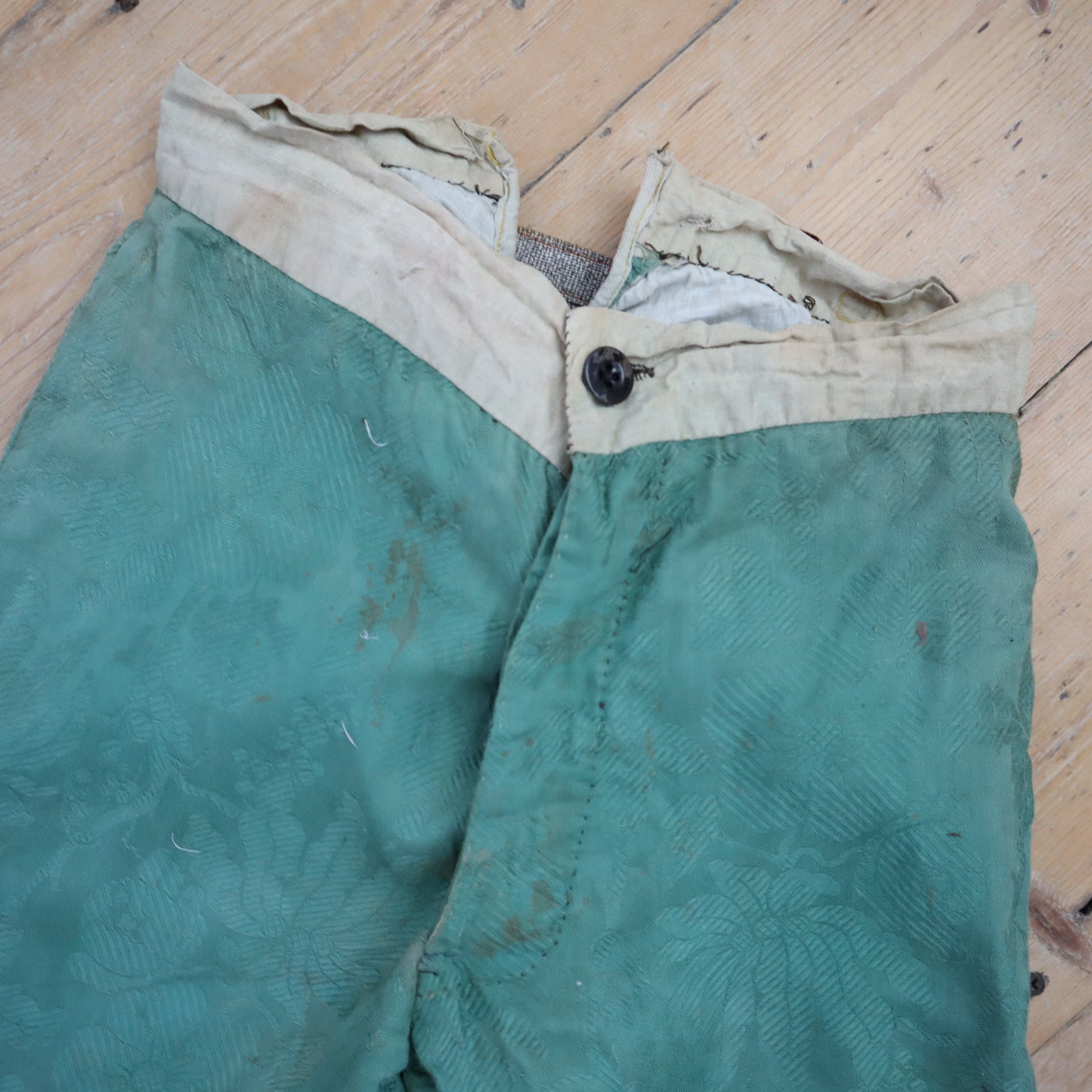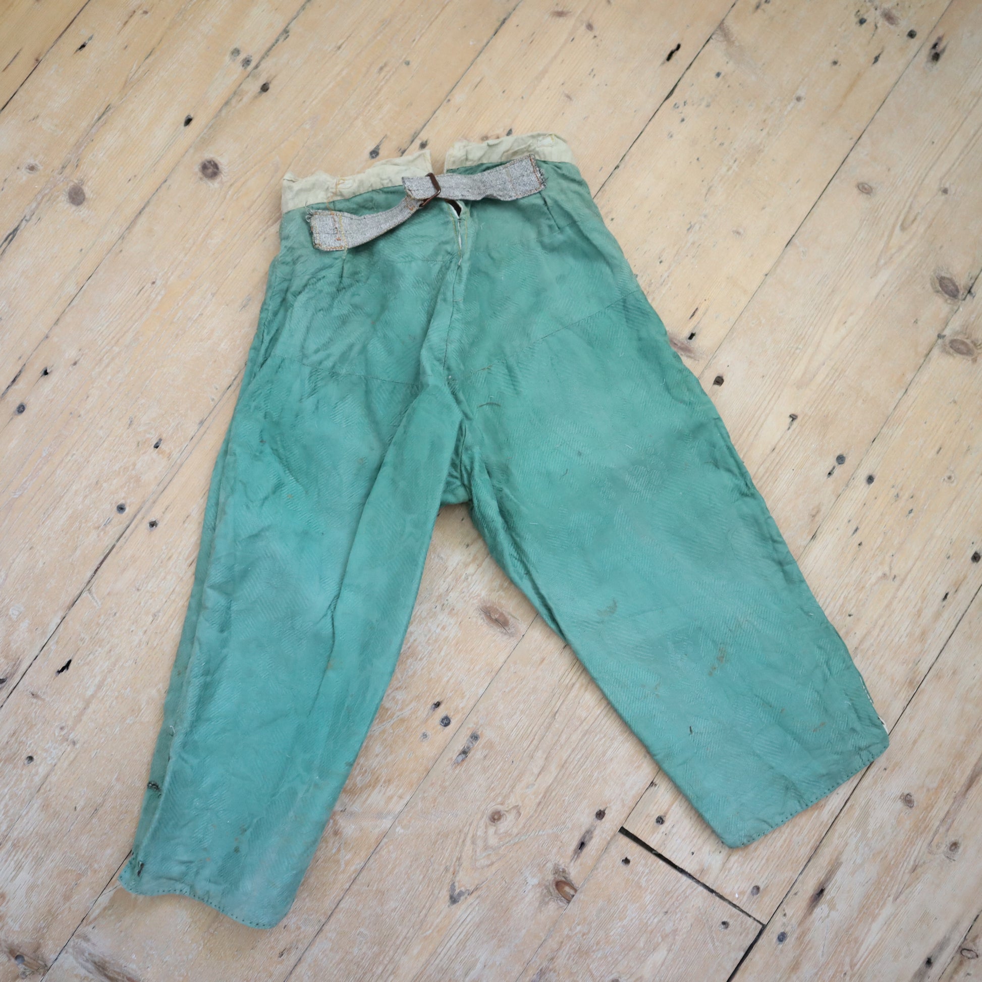 19th century made French costume breeches. Beautiful Jacquard woven green coloured cotton fabric. Lined in cotton.. Button fly. Buttons at the knees. Hand stitched. Cinch back with a metal buckle.