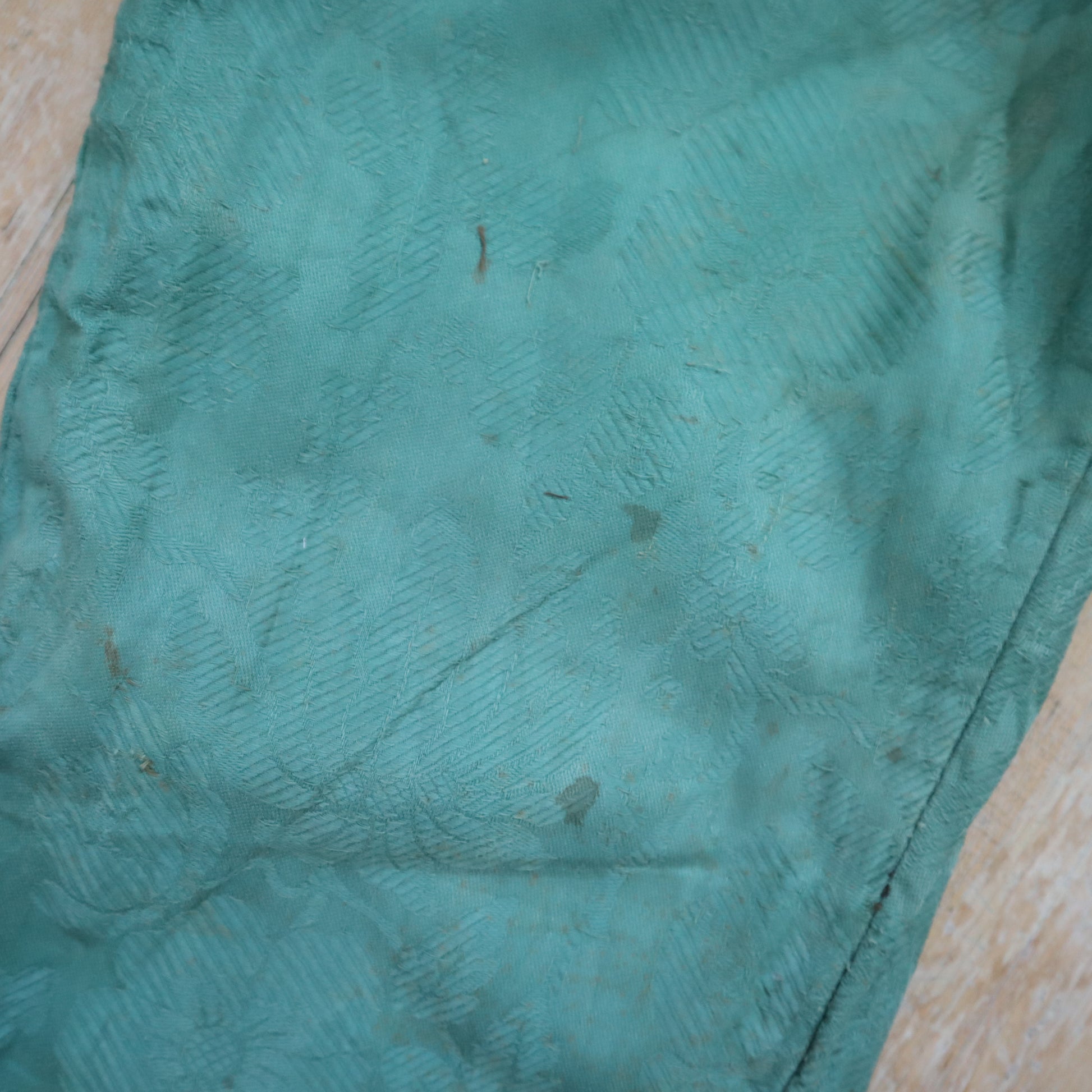 Condition: freshly laundered with cool water and a gentle detergent. Some rust-like marks throughout. Missing buttons on the legs. Please inspect the photos and ask any questions you may have.
