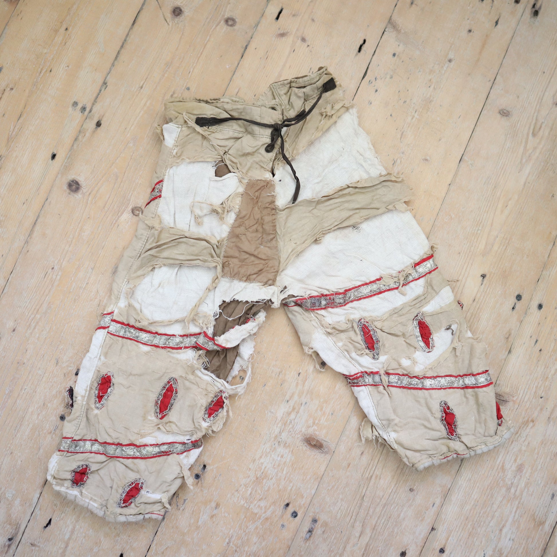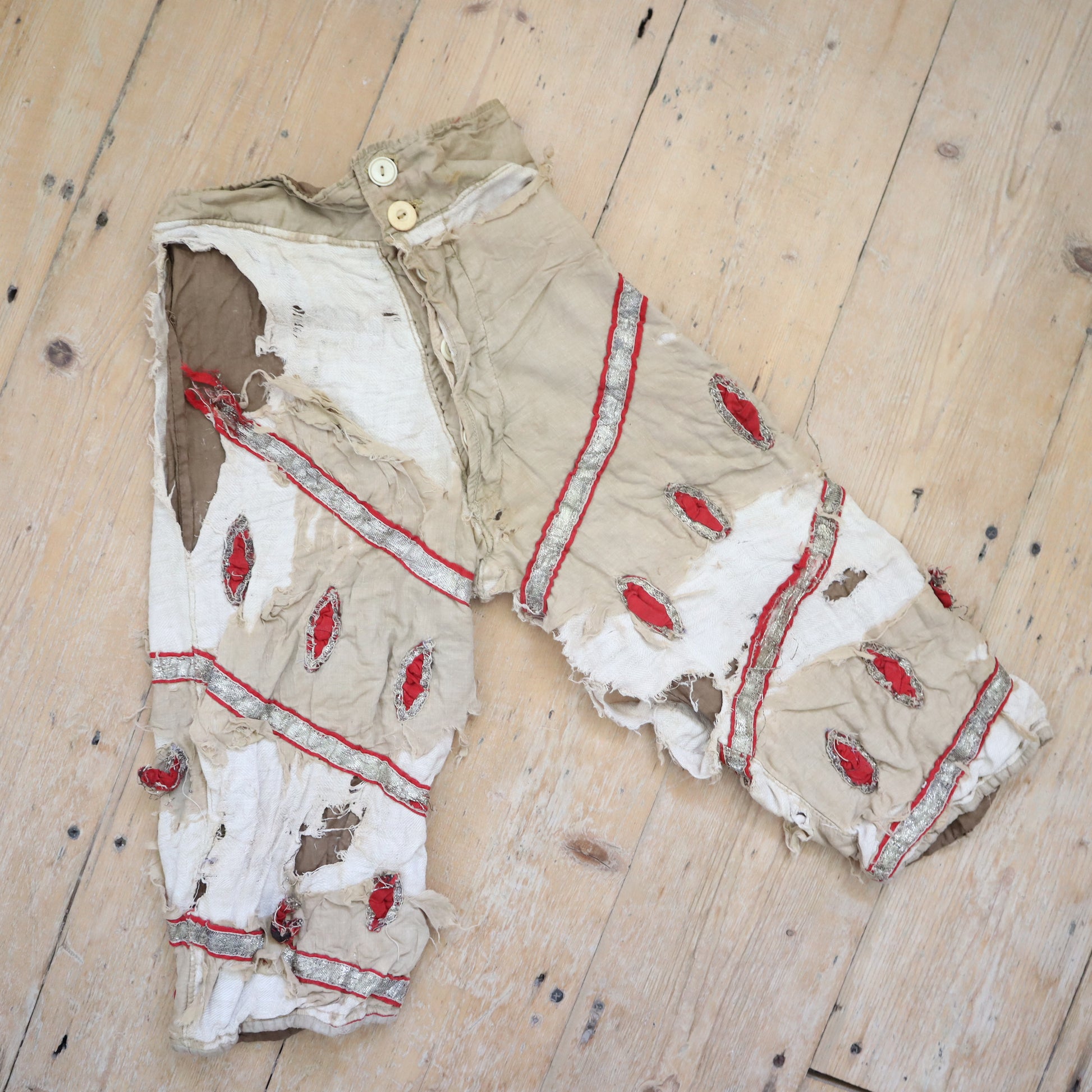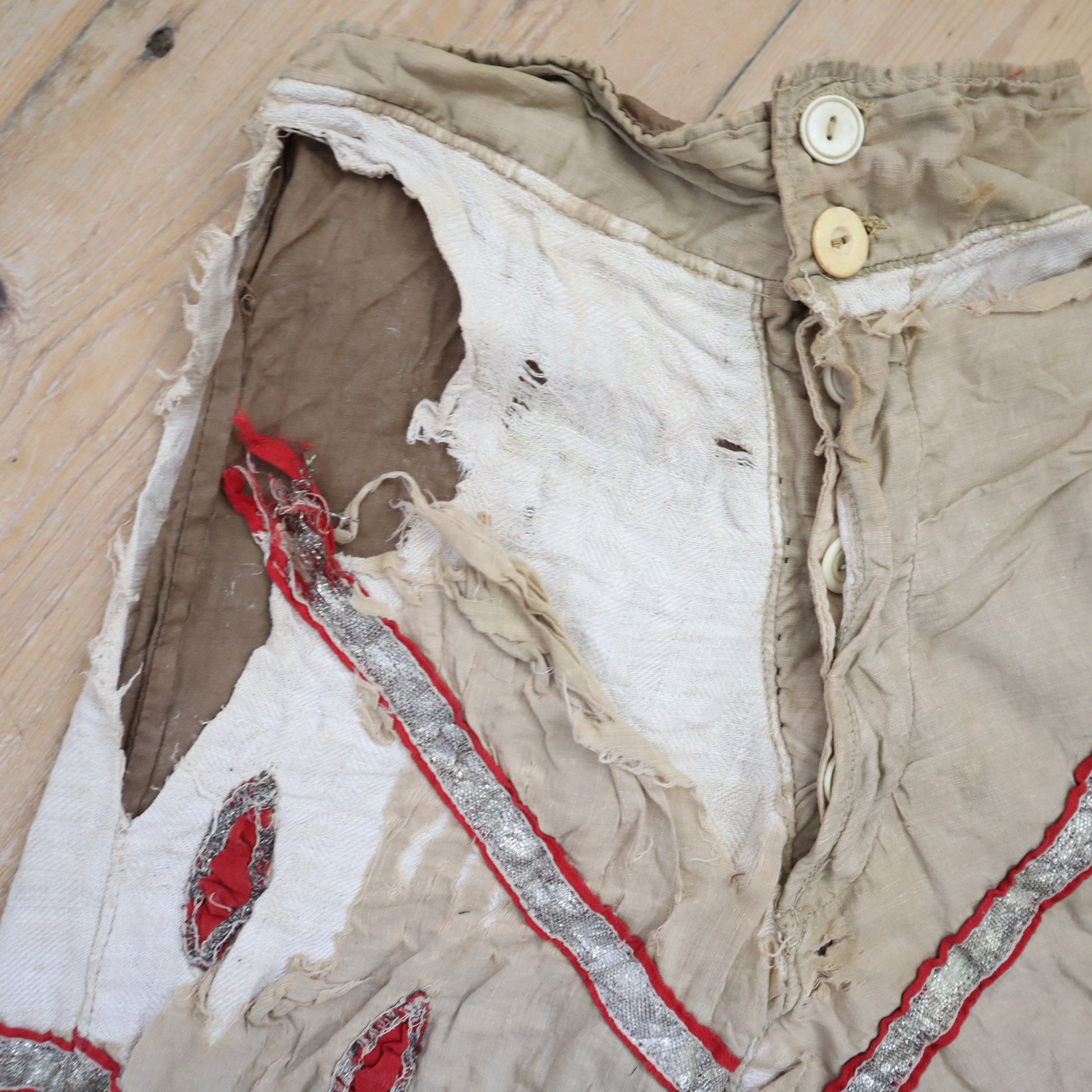 19th century made French costume breeches. Mushroom coloured gauzy cotton with slash and puff mimics Renaissance style. made from red cotton and trimmed with silver metal ribbon trim. Lined in brown cotton. Lovely hand written label. Bone button fly. Hand stitched. Cinch back with a simple tie.