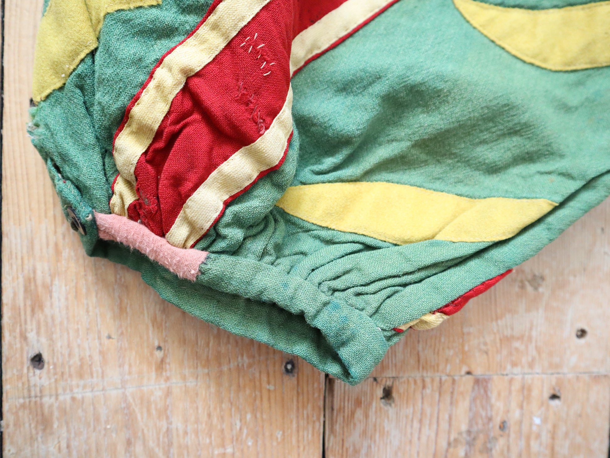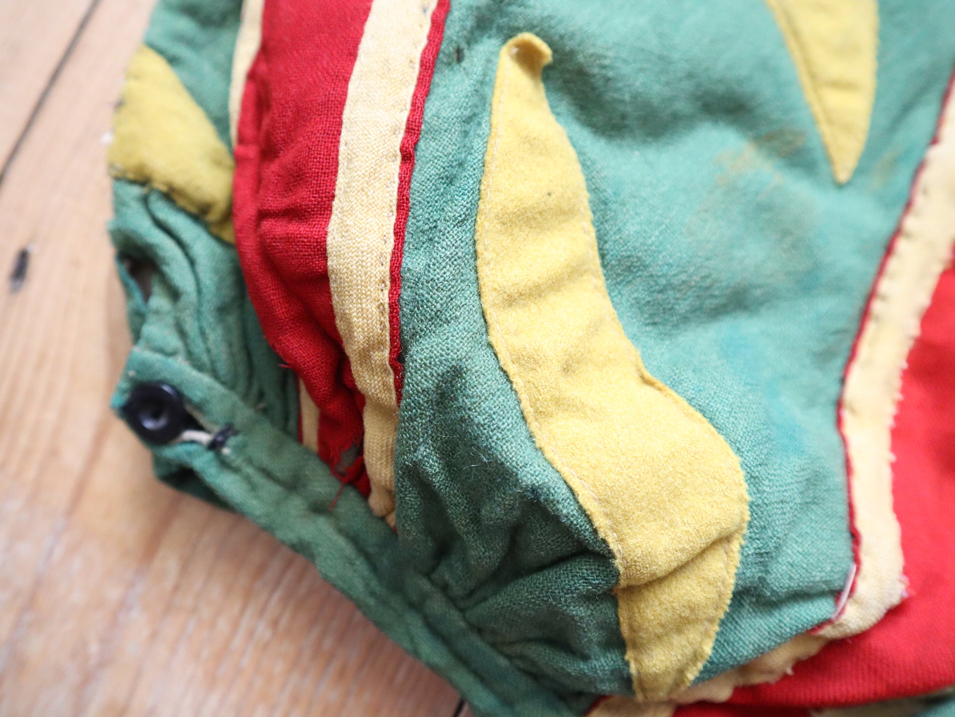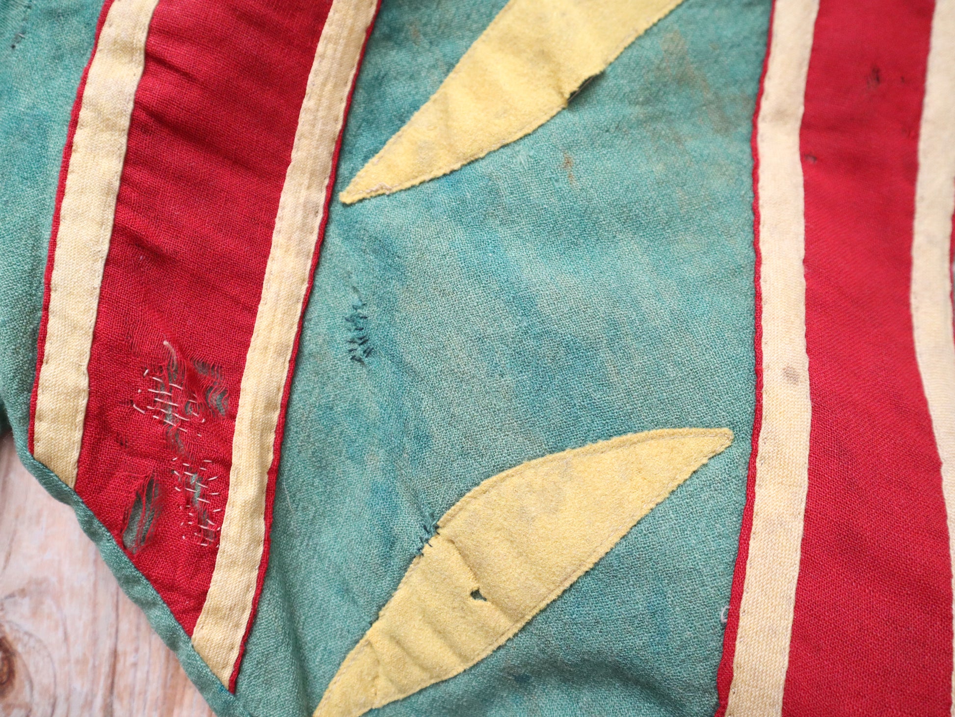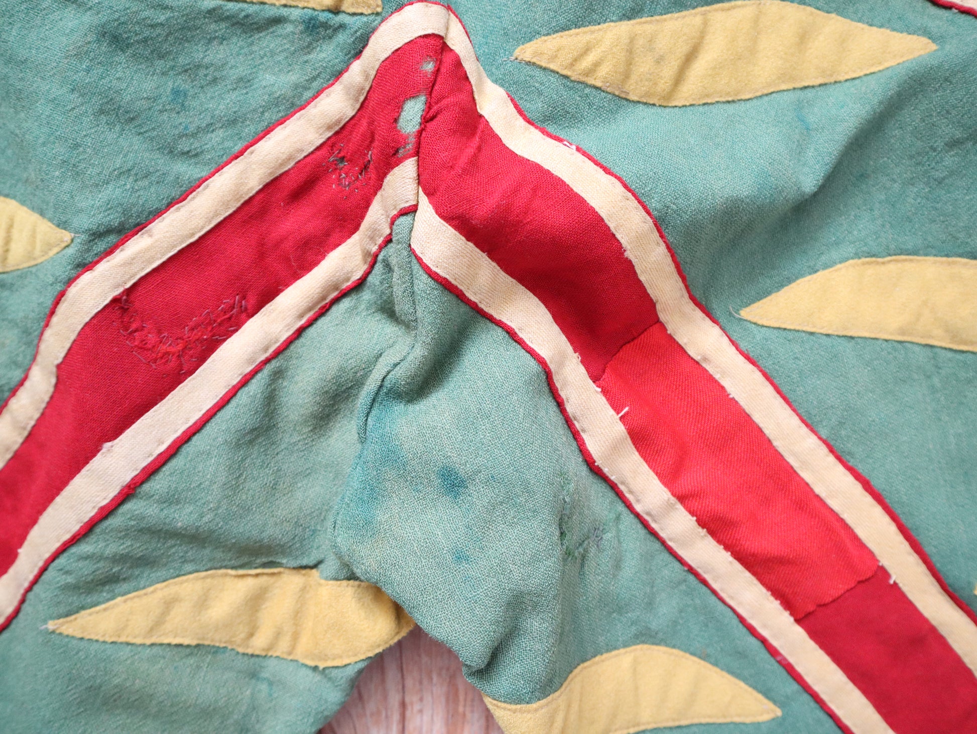 The colour palette is striking and deliberate. Arsenic green wool forms the base—unusual, saturated, and full of presence. Deep red side panels introduce contrast and structure, while yellow appliqué add clarity and dimension. Together, these tones create a bold visual rhythm that feels both historic and sharp.