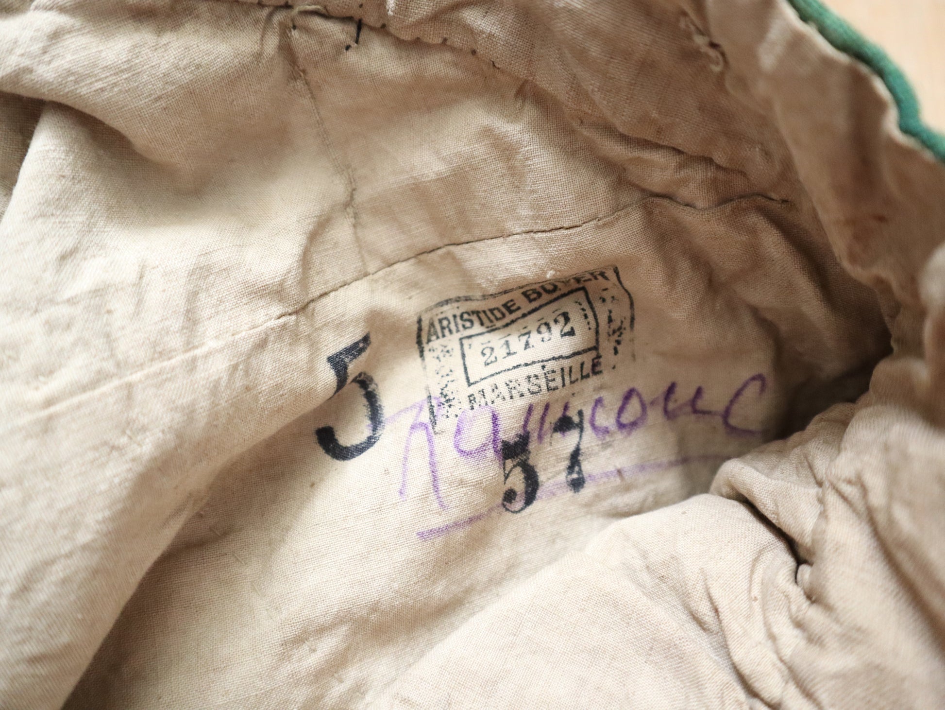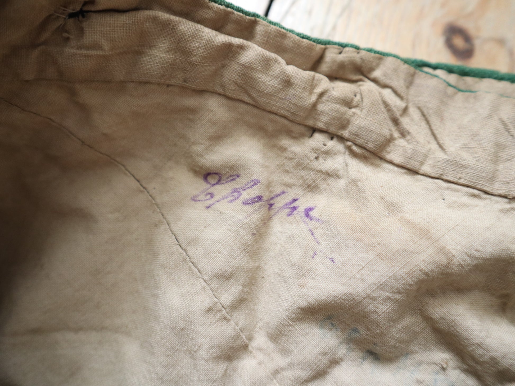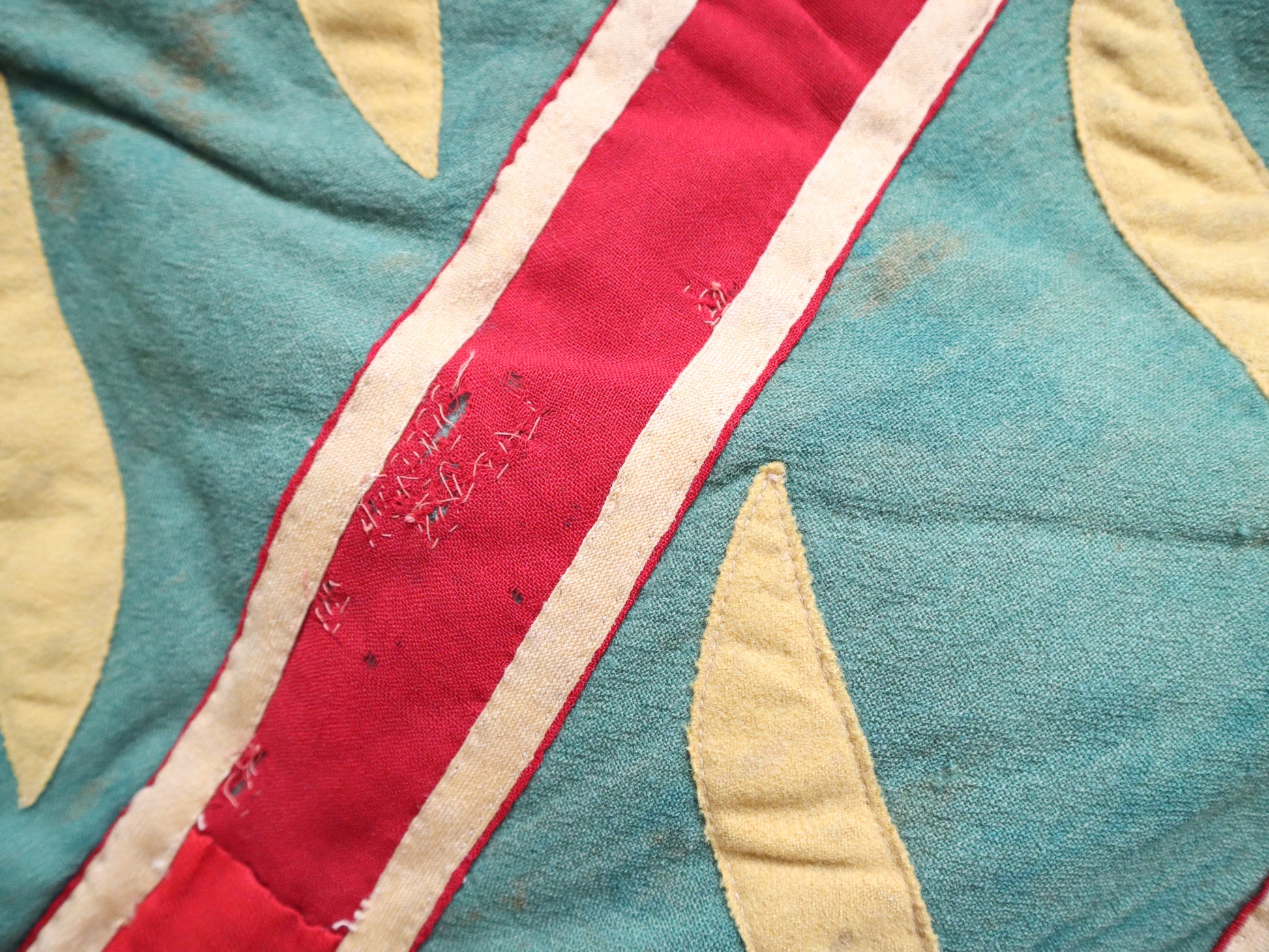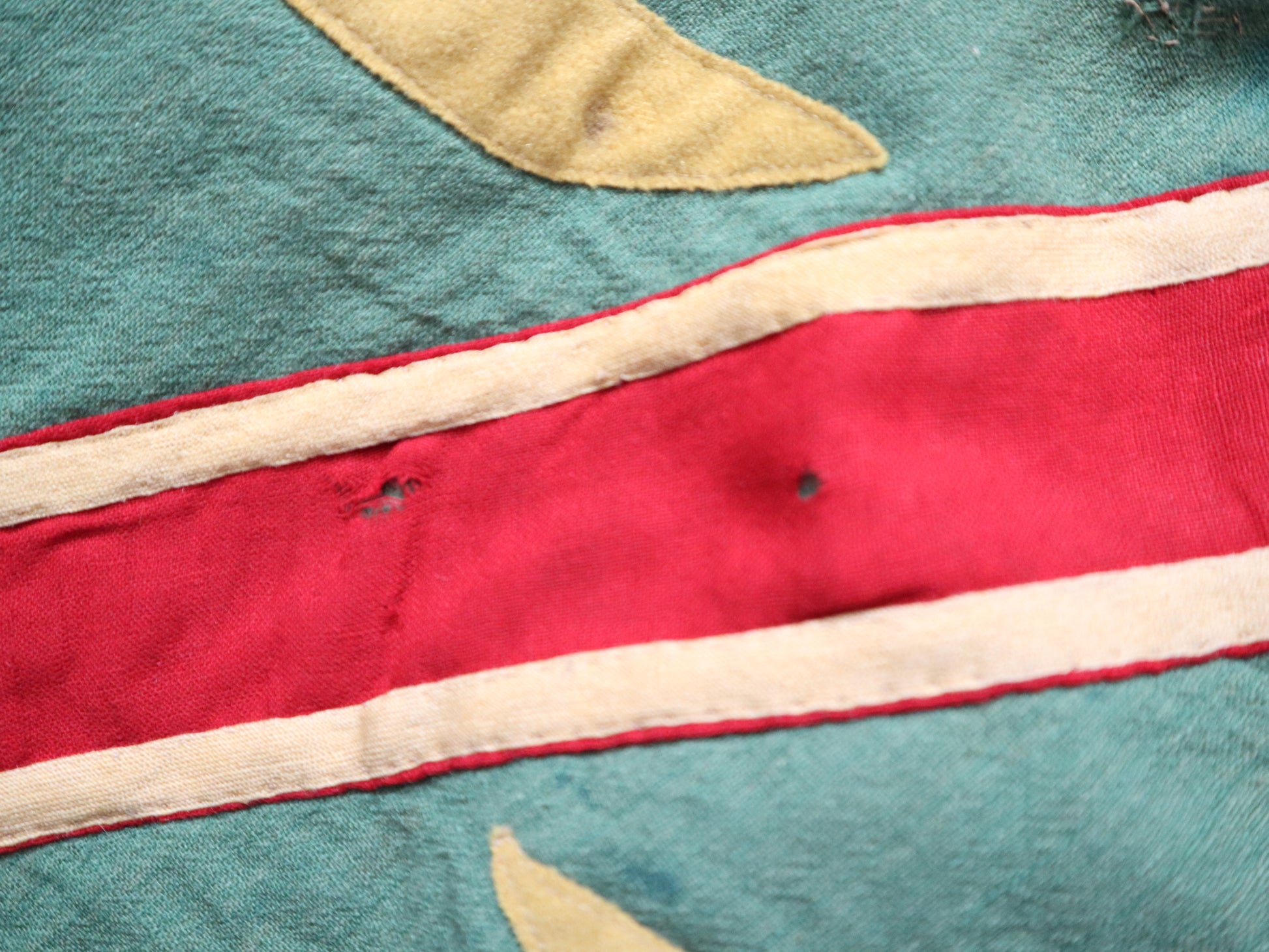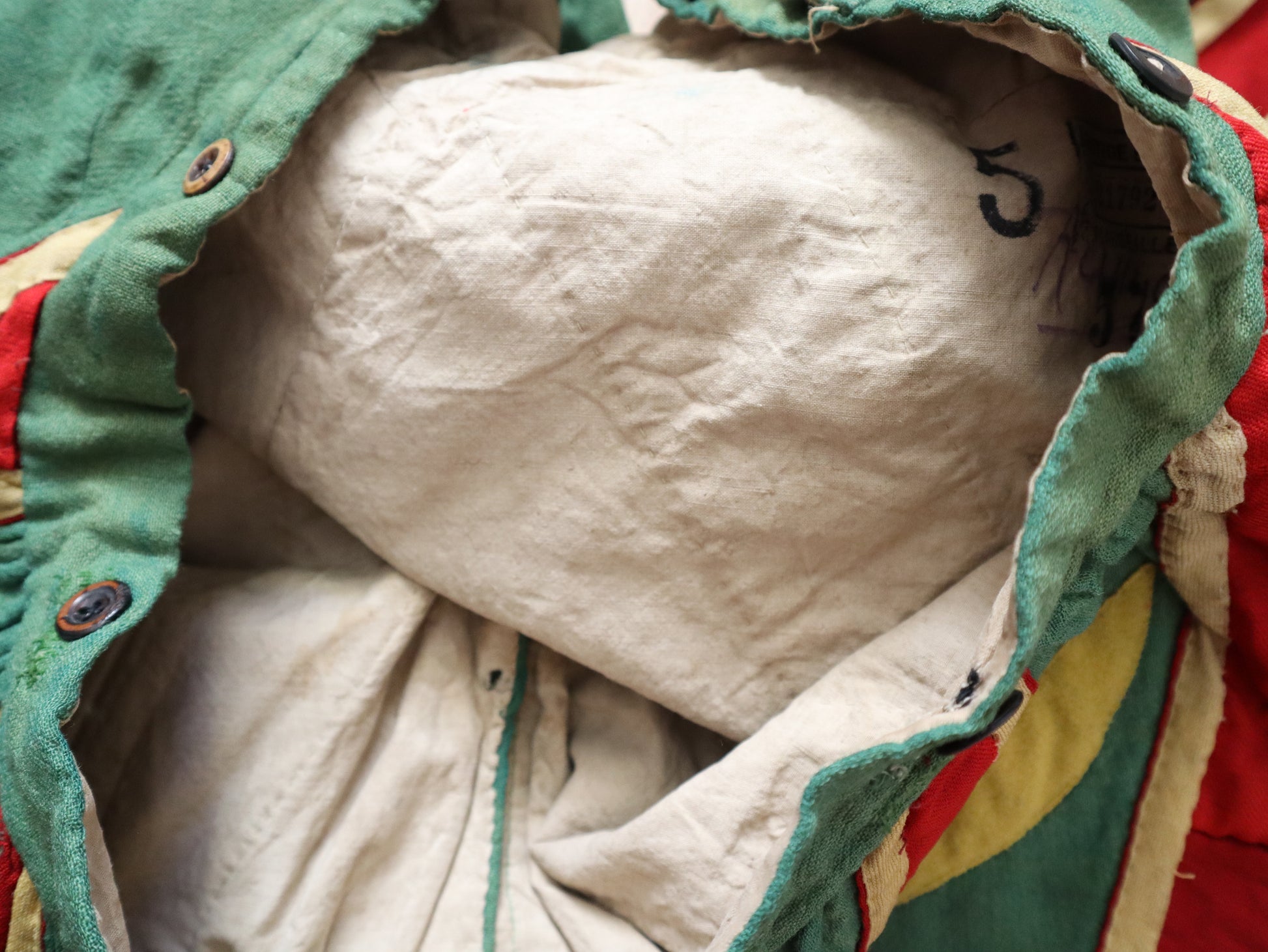 The colour palette is striking and deliberate. Arsenic green wool forms the base—unusual, saturated, and full of presence. Deep red side panels introduce contrast and structure, while yellow appliqué add clarity and dimension. Together, these tones create a bold visual rhythm that feels both historic and sharp.