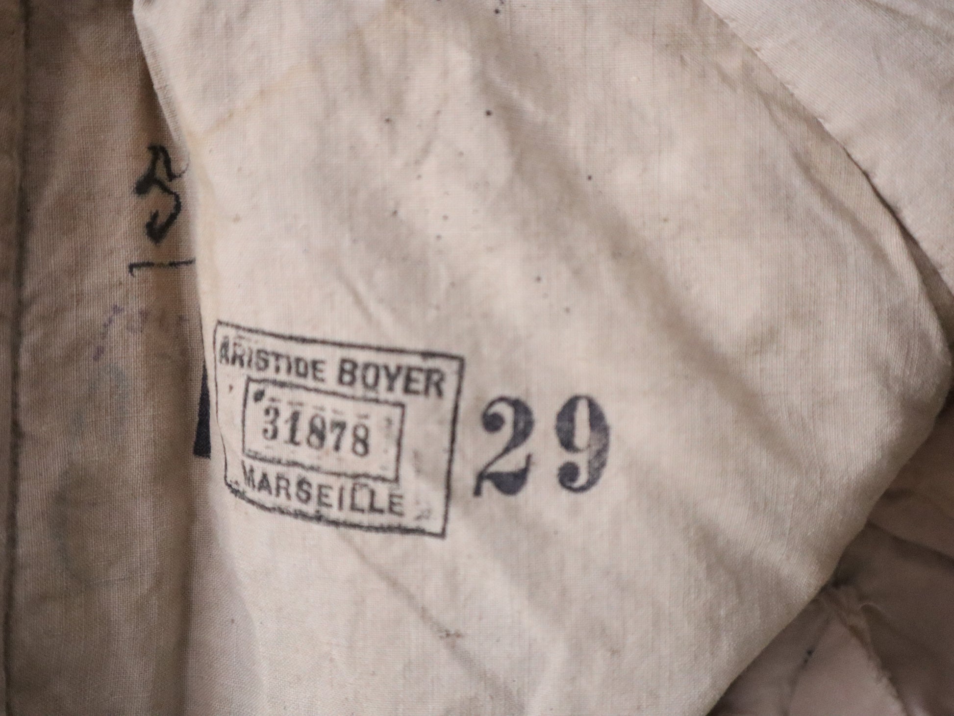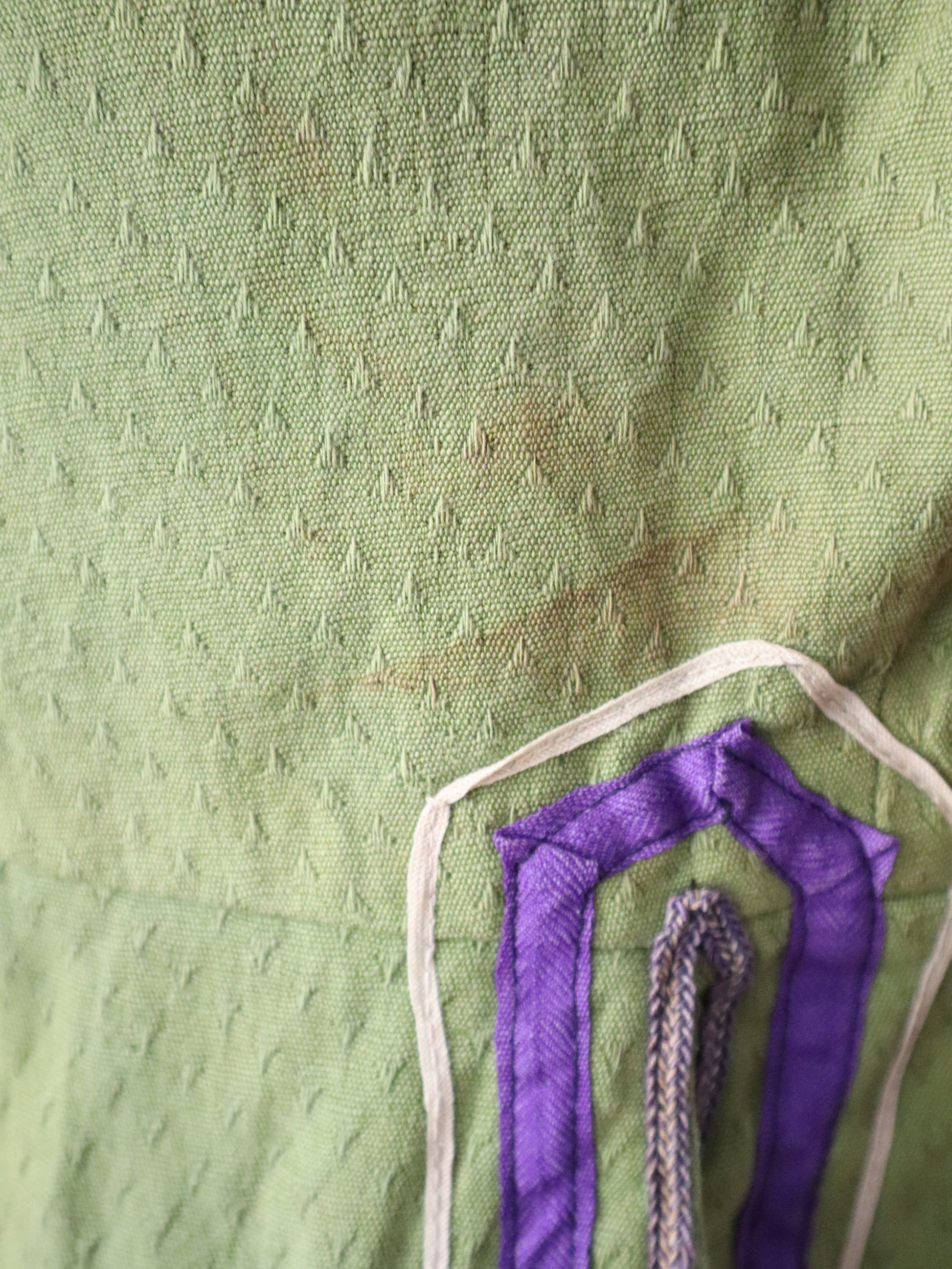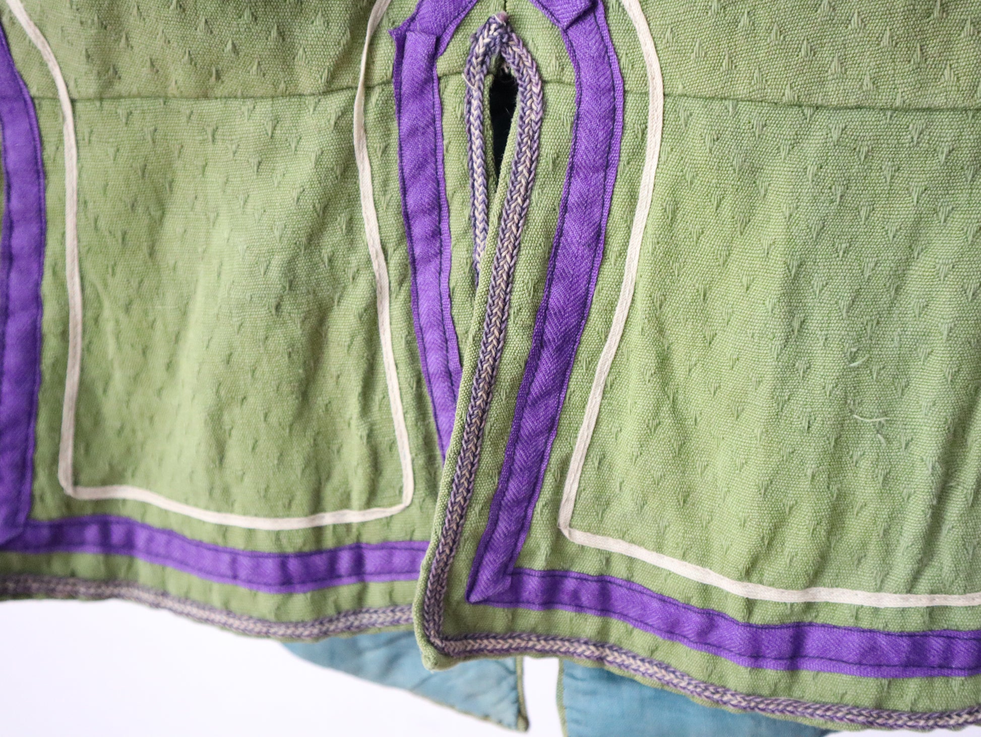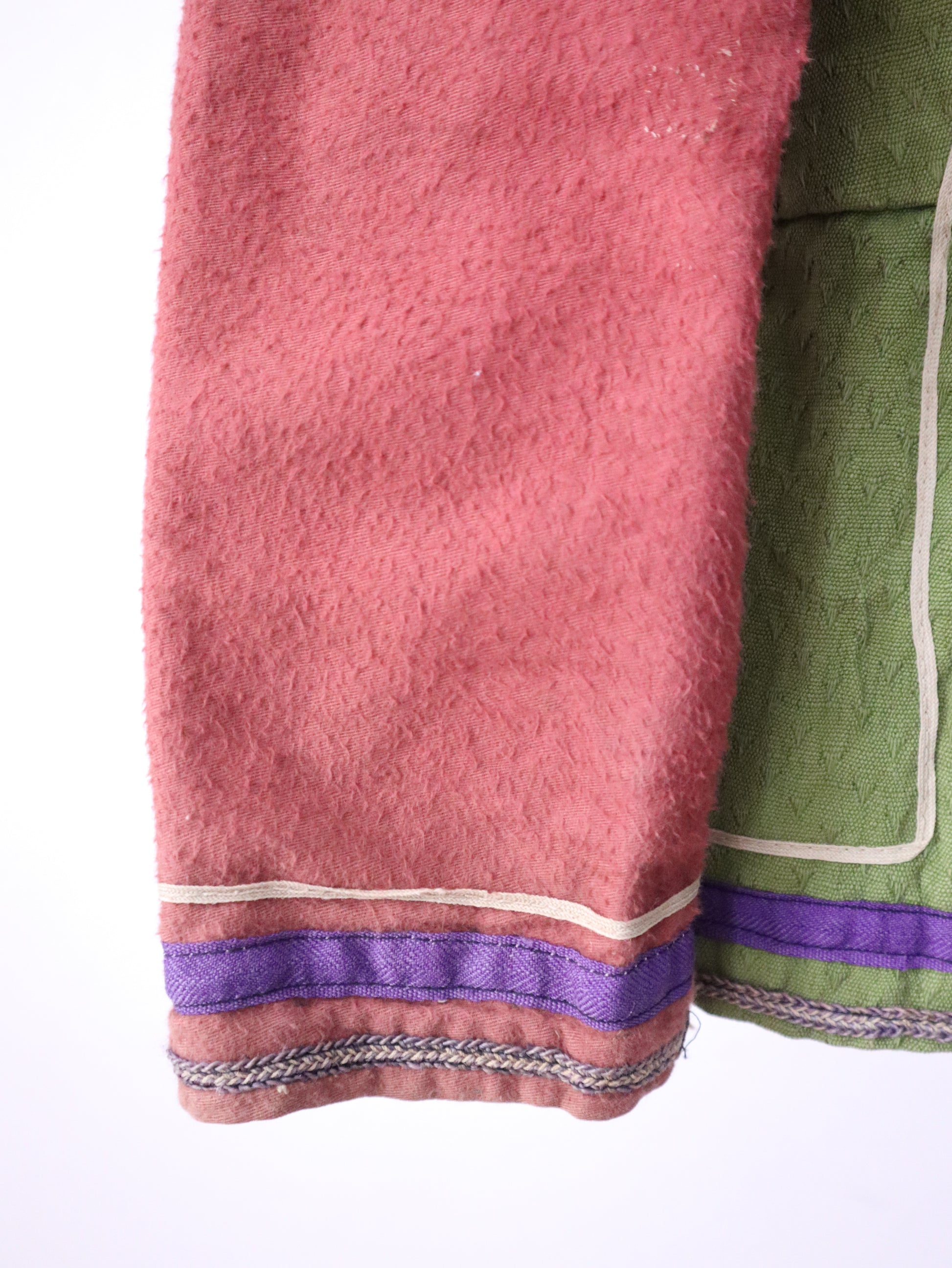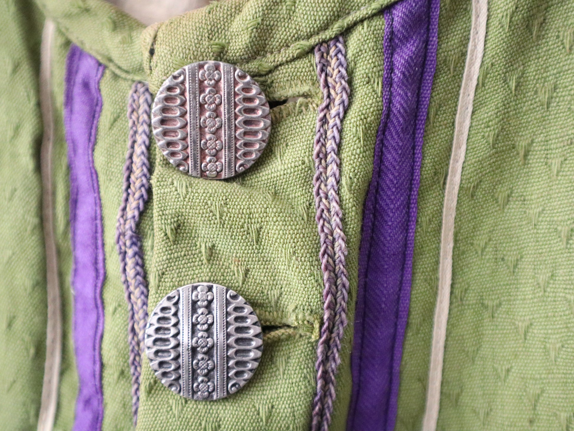 A rare and striking piece from the early 20th century, this opera costume jacket was made in Marseille by costumier Aristide Boyer. It features a textured green cotton body with contrasting pinkish-red sleeves, trimmed in purple striped ribbon. Embossed metal buttons with ring backs add ornate detail, and the jacket is fully lined in linen with a stamped maker’s mark. Hand-stitched construction throughout.