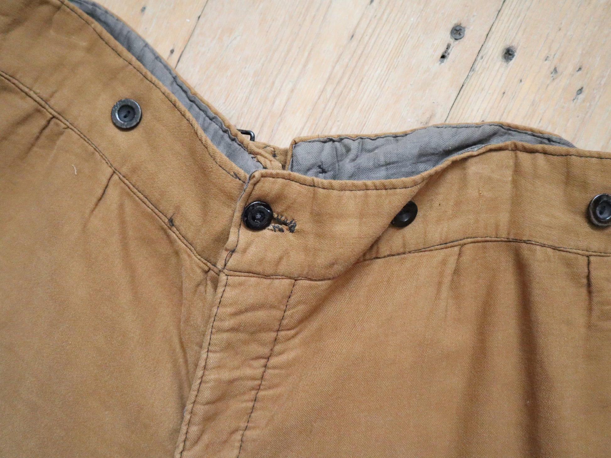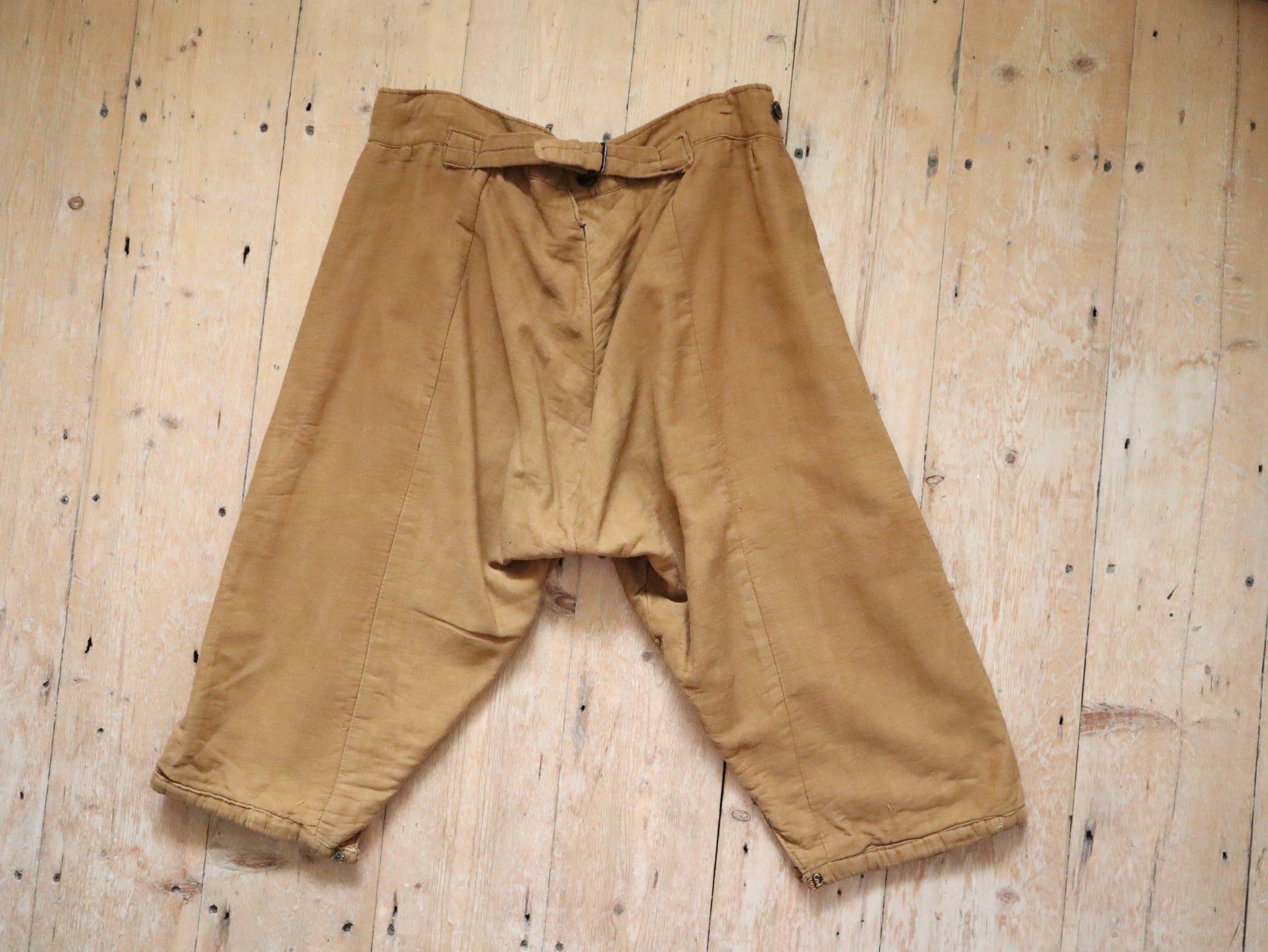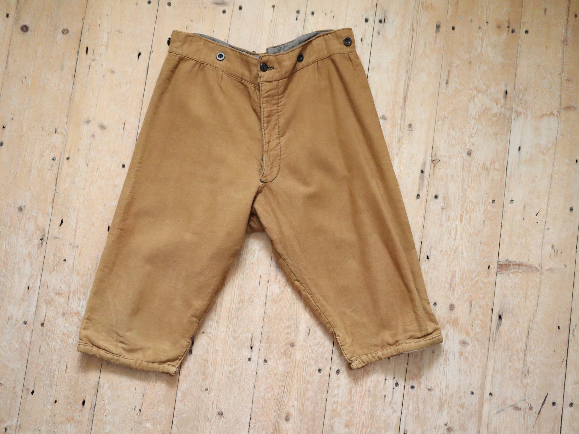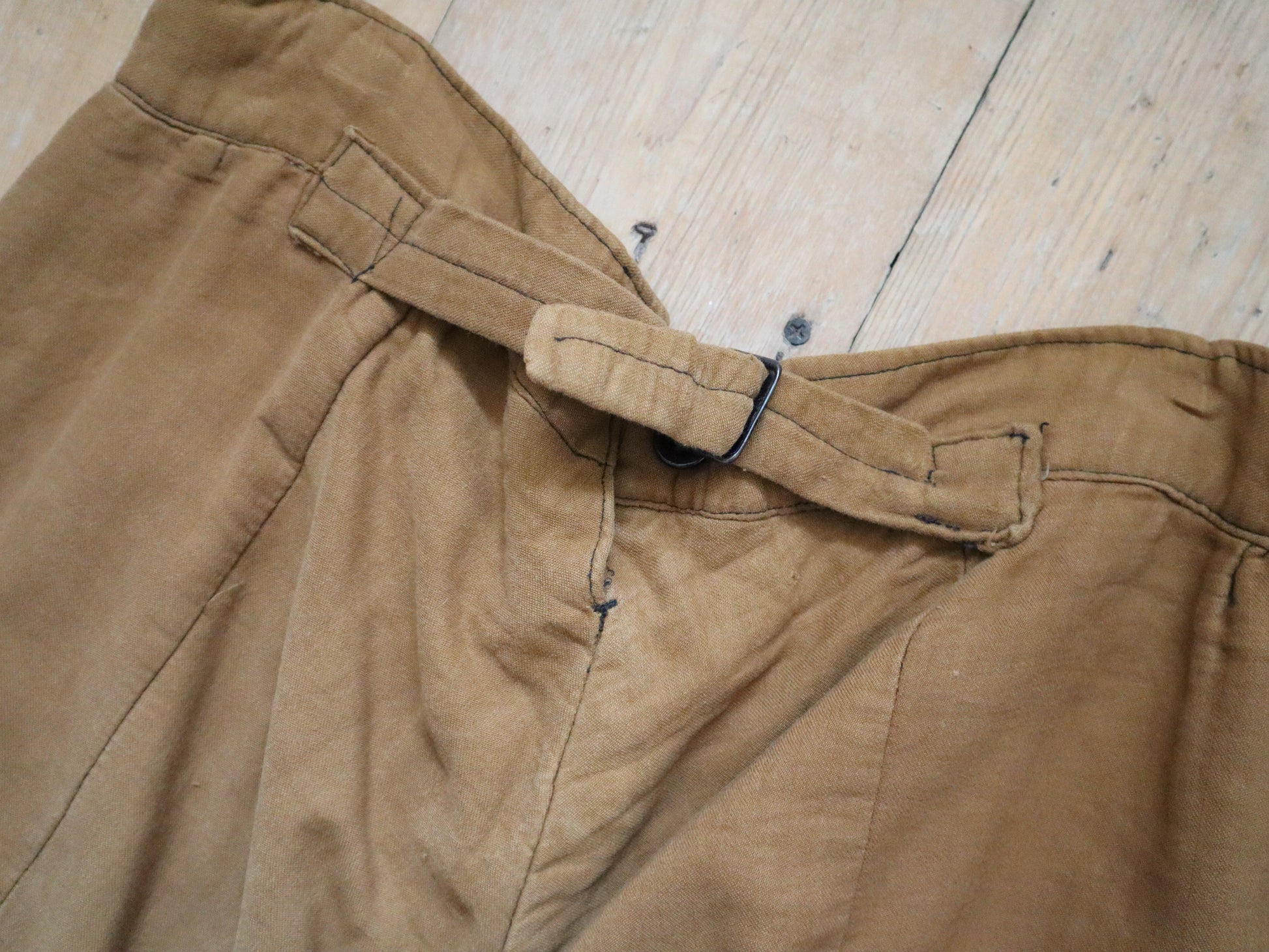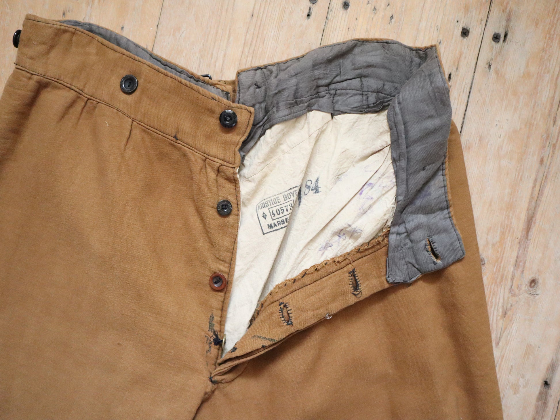 Great pair of breeches made for French opera circa early 1900s. Brown cotton and fully lined. Button fly. Metal hooks eye fastenings on the legs. Buckle back.