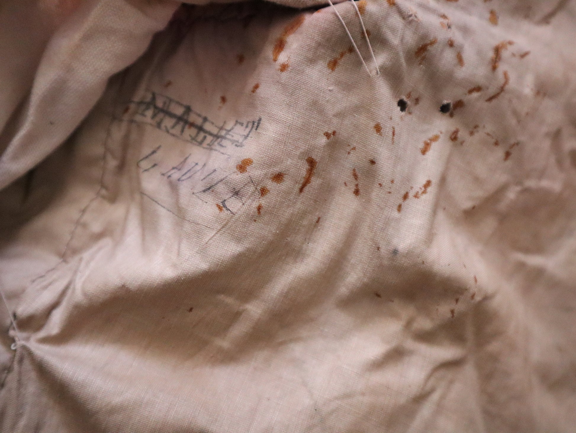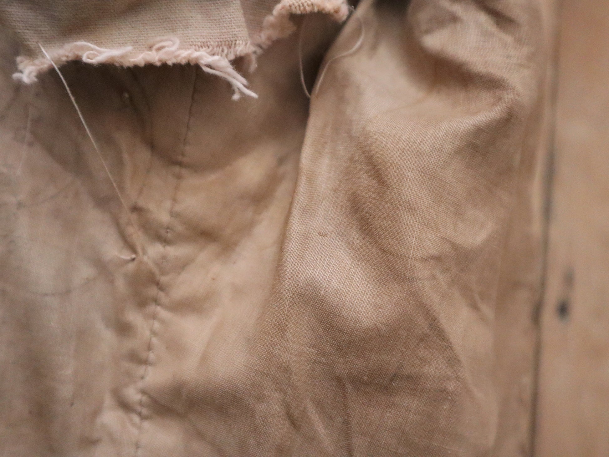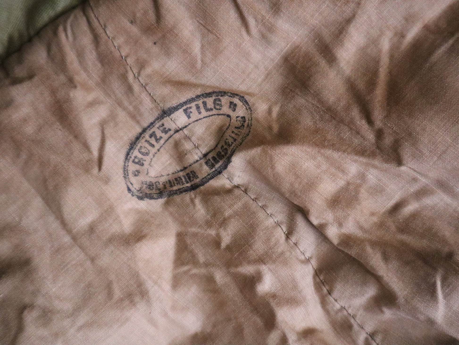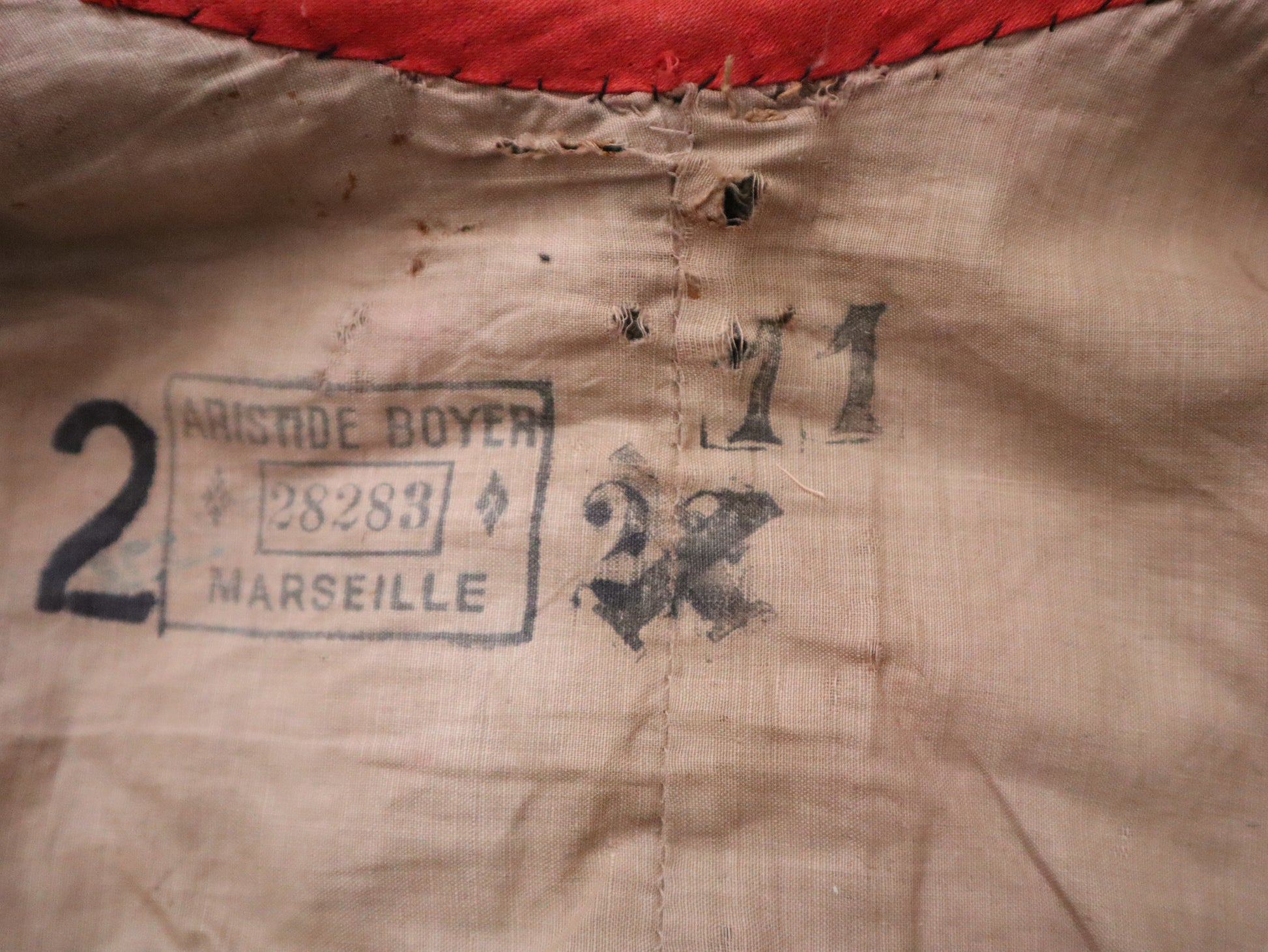 The tunic is entirely hand-stitched, including the buttonholes. The back closes with a small metal hook at the neck and original buttons extending down the spine. The inner panel of the tunic features two important stamps: the first from Roize Fils – Costumier – Marseille, and the second from Aristide Boyer – Marseille with the catalog number 28283, confirming this costume remained in professional use well into the early 20th century.