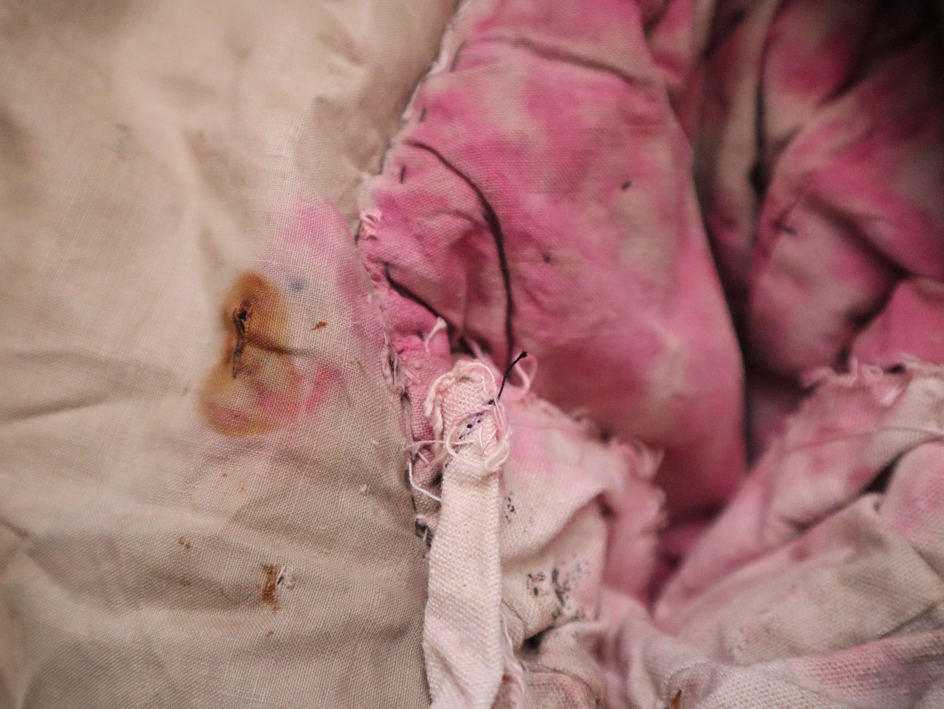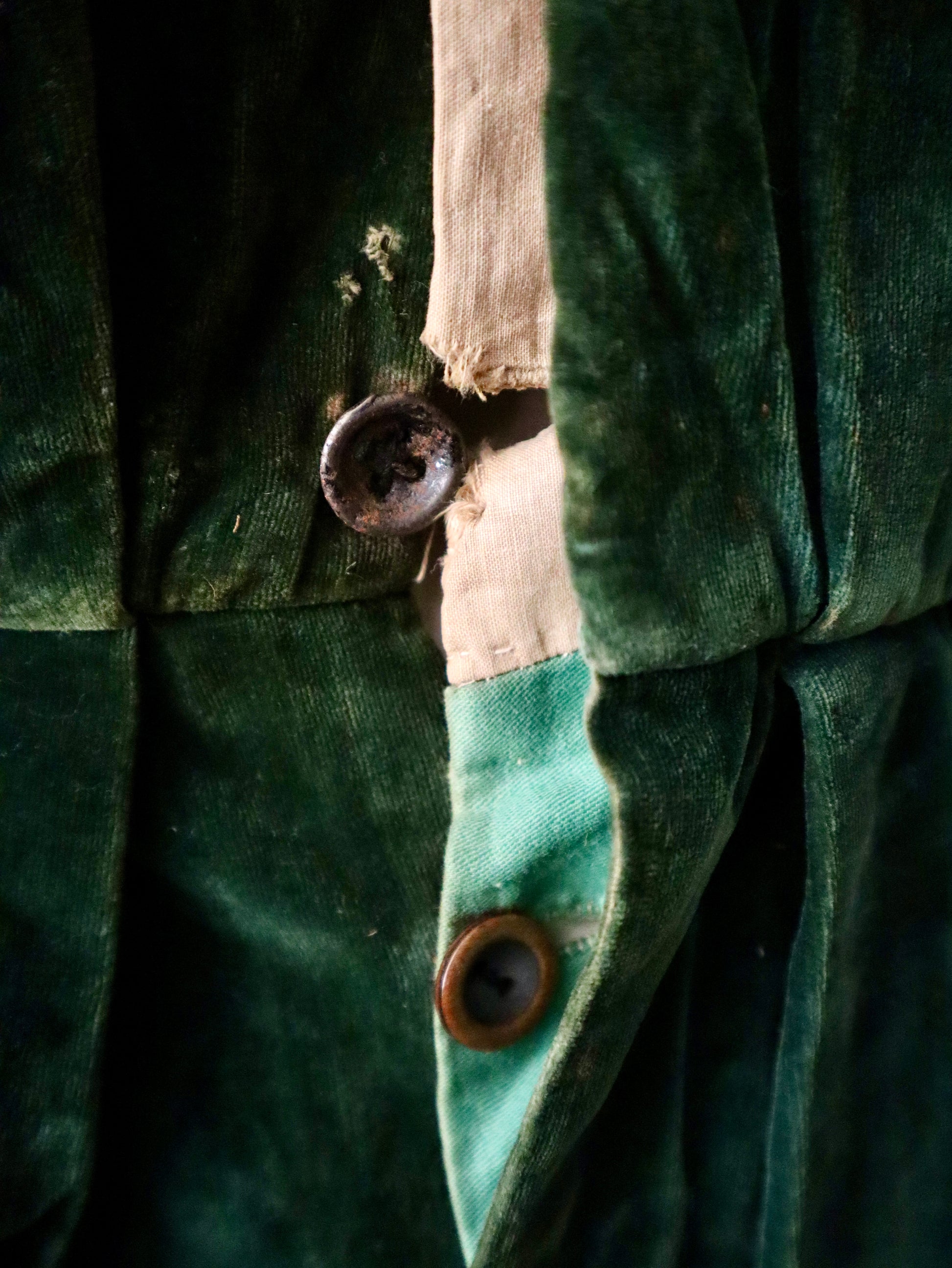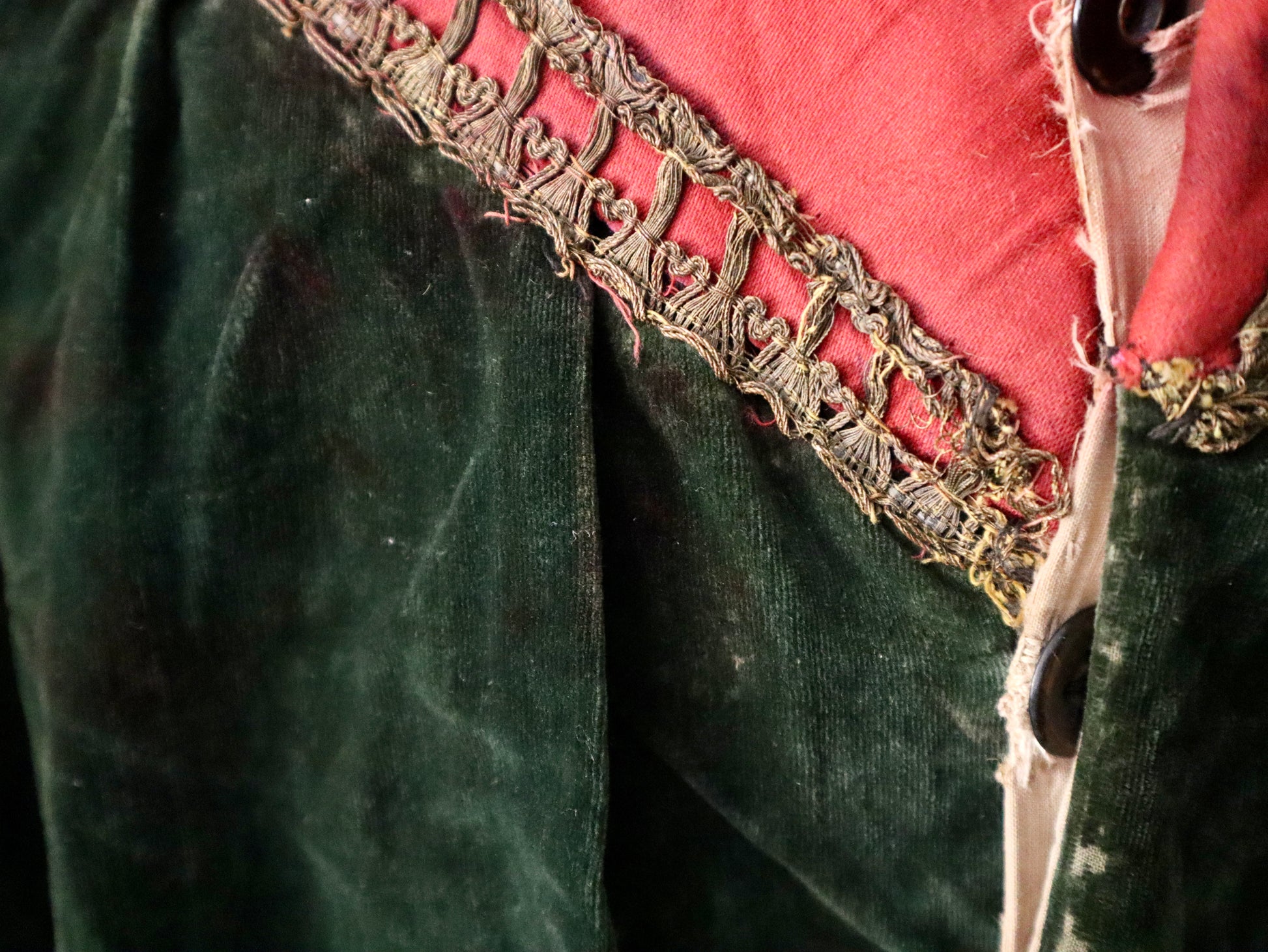 This piece has been carefully laundered by hand using a gentle detergent in cool water. It remains in stable, wearable condition, though signs of age and use are present. There is visible staining on the red neck fabric, likely caused by contact with another costume—possibly from dye or ink transfer. The red front fabric and its gold trim have come partially unstitched along one edge and would benefit from careful reinforcement. Several buttonholes are split or worn and also require restitching if intended for wear. There is some loss of velvet pile on the outer underarm areas, visible but not structurally damaging. On the right sleeve, there are a few sections of missing gold trim, though most of the decorative elements remain intact.